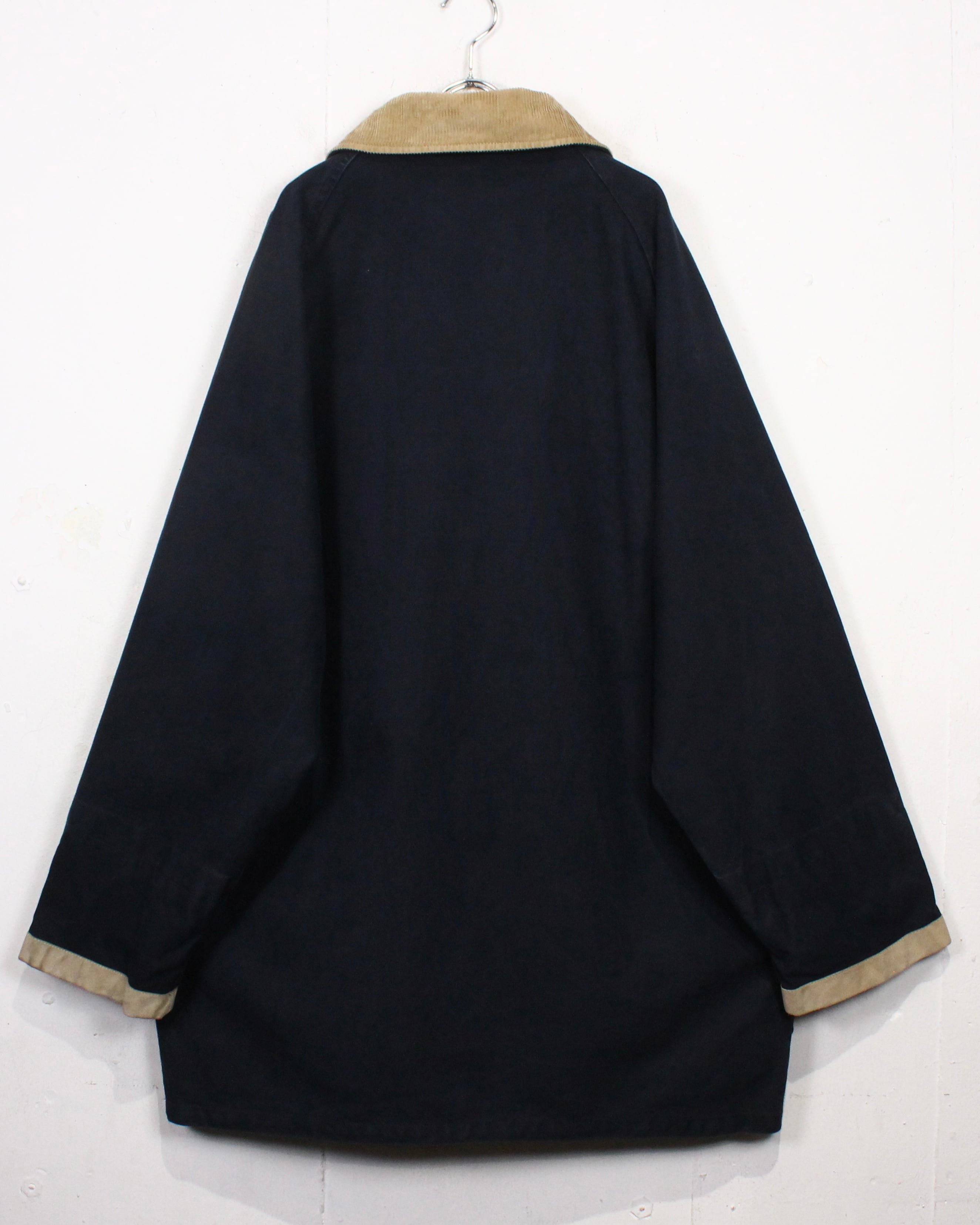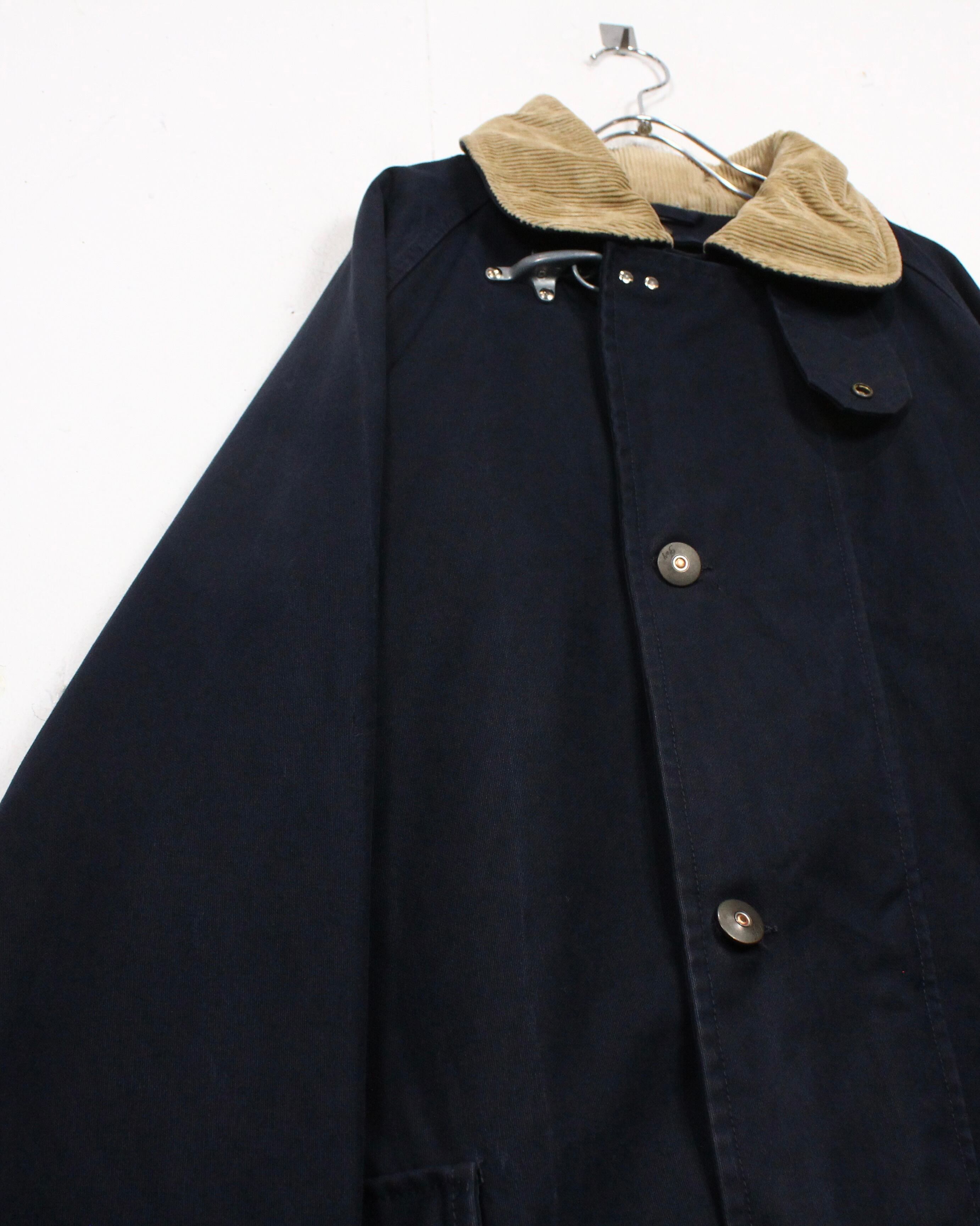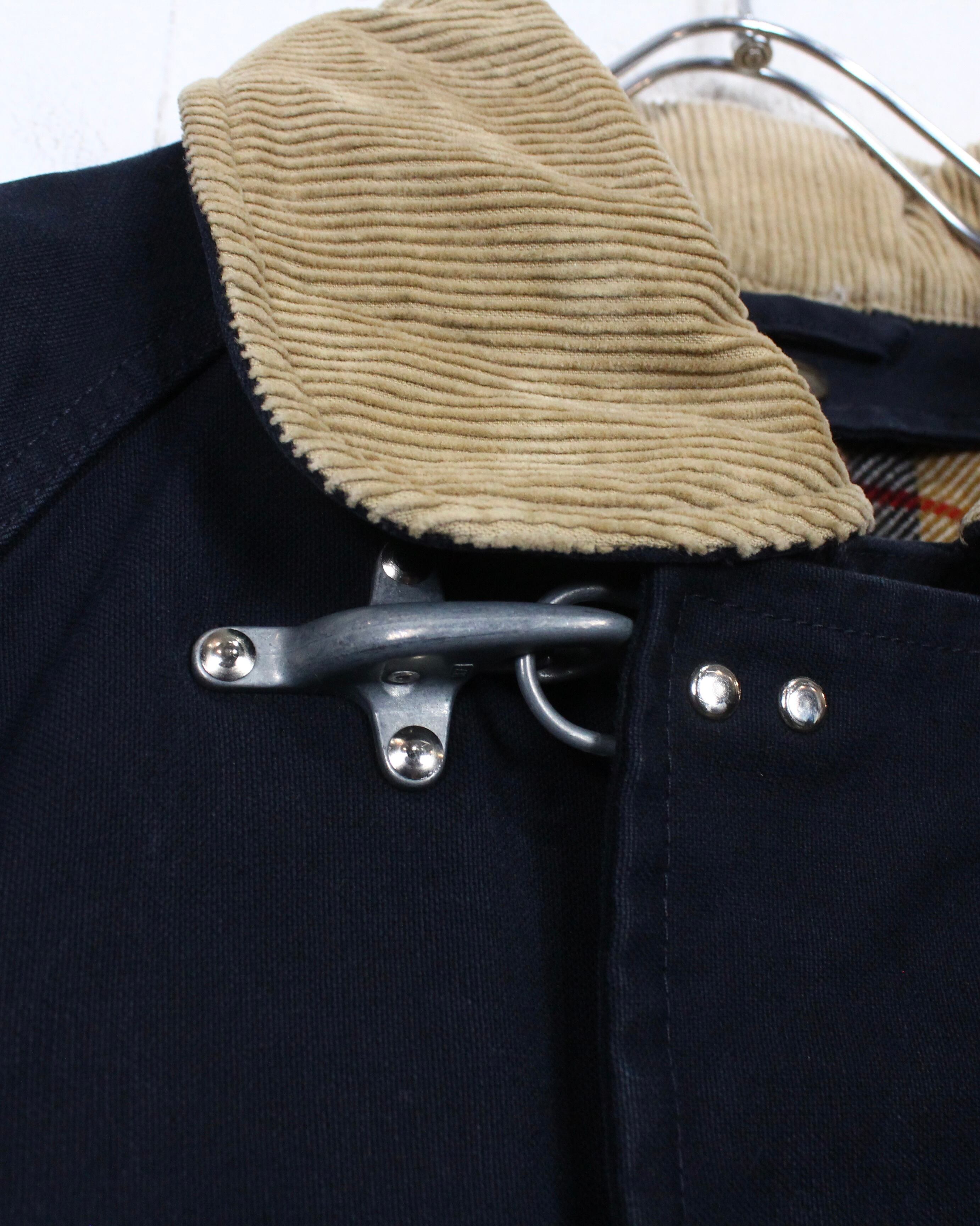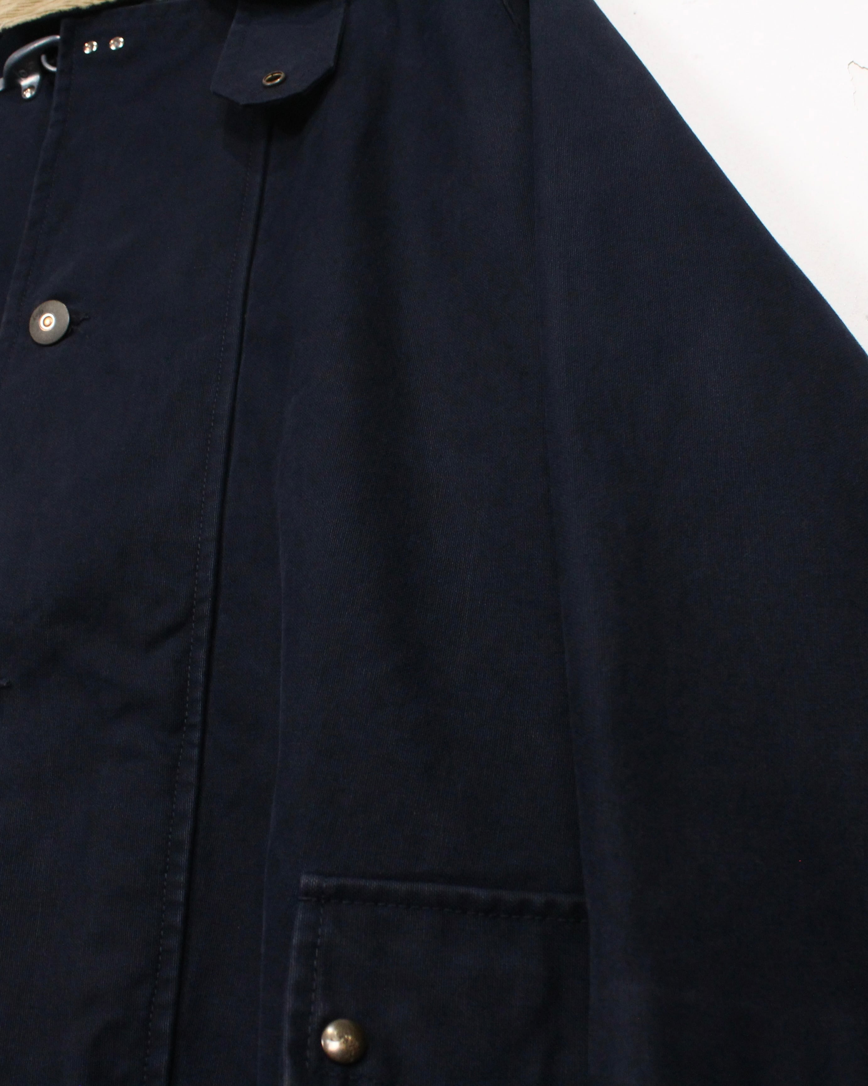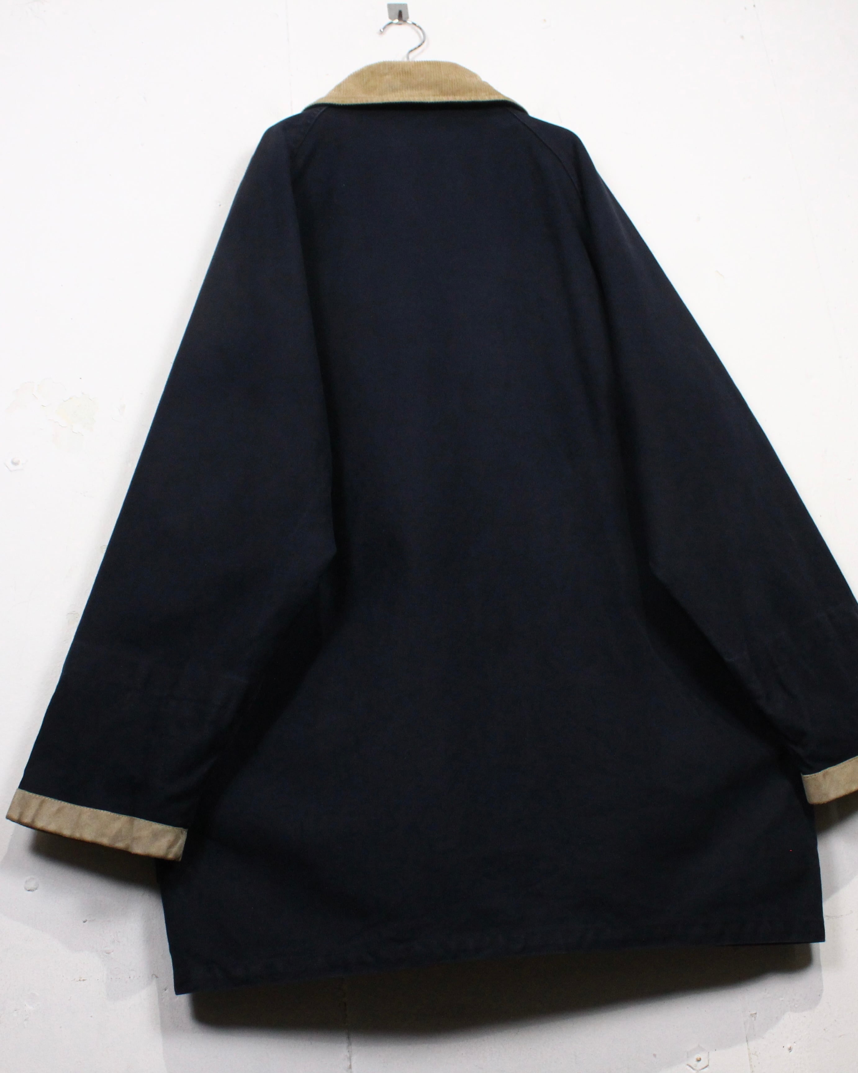 肉厚でタフな生地を使用し、ワーク由来の無骨さとラグジュアリーブランドならではの上品さが合わさった仕上がり。ネイビーボディにベージュの太畝コーデュロイカラーが映え、クラシックかつタイムレスな表情を演出しています。