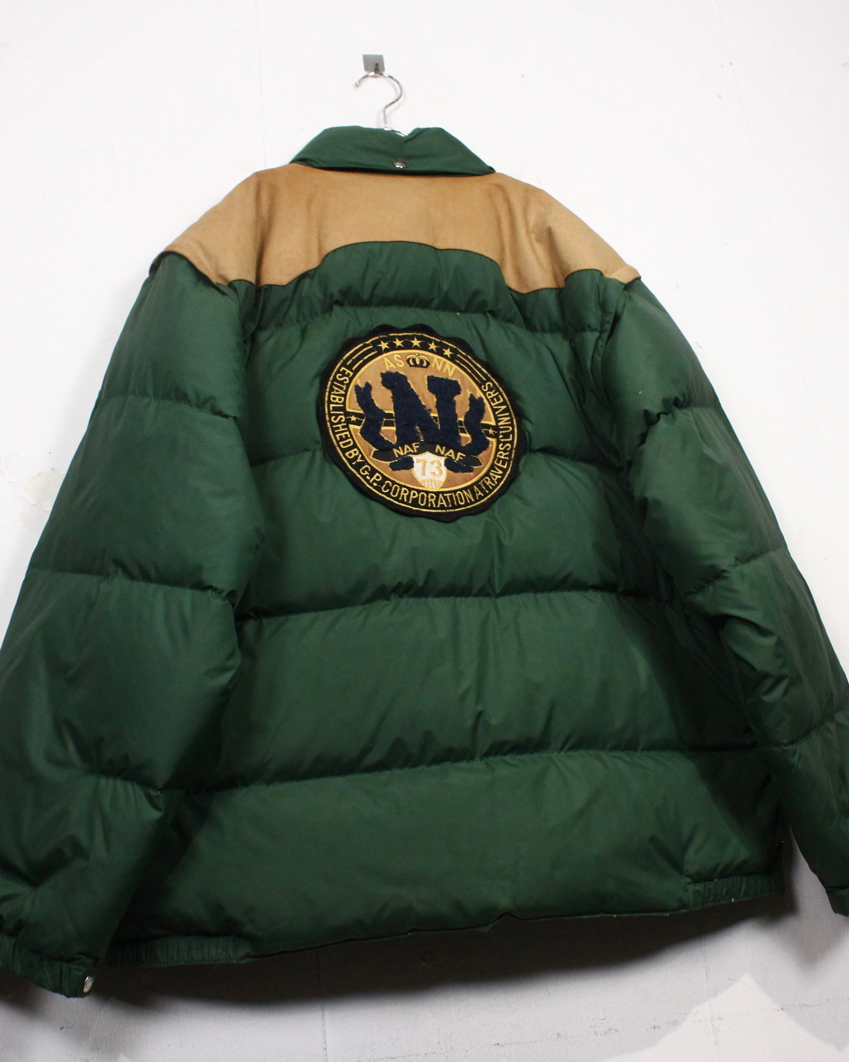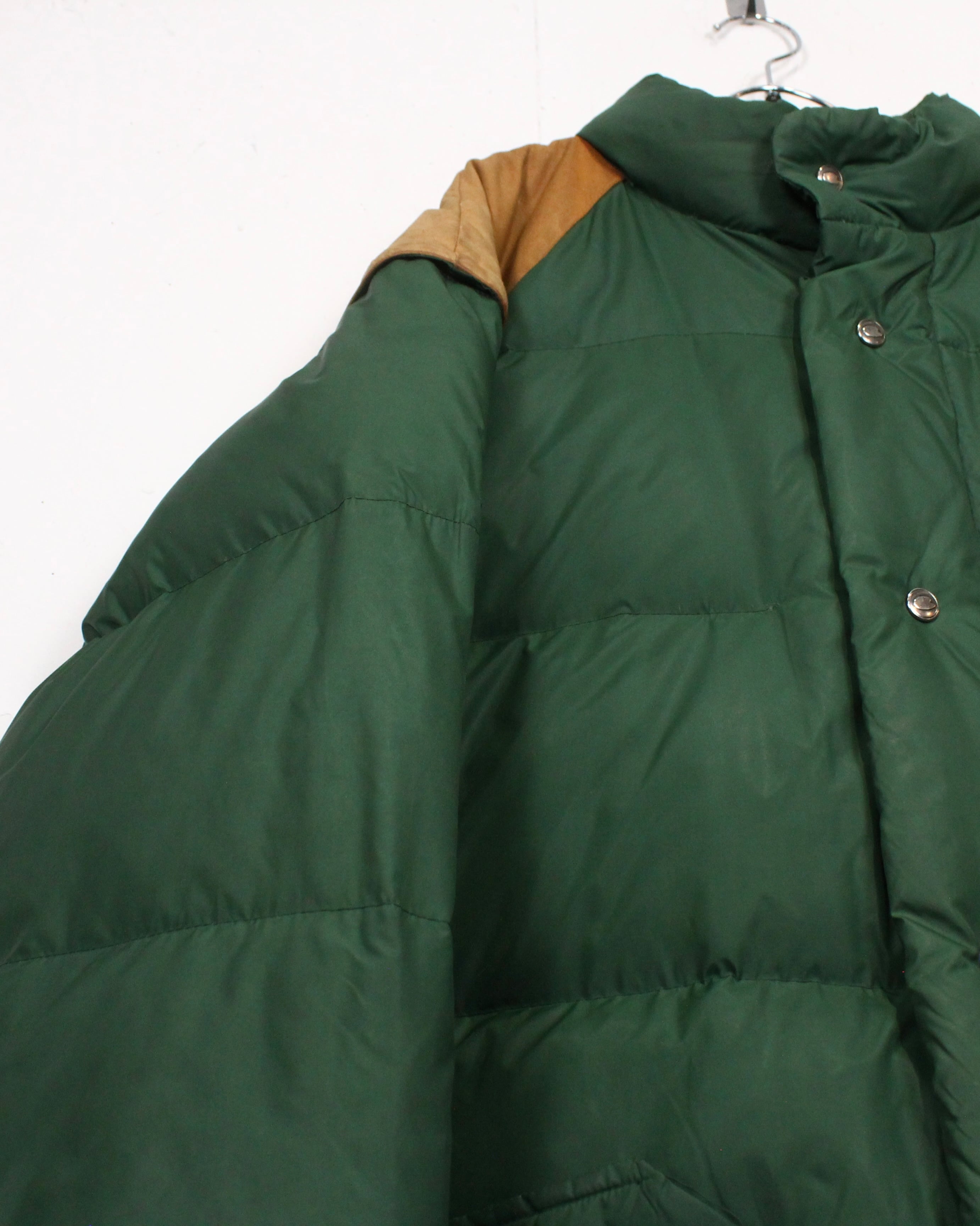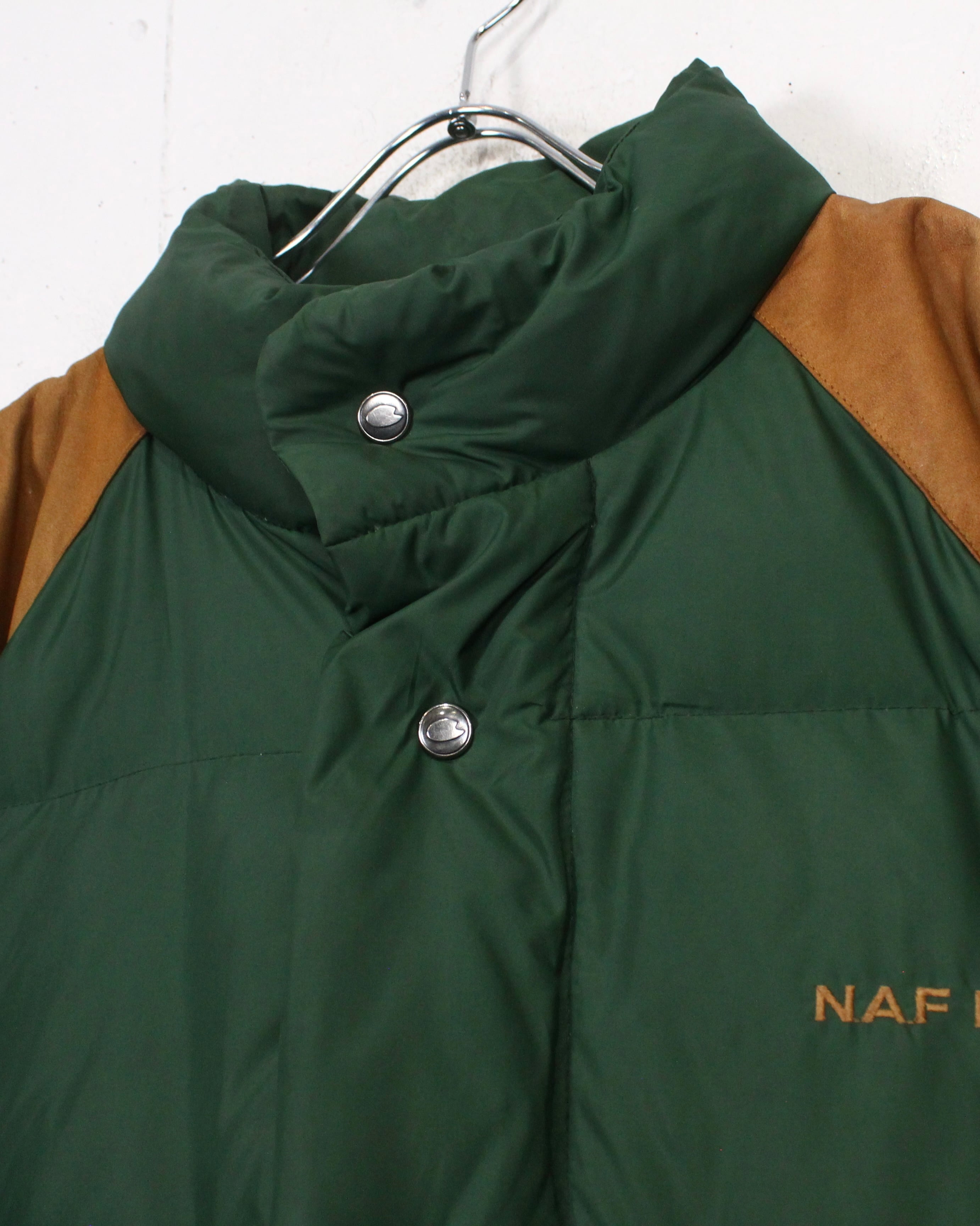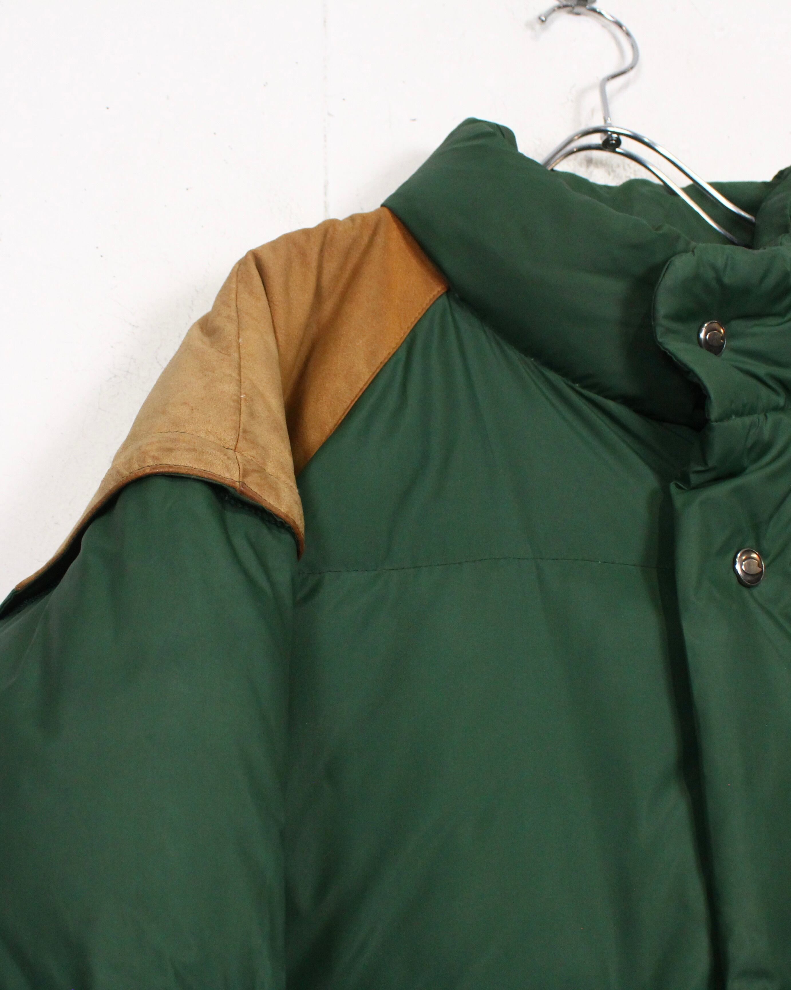 ボディは深みのあるグリーンを基調としたダウン仕様。ヨーク部分にはスエードレザーを切り替えで配置し、ナイロン×レザーの異素材のコントラストが全体の印象を引き締めていますね。