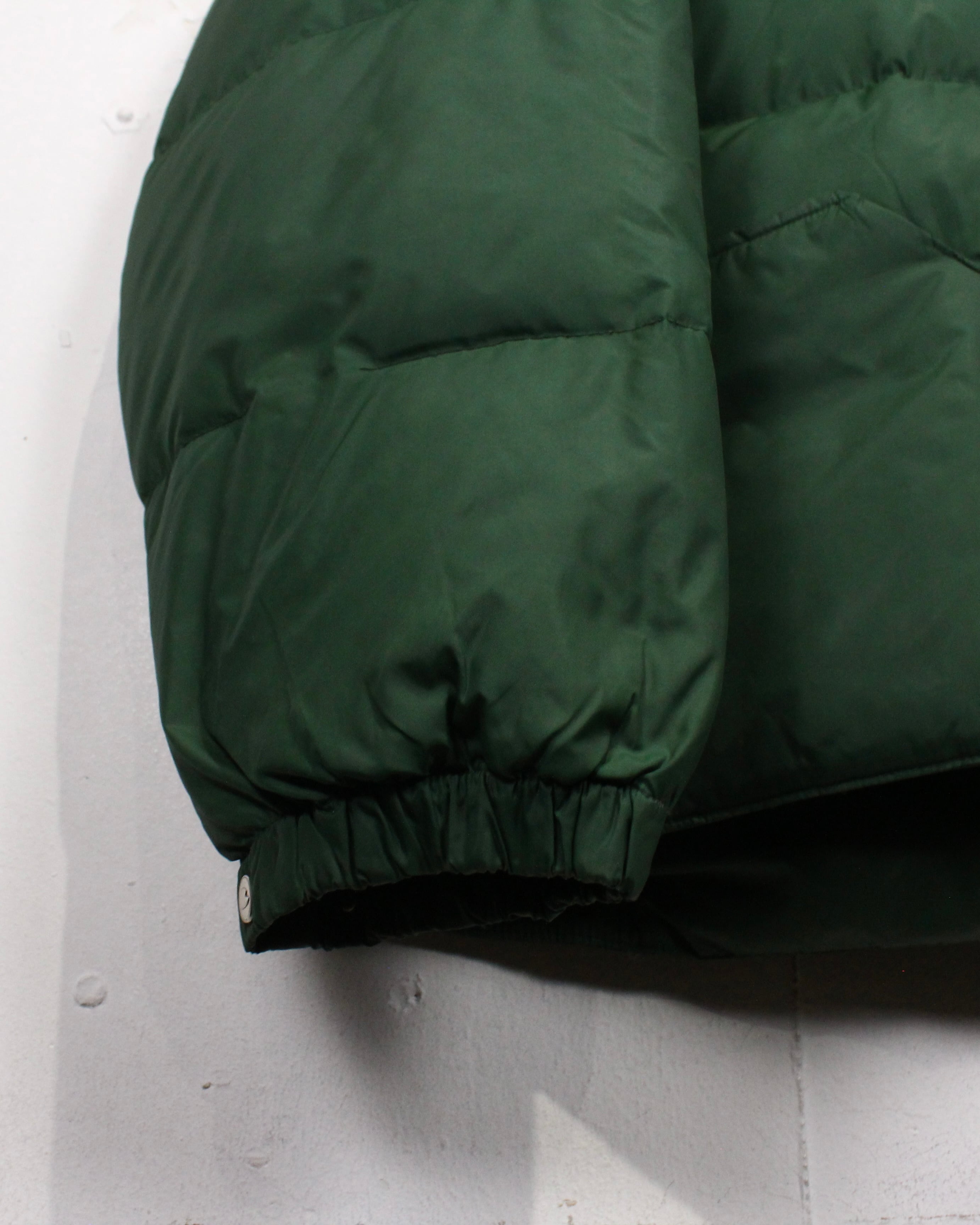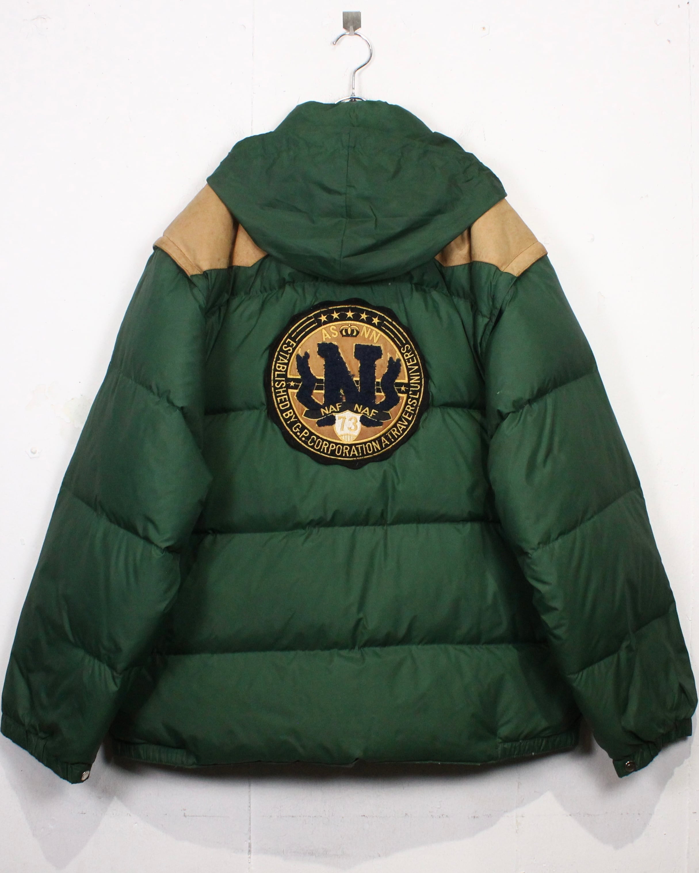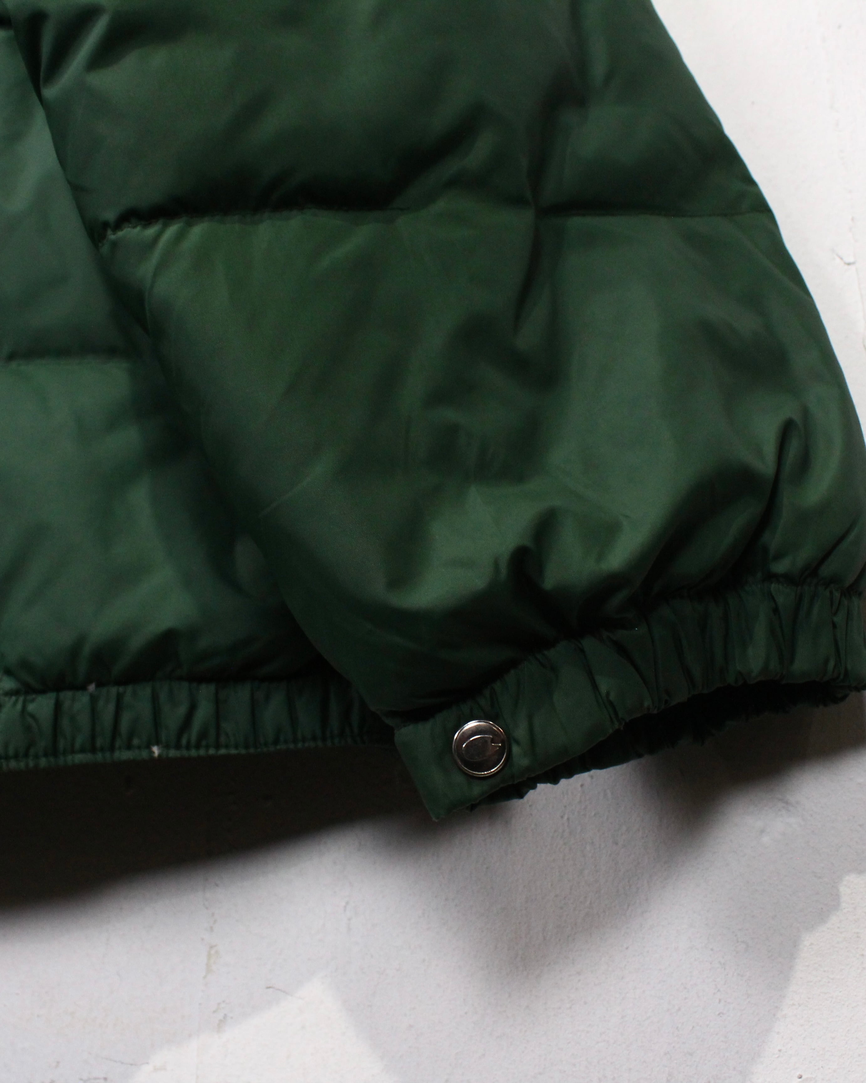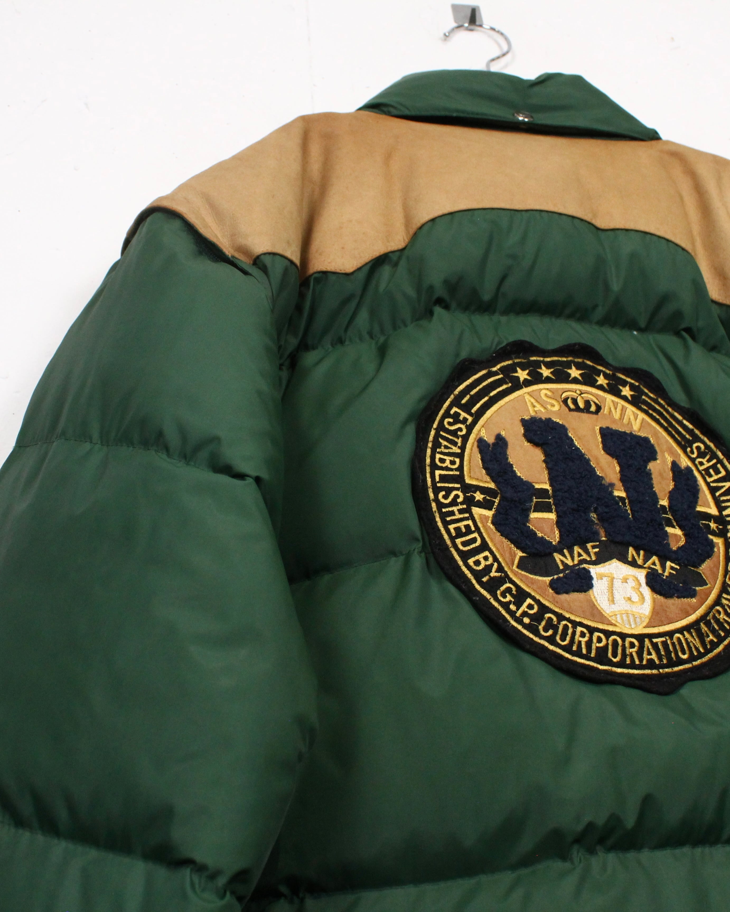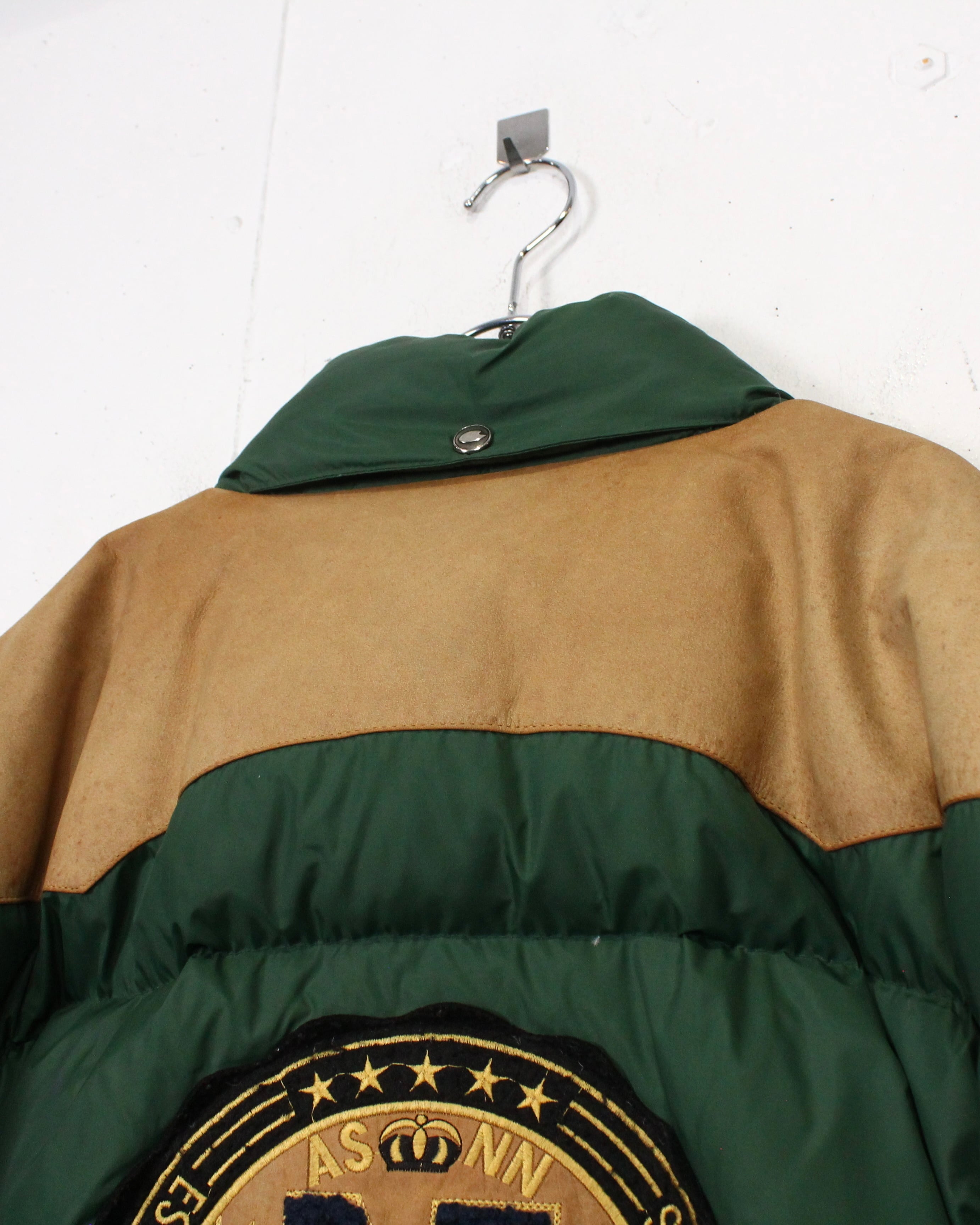 ボディは深みのあるグリーンを基調としたダウン仕様。ヨーク部分にはスエードレザーを切り替えで配置し、ナイロン×レザーの異素材のコントラストが全体の印象を引き締めていますね。