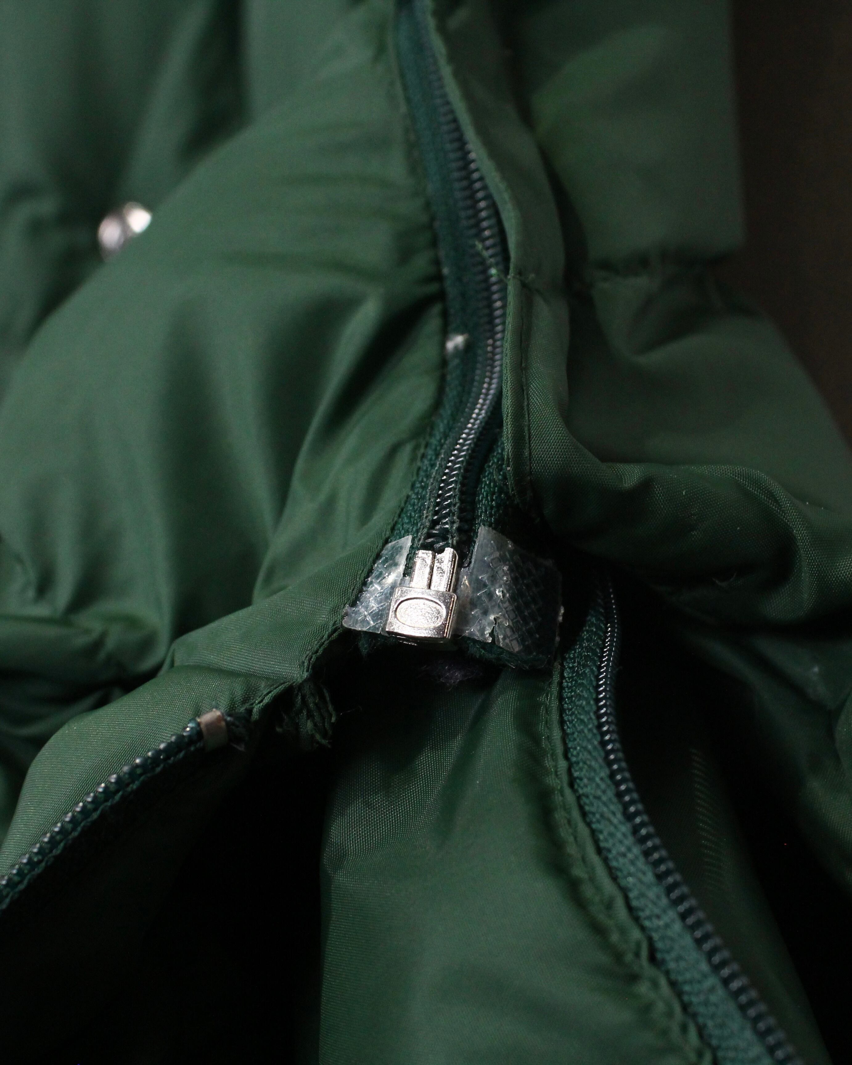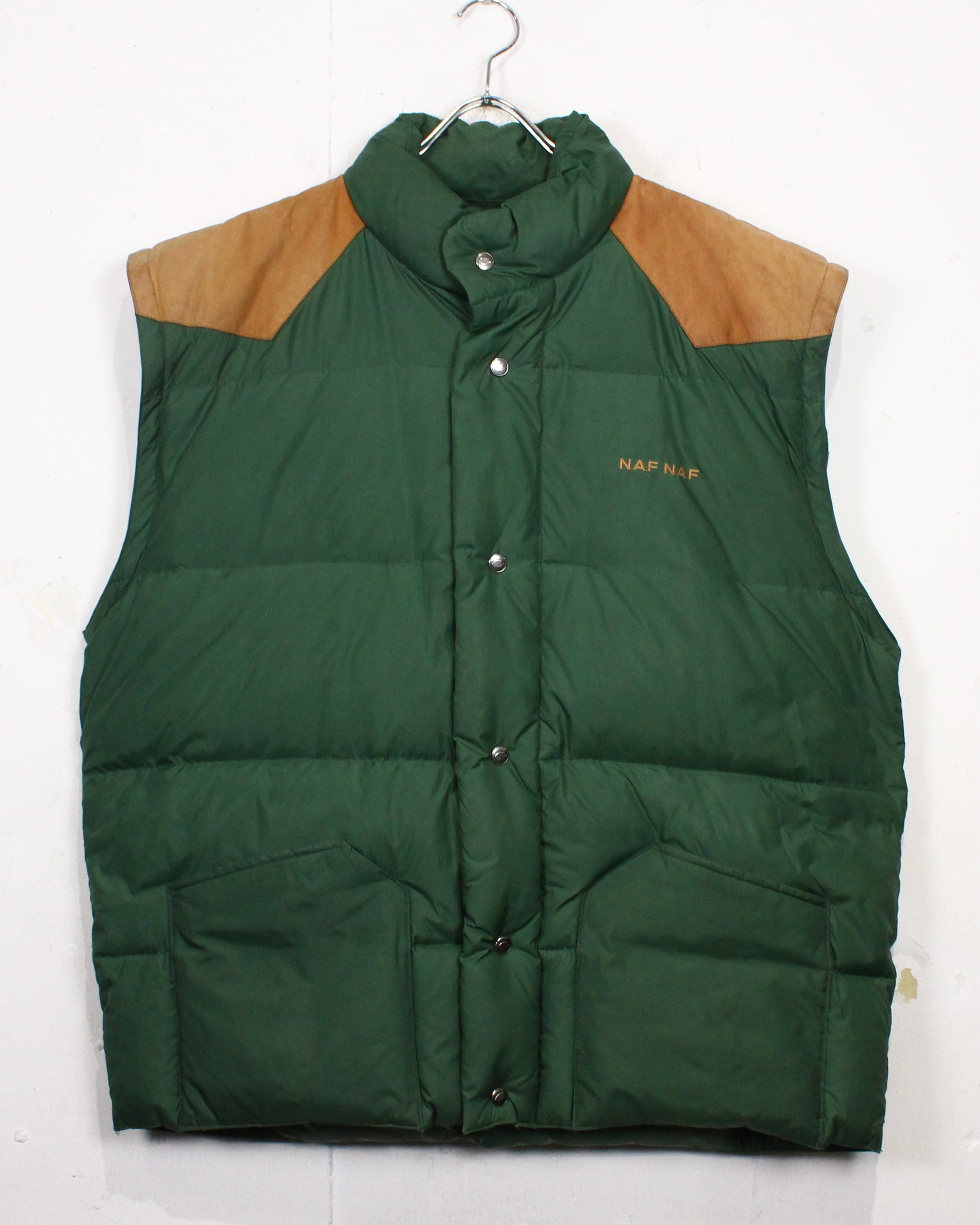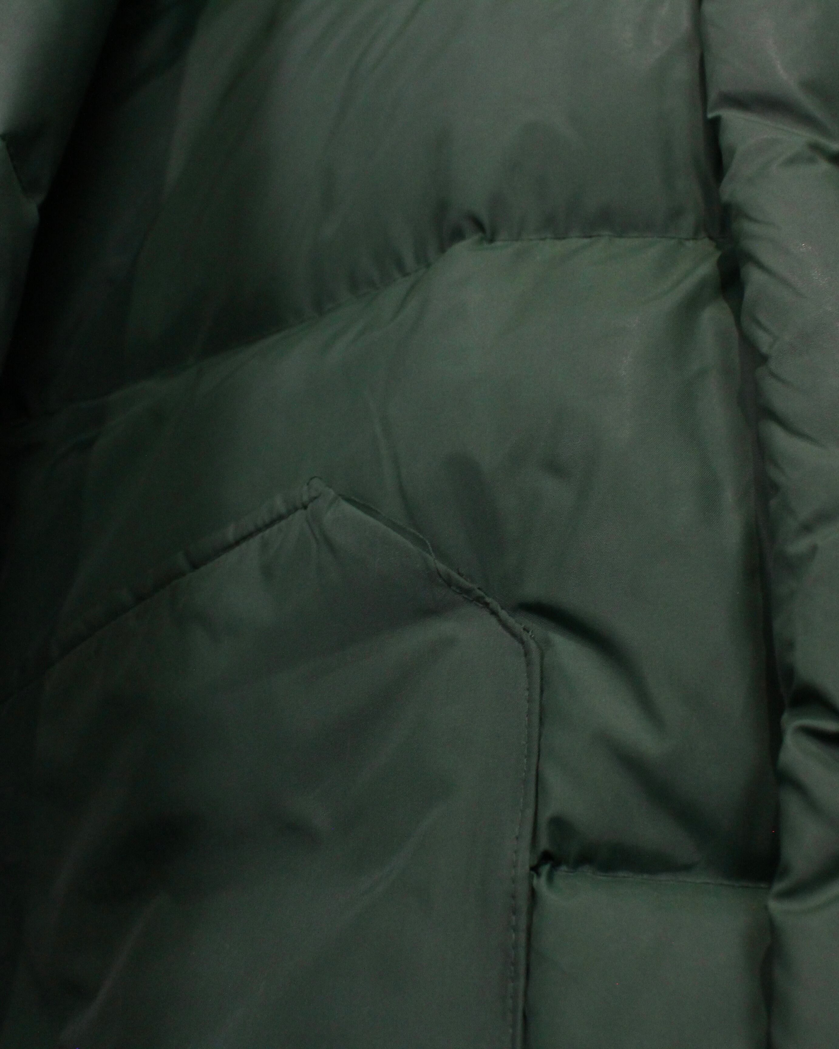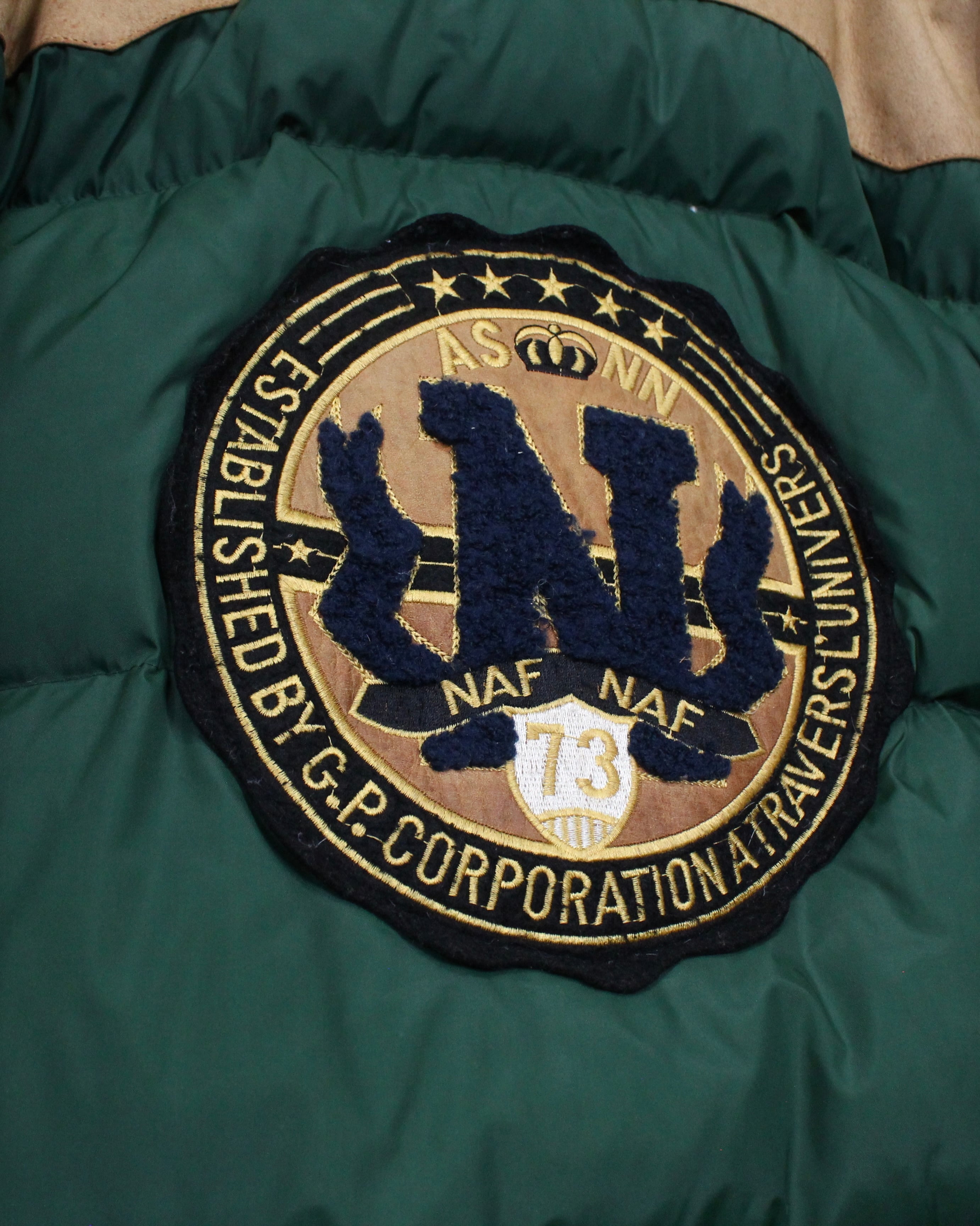 ボディは深みのあるグリーンを基調としたダウン仕様。ヨーク部分にはスエードレザーを切り替えで配置し、ナイロン×レザーの異素材のコントラストが全体の印象を引き締めていますね。