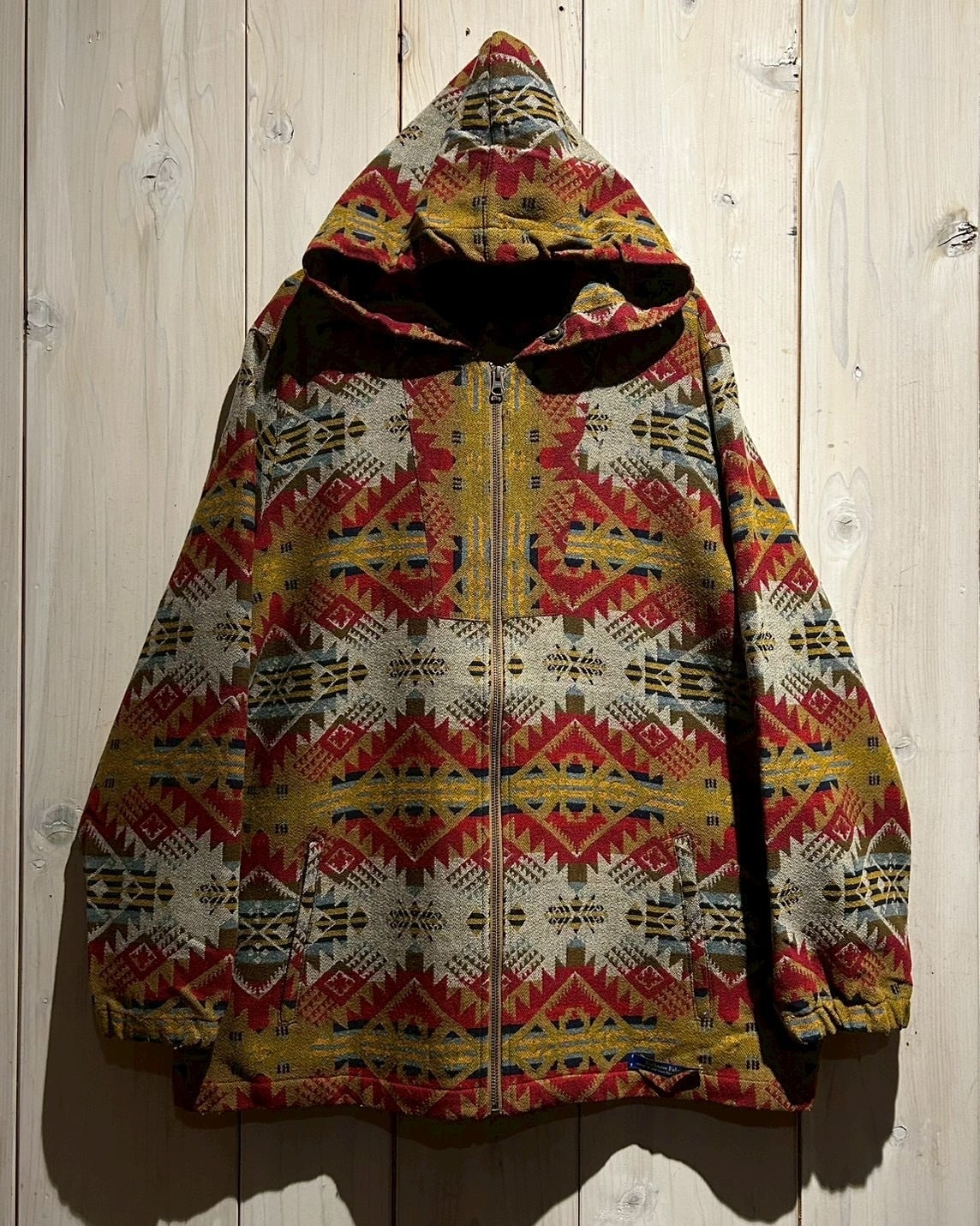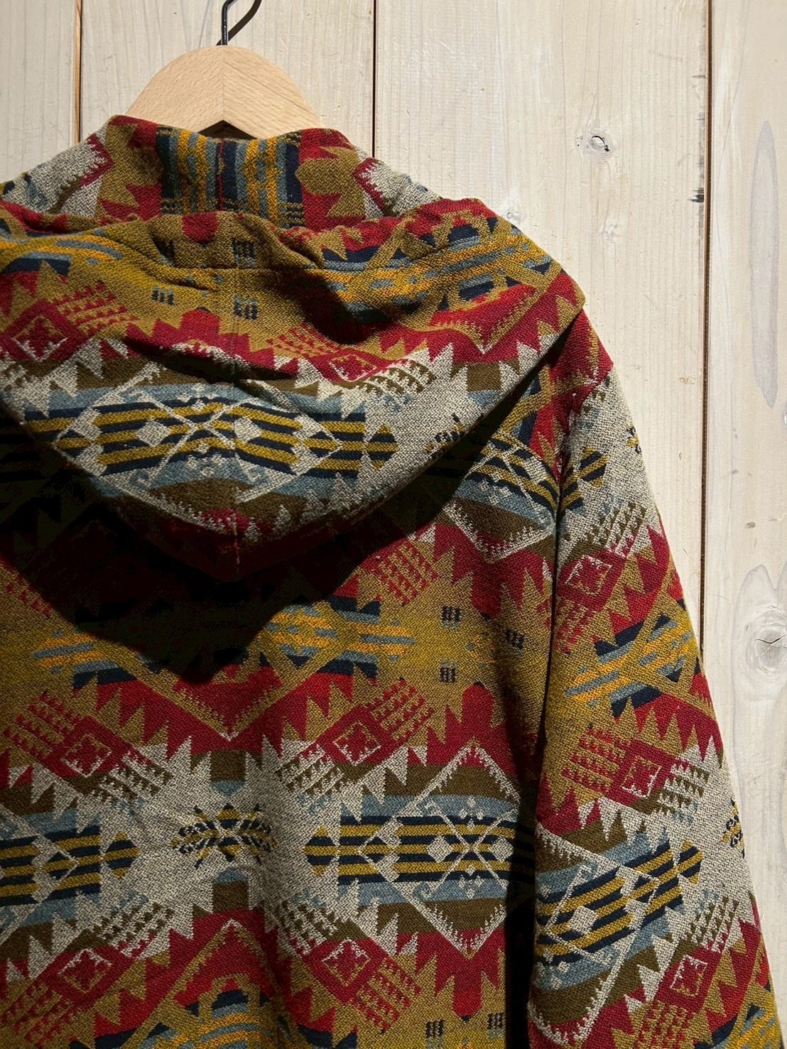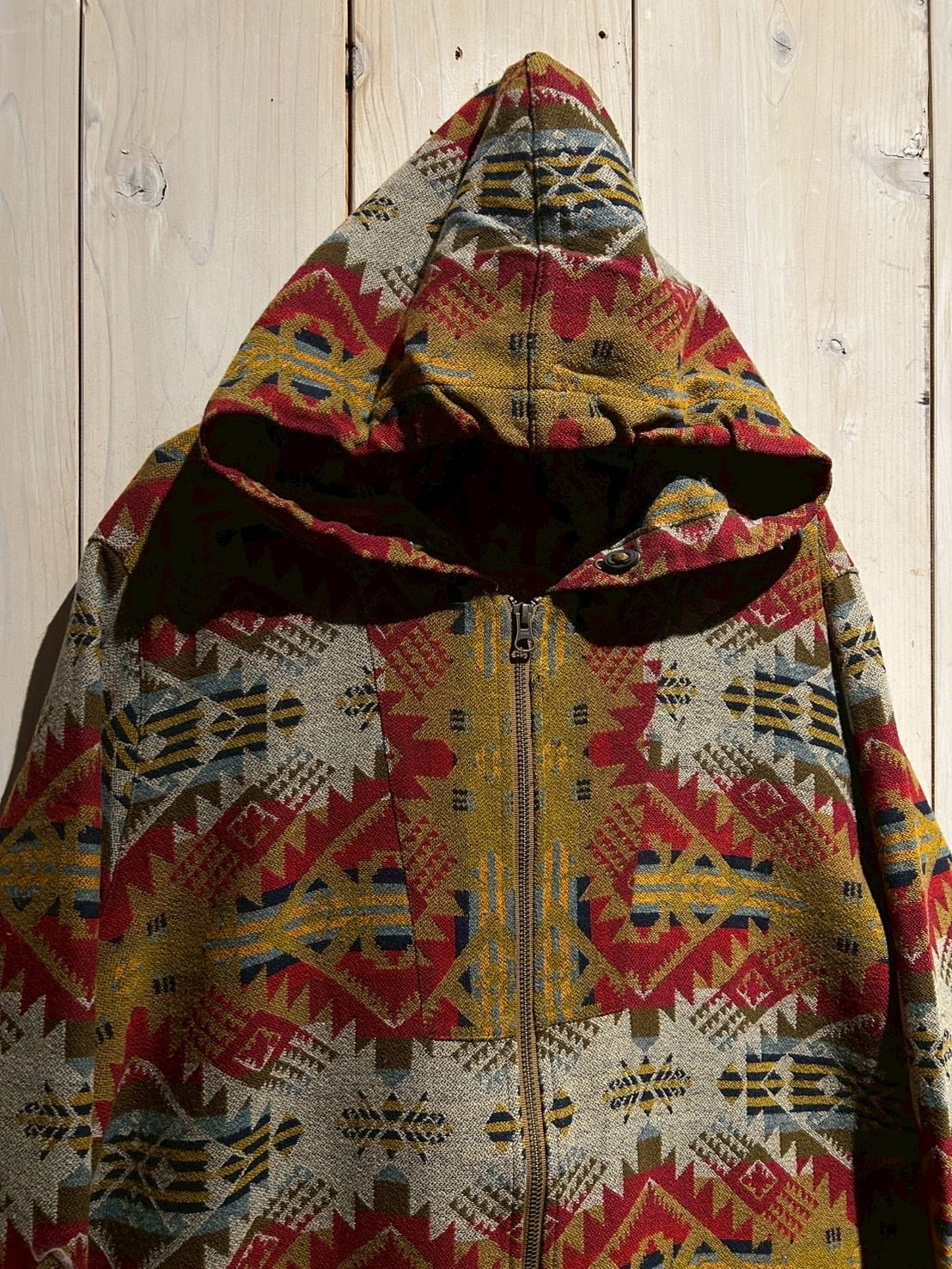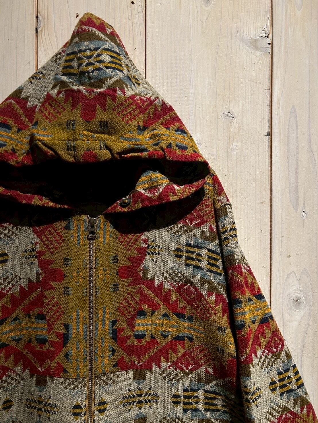 柔らかくコシのある織で、このブランドらしいネイティブ柄を載せたジップアップフーディ。