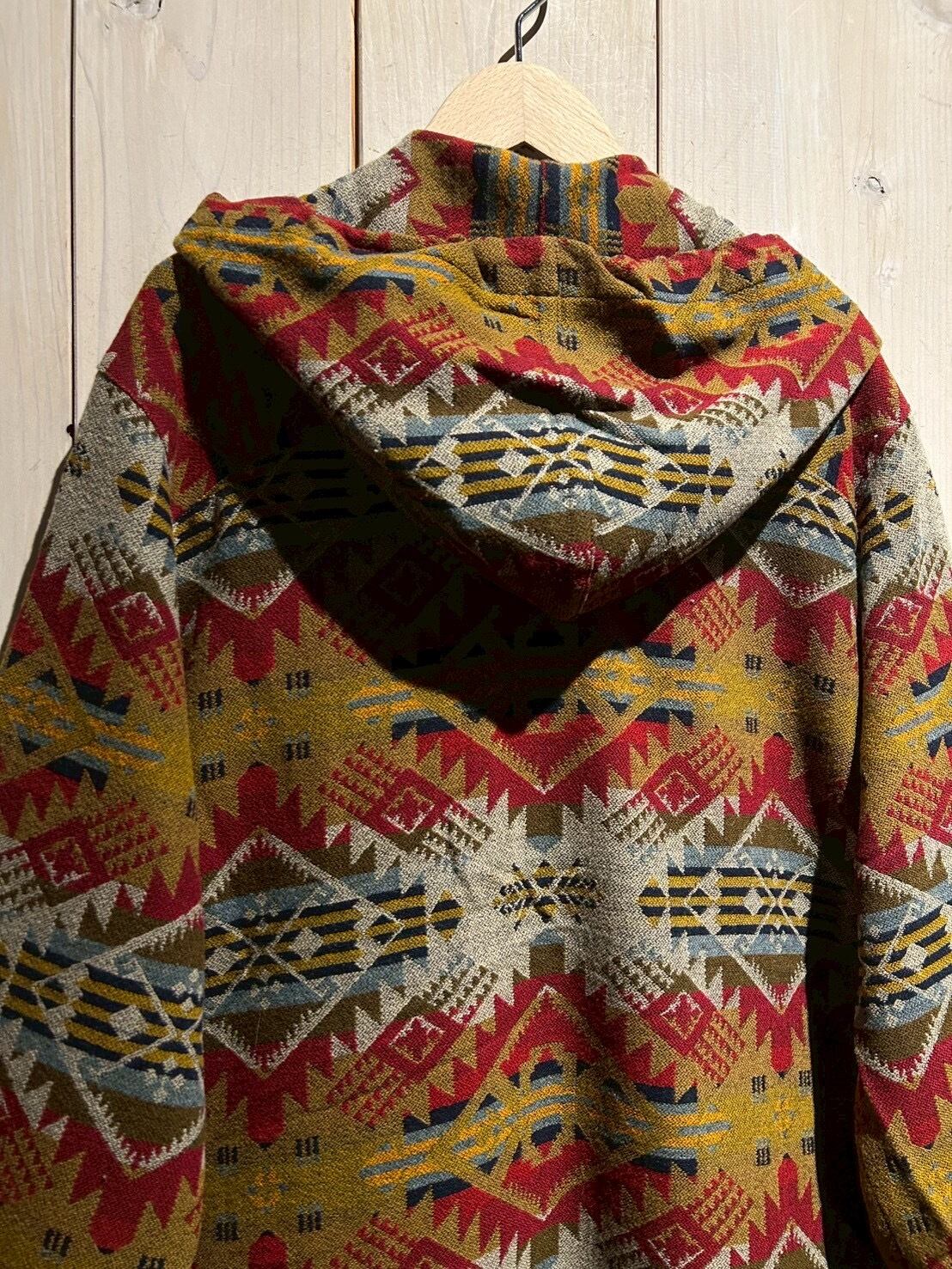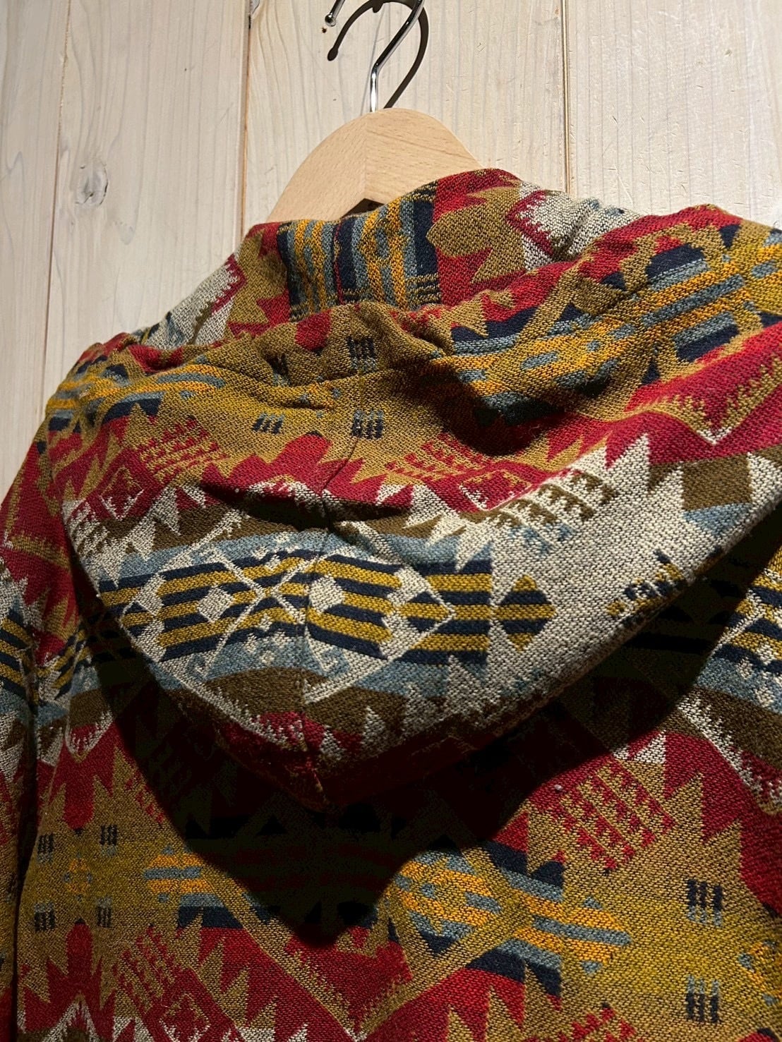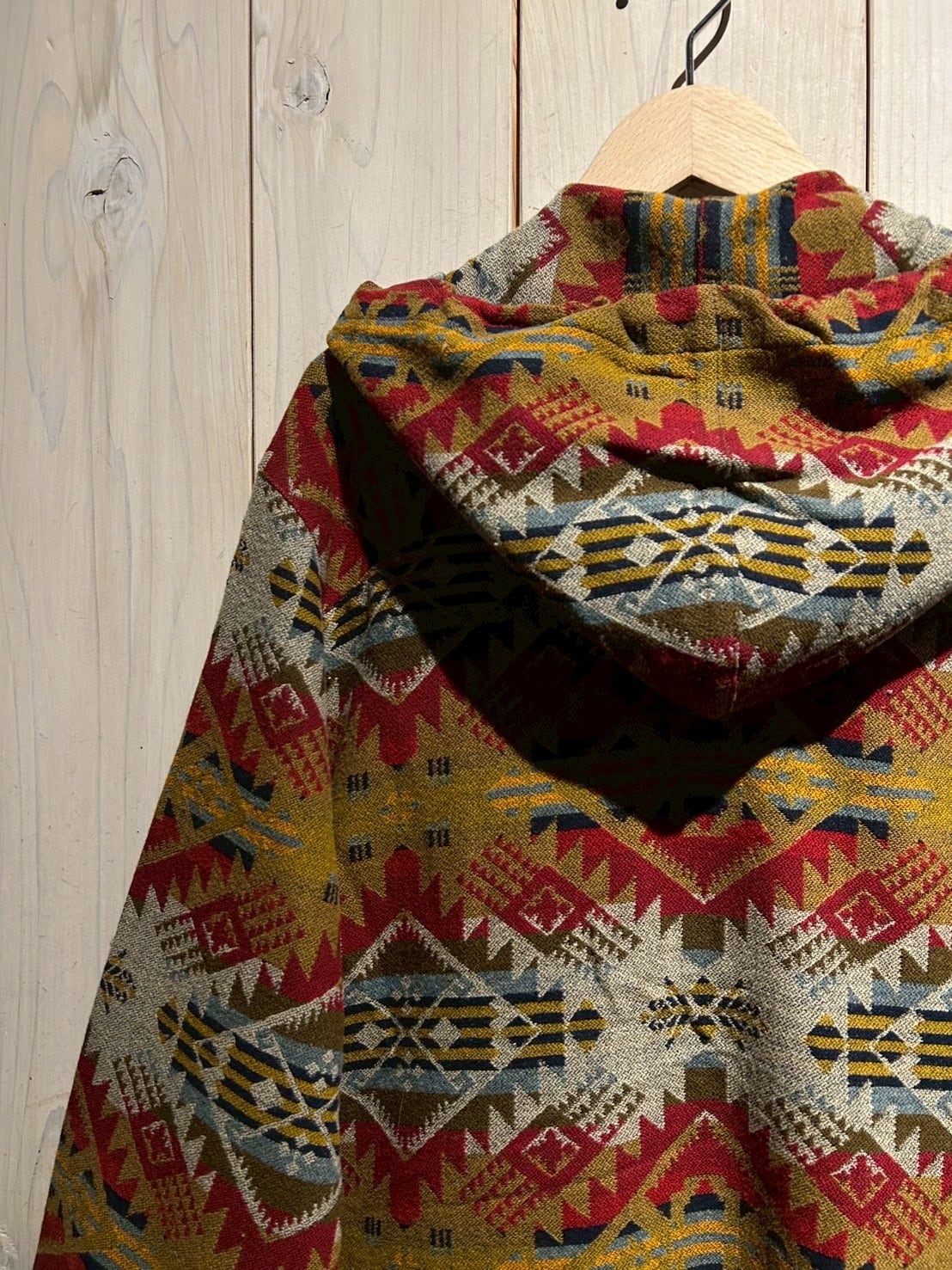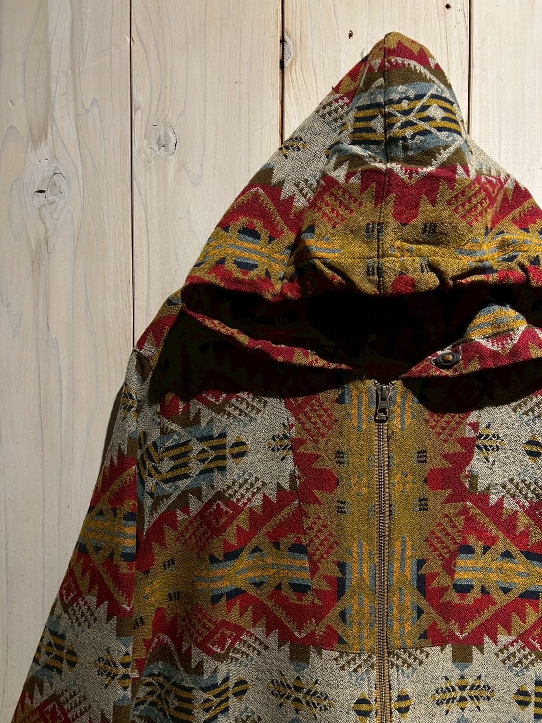柔らかくコシのある織で、このブランドらしいネイティブ柄を載せたジップアップフーディ。