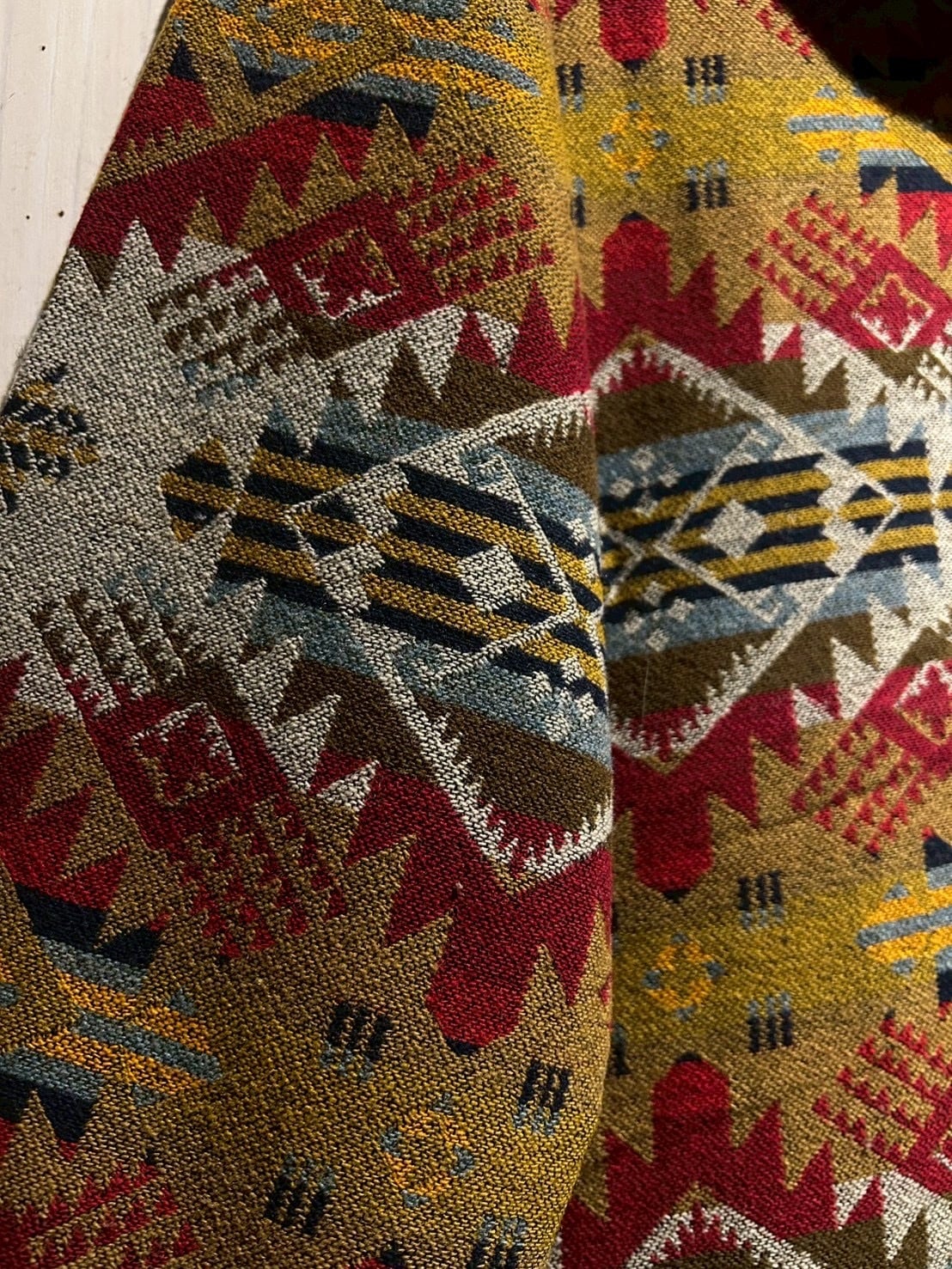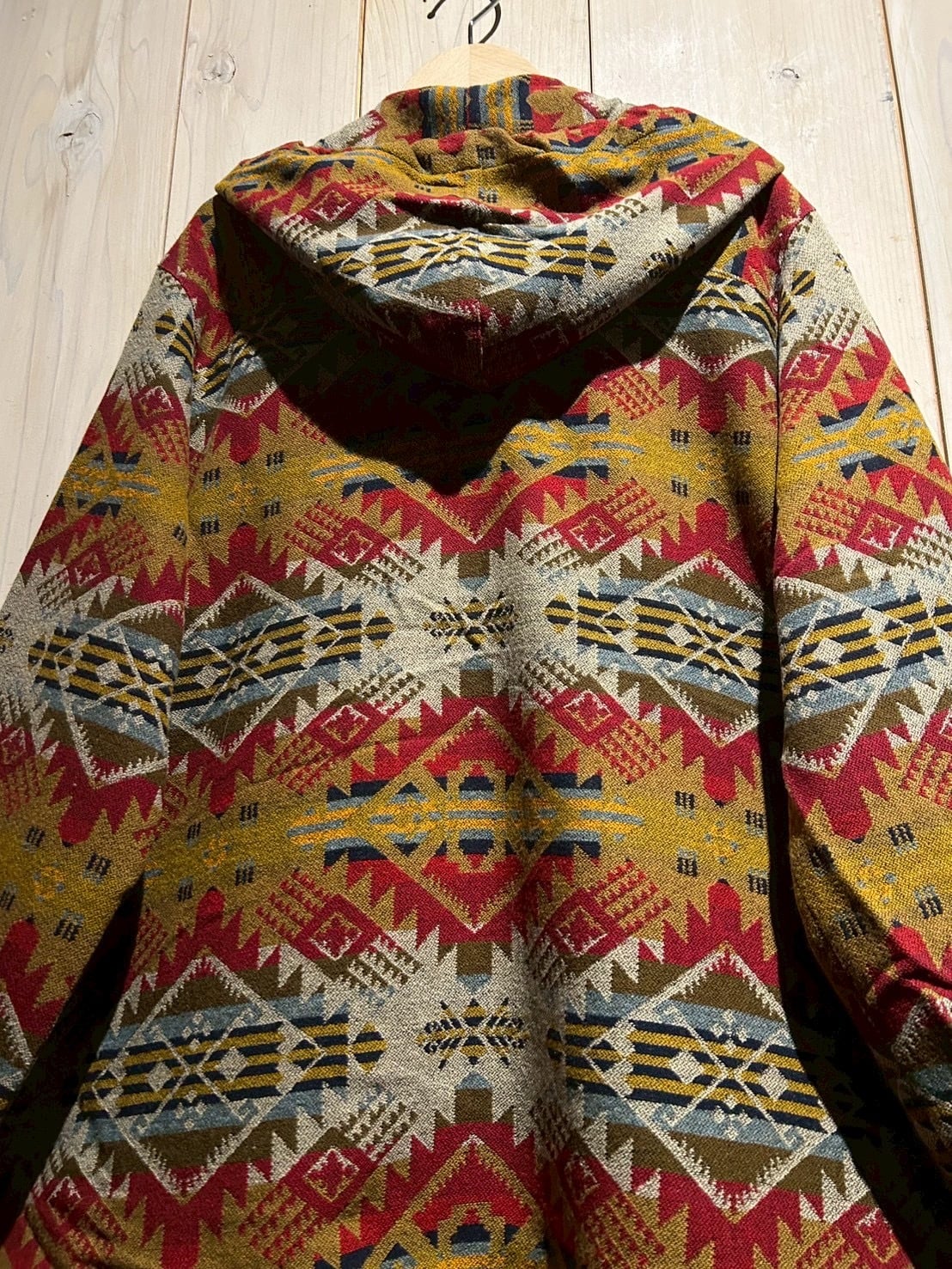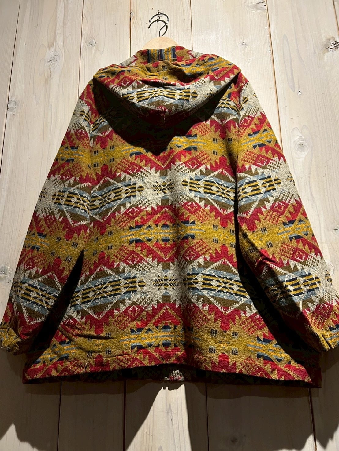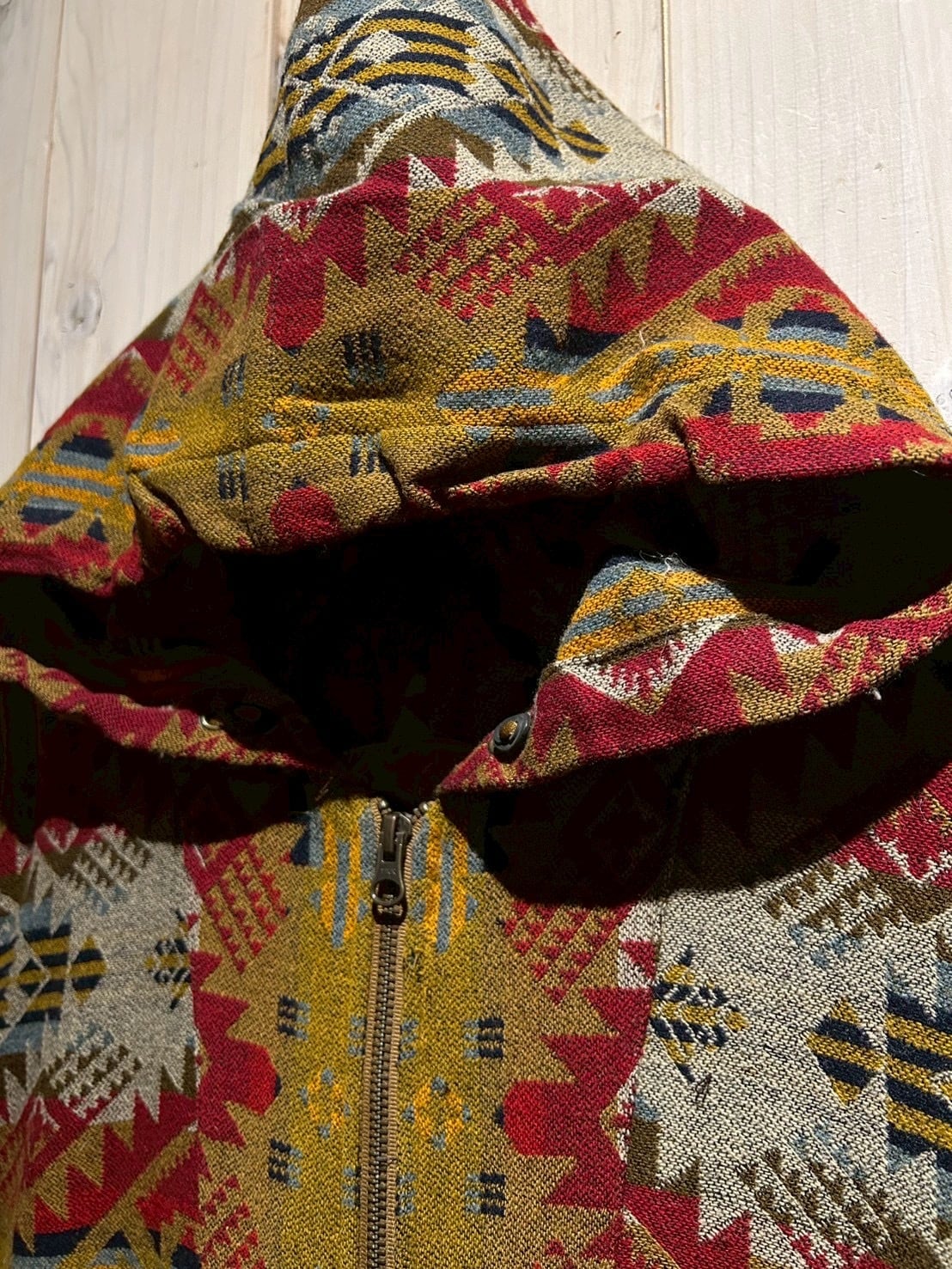 柔らかくコシのある織で、このブランドらしいネイティブ柄を載せたジップアップフーディ。