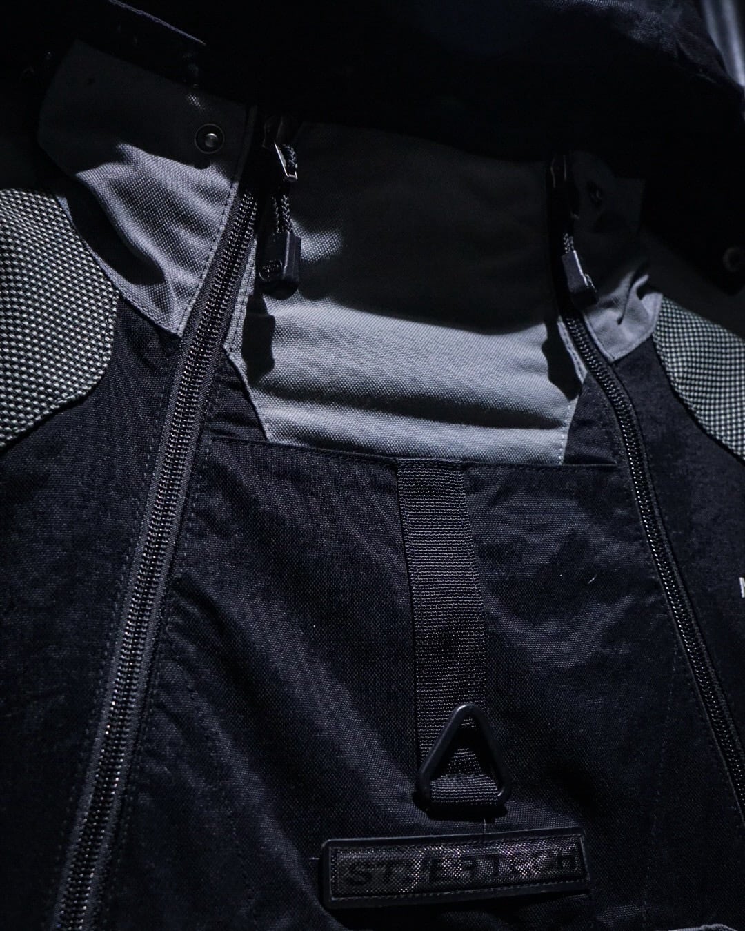 アルピニズムやバックカントリーといった過酷な環境下を想定して設計されたシリーズらしく、タフで信頼感のあるファブリックをベースに、ブラック×グレーのモノトーン配色でまとめた都会的な一着。