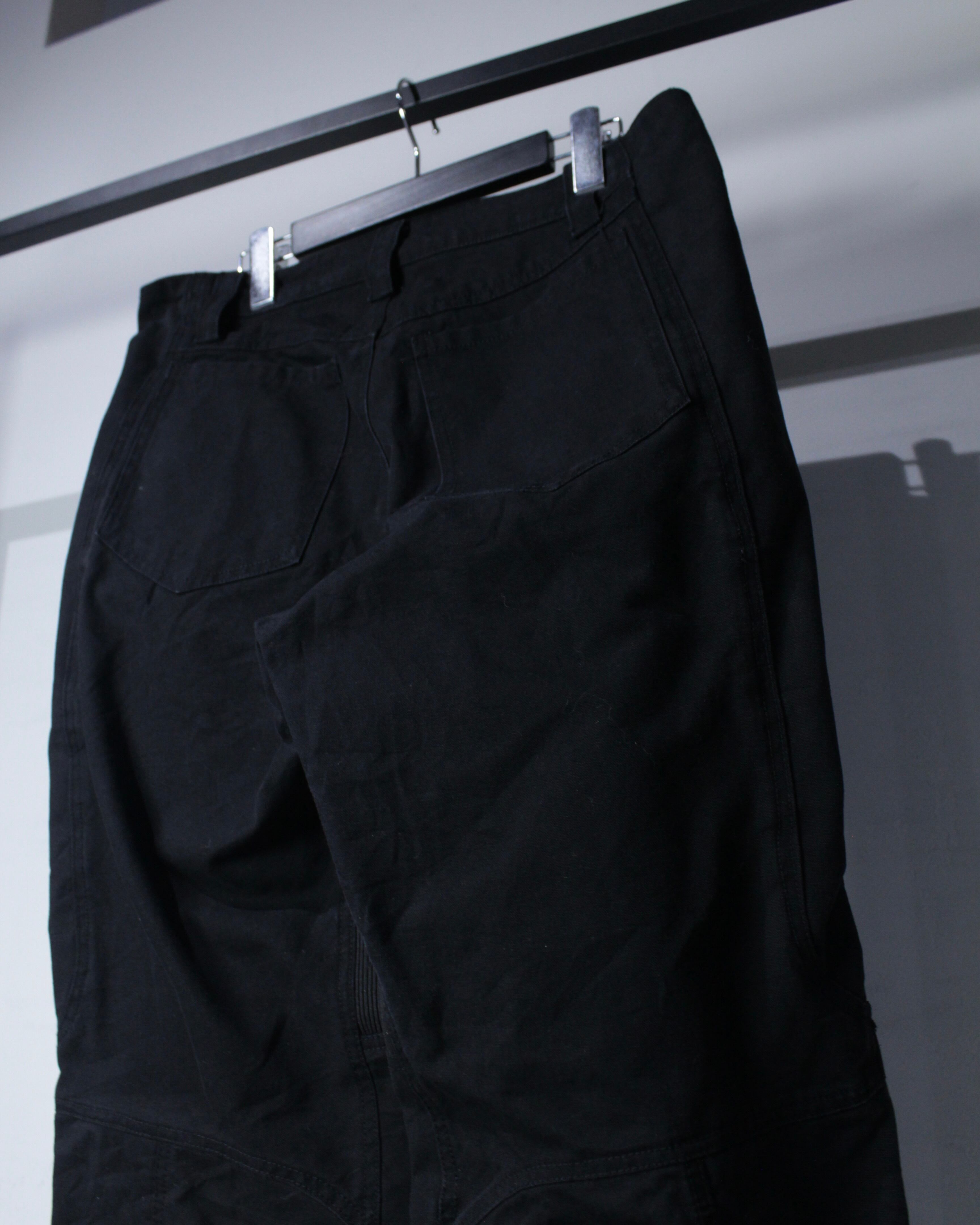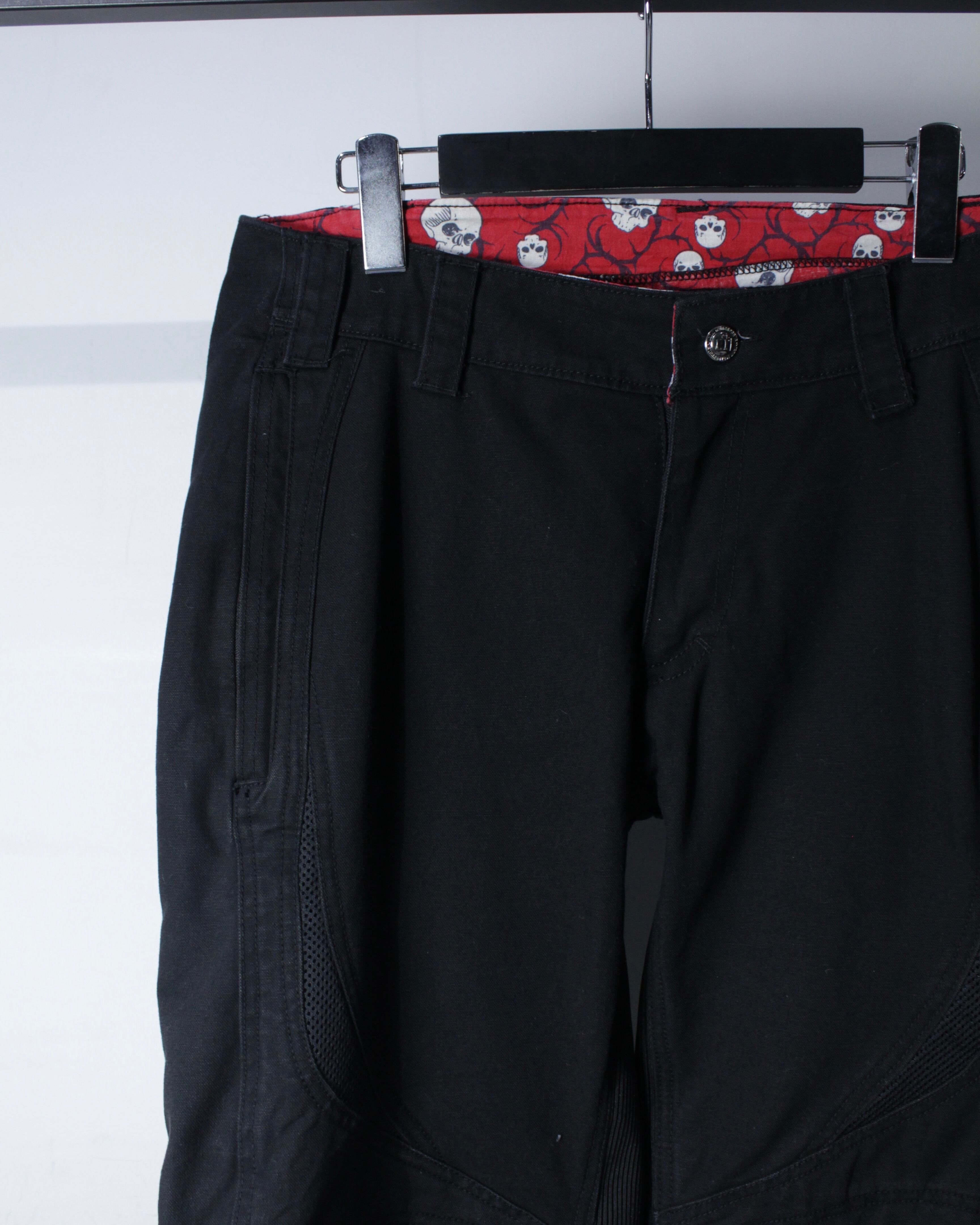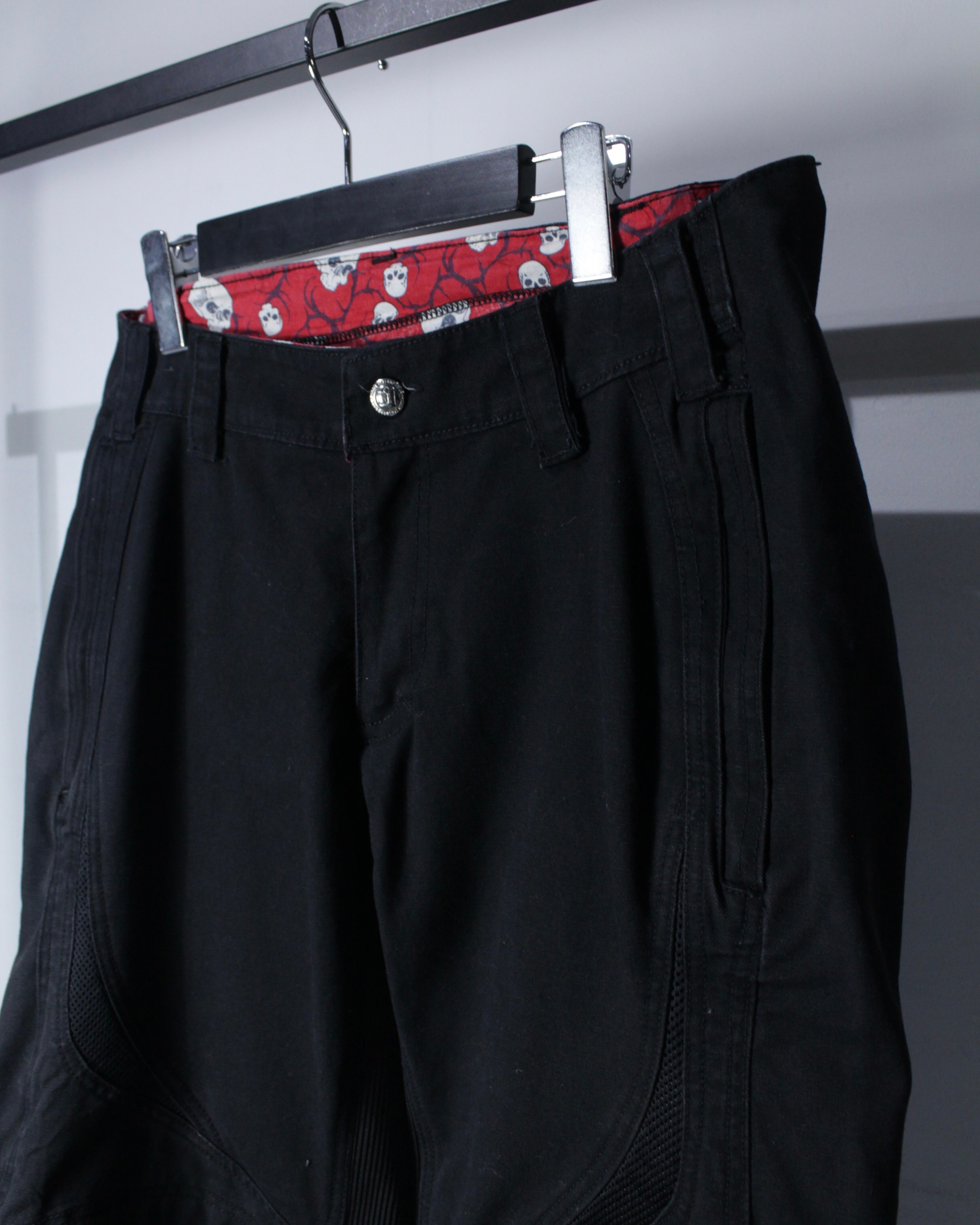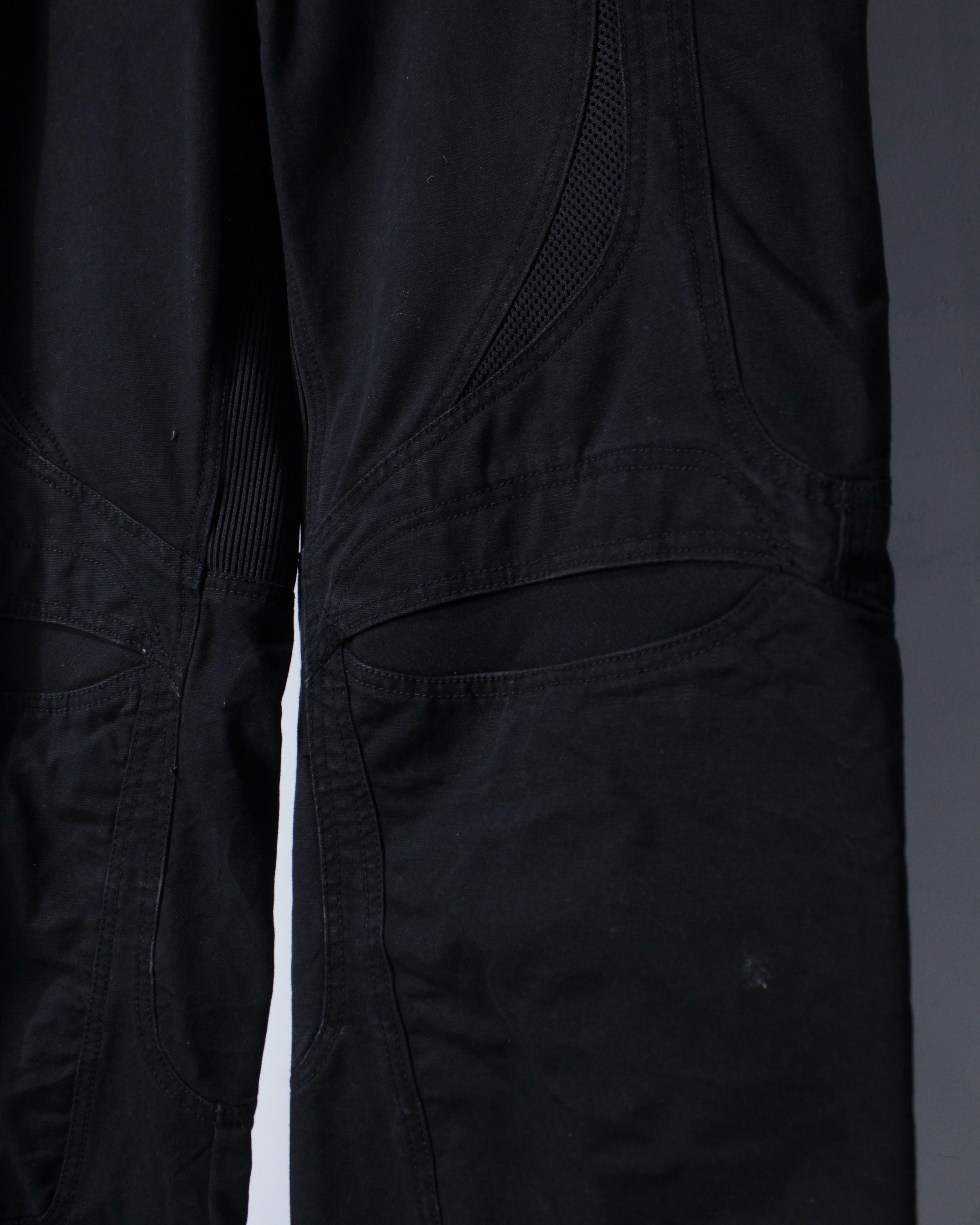 タフなブラックのボディに、モーターサイクルパンツならではの機能的な切り替えが施された1着。