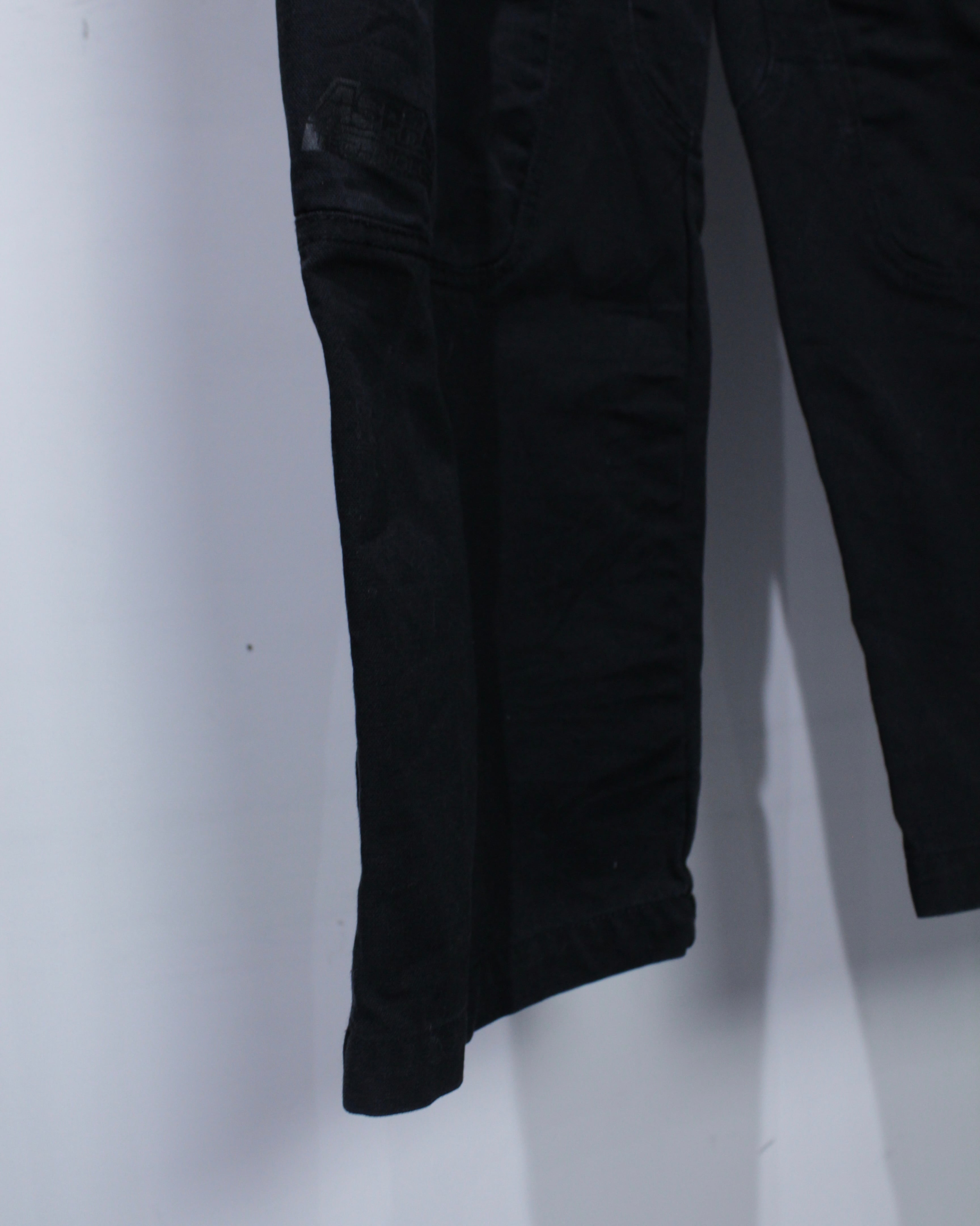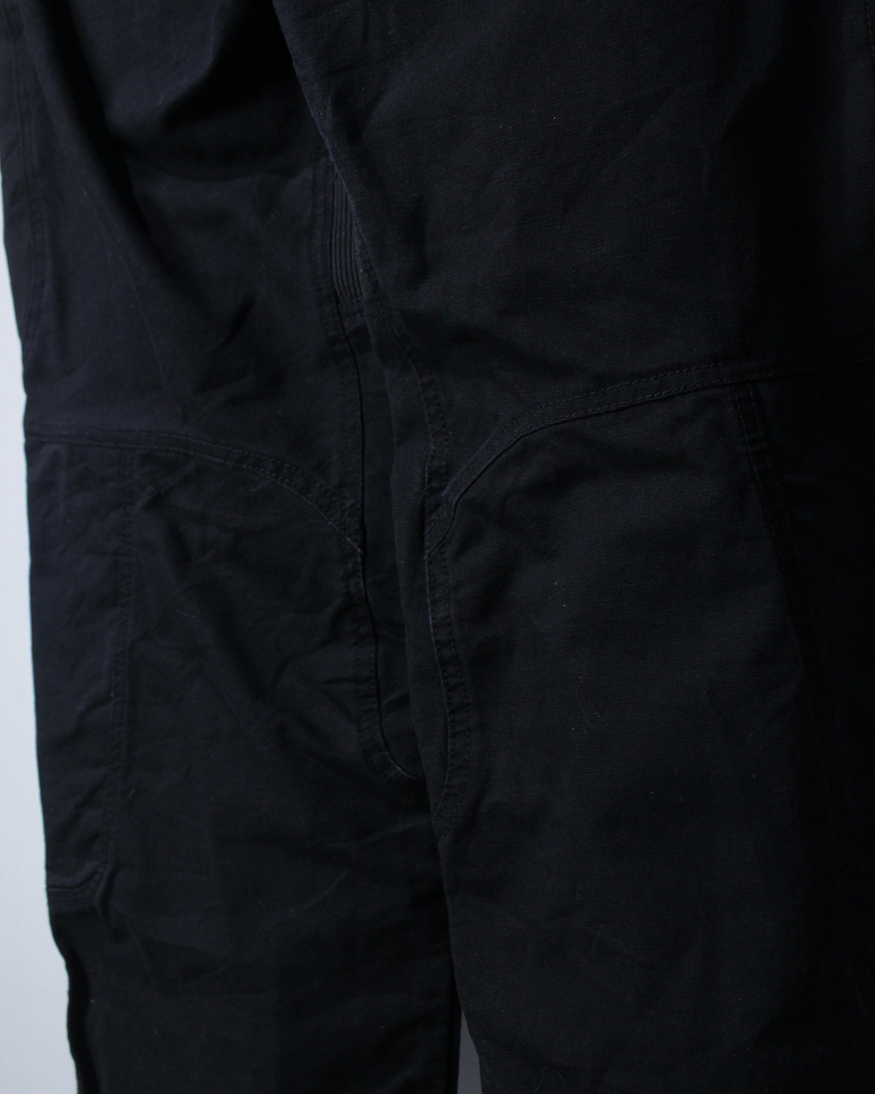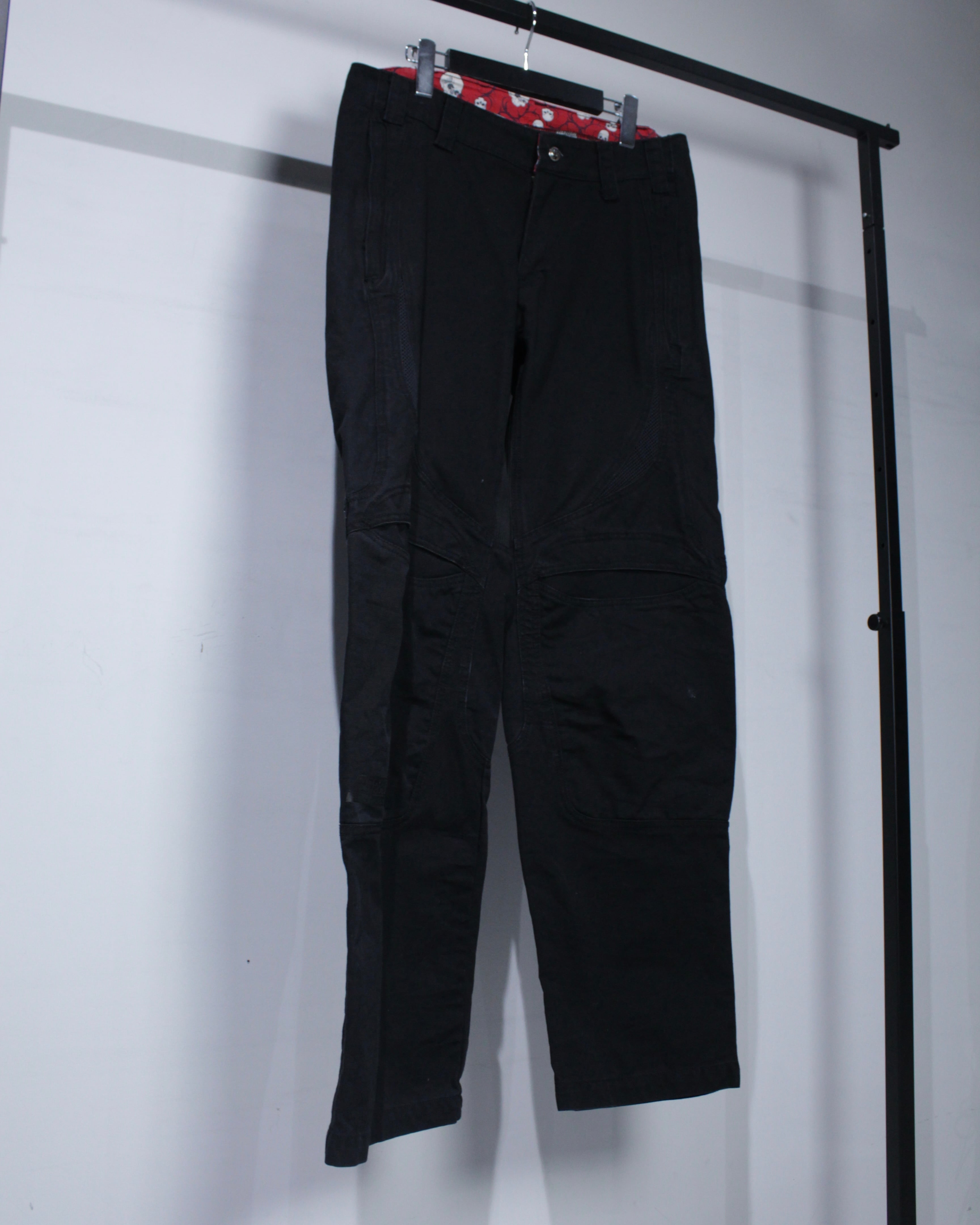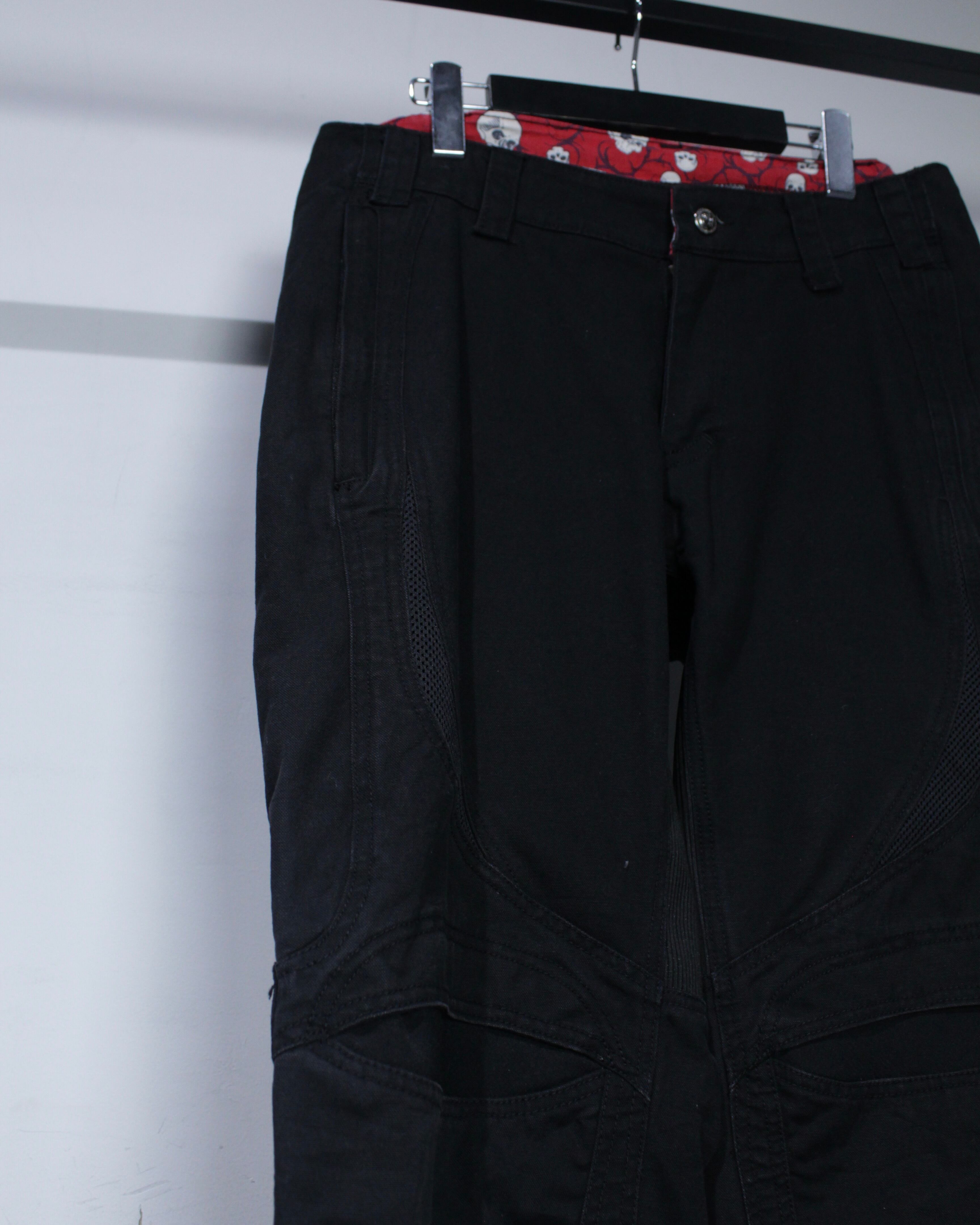 タフなブラックのボディに、モーターサイクルパンツならではの機能的な切り替えが施された1着。