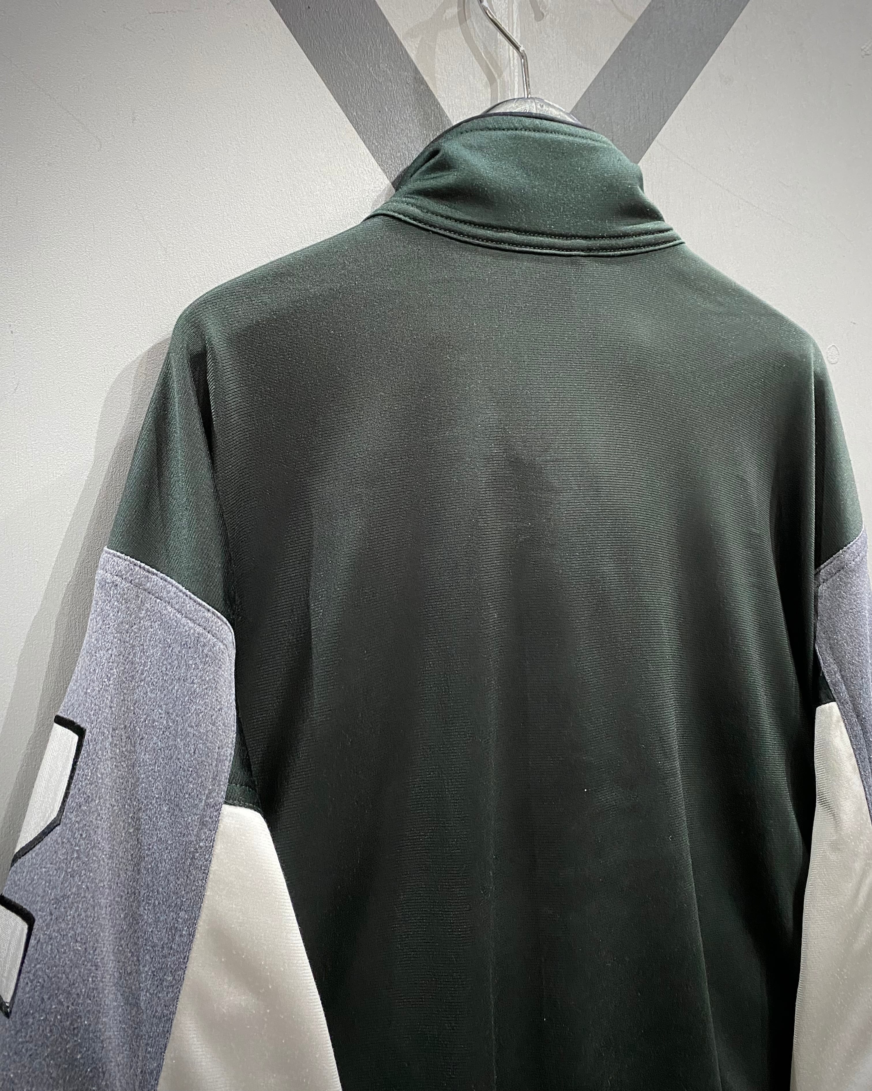 グリーンをベースに、ホワイトとグレーを効かせた切り替え、左胸にはスウッシュロゴ、右袖には大胆なNIKEロゴ刺繍を配置した1着。