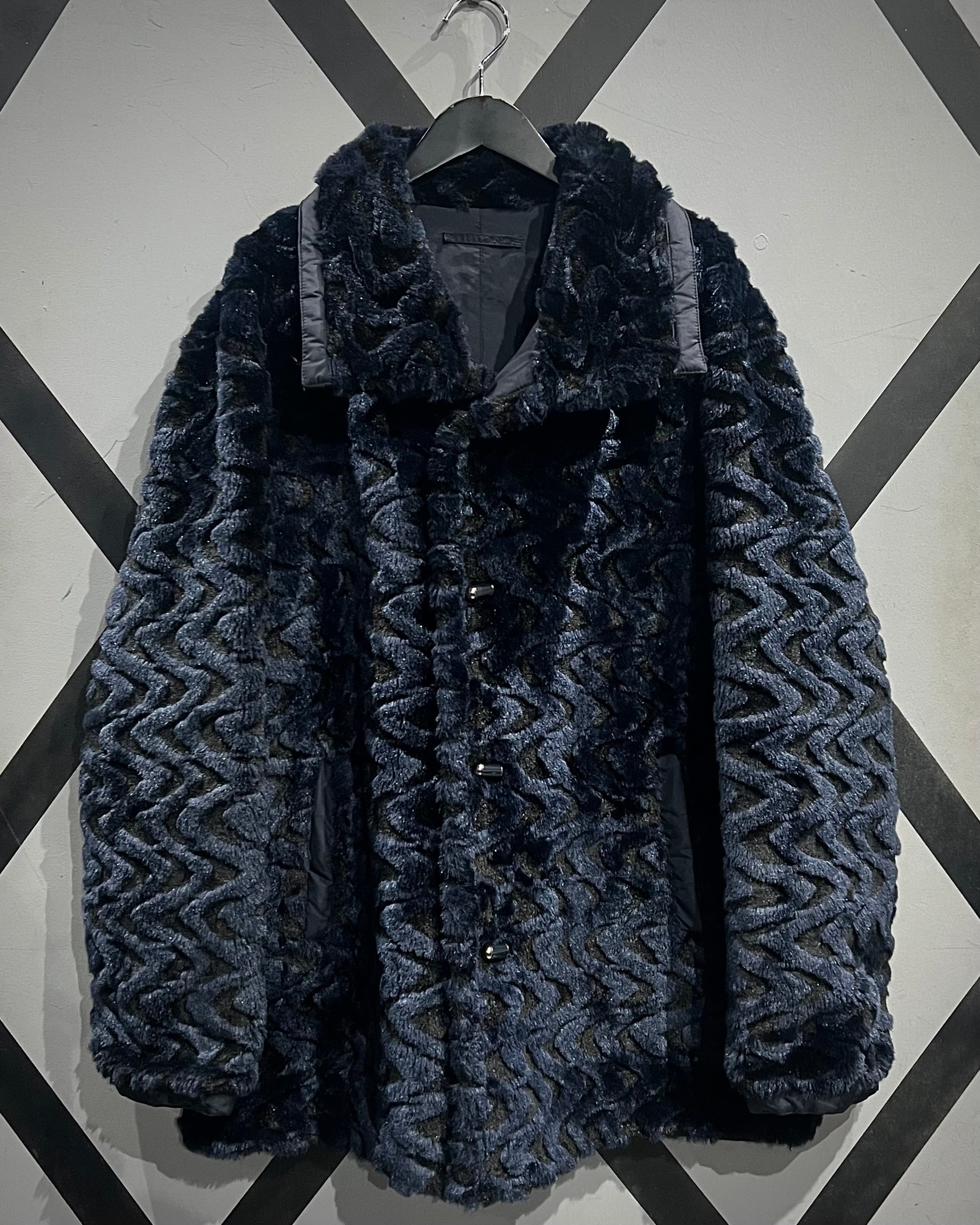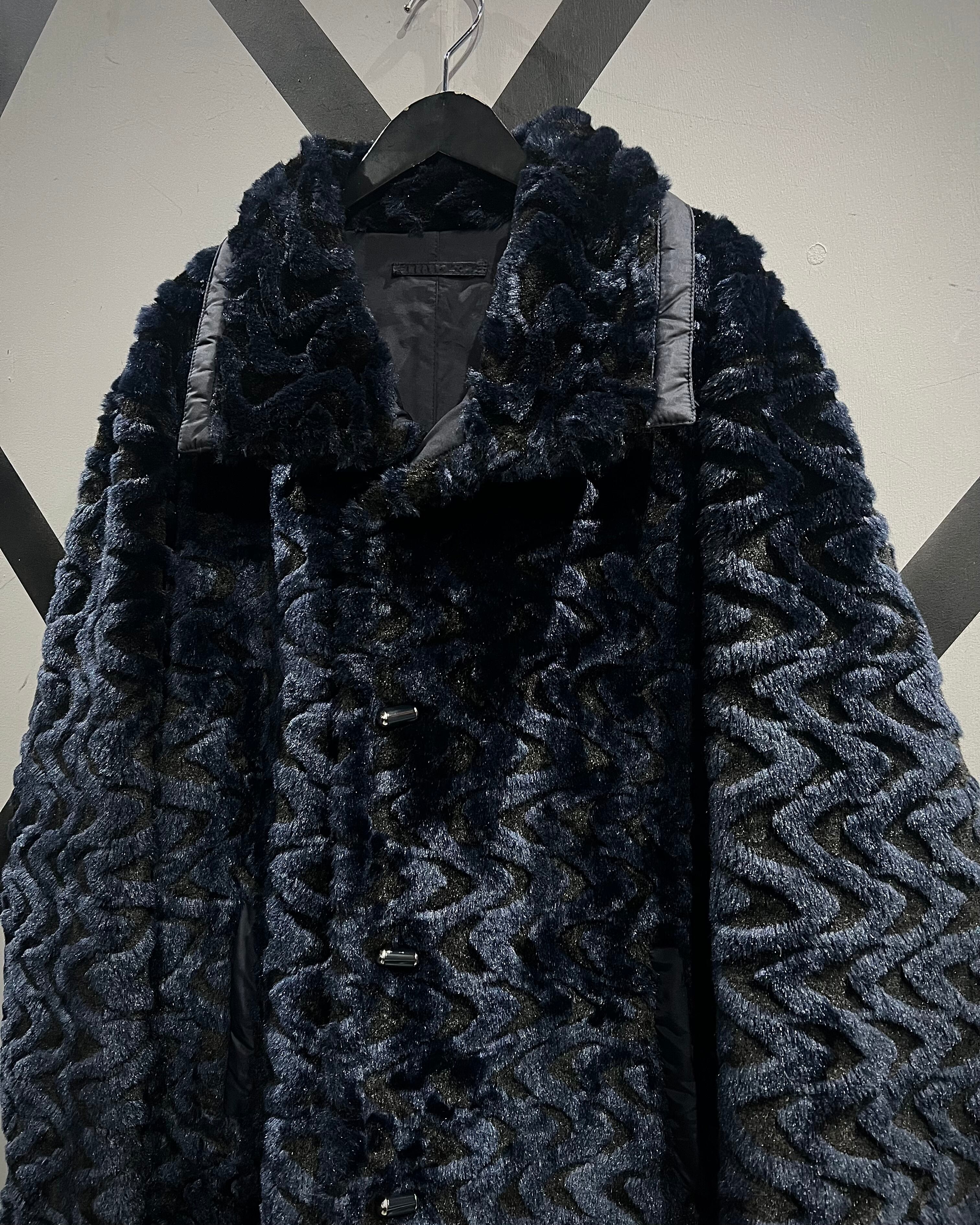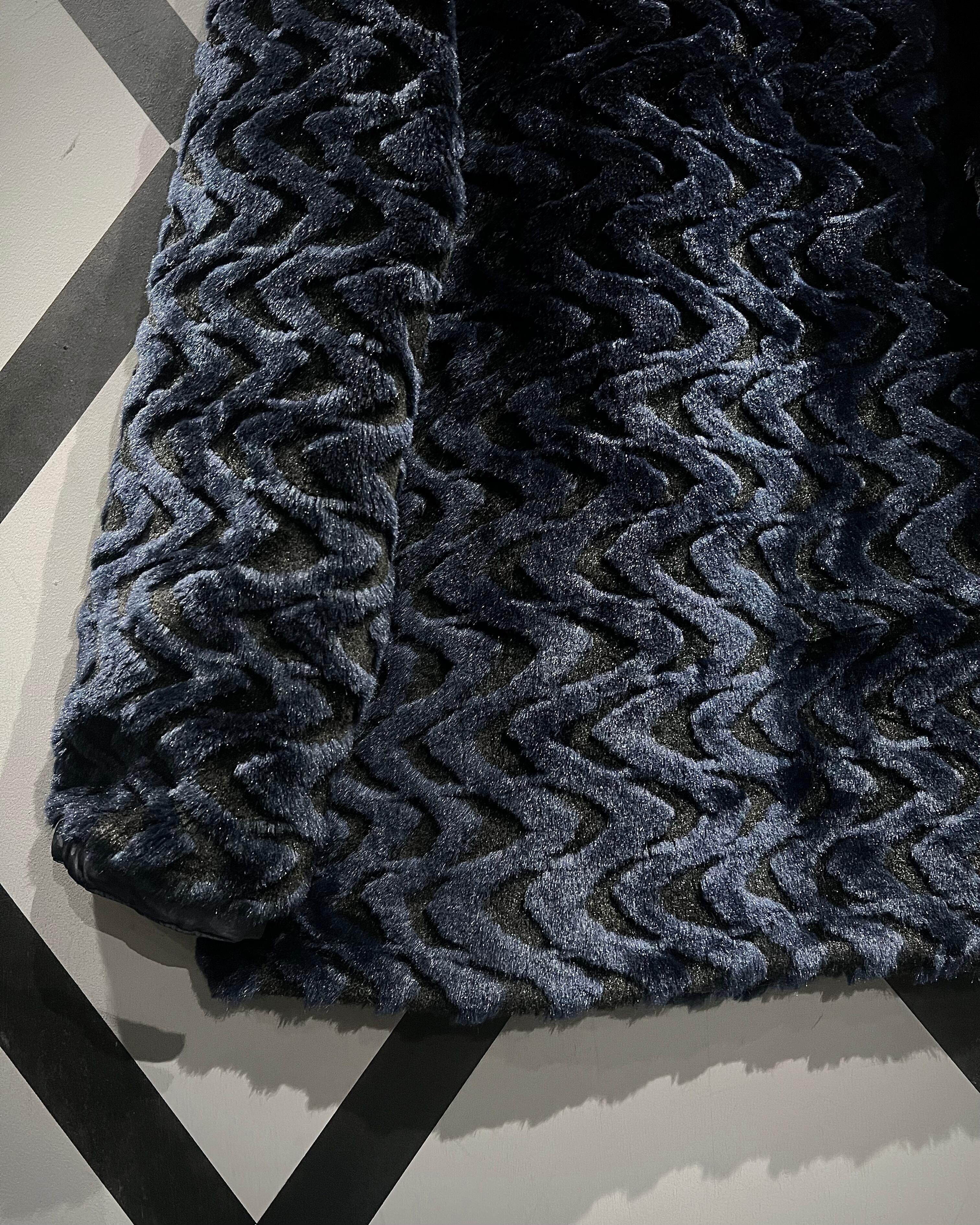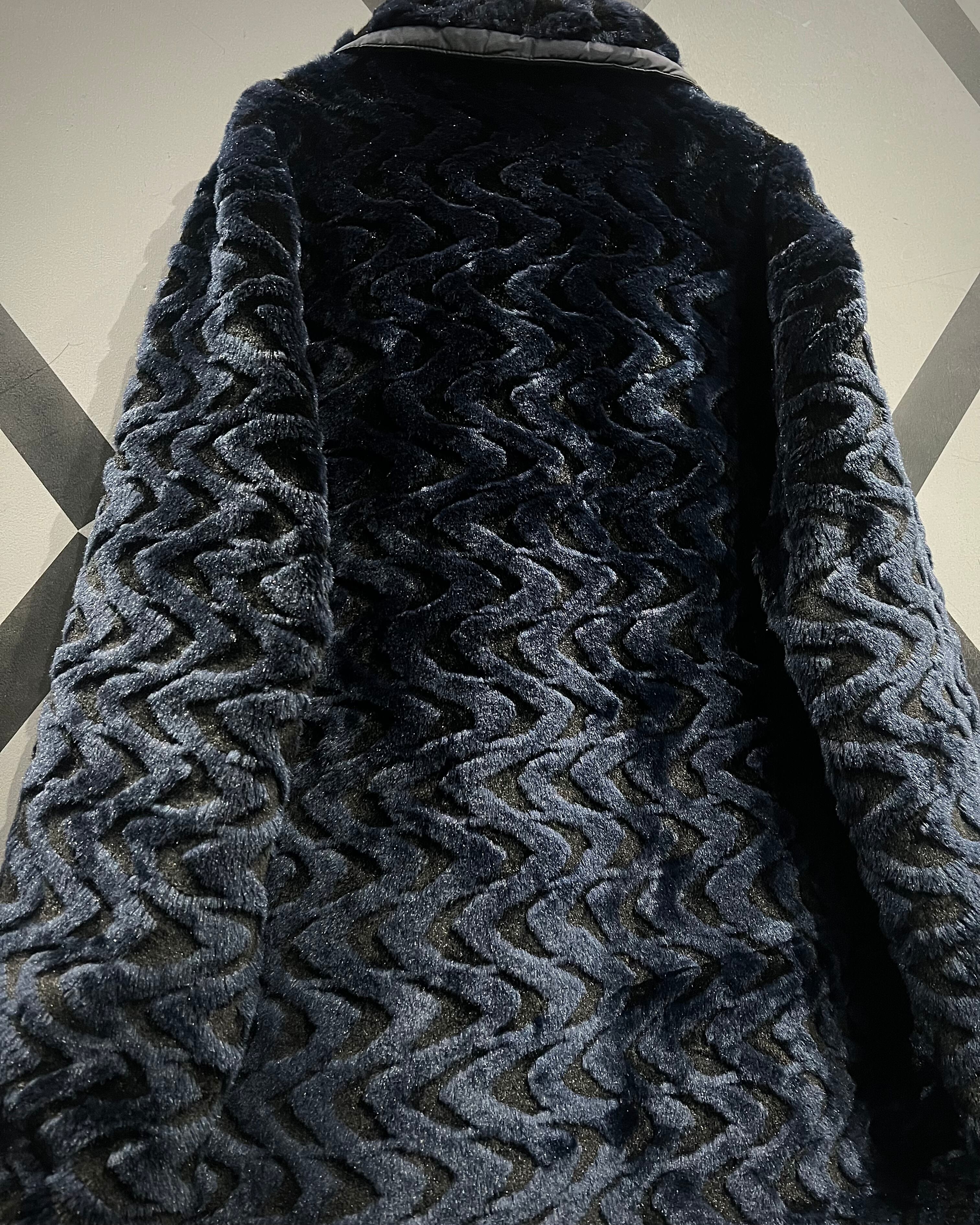 ネイビーベースのフェイクファーを採用し、立体感のある波状パターンをボディ全面に映し出した、リバーシブル仕様のフェイクファージャケット。