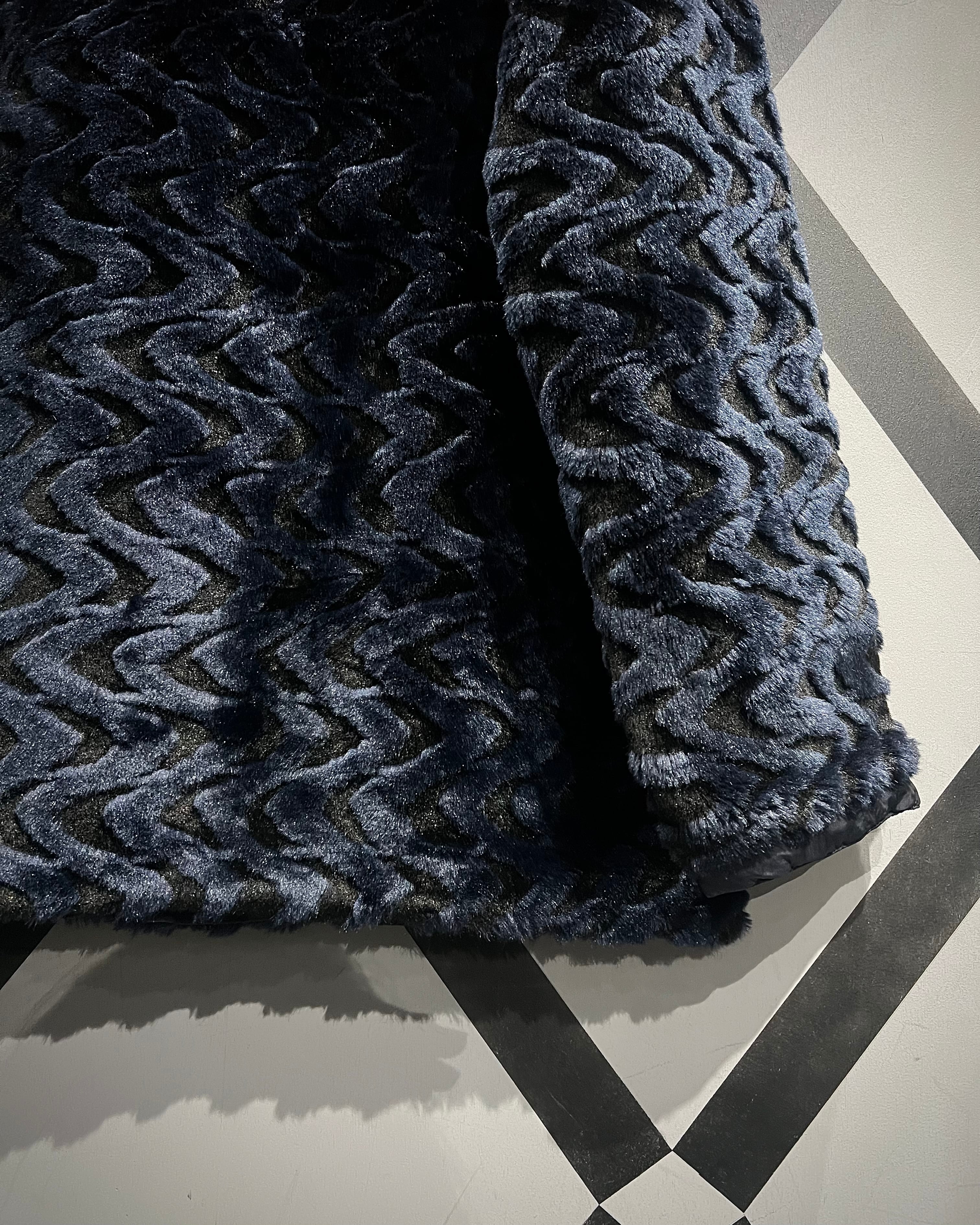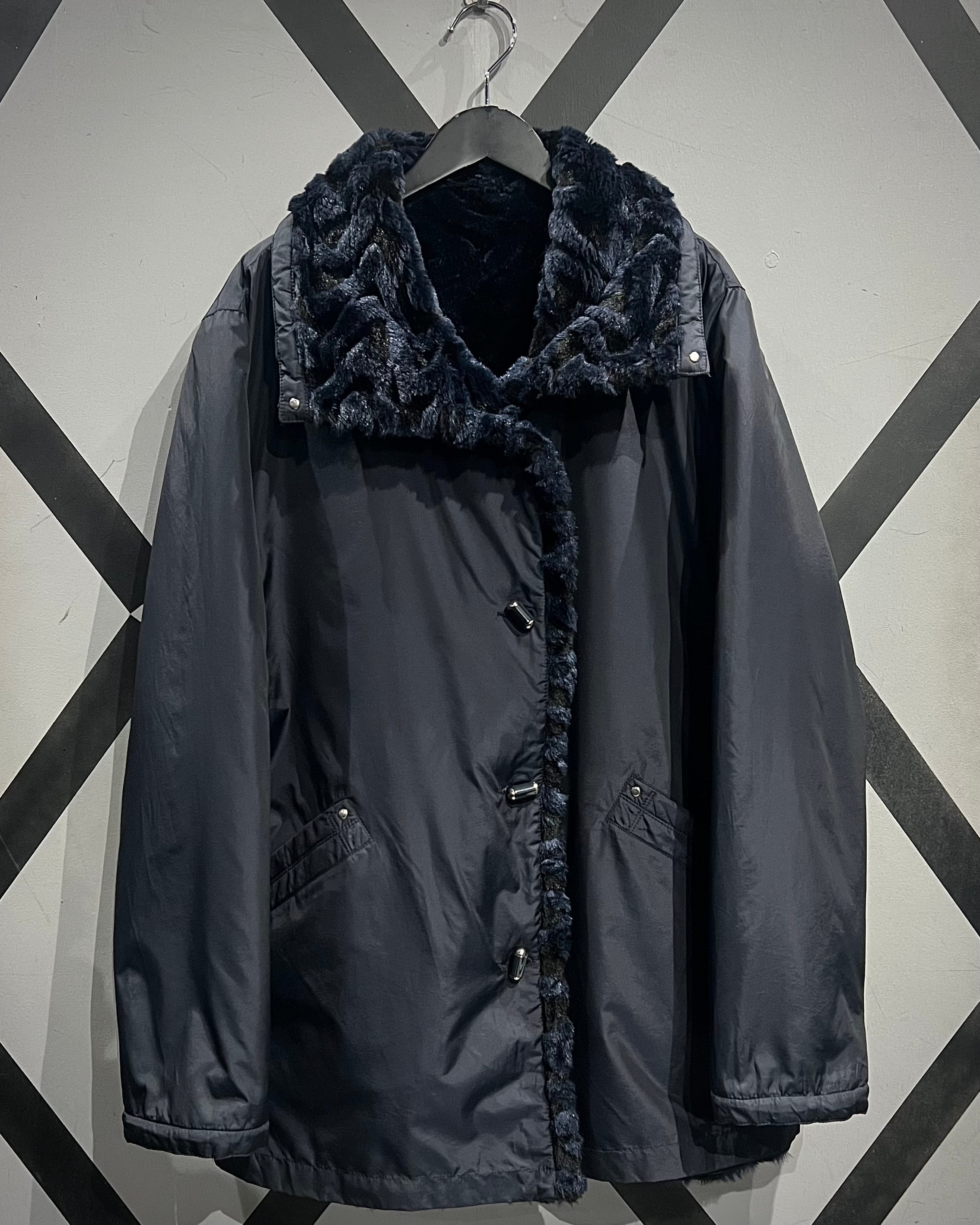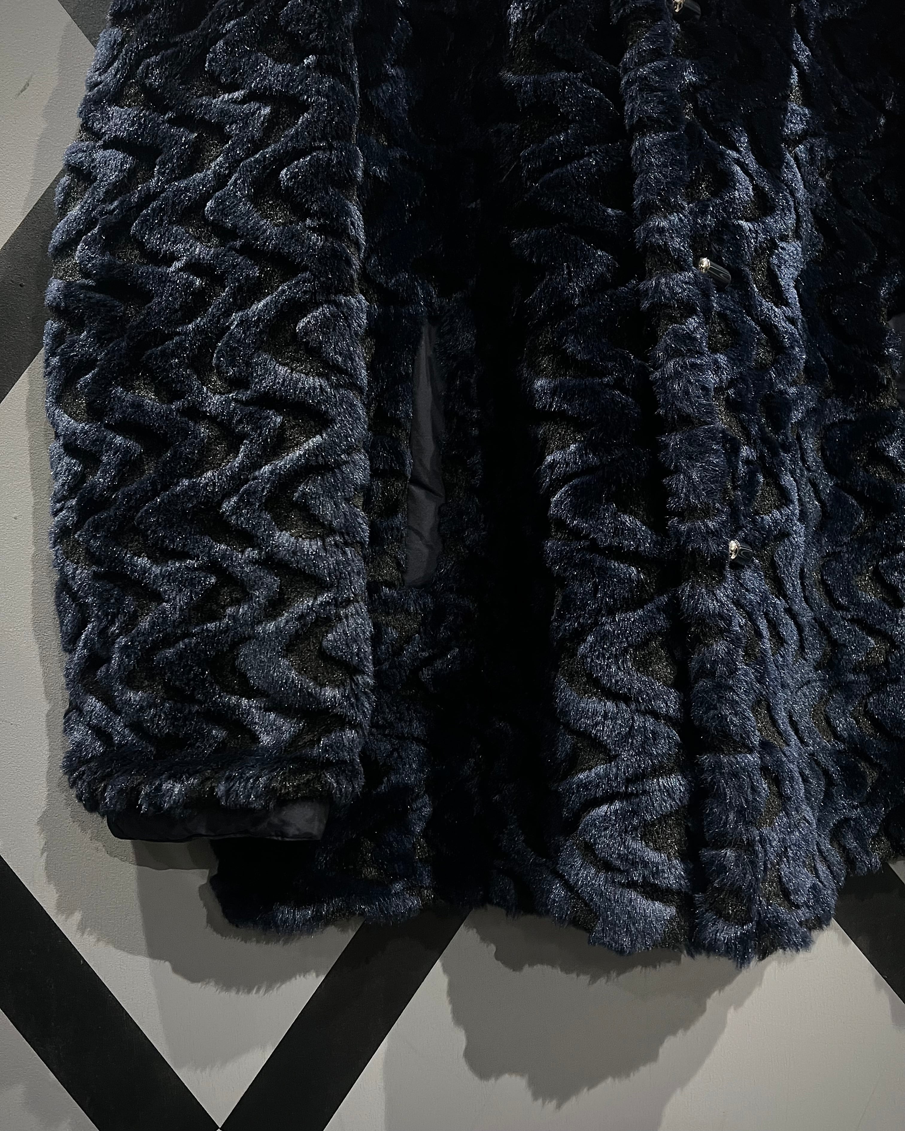 ネイビーベースのフェイクファーを採用し、立体感のある波状パターンをボディ全面に映し出した、リバーシブル仕様のフェイクファージャケット。