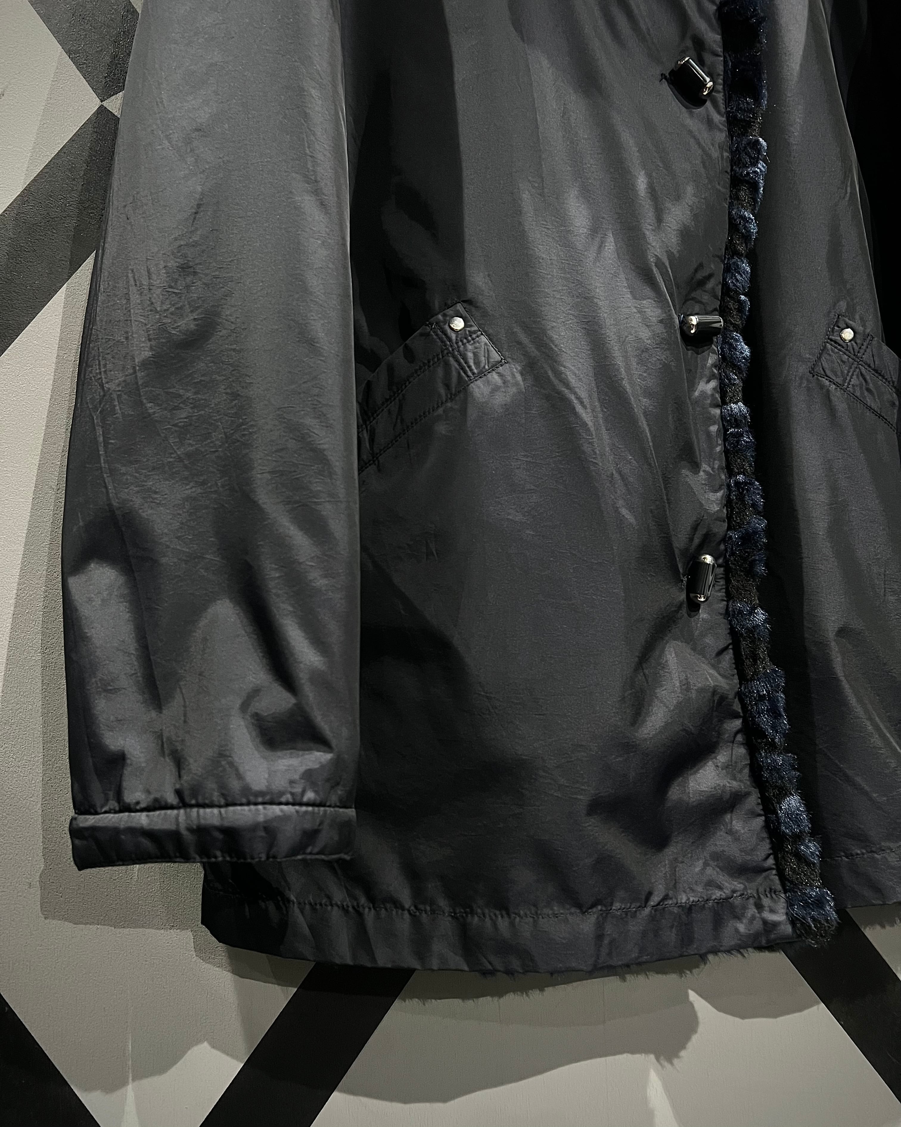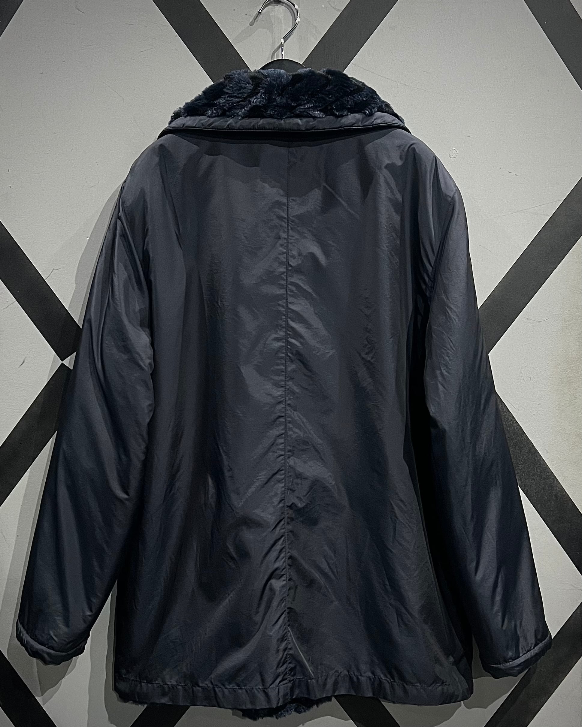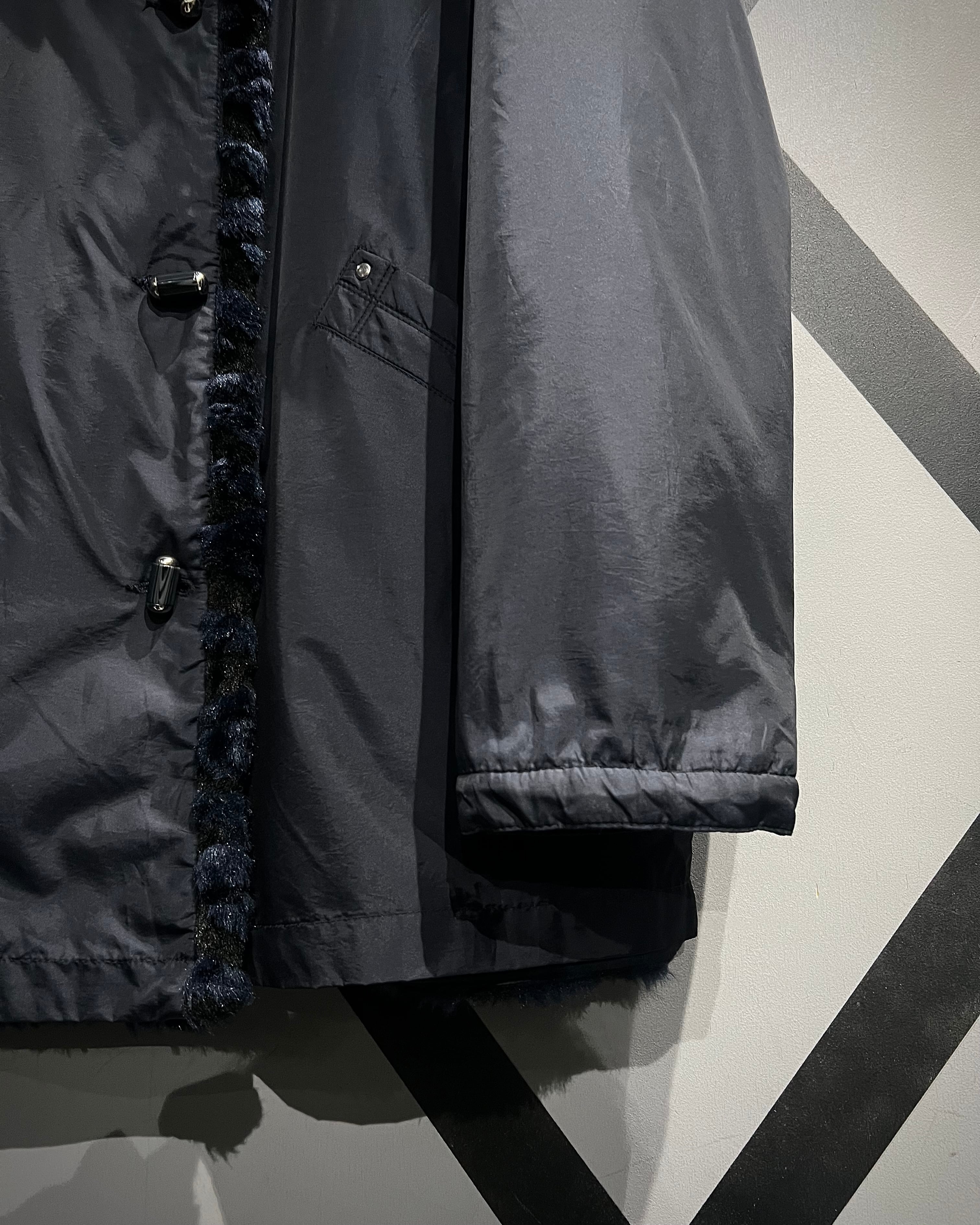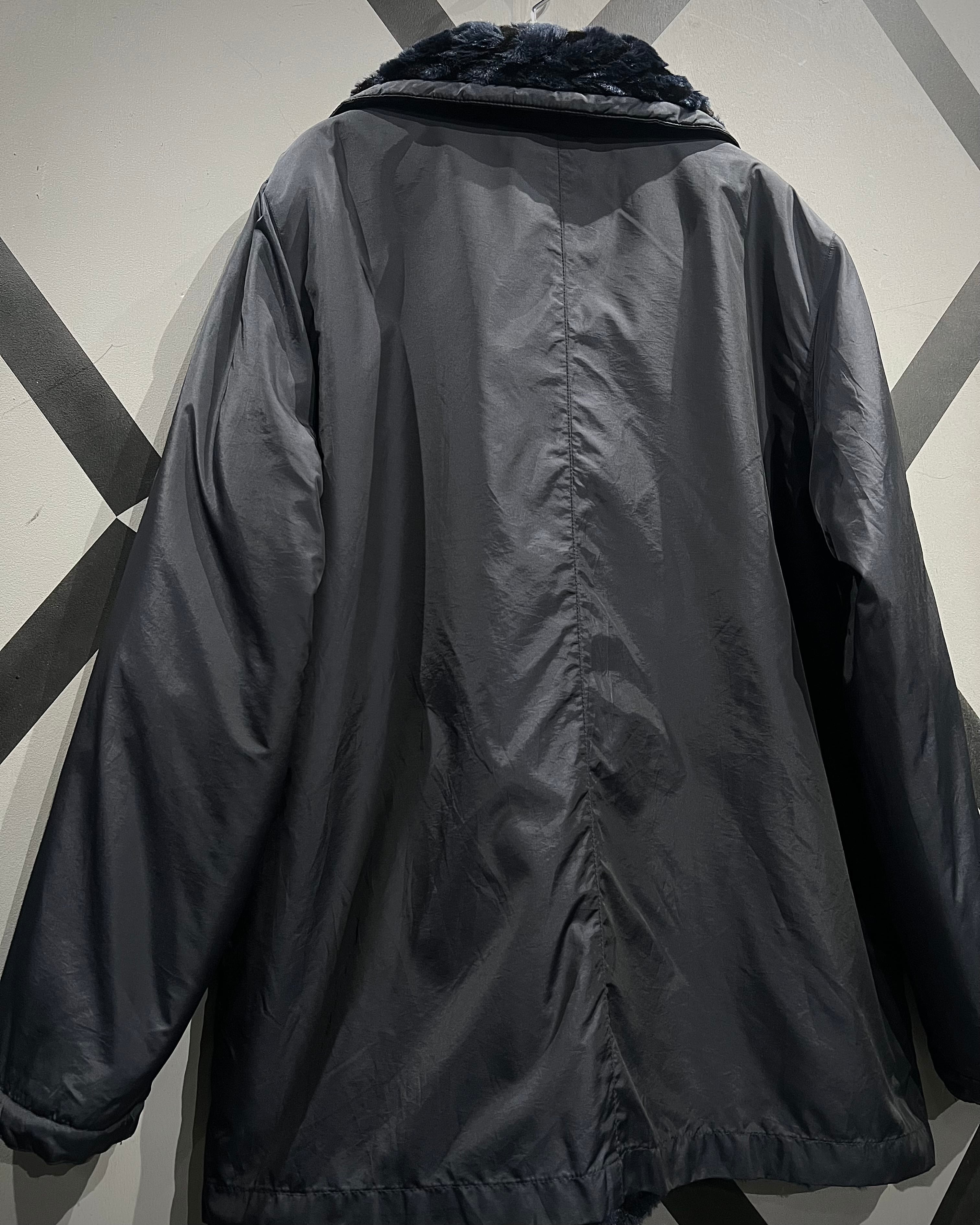 ネイビーベースのフェイクファーを採用し、立体感のある波状パターンをボディ全面に映し出した、リバーシブル仕様のフェイクファージャケット。