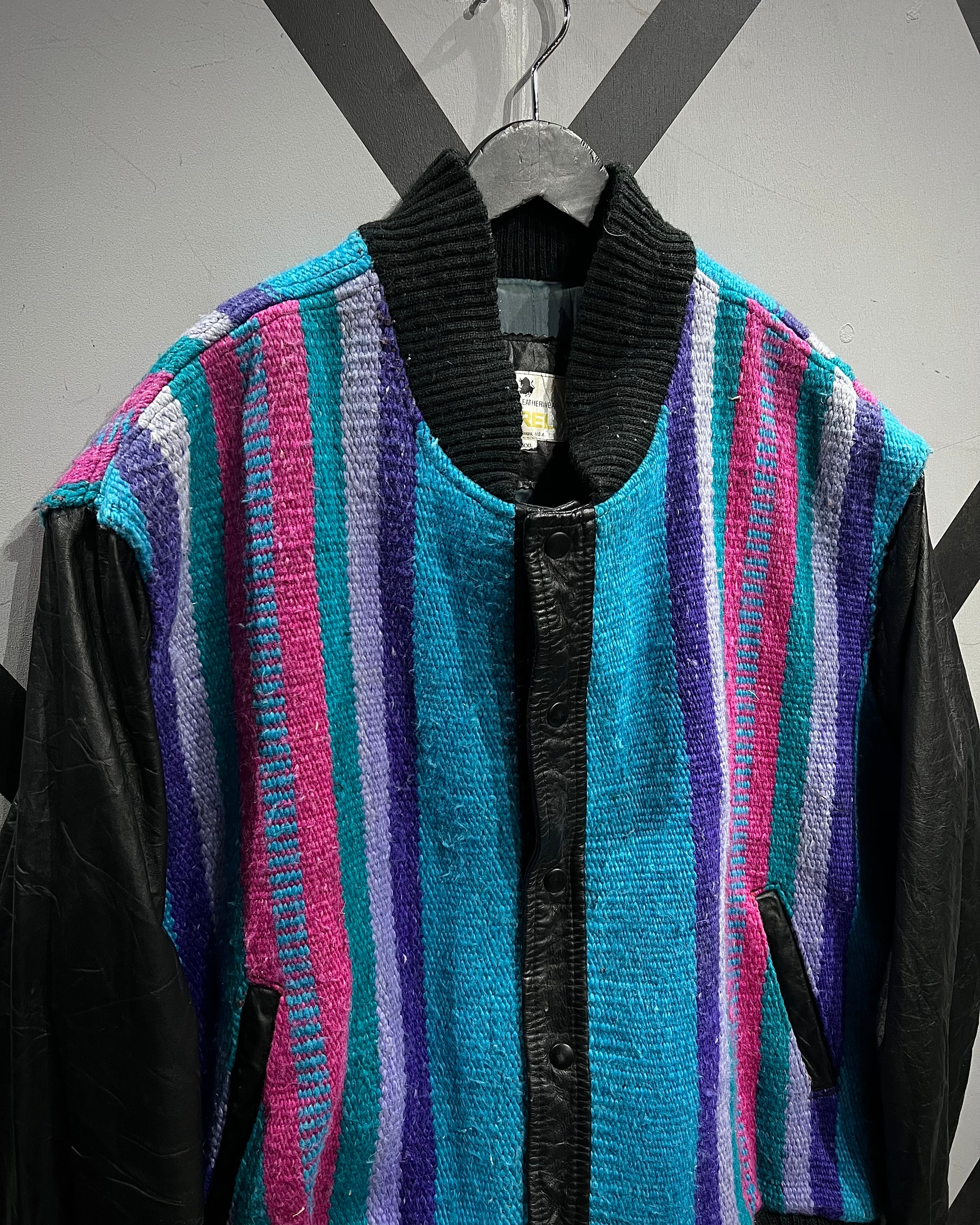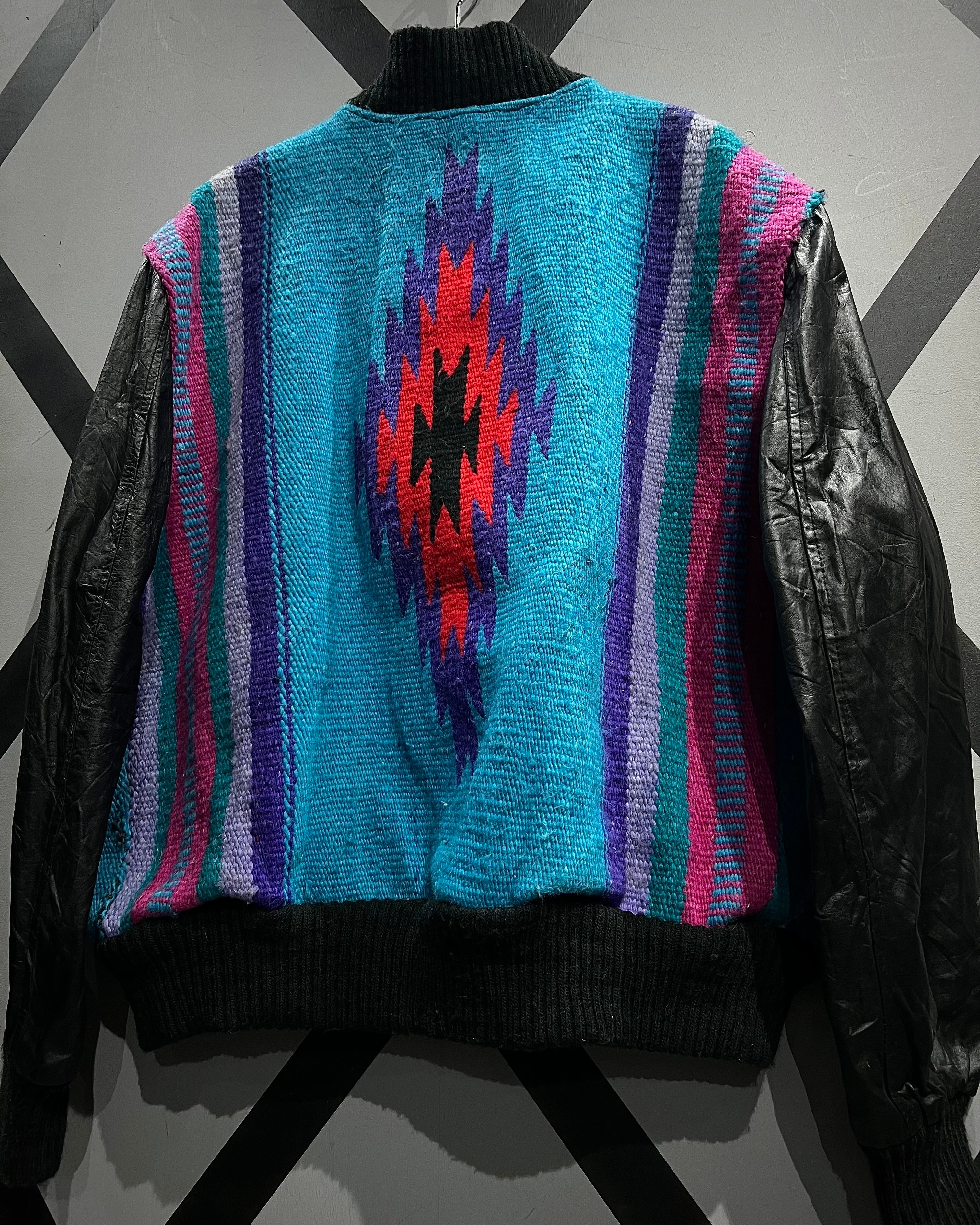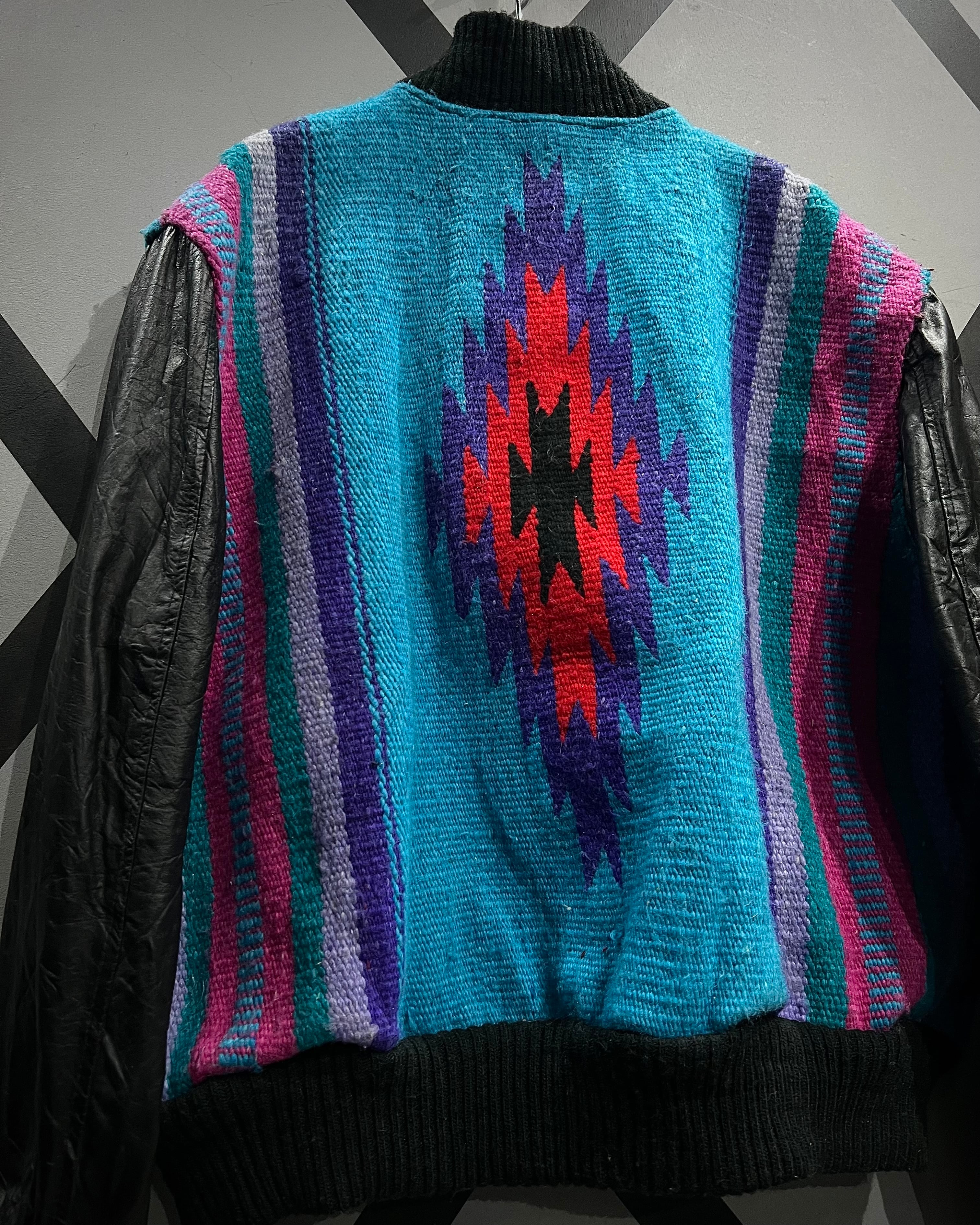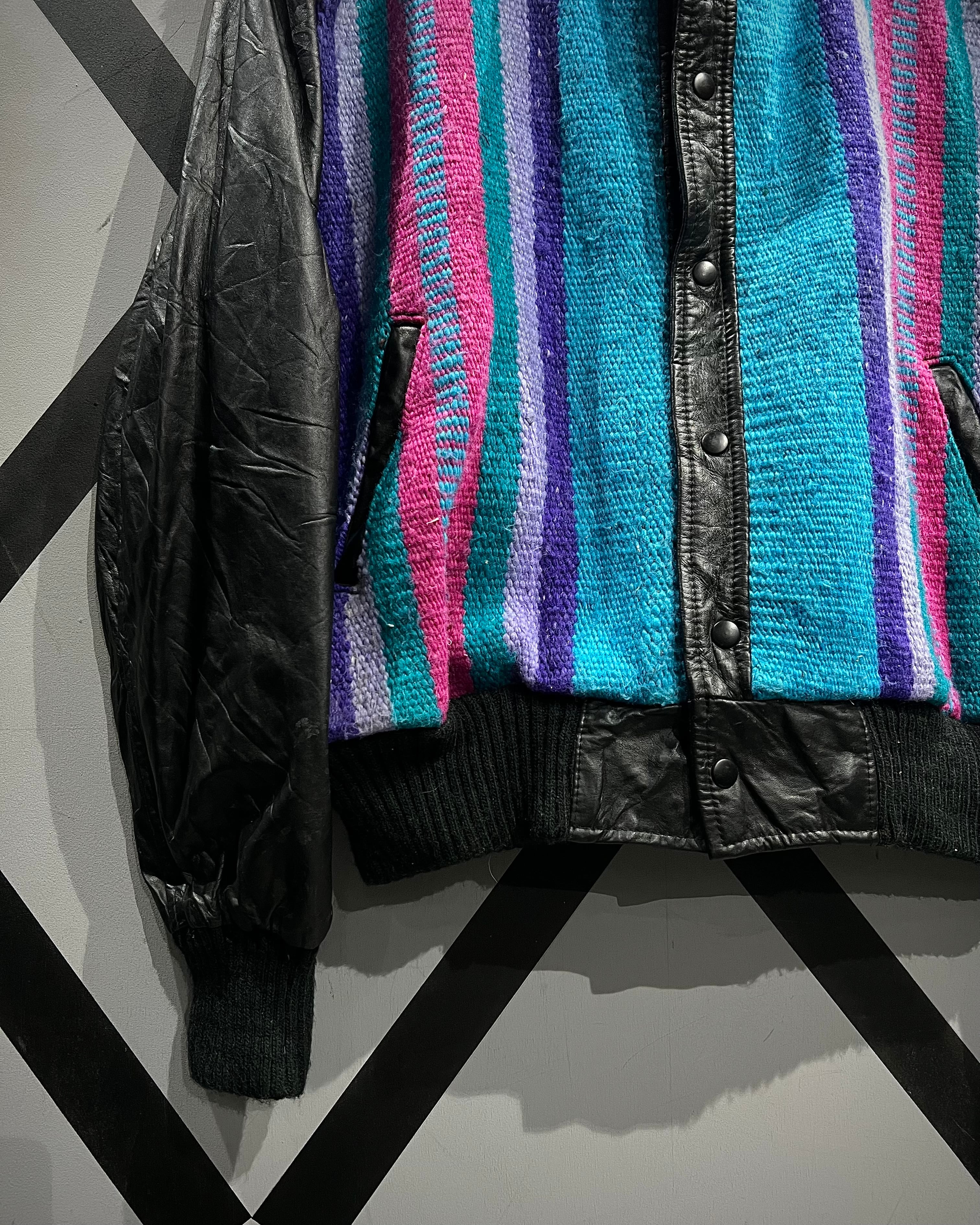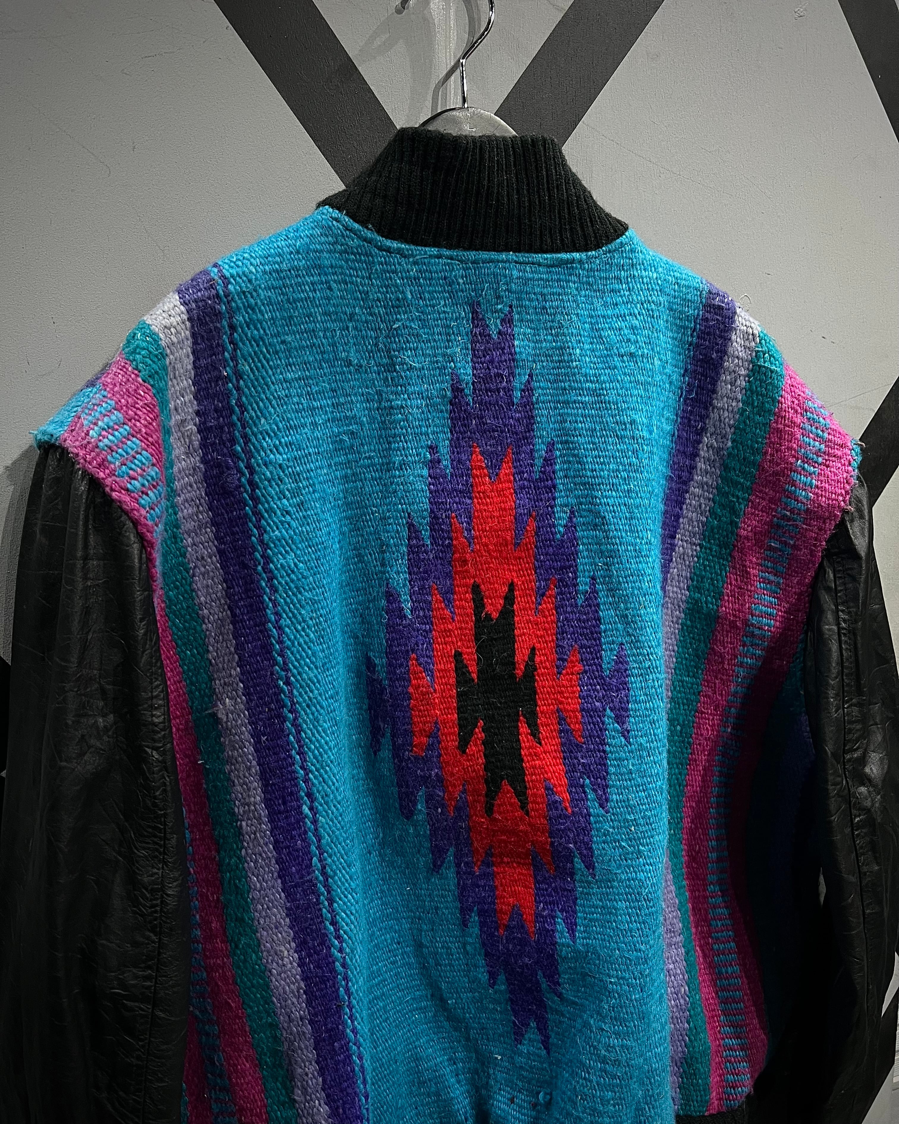 ネイティブ調のブランケット生地を主役に据え、袖と前立てをブラックレザーで切り替えたUSA製の稀有なブランケットジャケット。