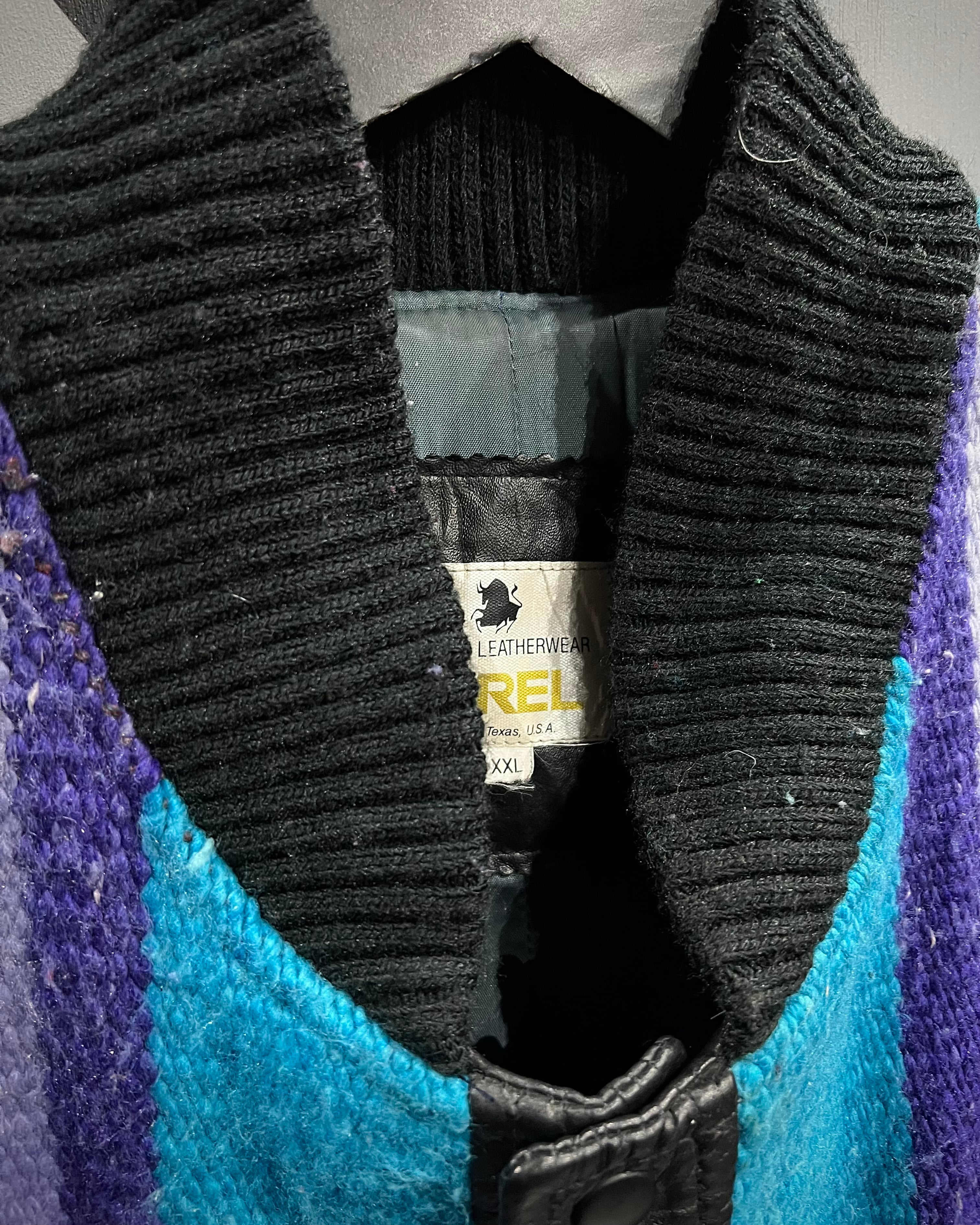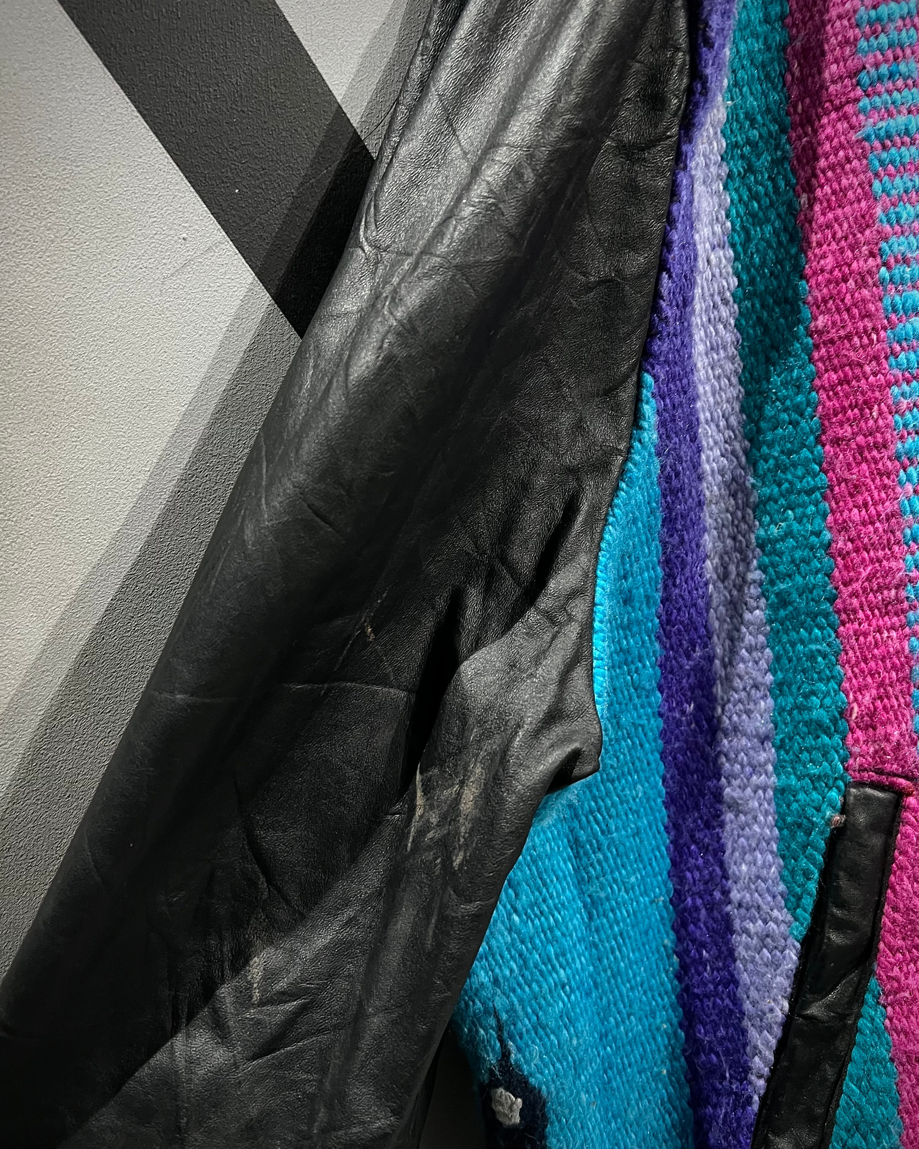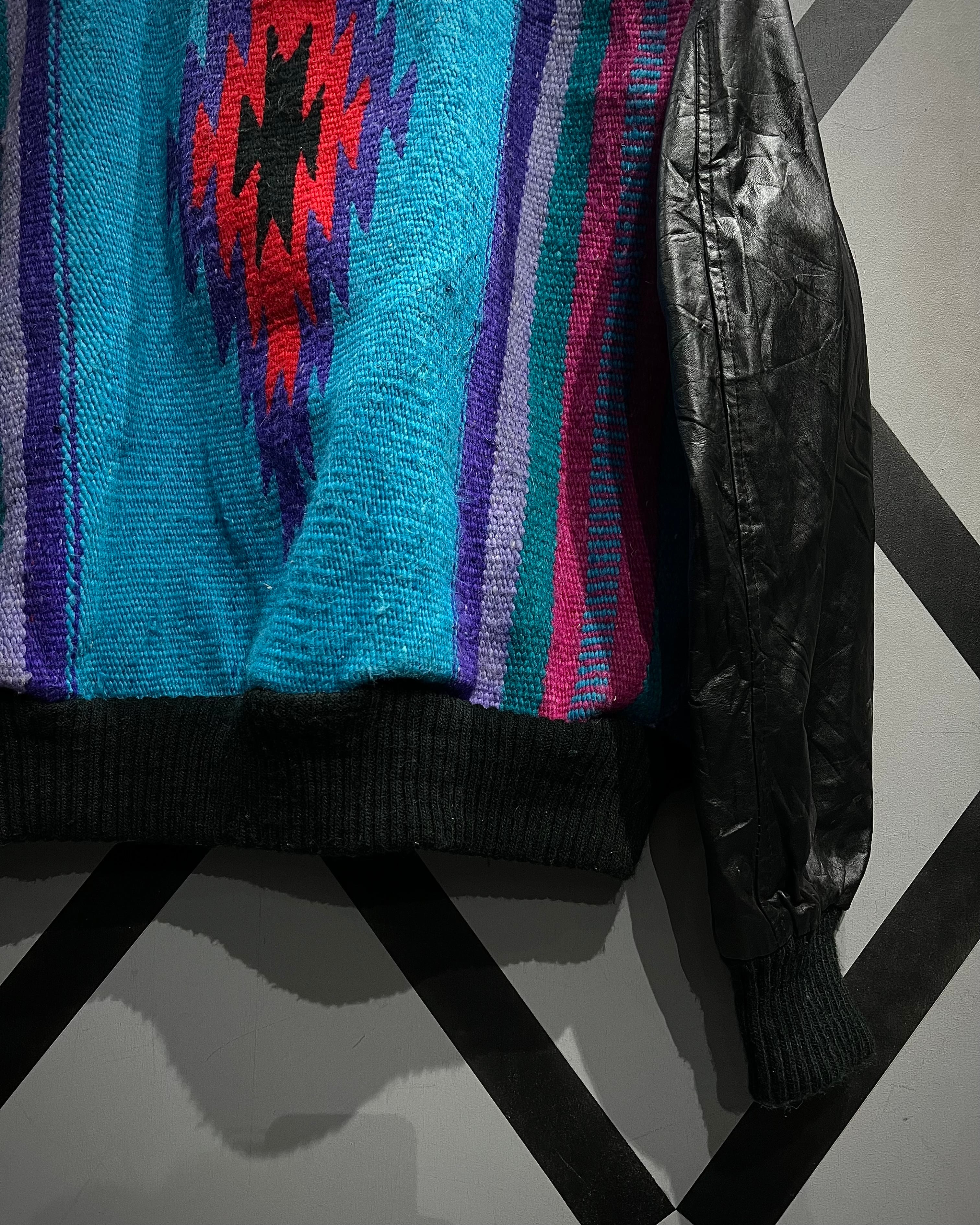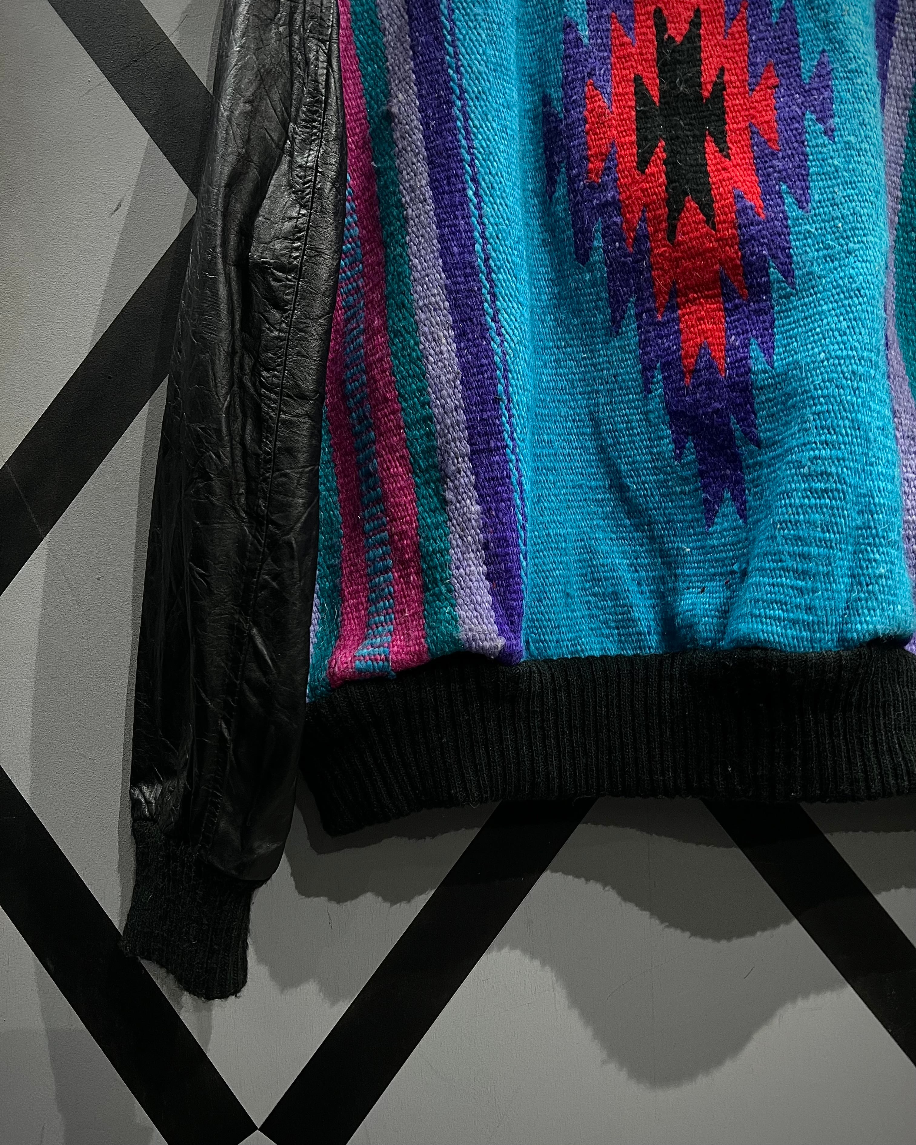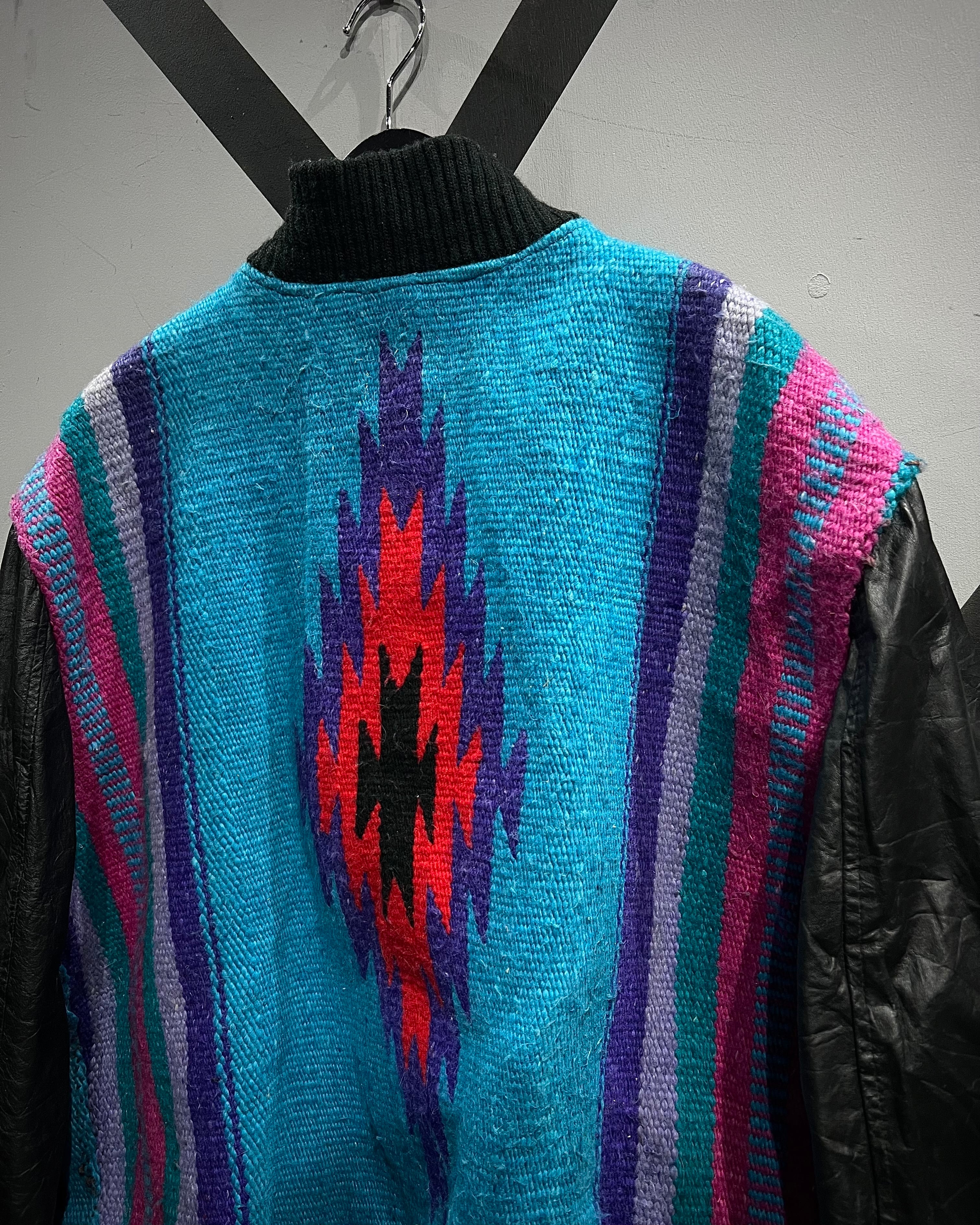 ネイティブ調のブランケット生地を主役に据え、袖と前立てをブラックレザーで切り替えたUSA製の稀有なブランケットジャケット。