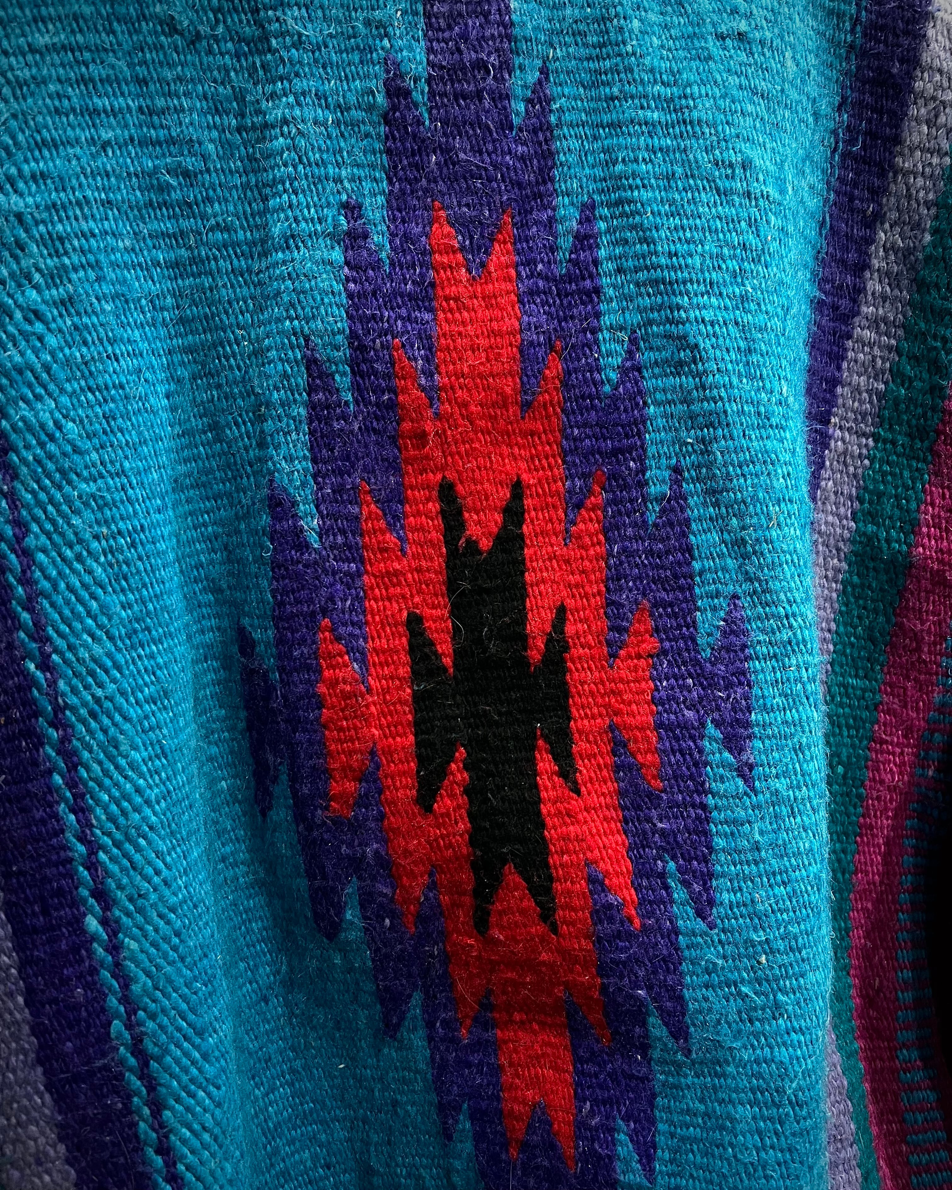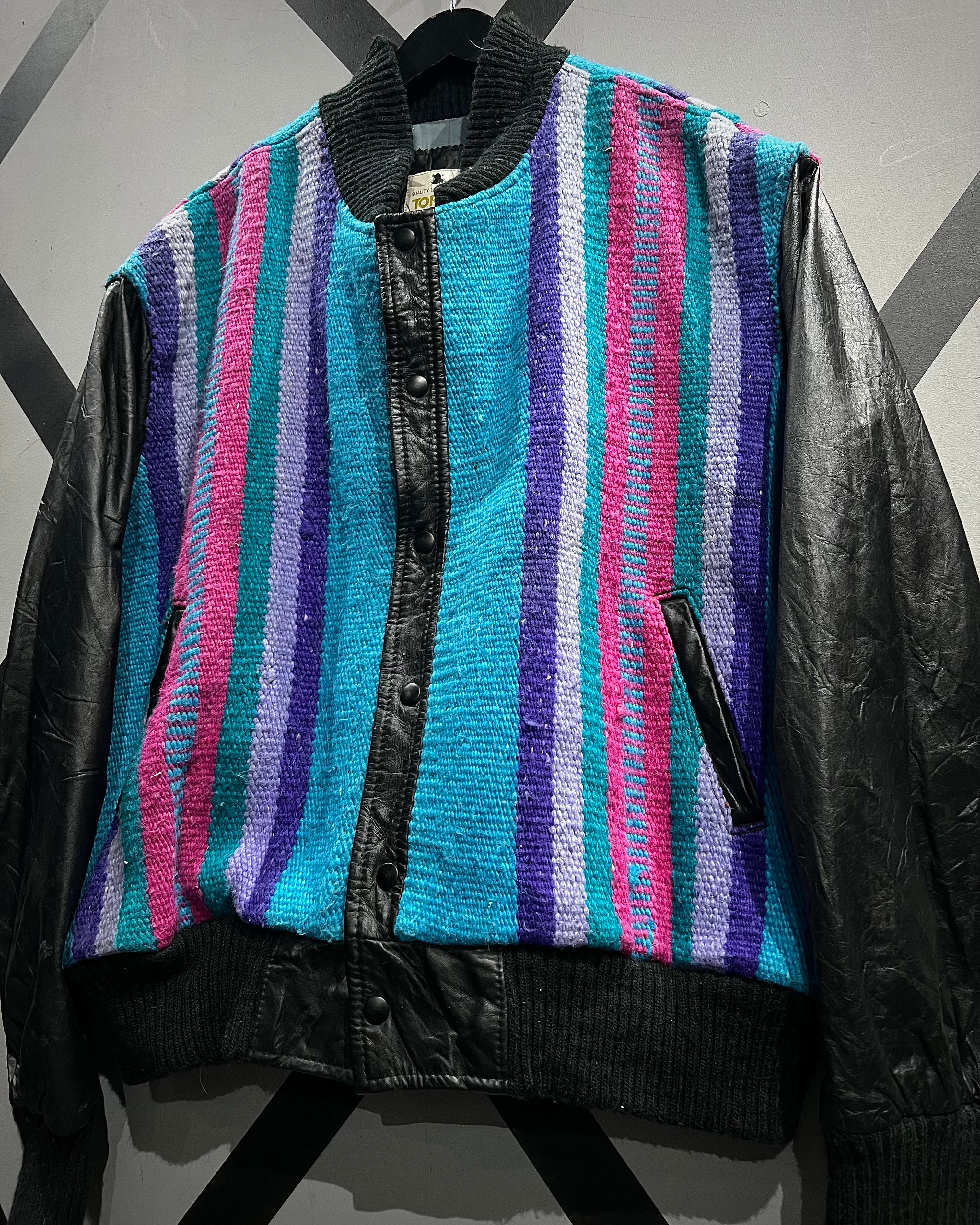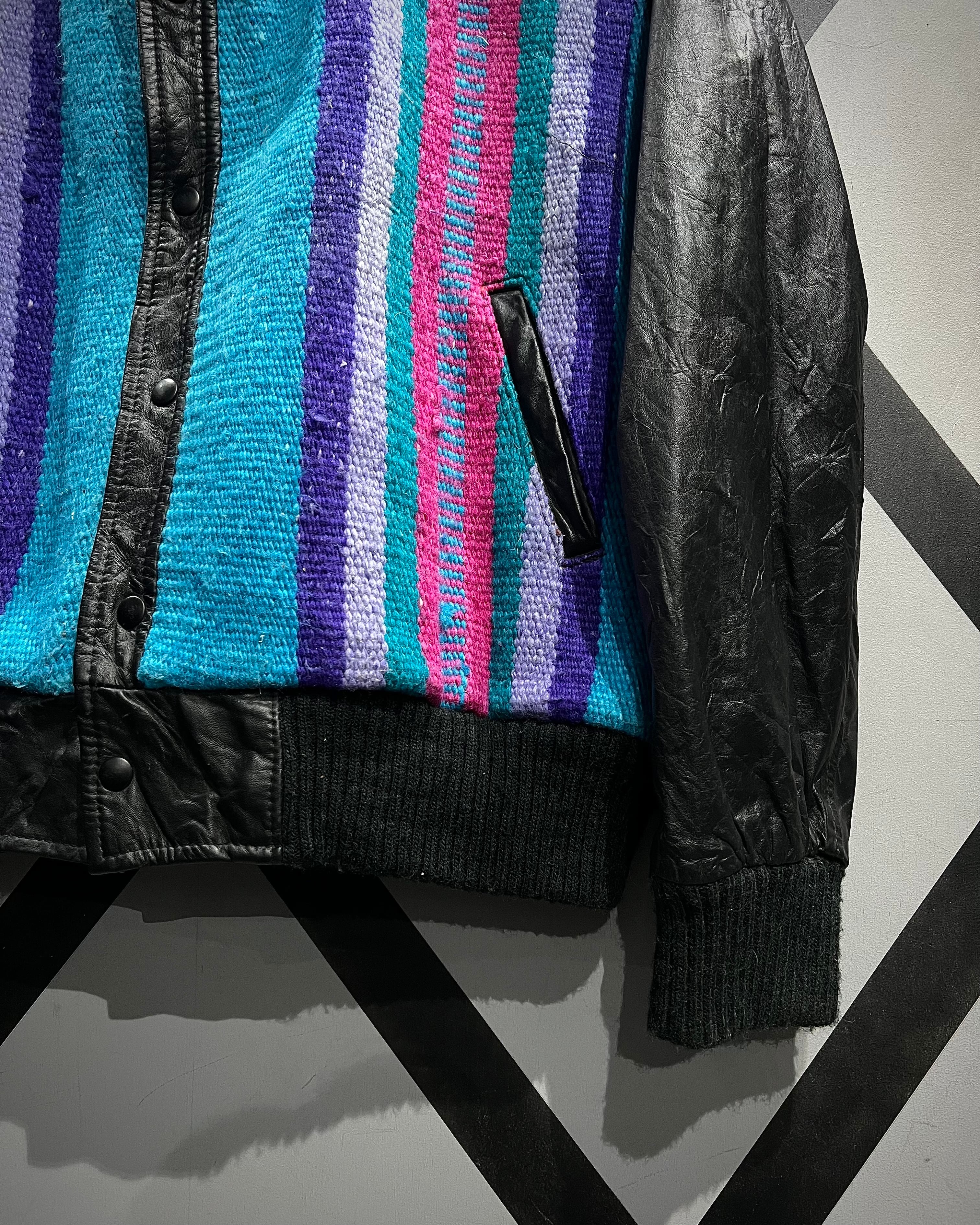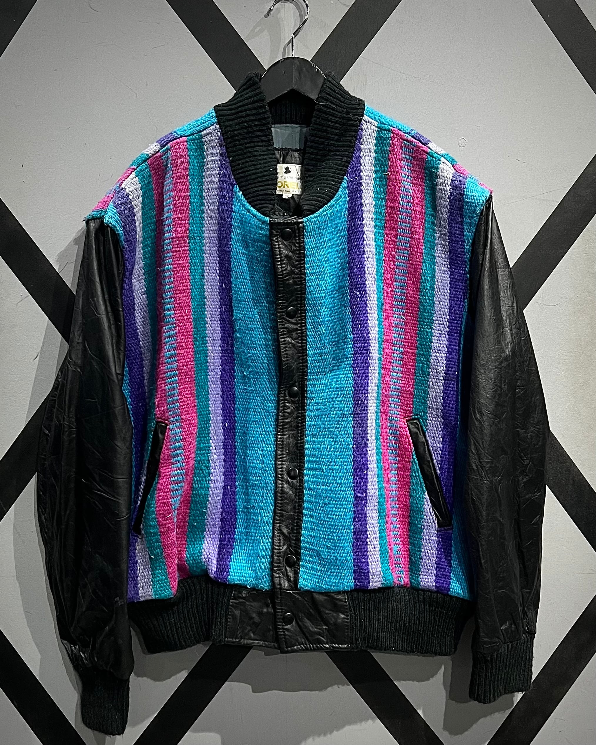 発色の良いターコイズ、パープル、ピンクを軸にしたストライプと、背面に配されたシンボリックなモチーフが、クラフト感とカルチャー性を強く感じさせる一着です。