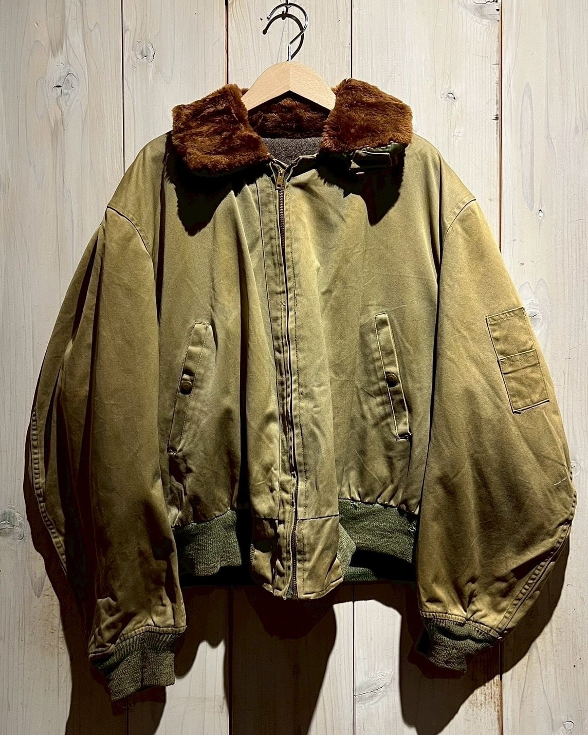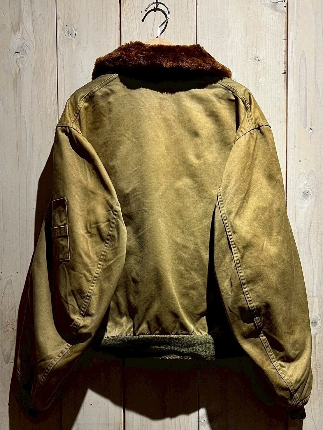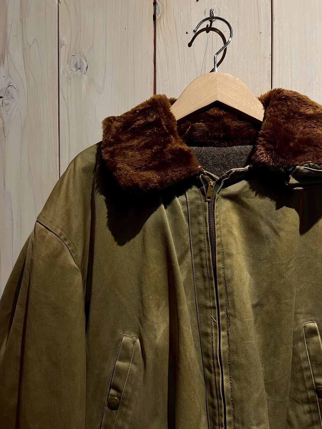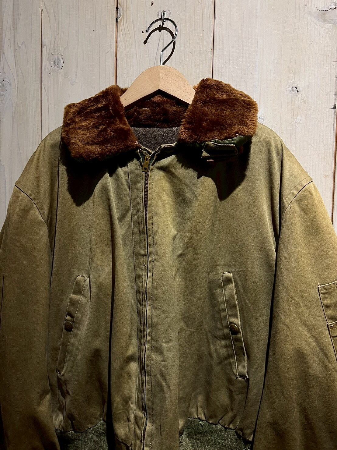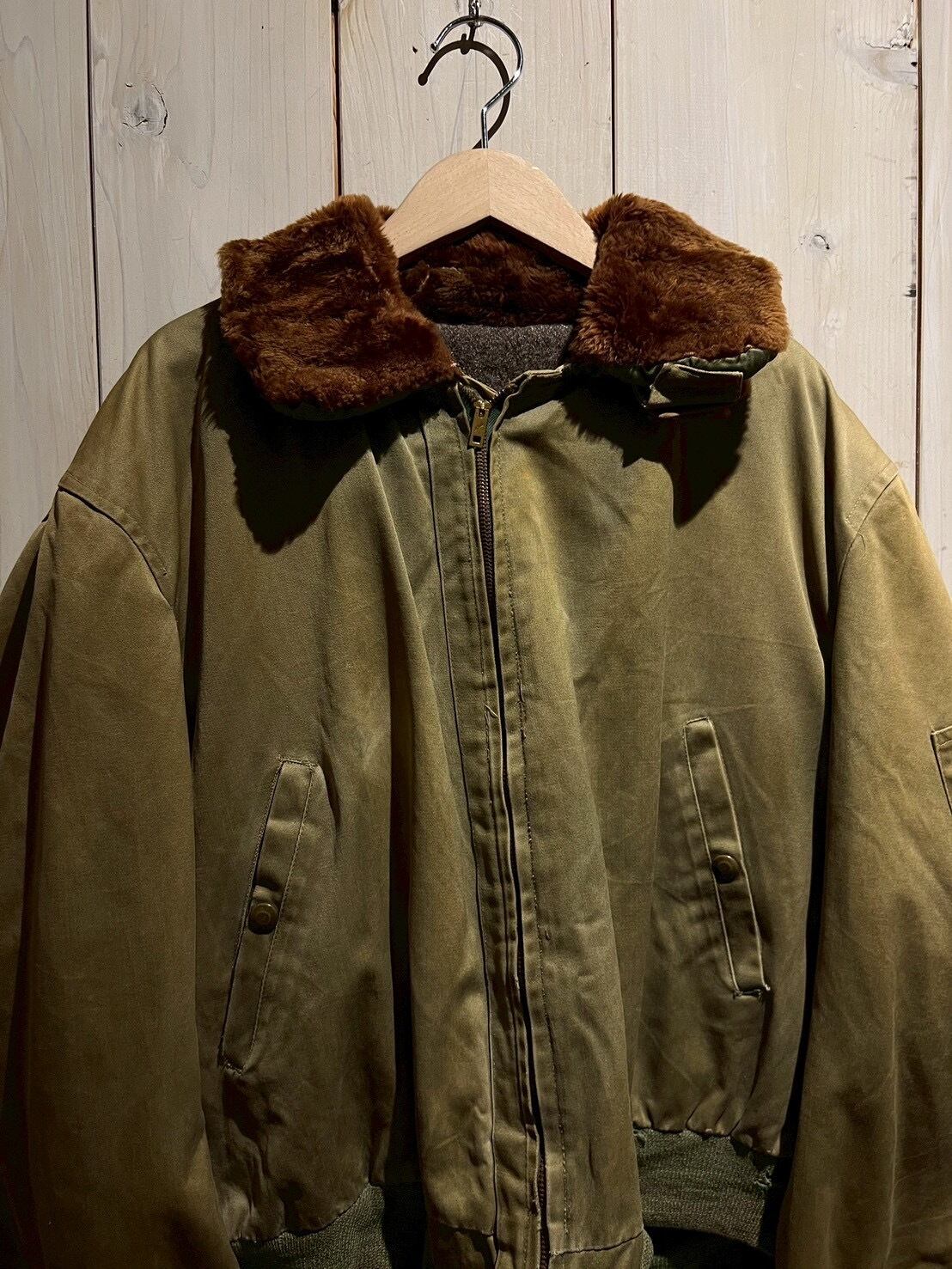 ボディには当時らしいガシッとしたコットン素材を使用し、長い年月を経たことで生まれたフェード感とシワの表情が、ヴィンテージならではの深みを演出。ブラウンのムートンカラーが首元にしっかりとボリュームを持たせ、フライトジャケットらしい迫力を感じさせます。