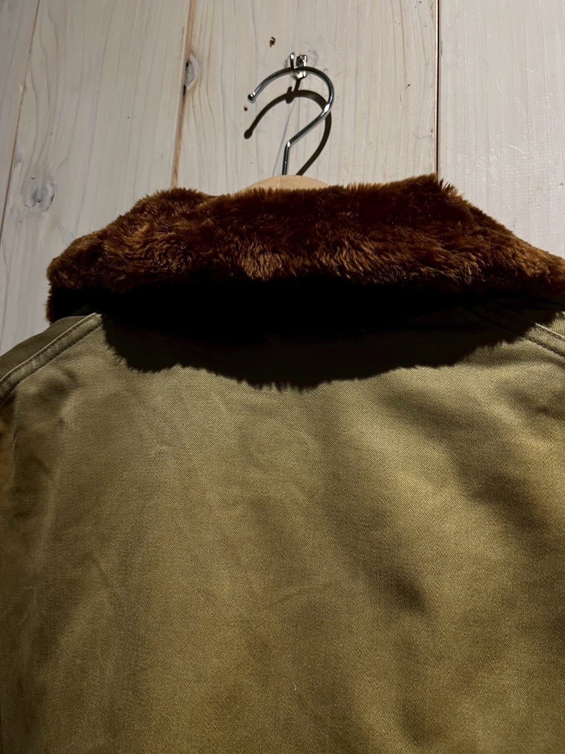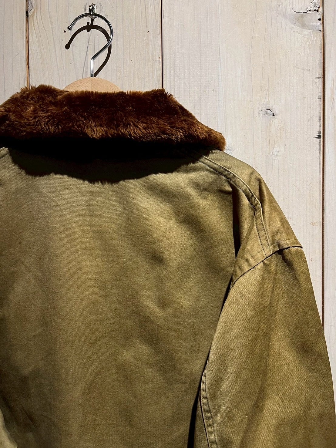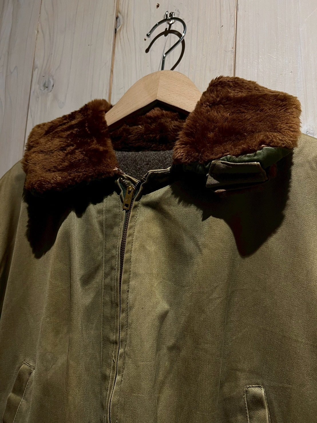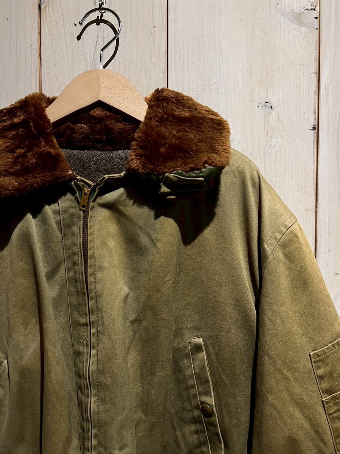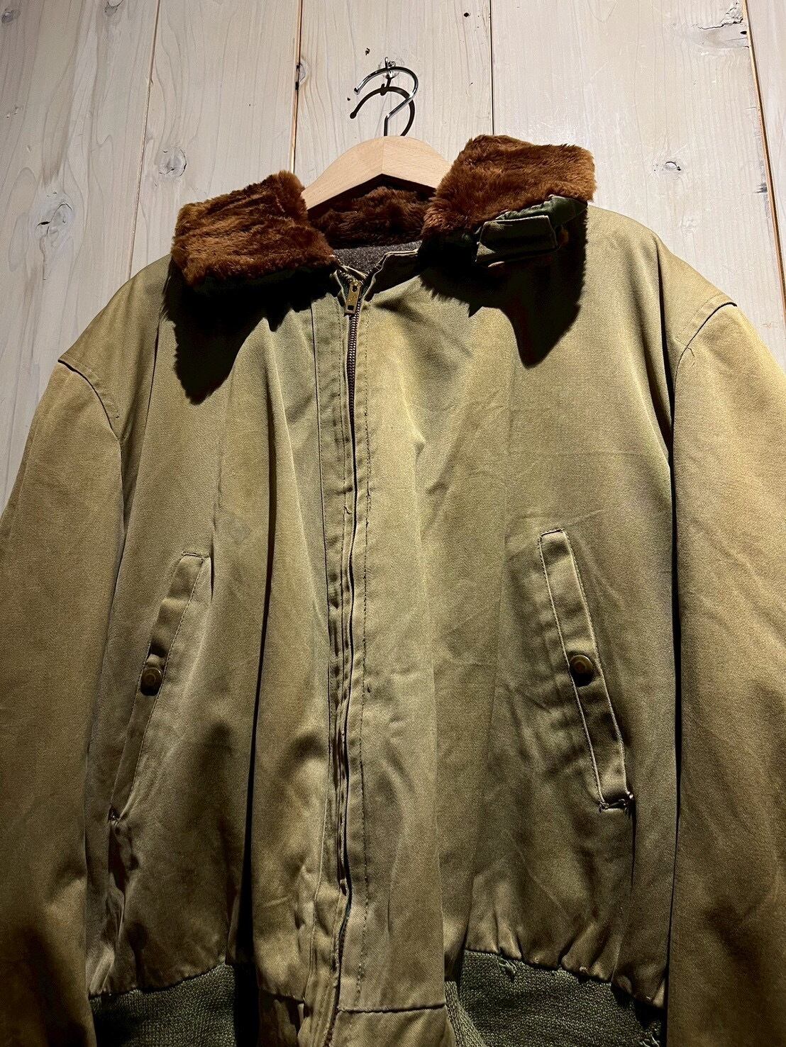 ボディには当時らしいガシッとしたコットン素材を使用し、長い年月を経たことで生まれたフェード感とシワの表情が、ヴィンテージならではの深みを演出。ブラウンのムートンカラーが首元にしっかりとボリュームを持たせ、フライトジャケットらしい迫力を感じさせます。