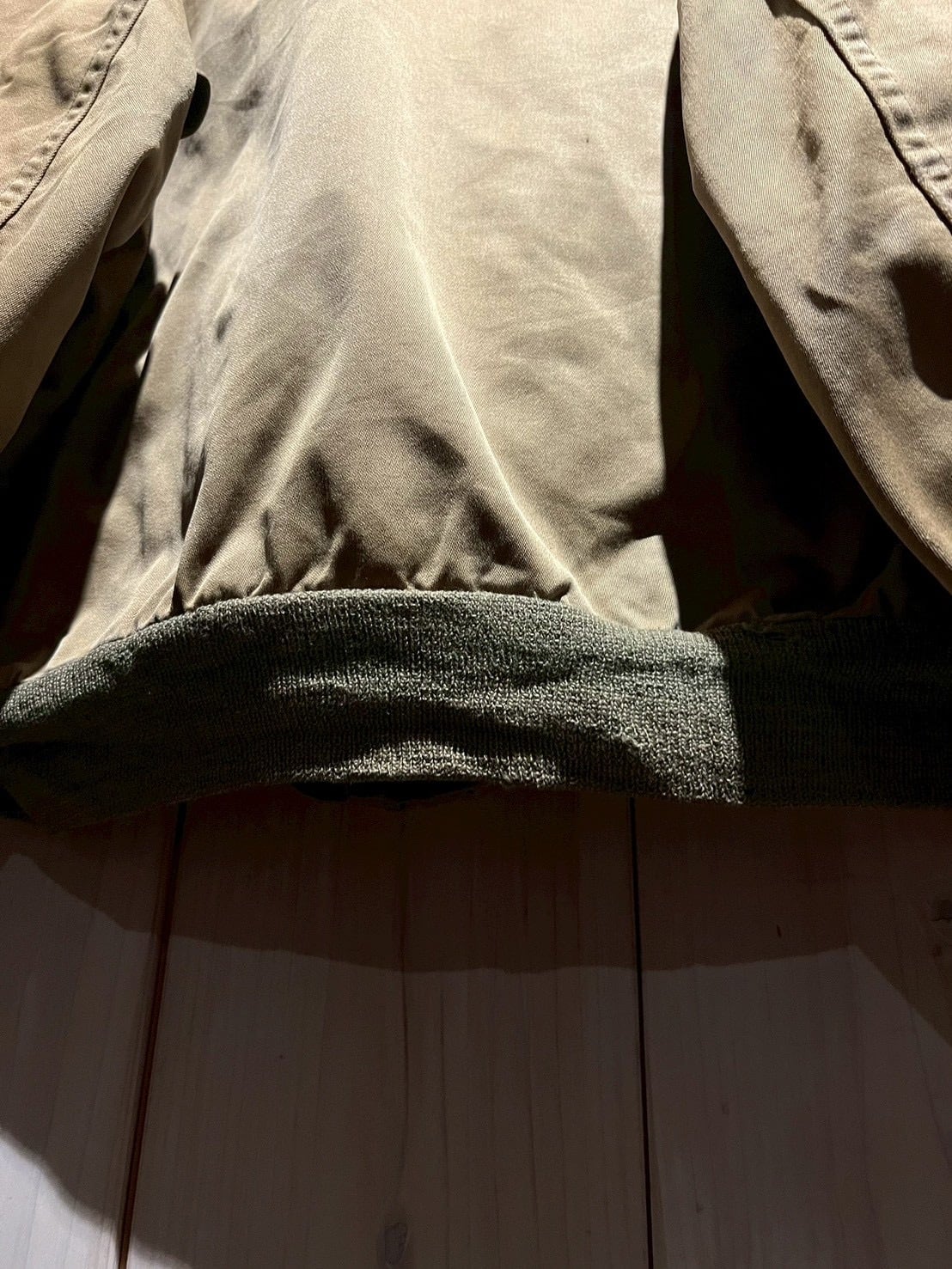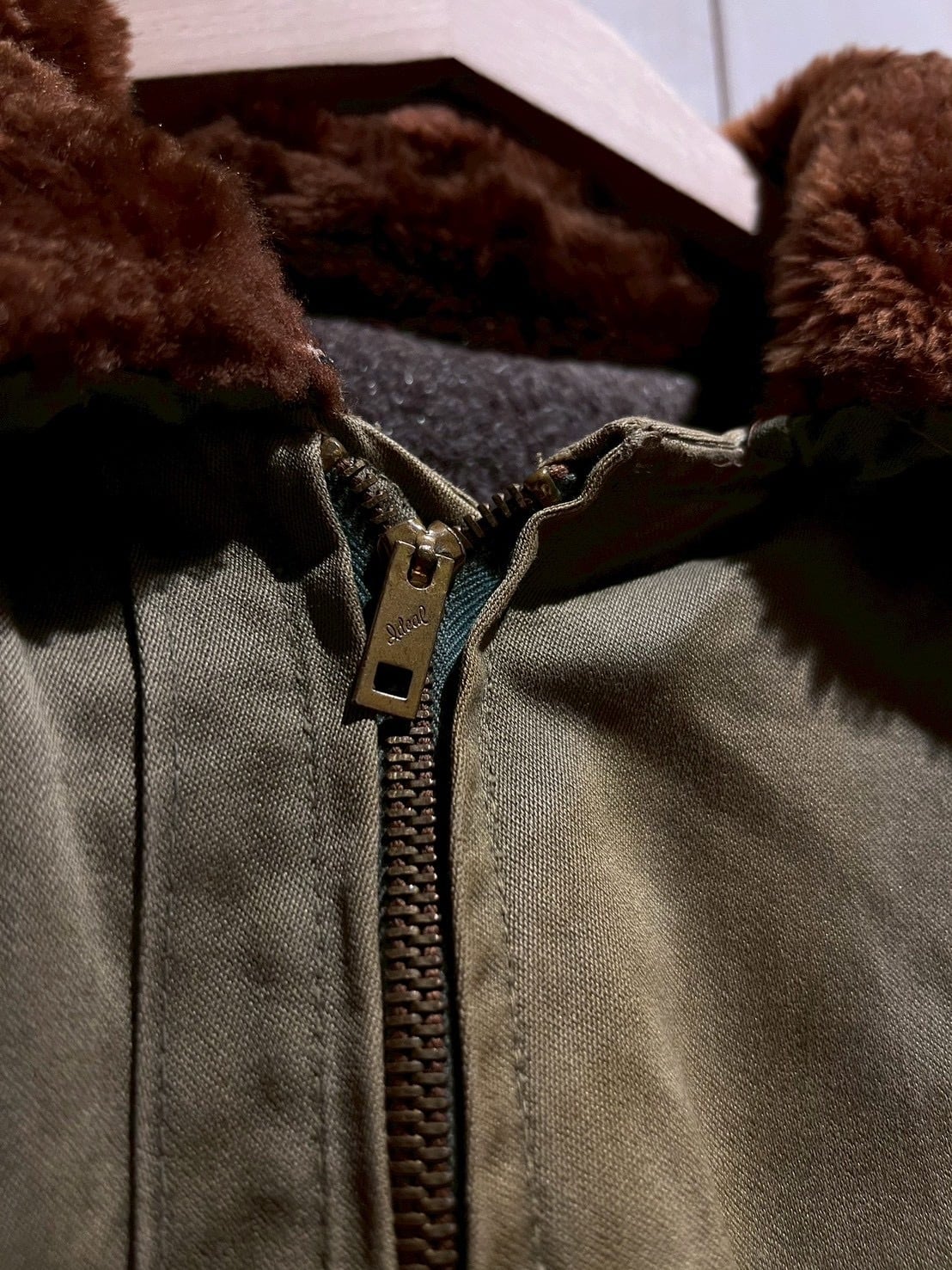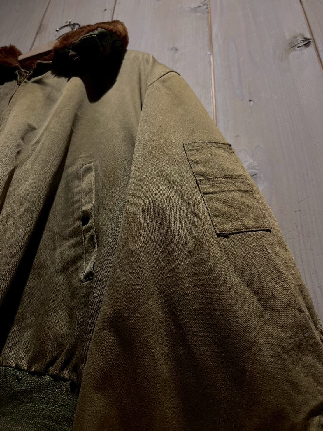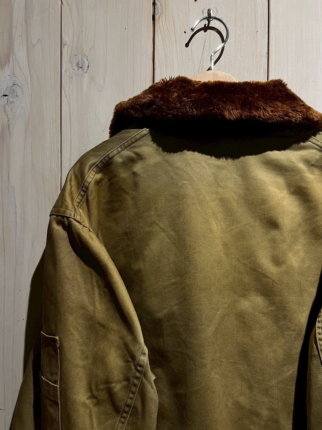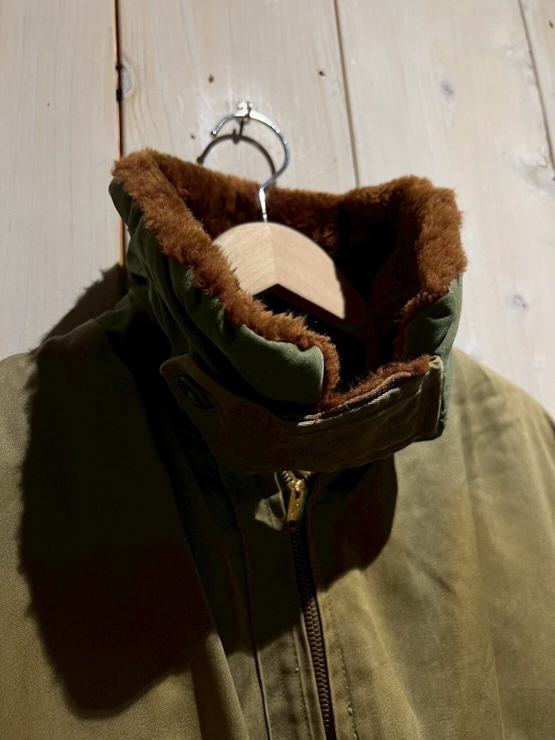 ボディには当時らしいガシッとしたコットン素材を使用し、長い年月を経たことで生まれたフェード感とシワの表情が、ヴィンテージならではの深みを演出。ブラウンのムートンカラーが首元にしっかりとボリュームを持たせ、フライトジャケットらしい迫力を感じさせます。