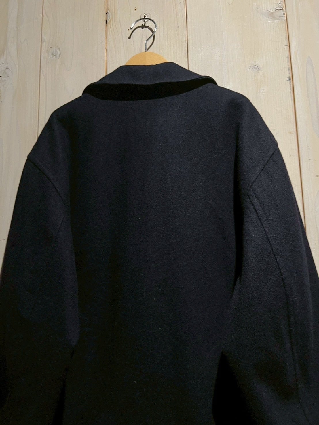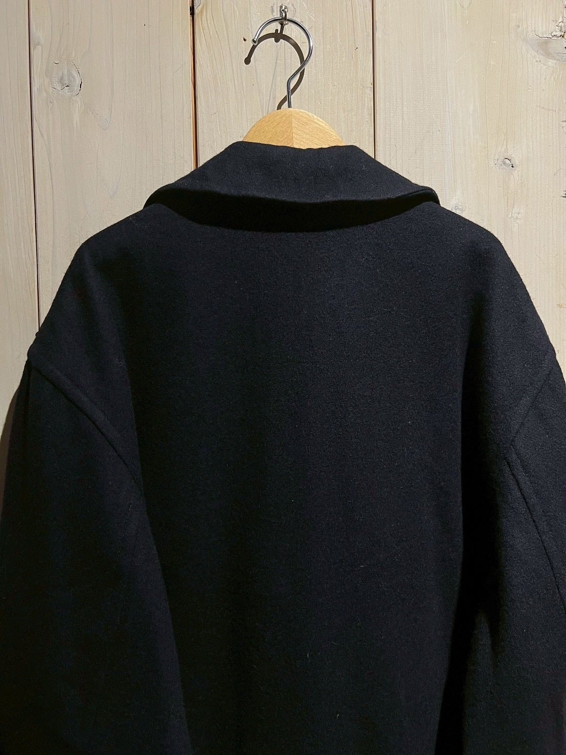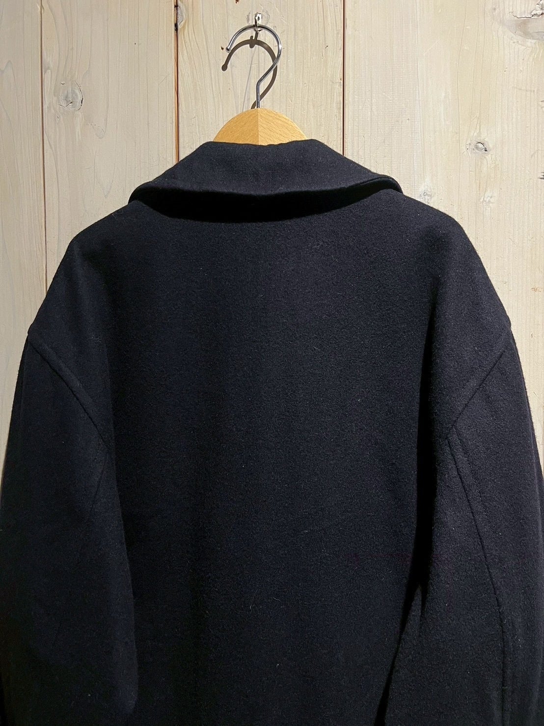 ネイビーボディに、無駄を削ぎ落としたベーシックなダブルブレスト仕様と、クラシックなピーコートらしいバランスの取れたデザインが際立つ一着。