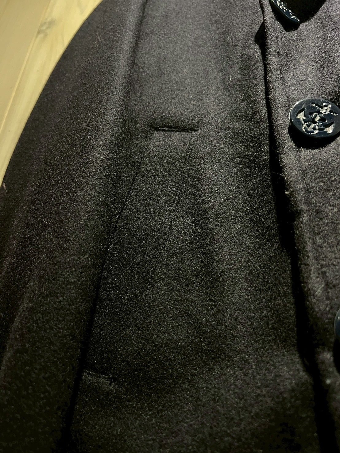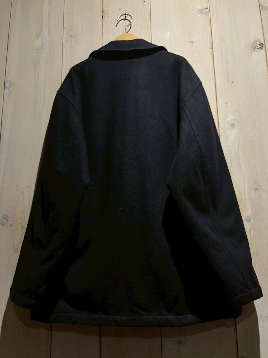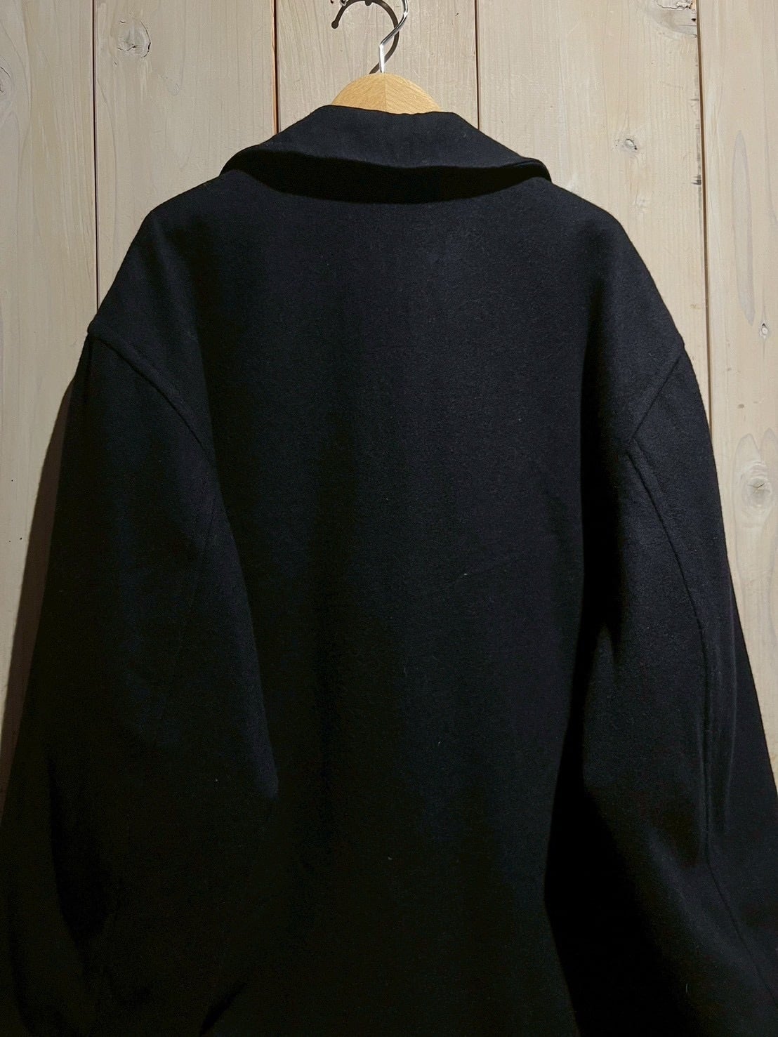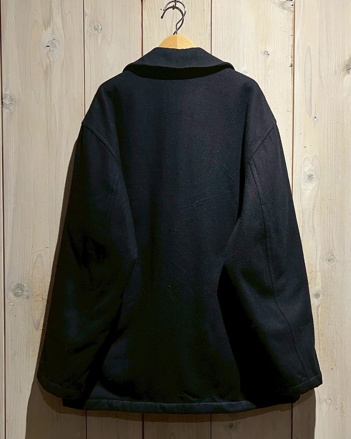 ネイビーボディに、無駄を削ぎ落としたベーシックなダブルブレスト仕様と、クラシックなピーコートらしいバランスの取れたデザインが際立つ一着。