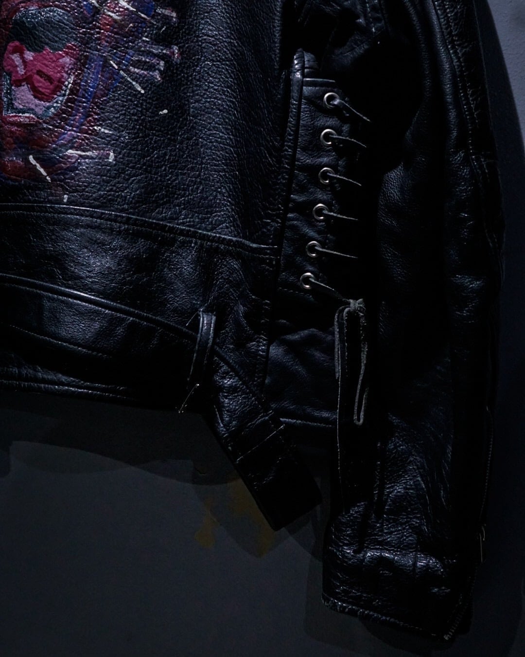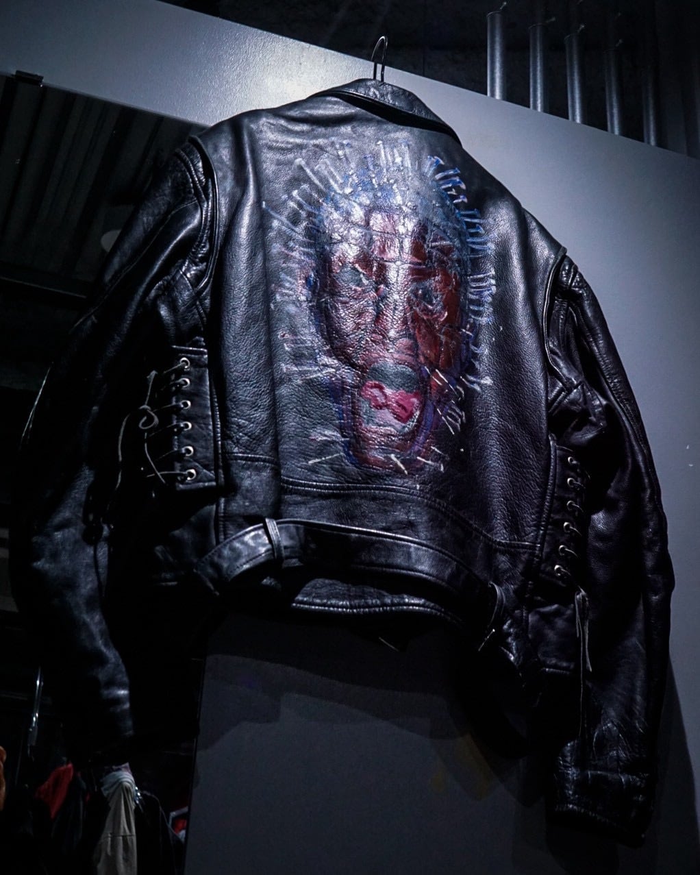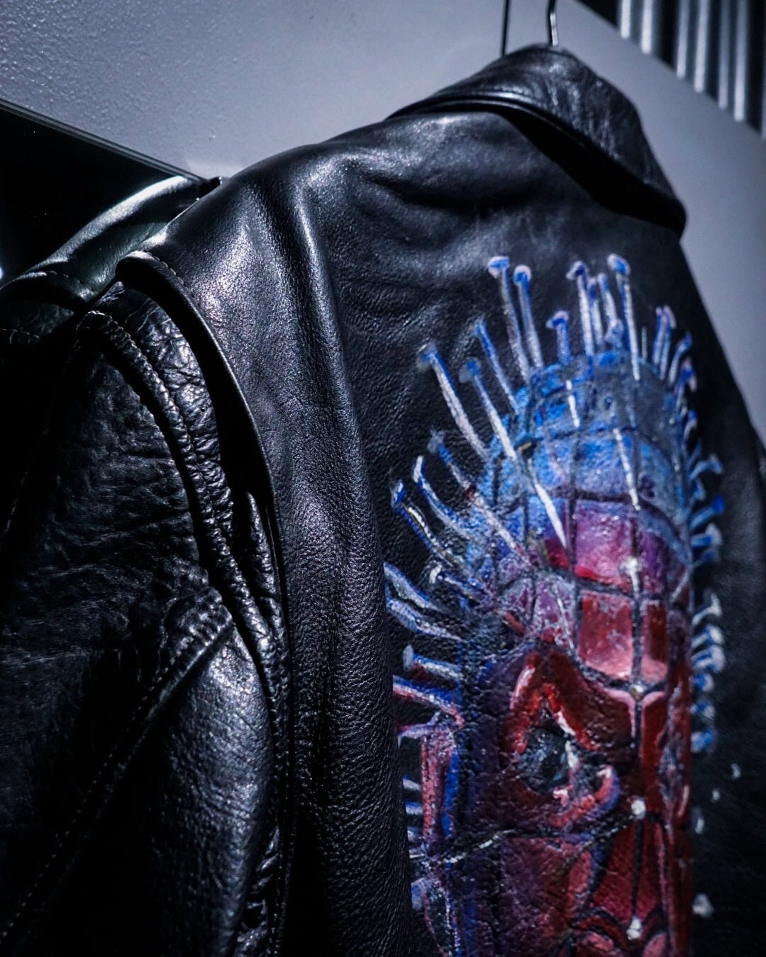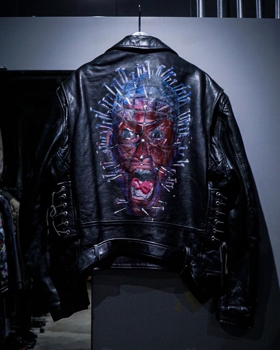 前所有者によって背面にヘルレイザーのハンドペイントが大胆に施された、一点モノのスペシャルなダブルライダースジャケット。