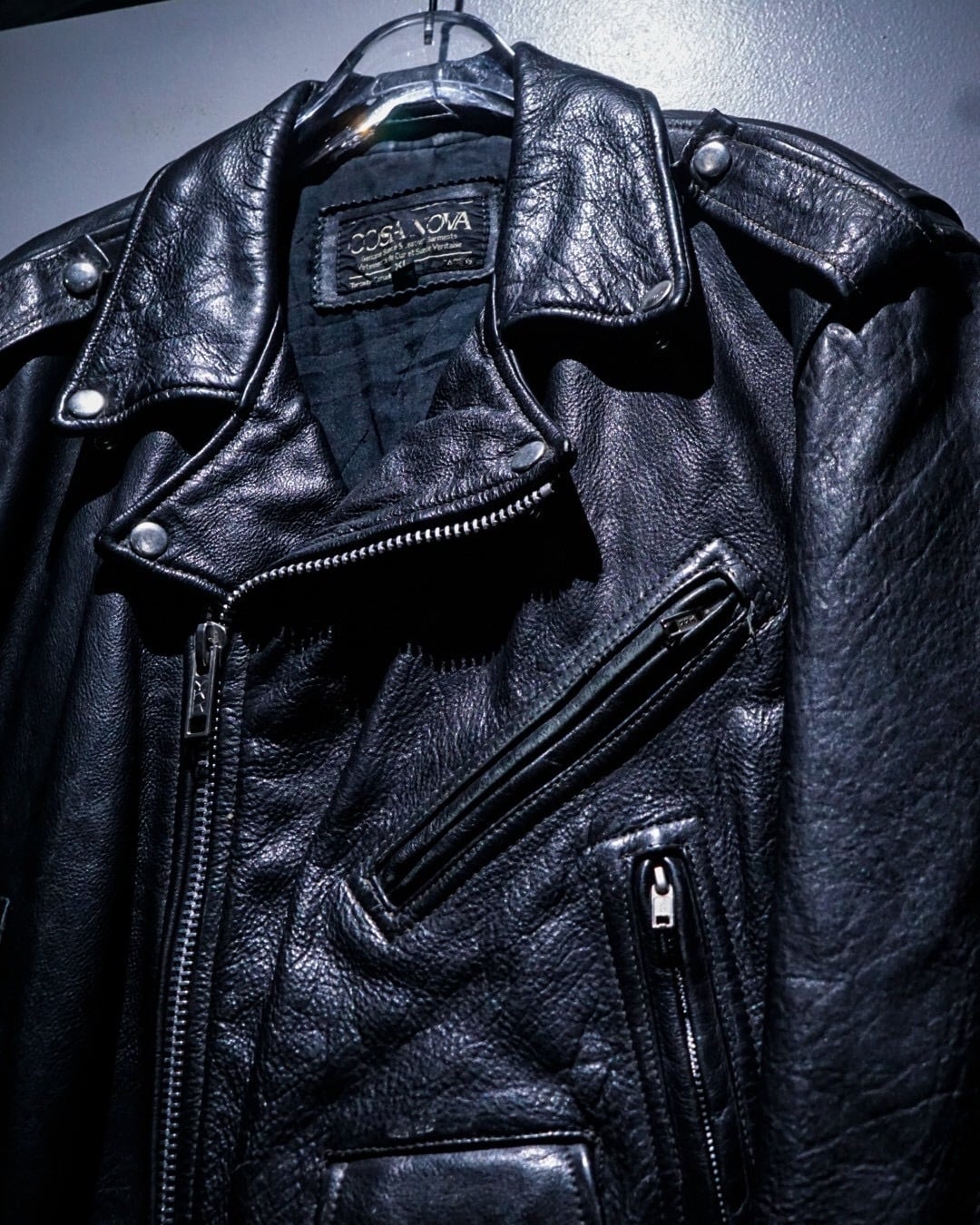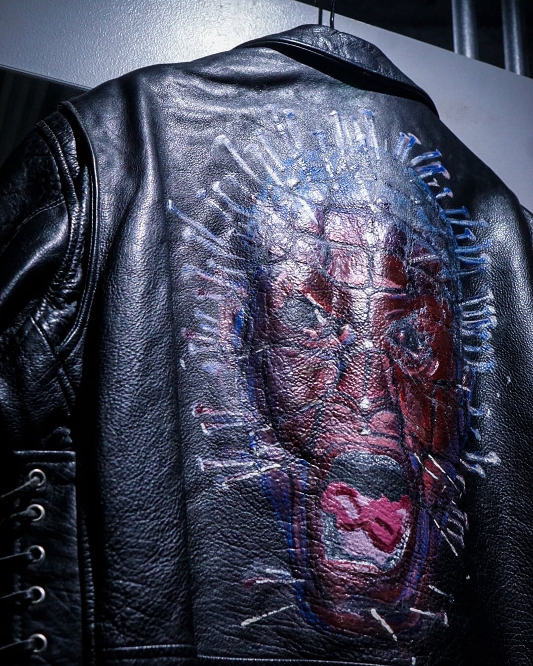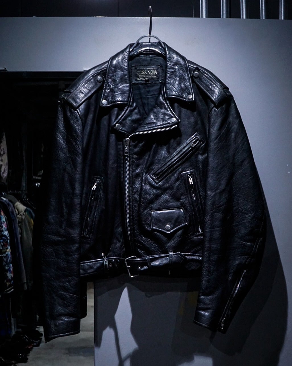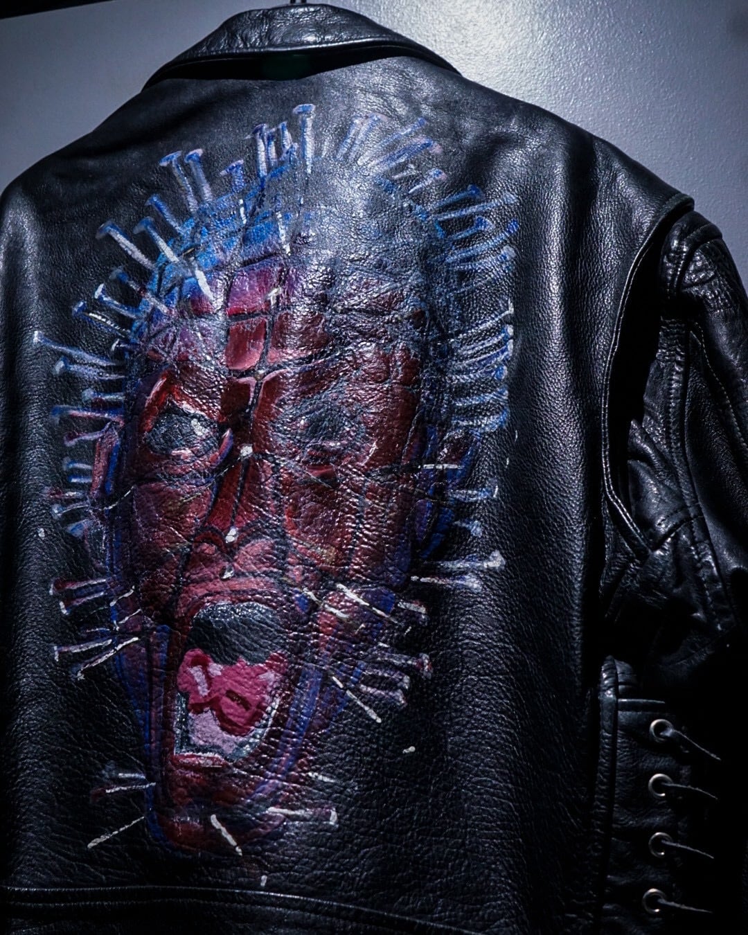 前所有者によって背面にヘルレイザーのハンドペイントが大胆に施された、一点モノのスペシャルなダブルライダースジャケット。