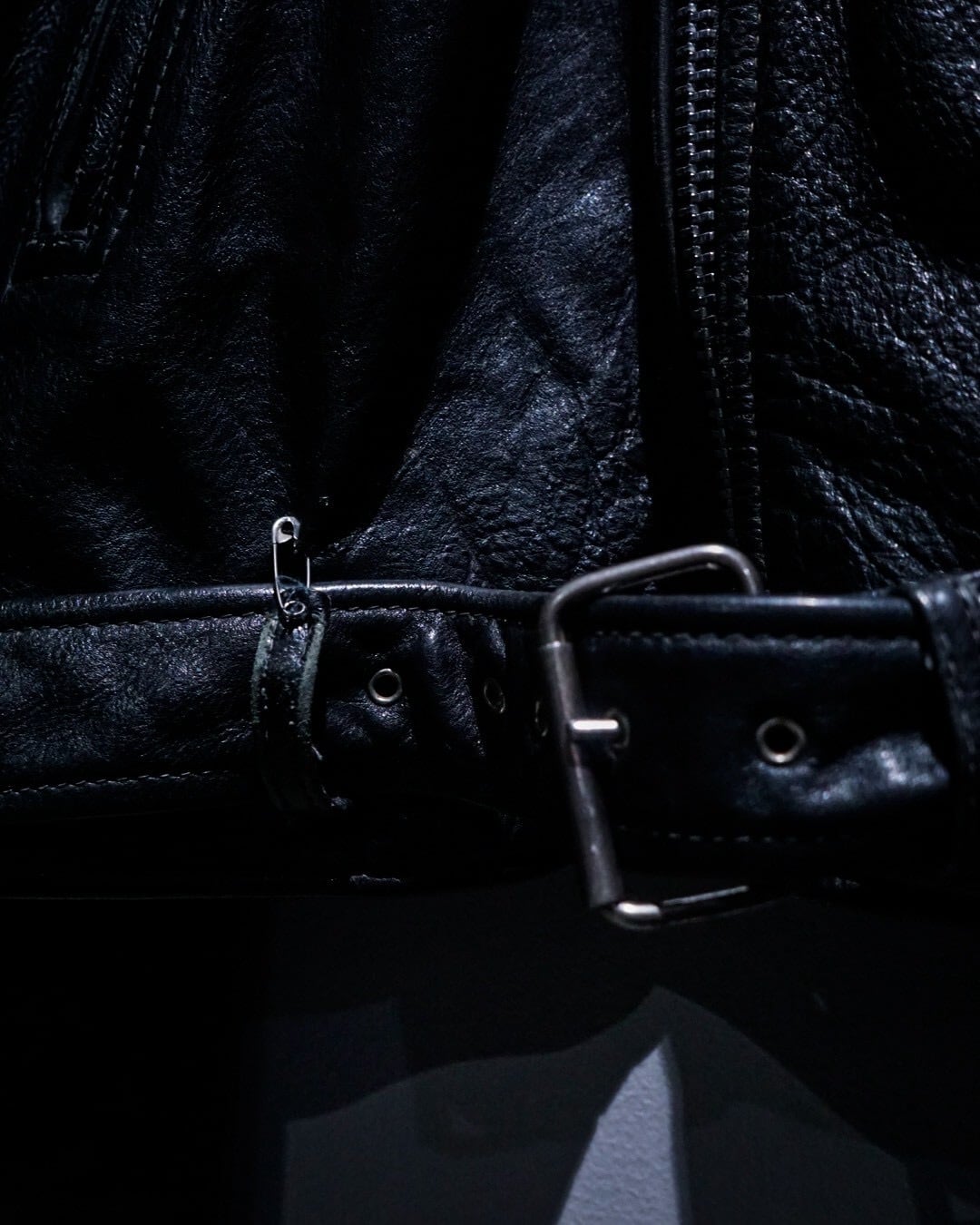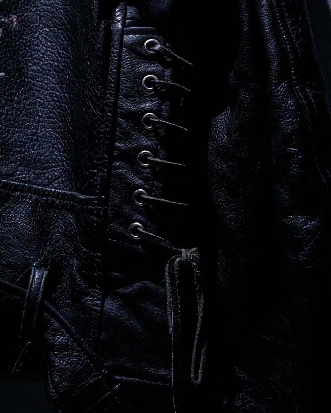 ボディには厚みとコシのあるリアルレザーを使用。着用を重ねるごとにシワや表情が刻まれ、ペイントが重なり合い、退廃的でダークな空気感を強く纏っています。