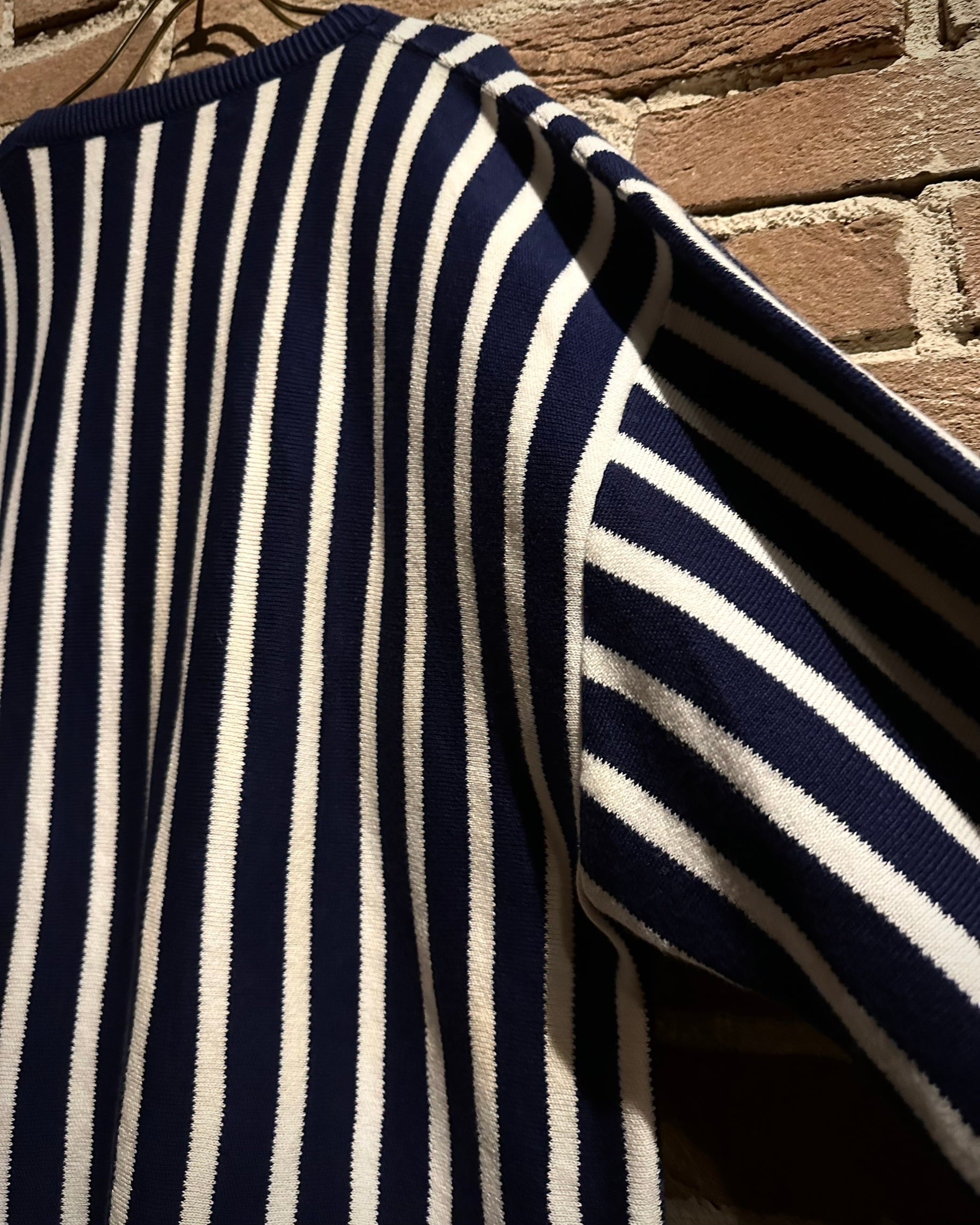 ネイビー×ホワイトのストライプボディに、胸元へ控えめに配されたロゴ刺繍が上品なアクセントに。美しいピッチバランスが、洗練されたラグジュアリーな空気感を演出します。
