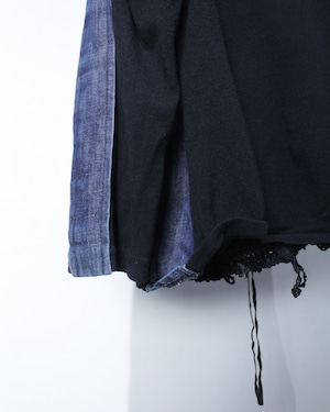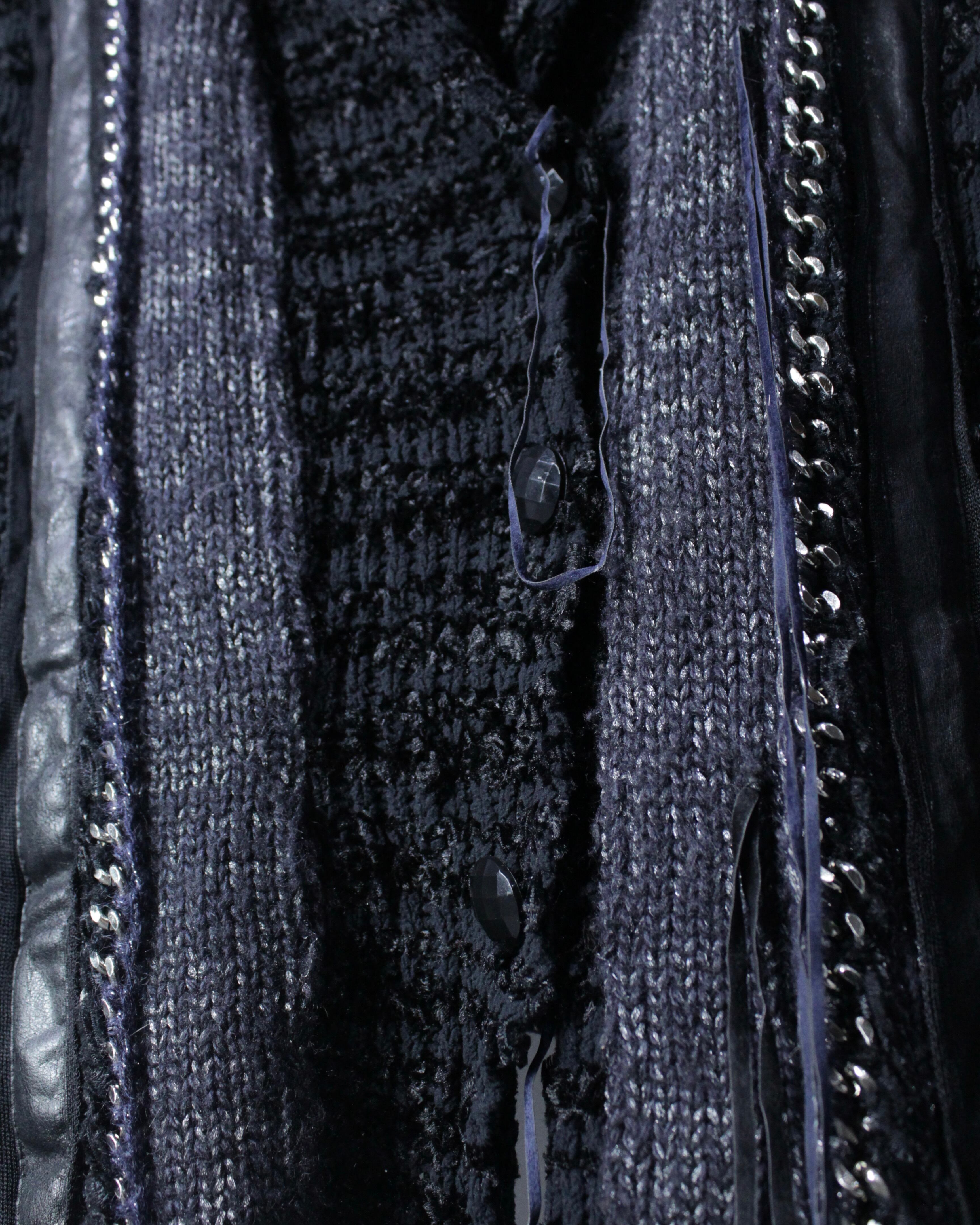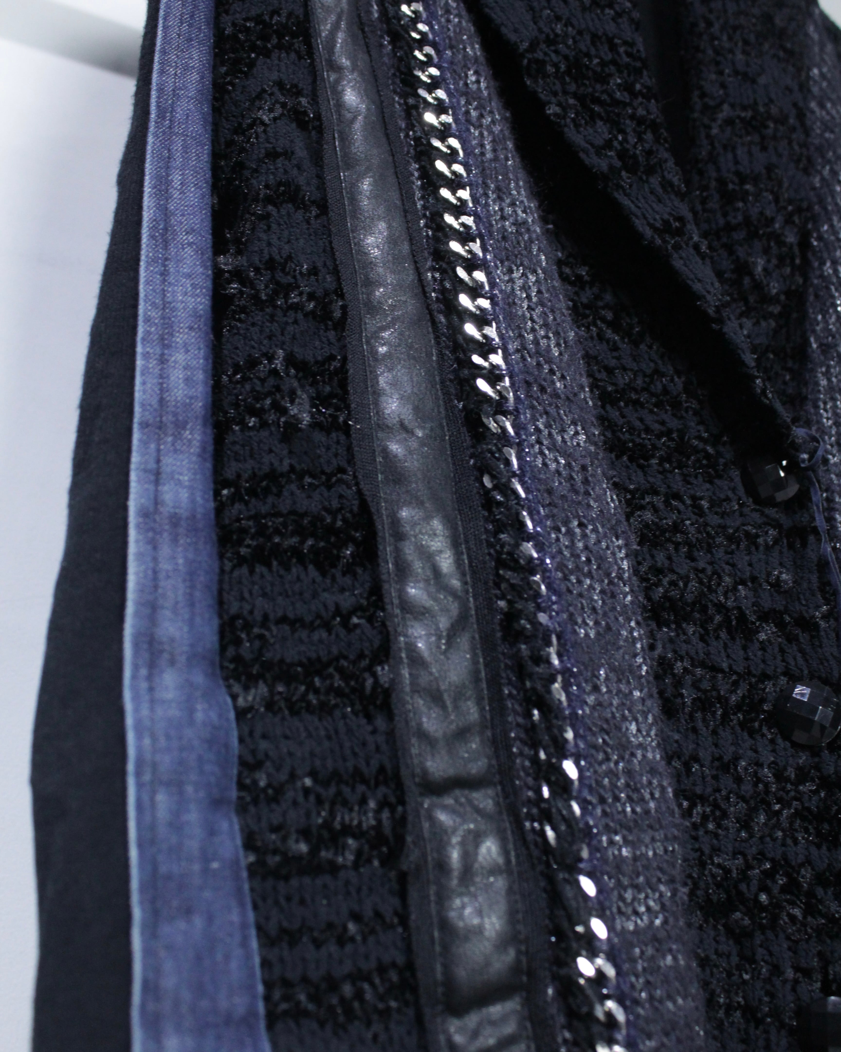 ベースにはベーシックなニット素材を使用し、フロントやアームには立体感のあるニット地、チェーン、ラメ糸、レザー、デニム生地を複雑に切り替え。異素材を合わせることで、ブラックトーンの中に奥行きと陰影が生まれ、単色ながら非常に立体的な表情に仕上がっています。