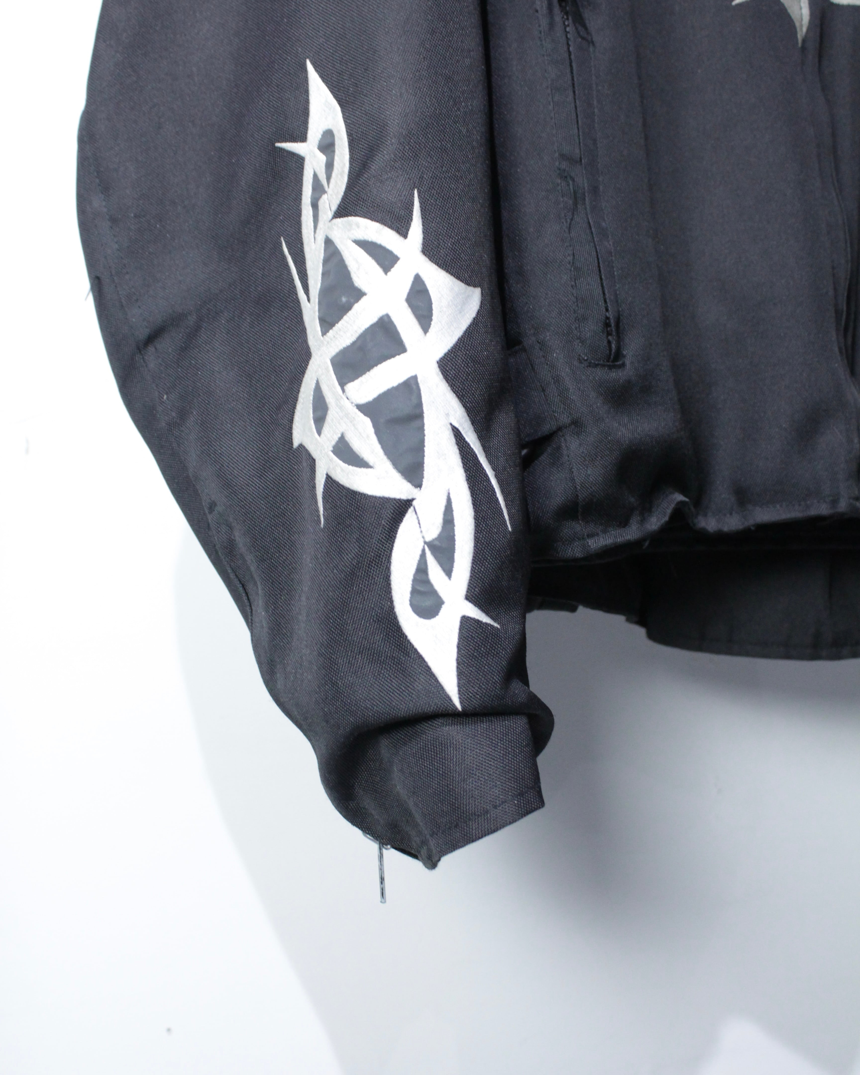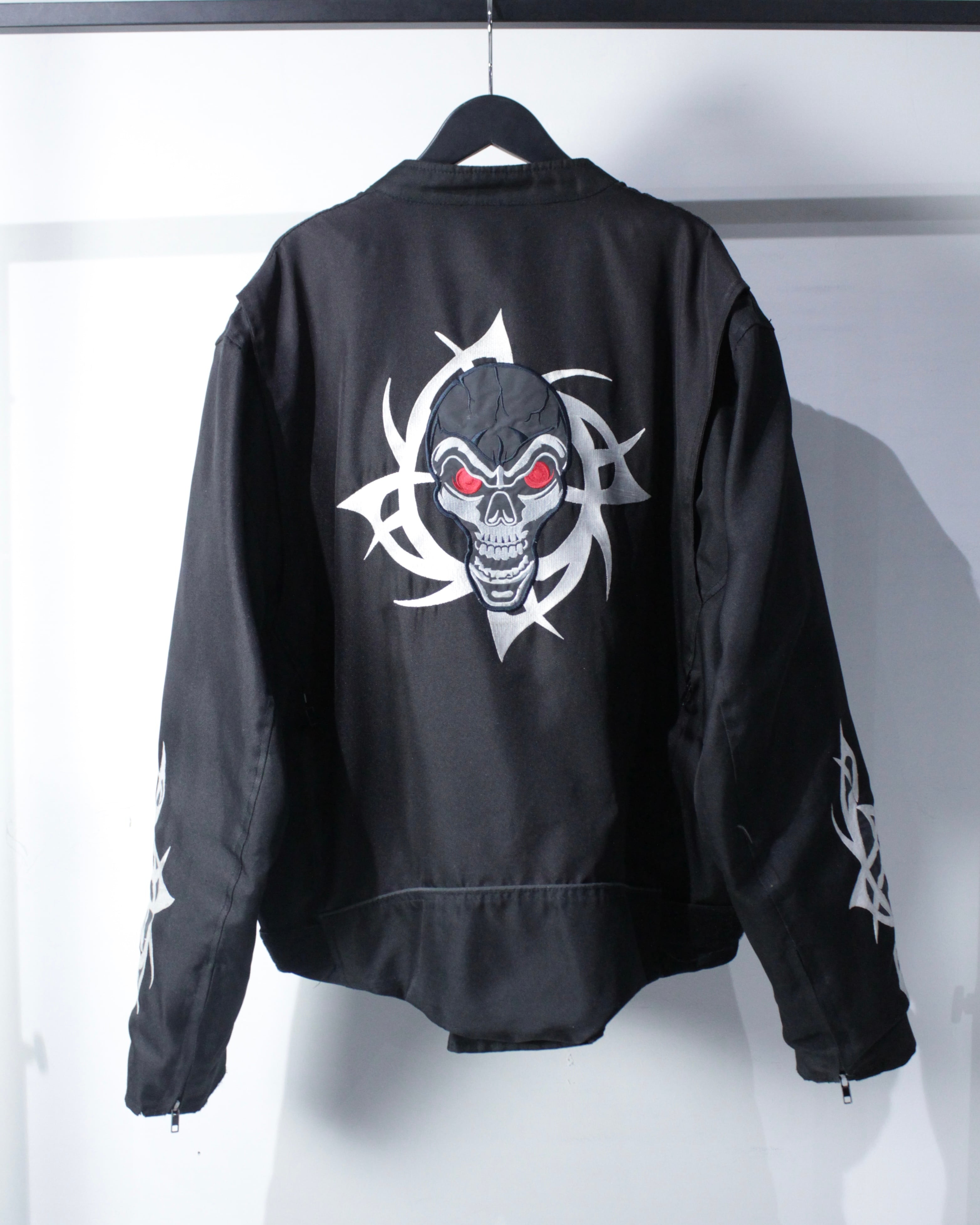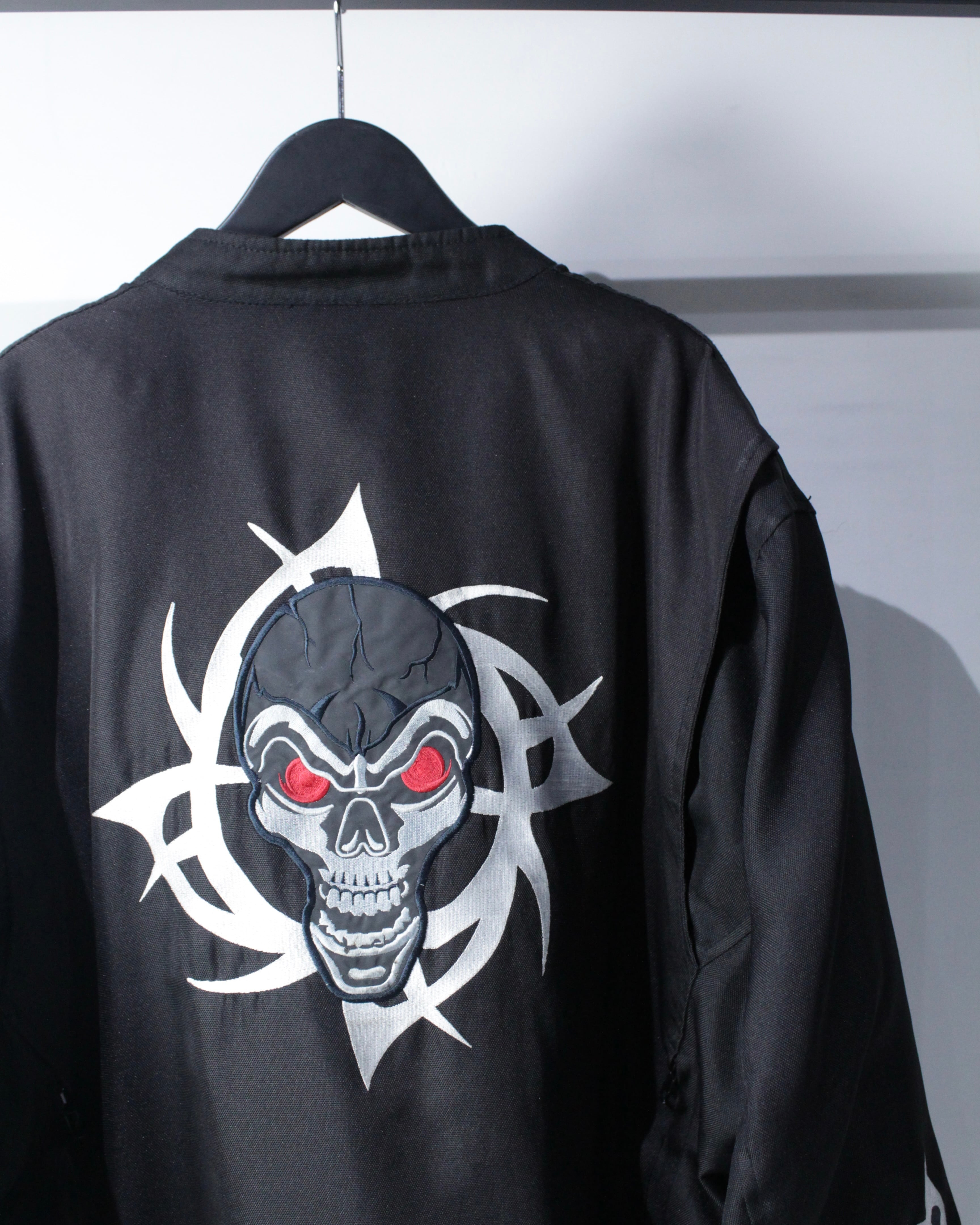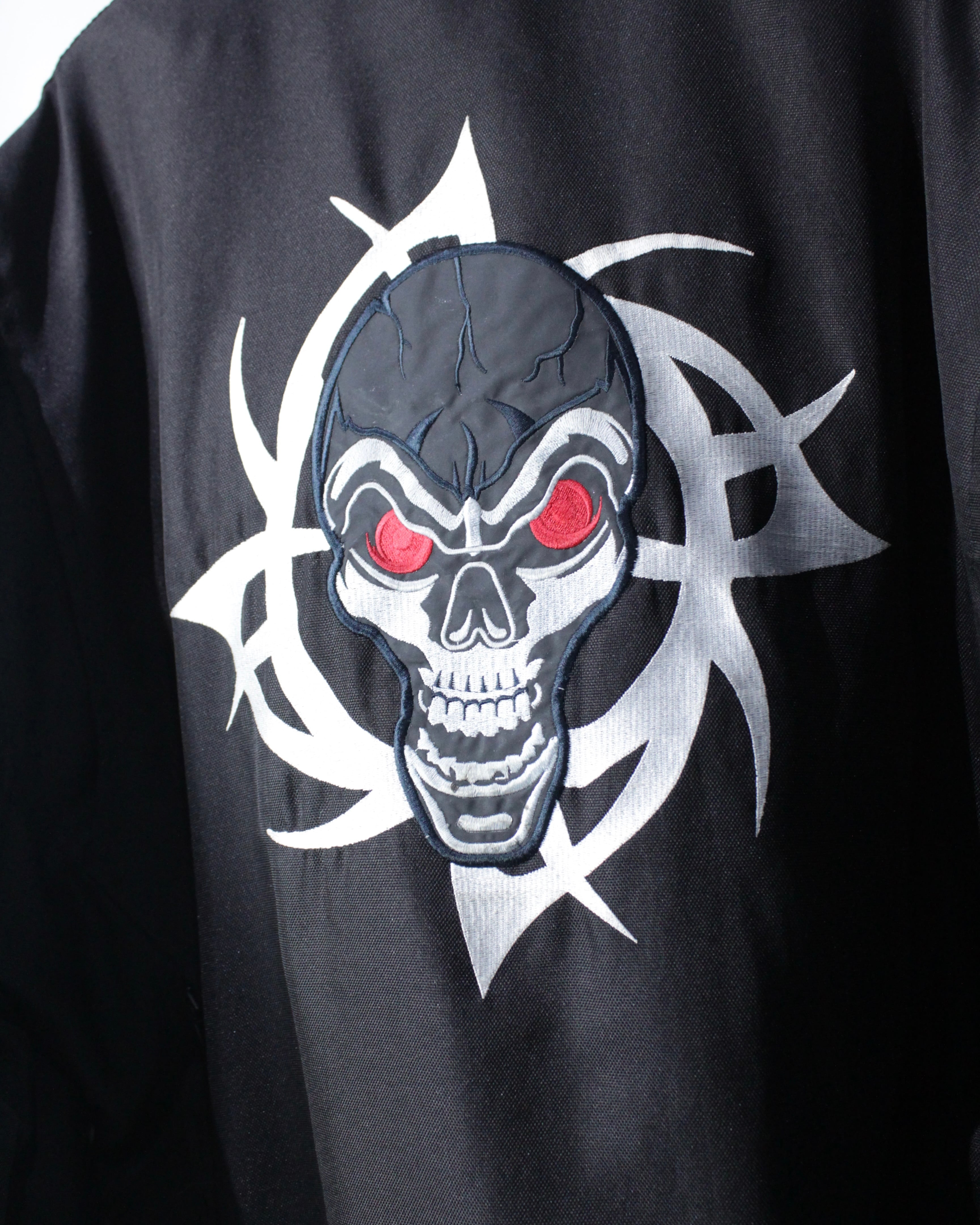 ナイロン素材を用いたタフなブラックボディに、トライバル&スカルを刺繍で刻んだスペシャルなシングルライダースジャケット。