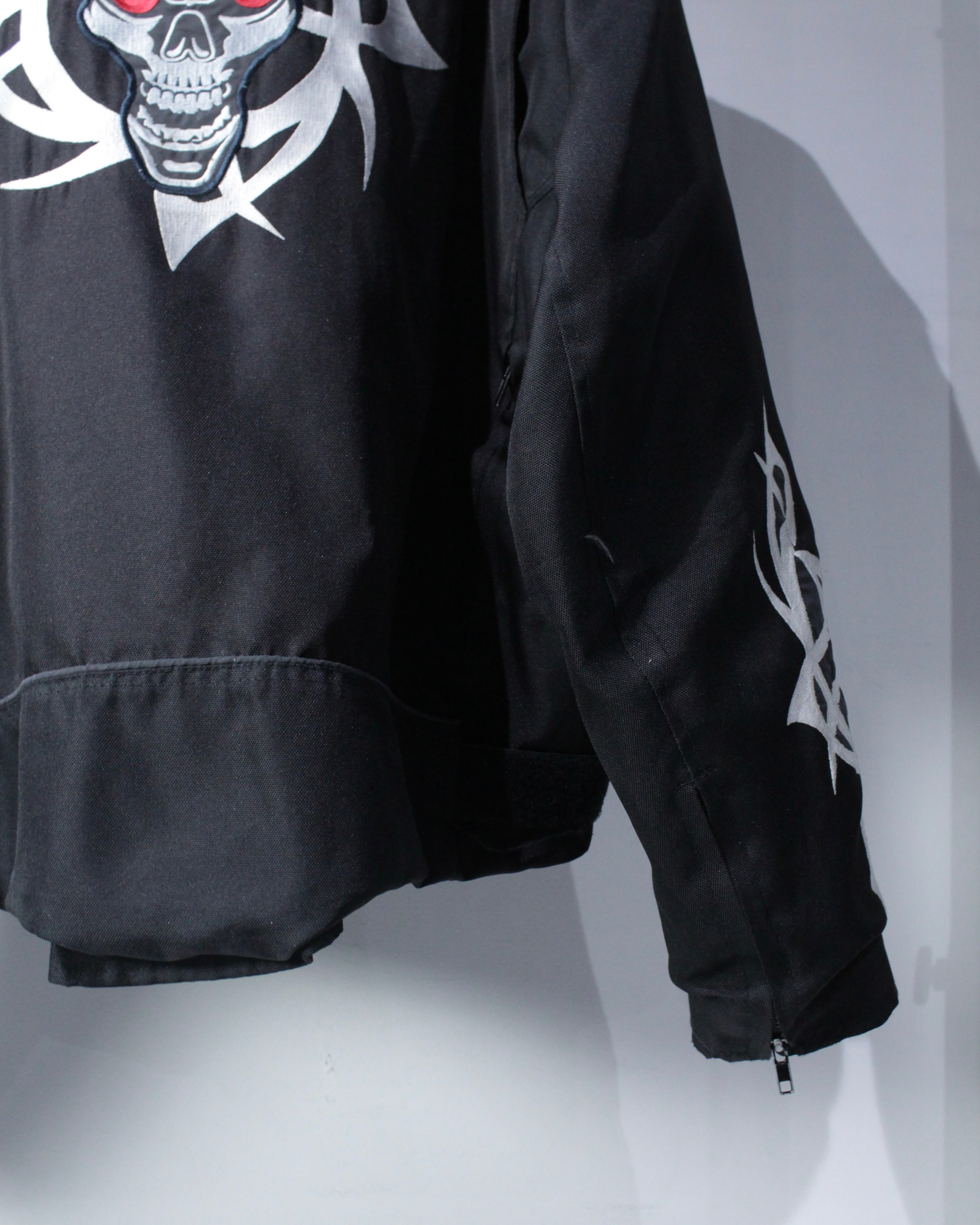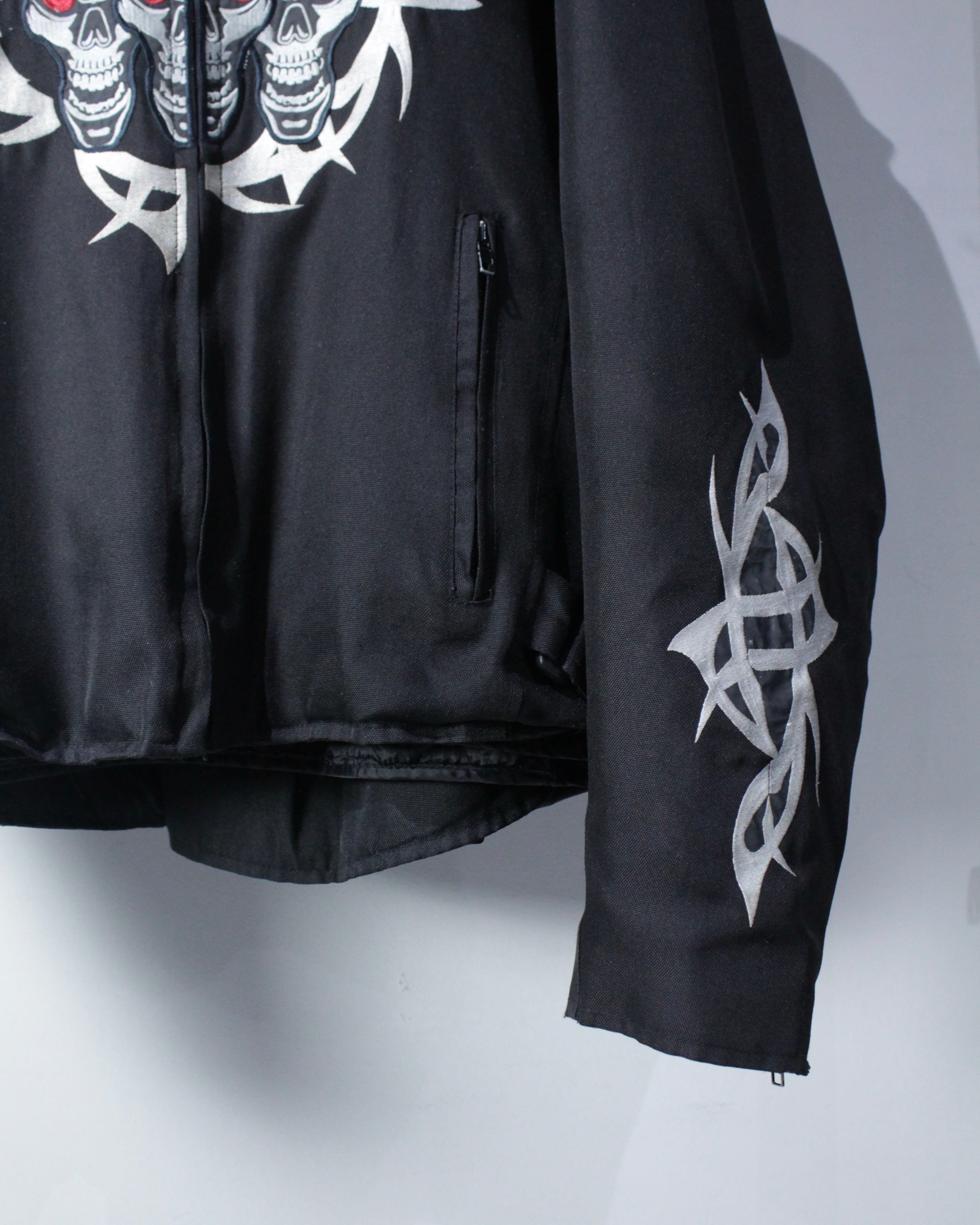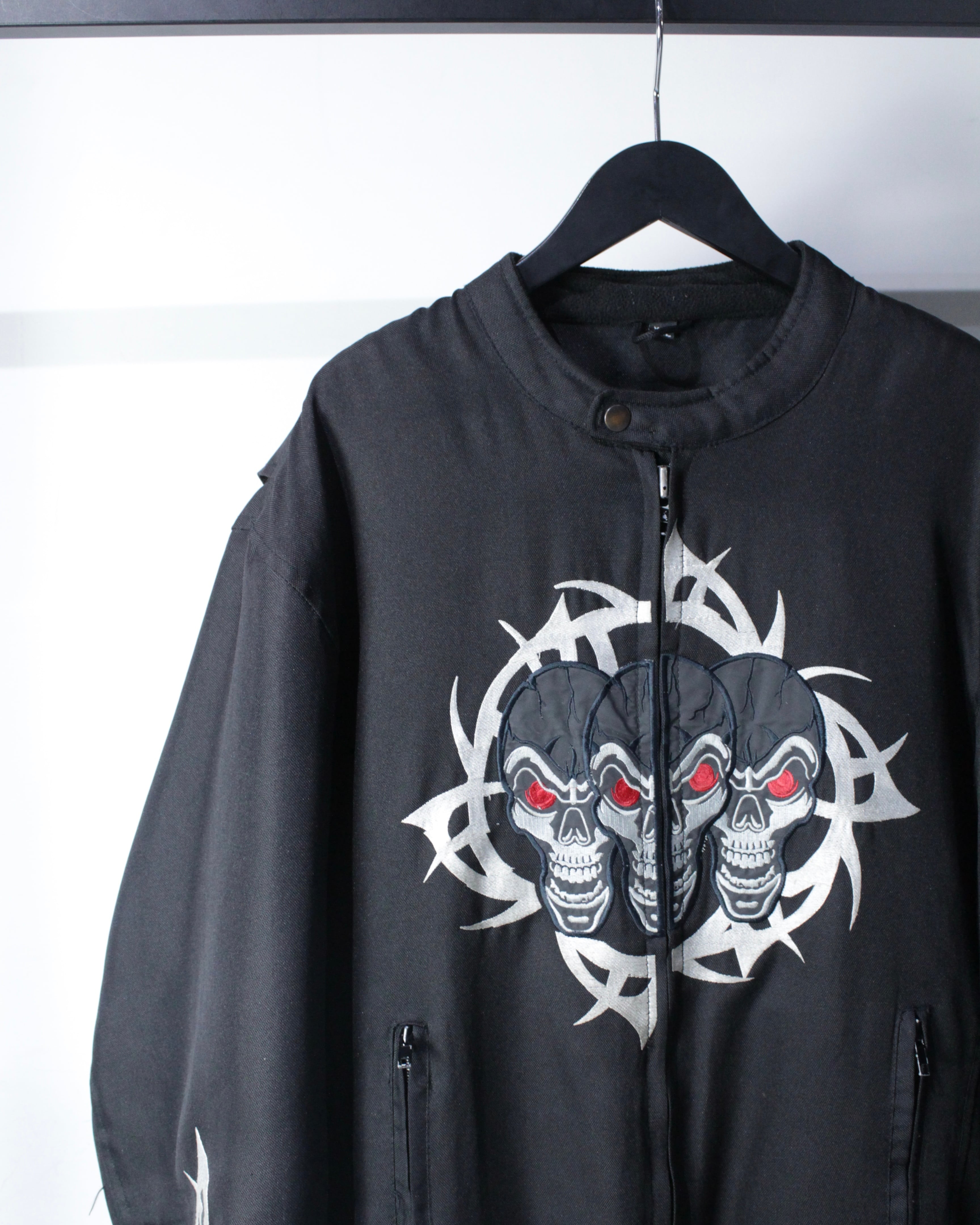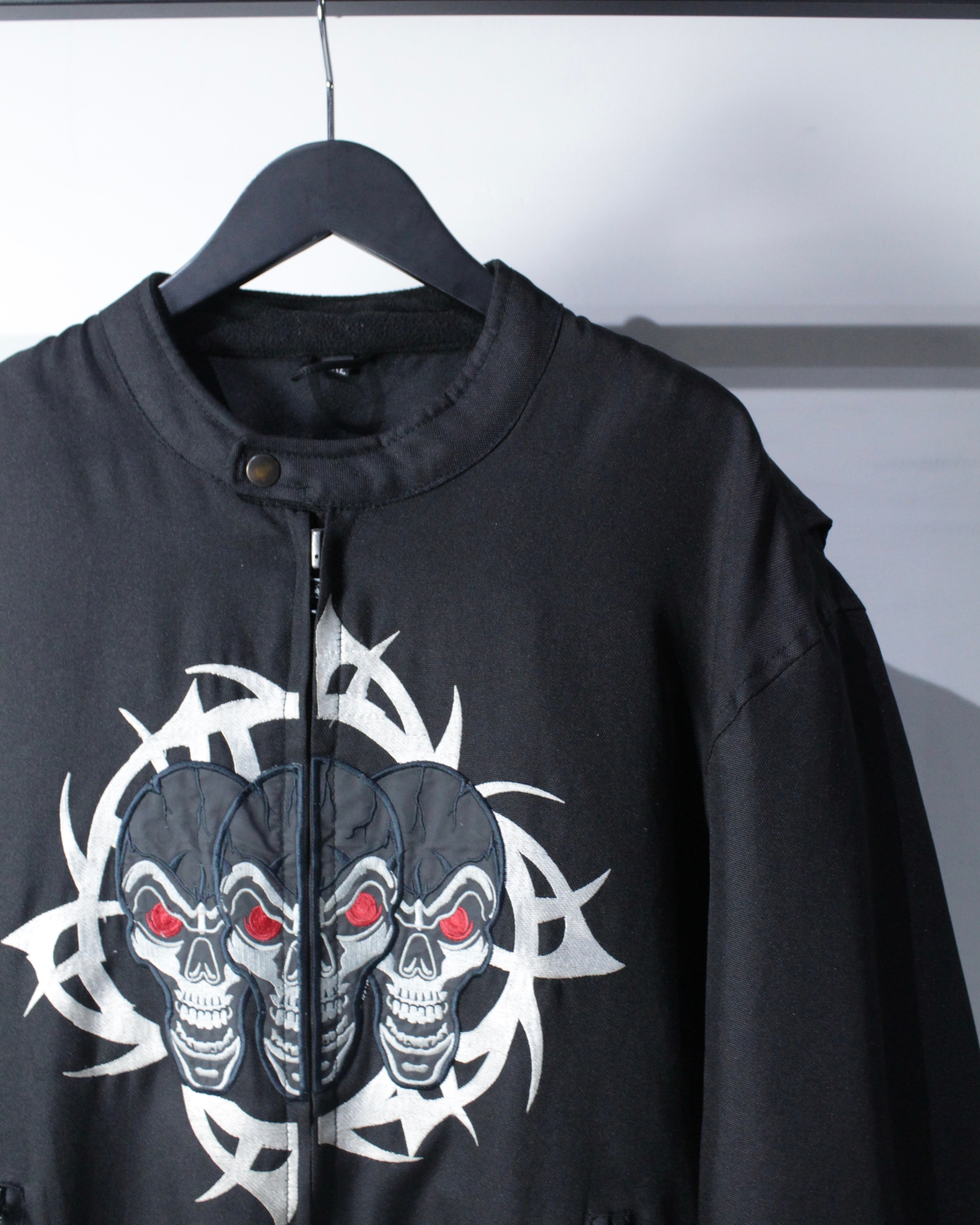 ナイロン素材を用いたタフなブラックボディに、トライバル&スカルを刺繍で刻んだスペシャルなシングルライダースジャケット。