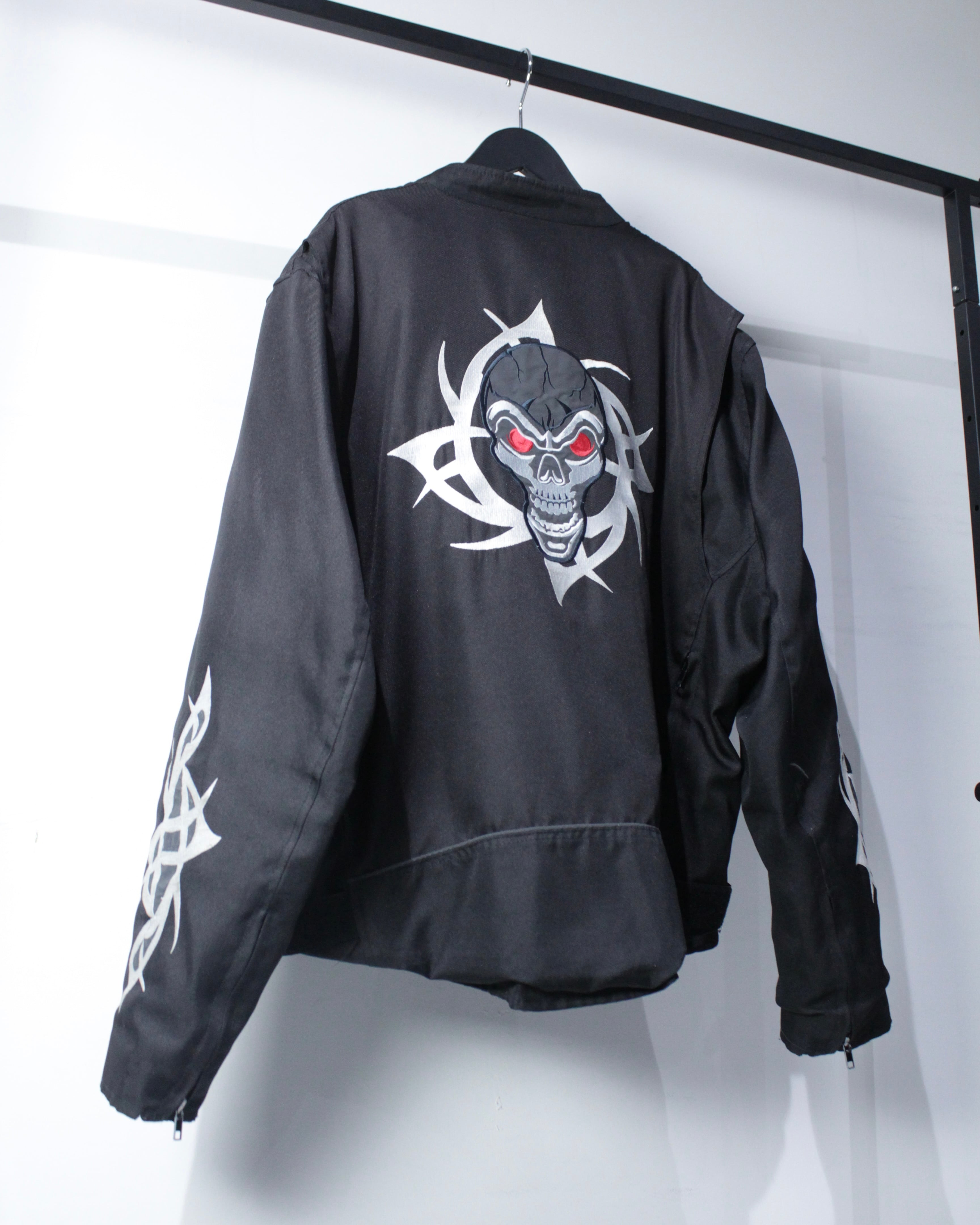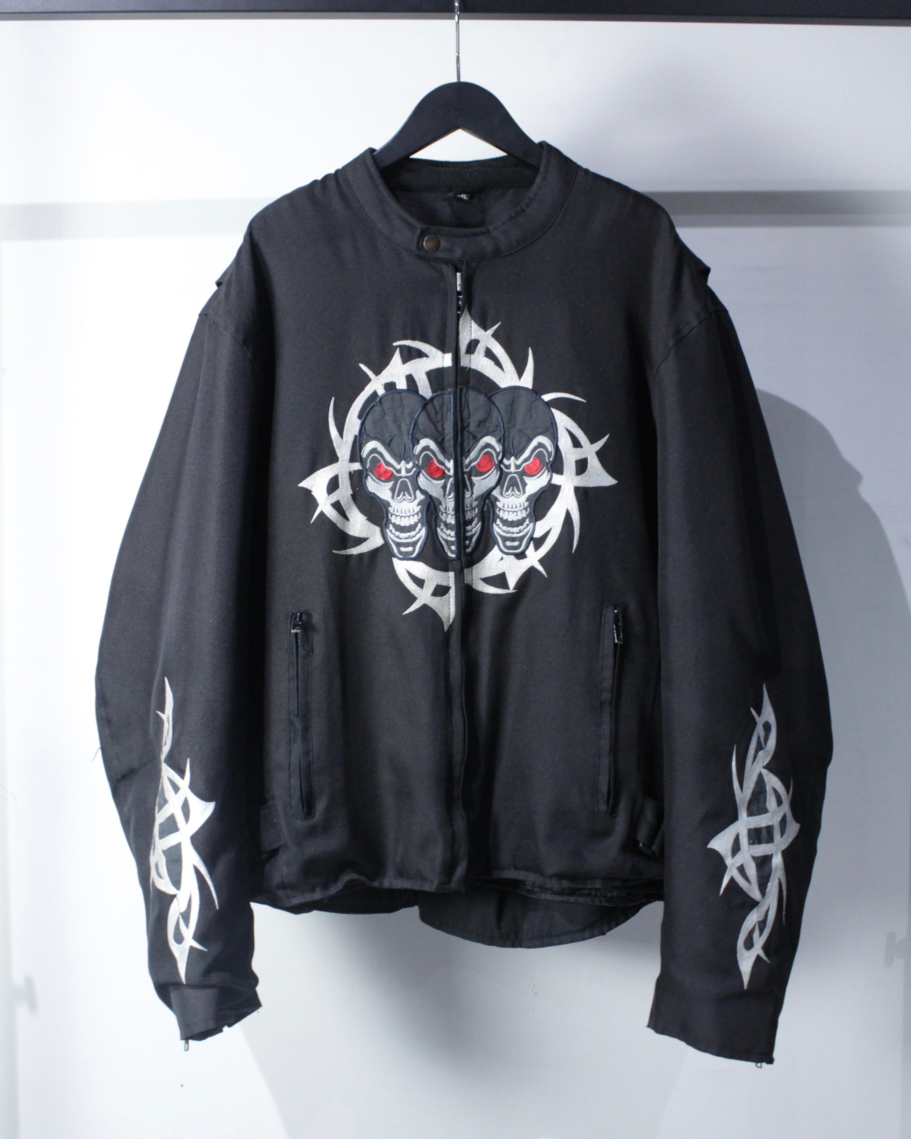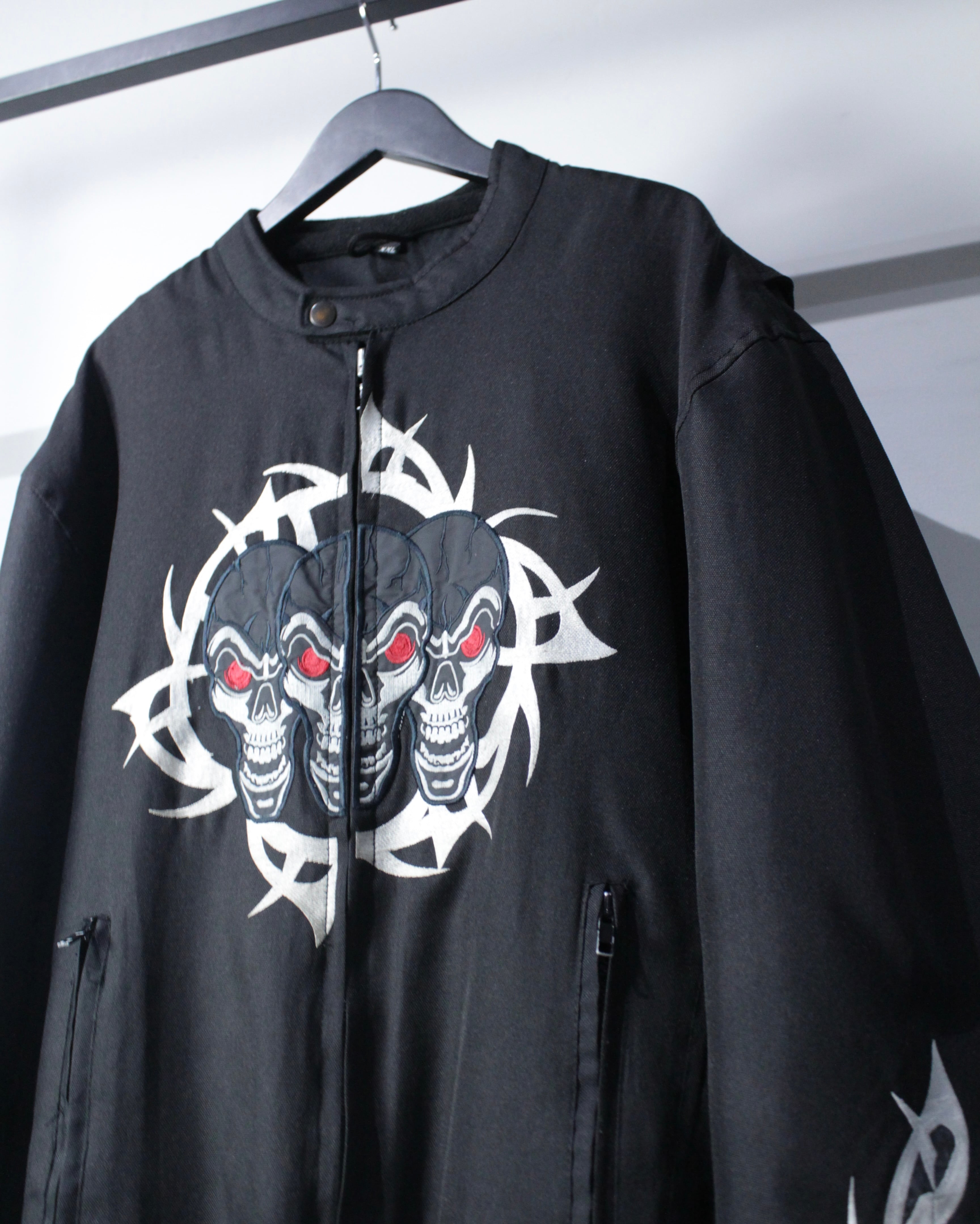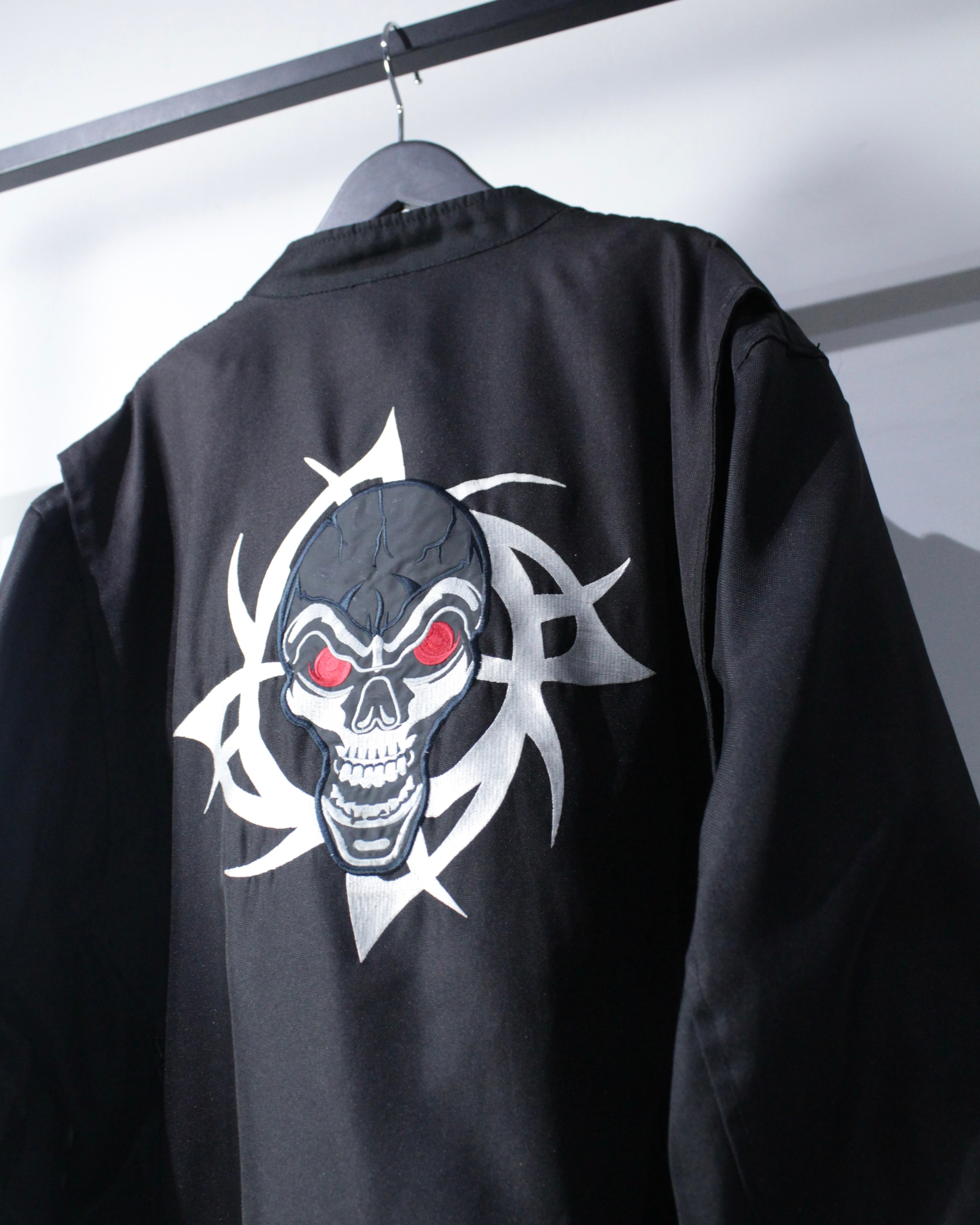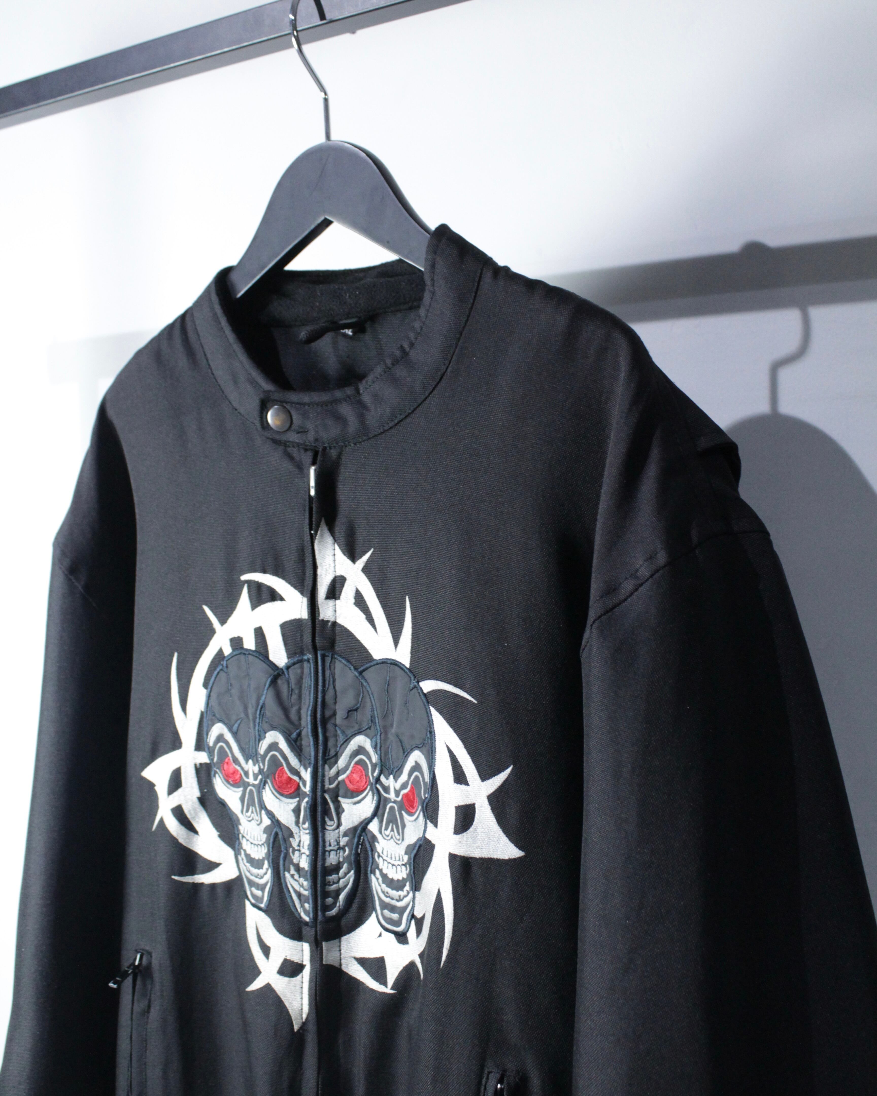 ナイロン素材を用いたタフなブラックボディに、トライバル&スカルを刺繍で刻んだスペシャルなシングルライダースジャケット。