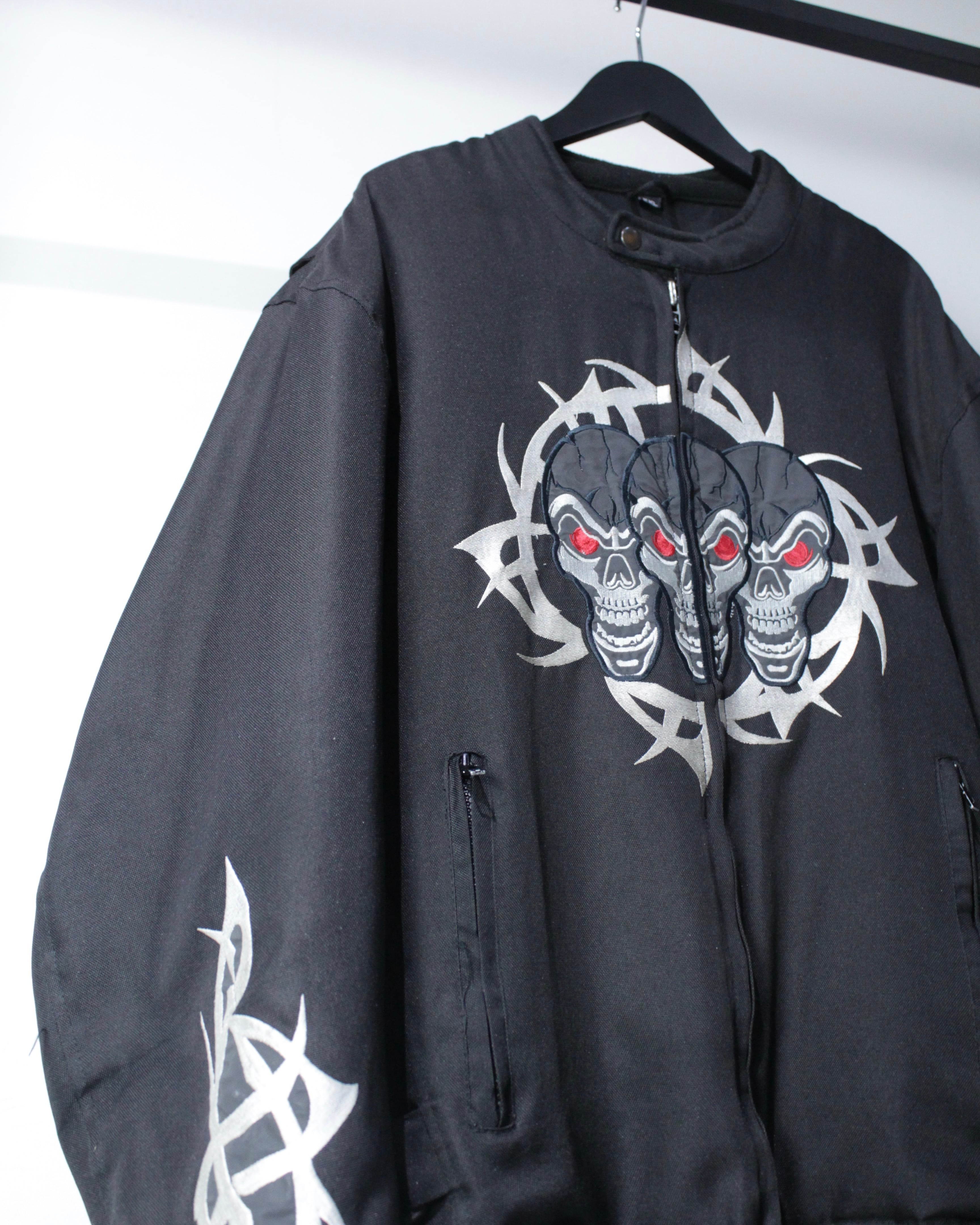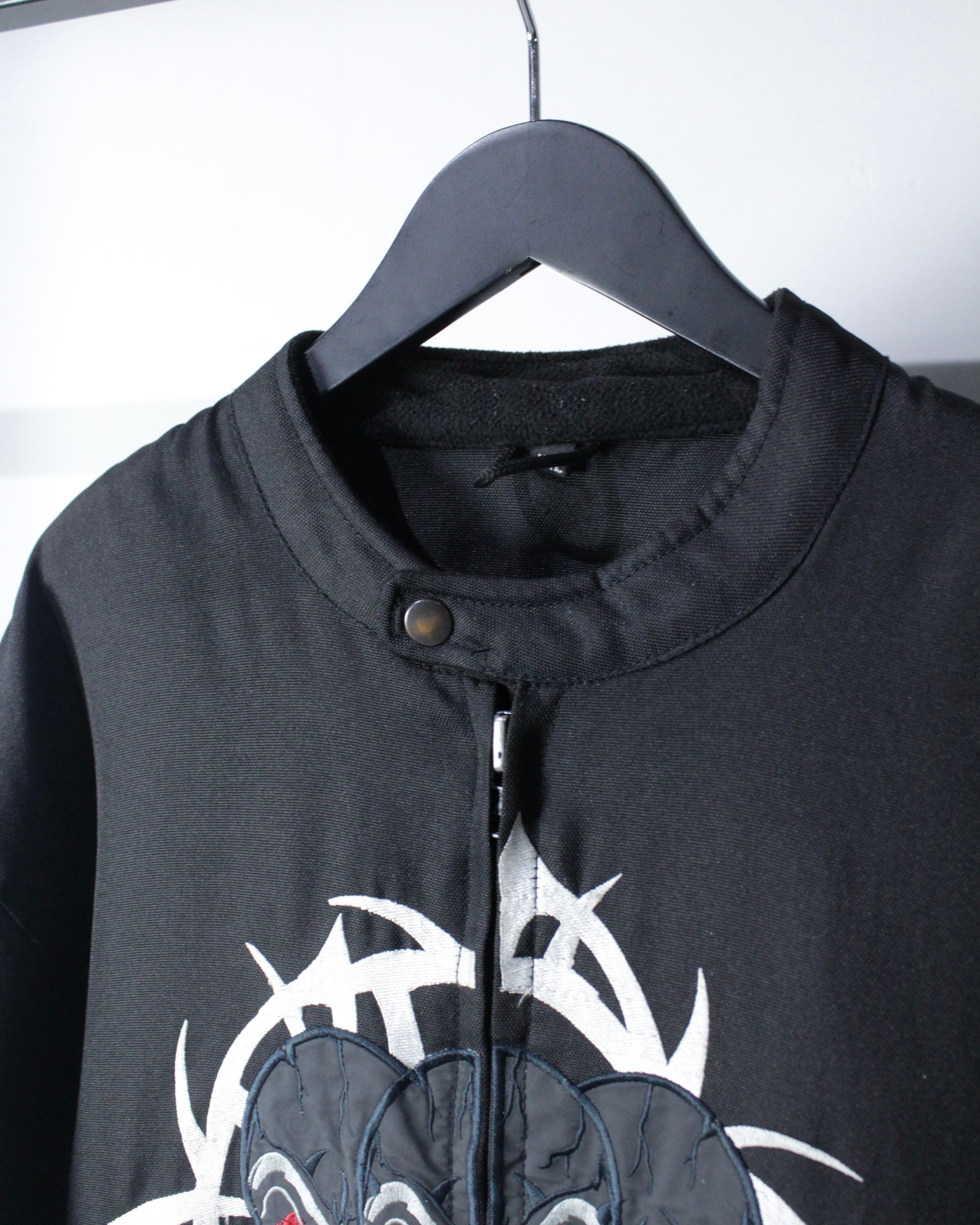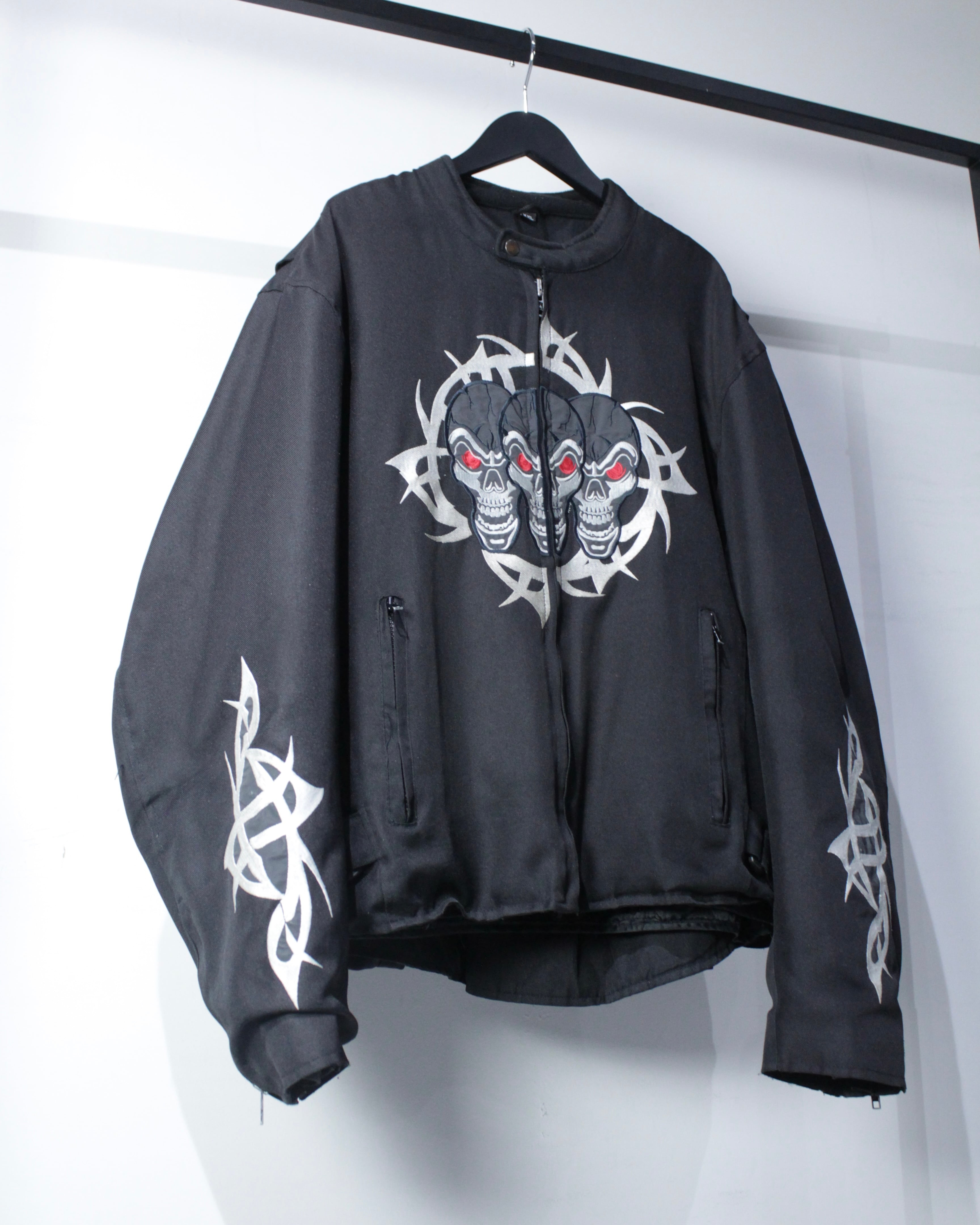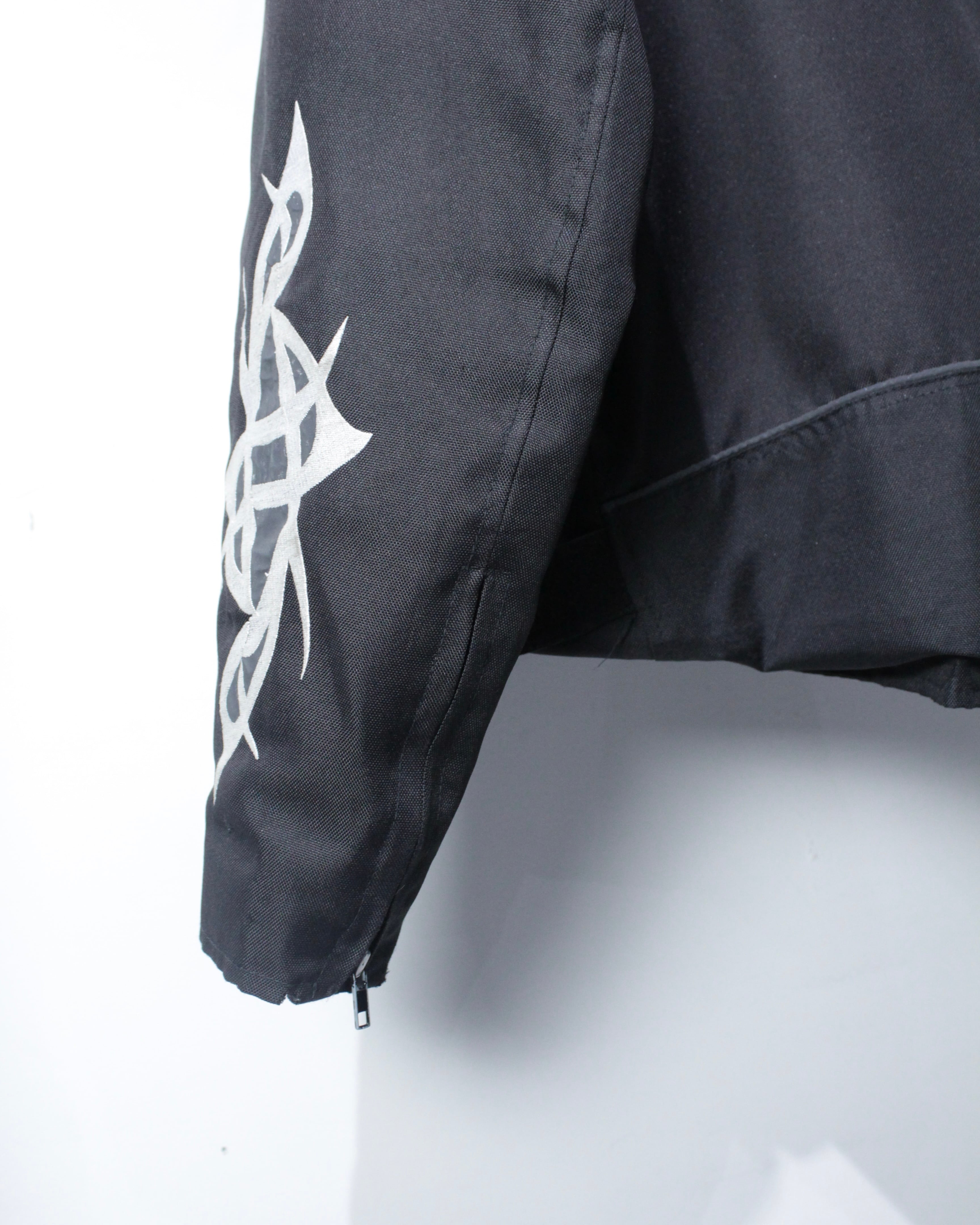 ナイロン素材を用いたタフなブラックボディに、トライバル&スカルを刺繍で刻んだスペシャルなシングルライダースジャケット。