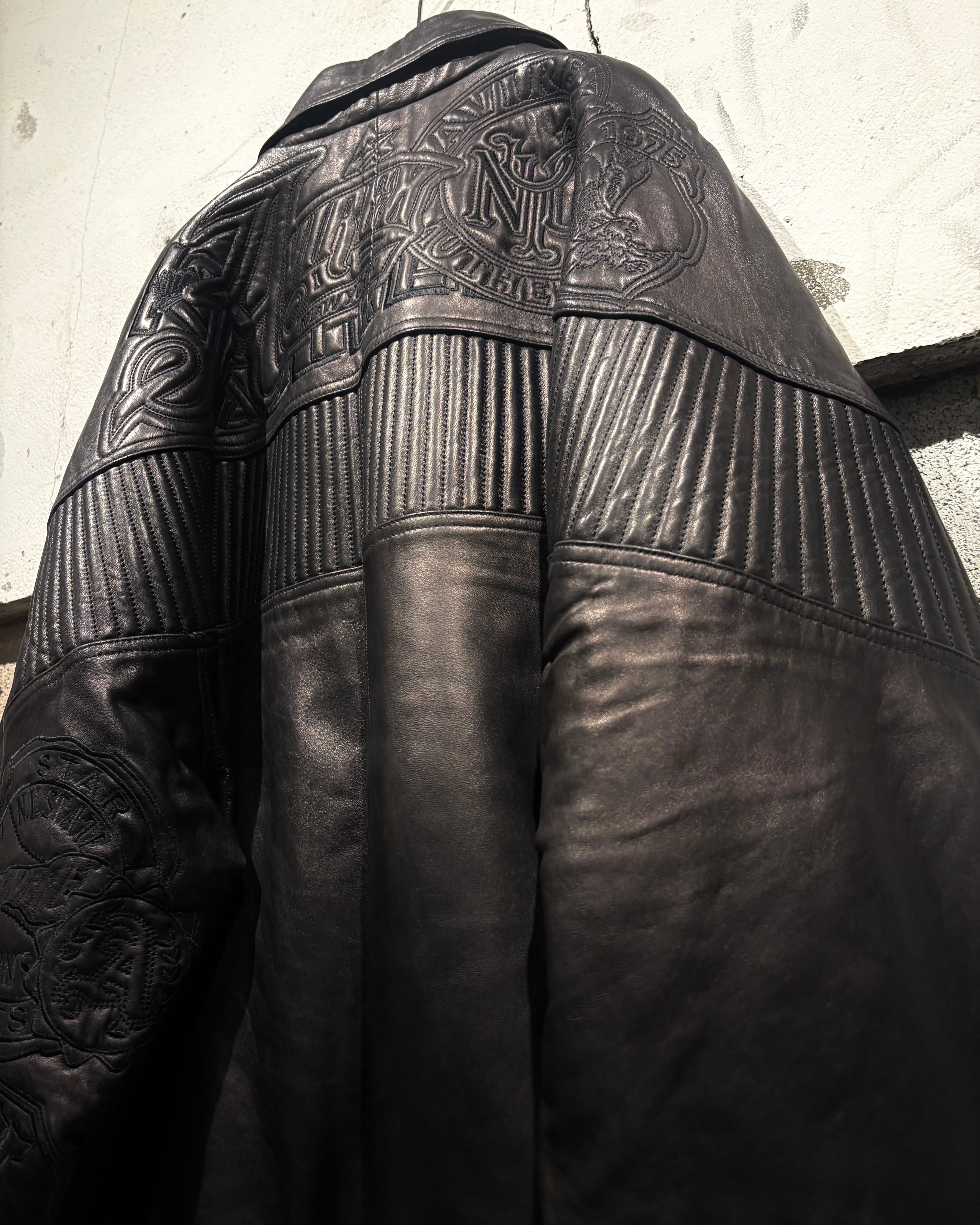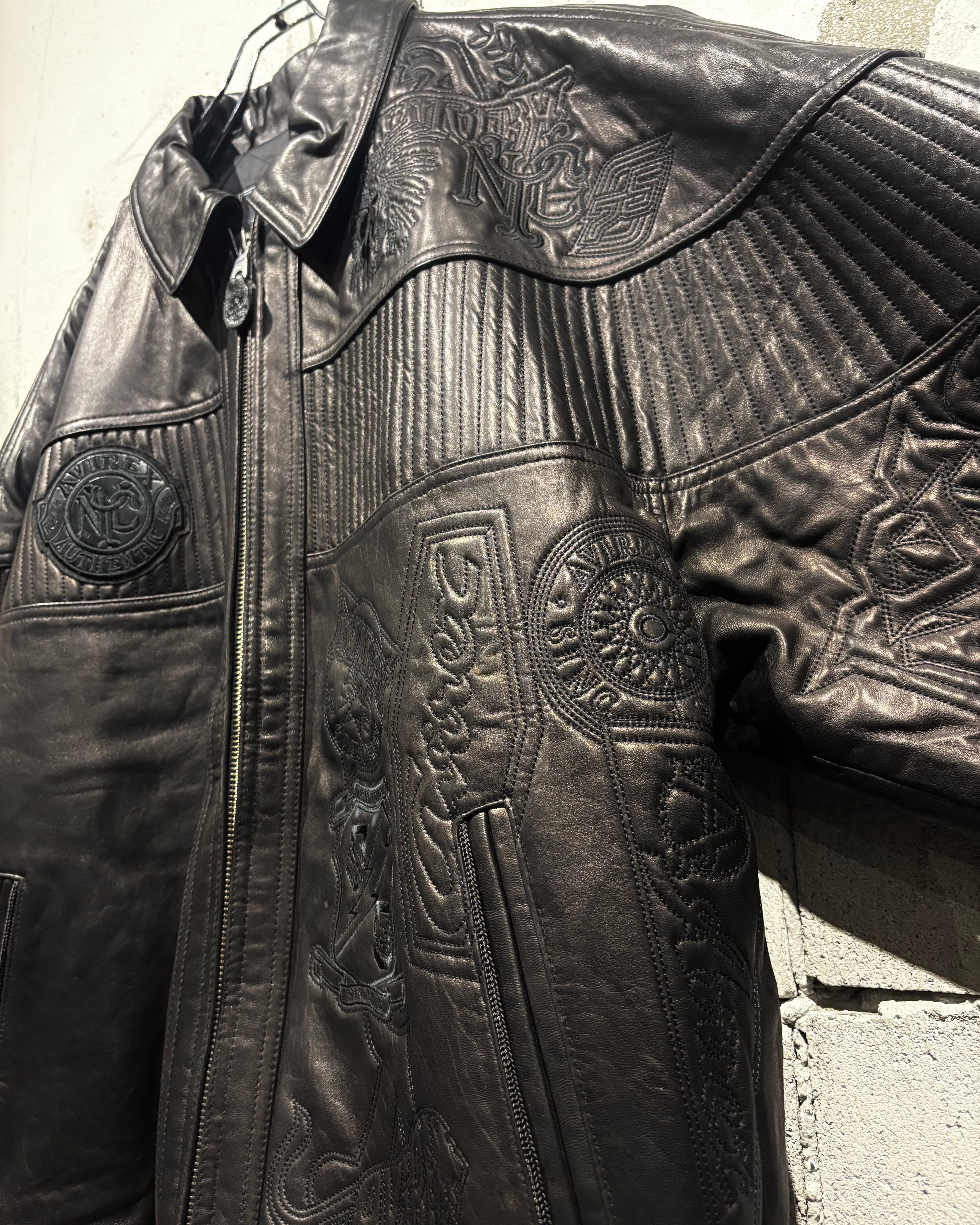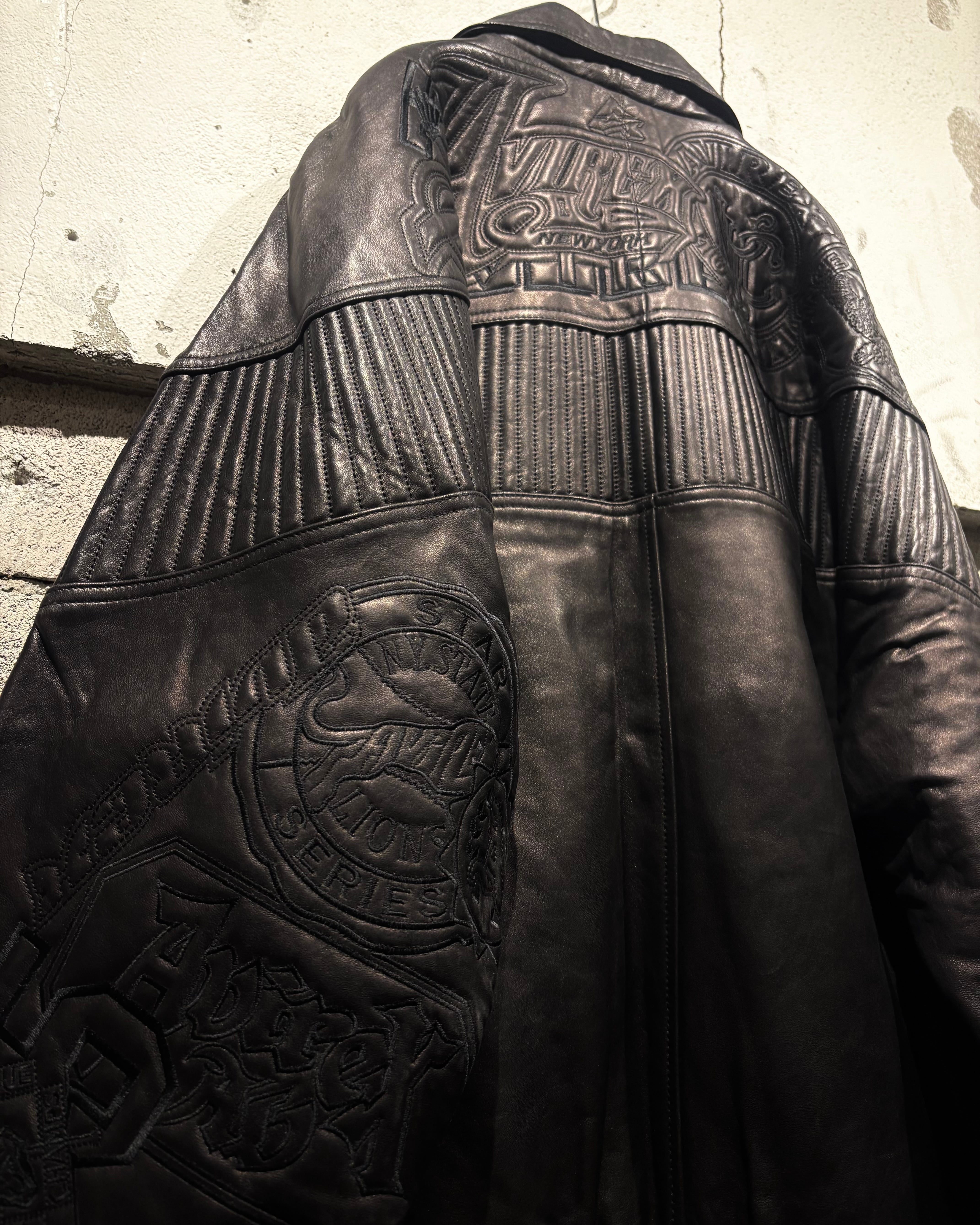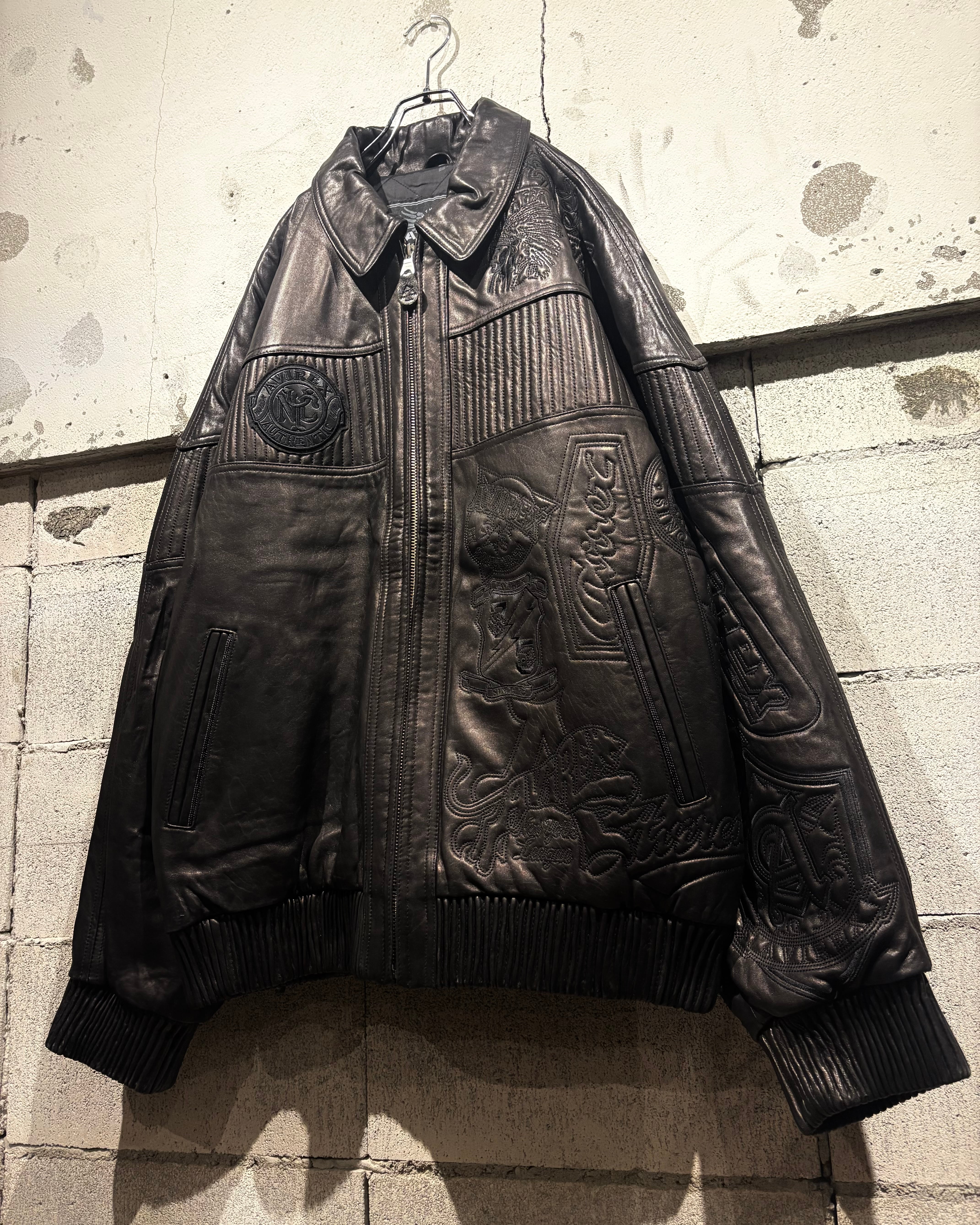 重厚でコシのあるブラックレザーをベースに、ボディ全体へと大胆に落とし込まれた刺繍のグラフィックが印象的な1着。去年の初売り以来の奇跡の2着目で、コンディションもほぼ未使用、次ははさすがに見つからないと思います、、