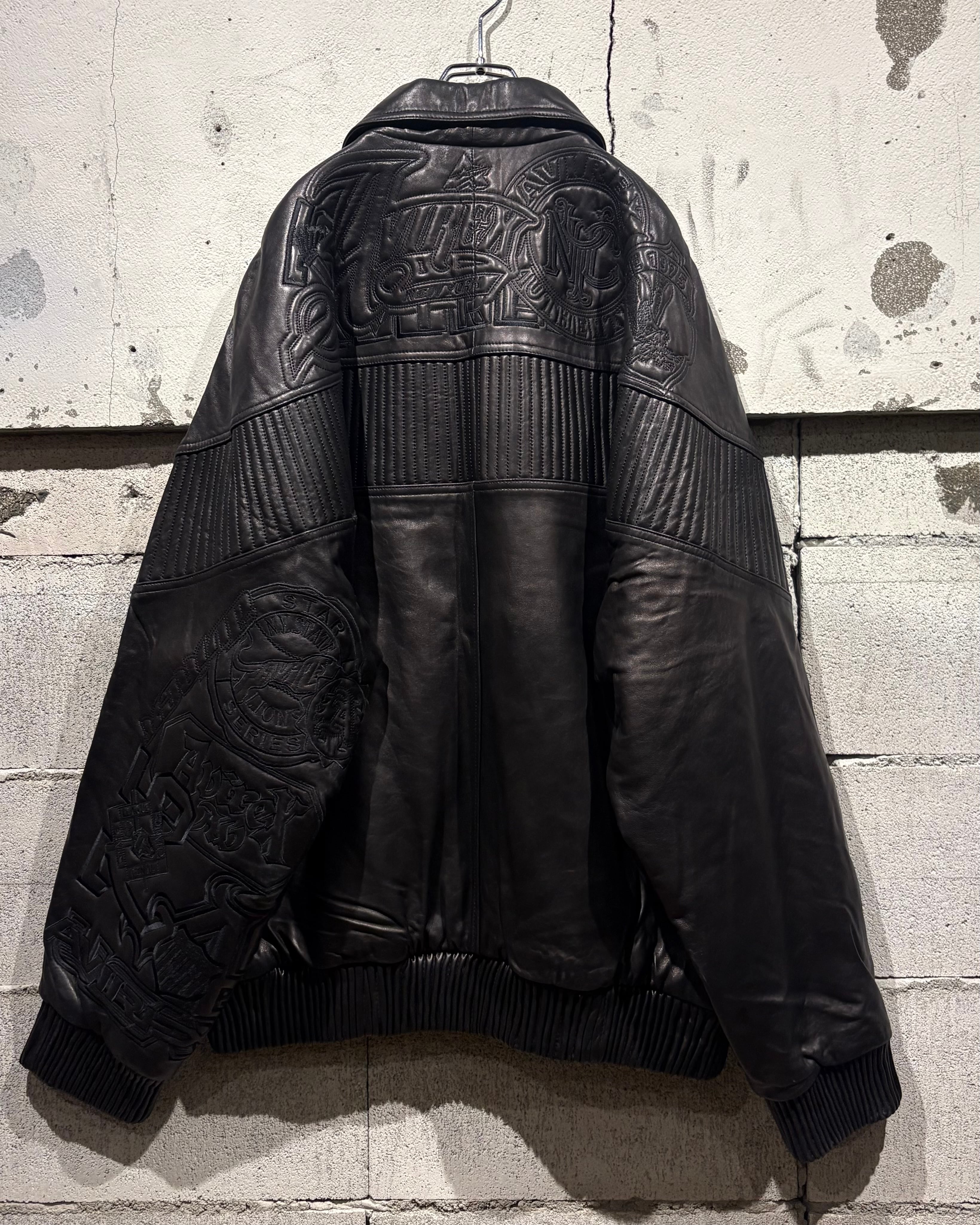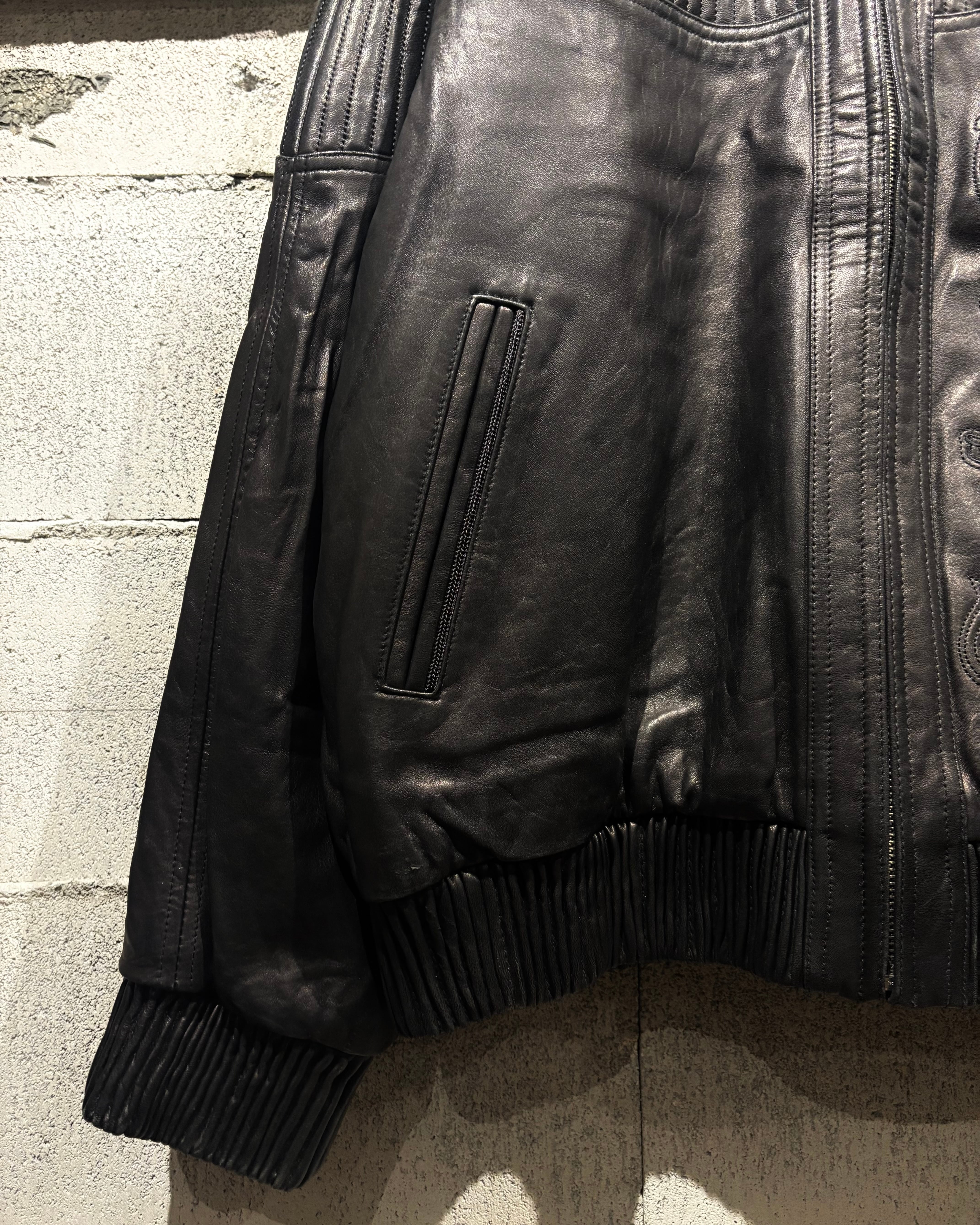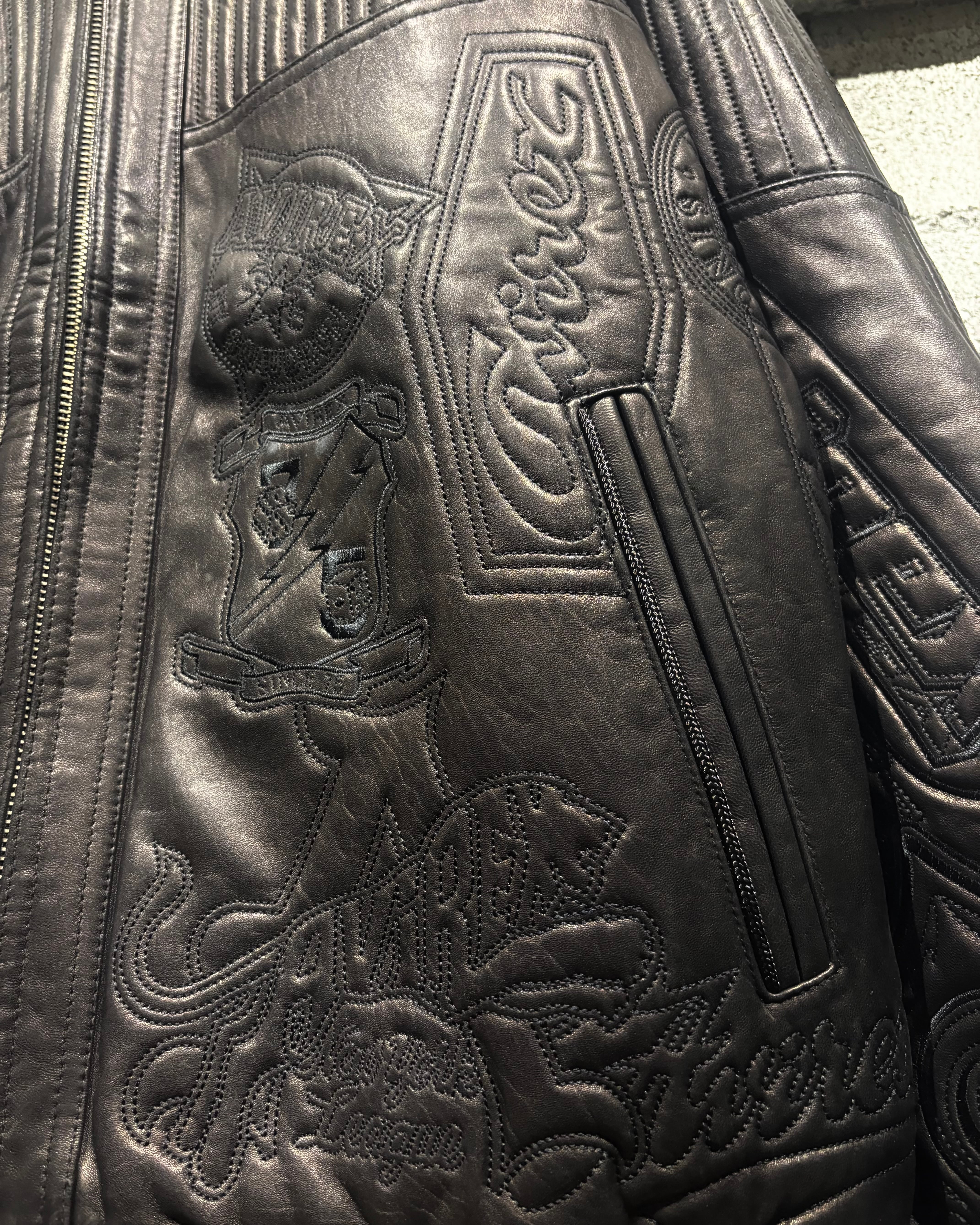 重厚でコシのあるブラックレザーをベースに、ボディ全体へと大胆に落とし込まれた刺繍のグラフィックが印象的な1着。去年の初売り以来の奇跡の2着目で、コンディションもほぼ未使用、次ははさすがに見つからないと思います、、