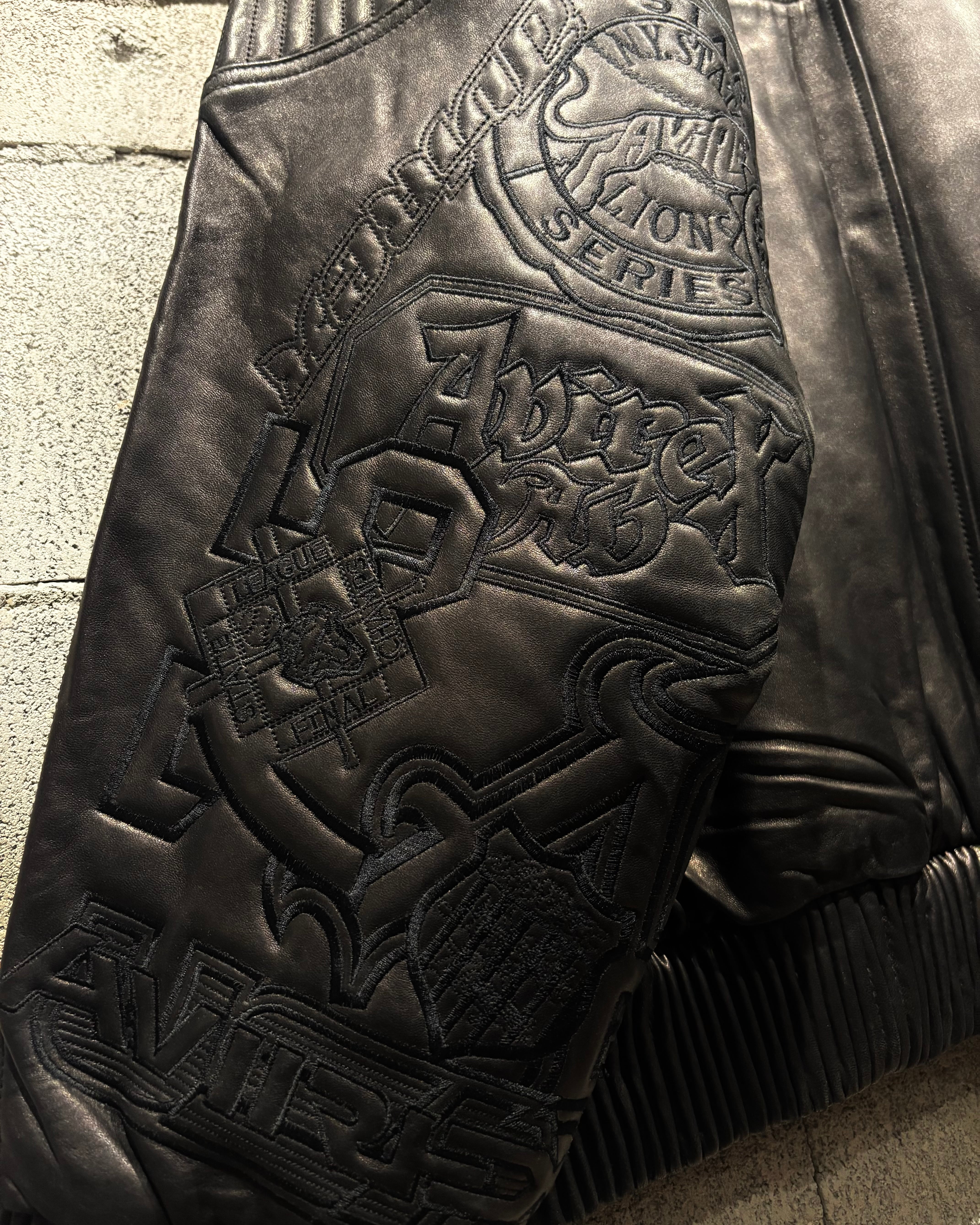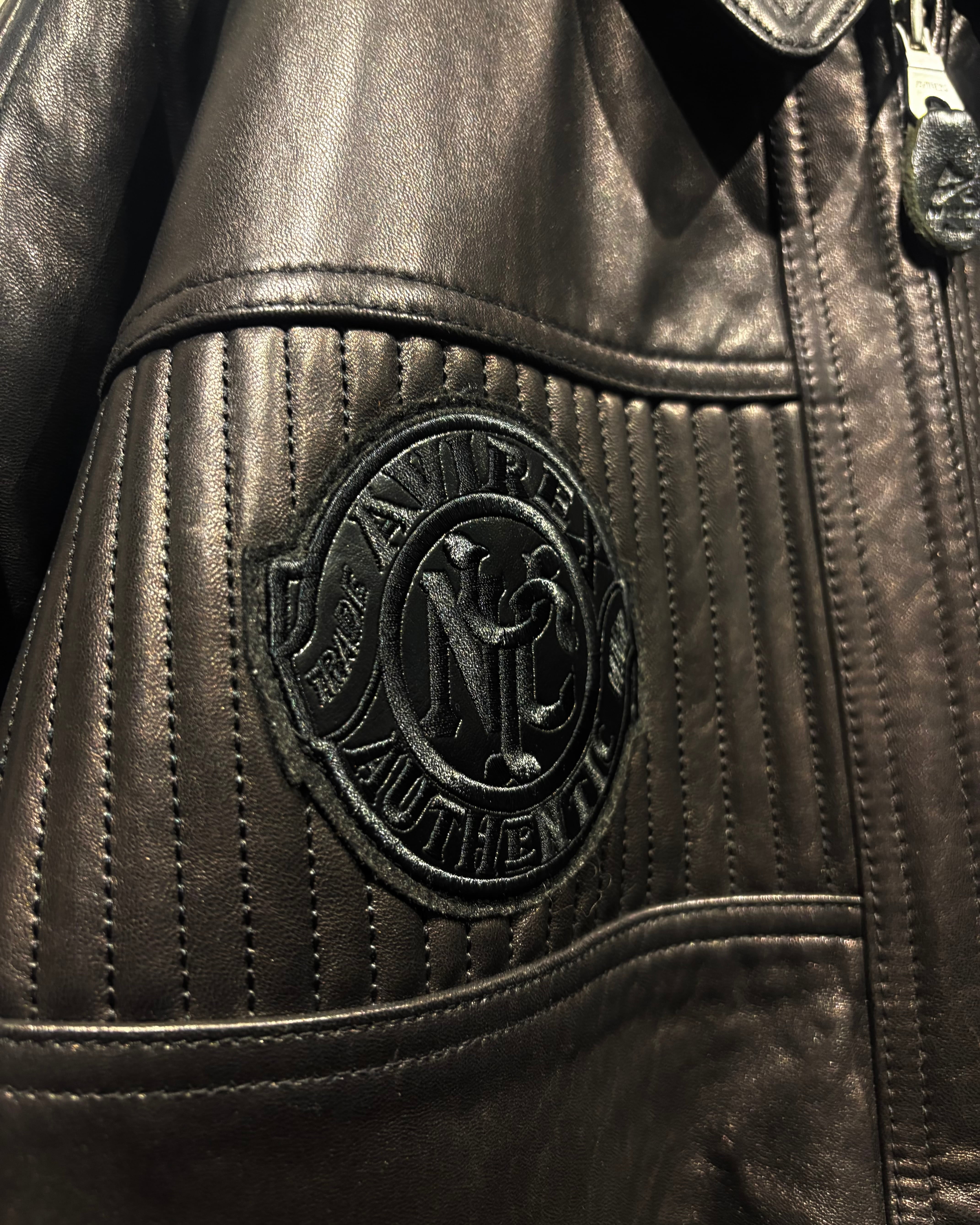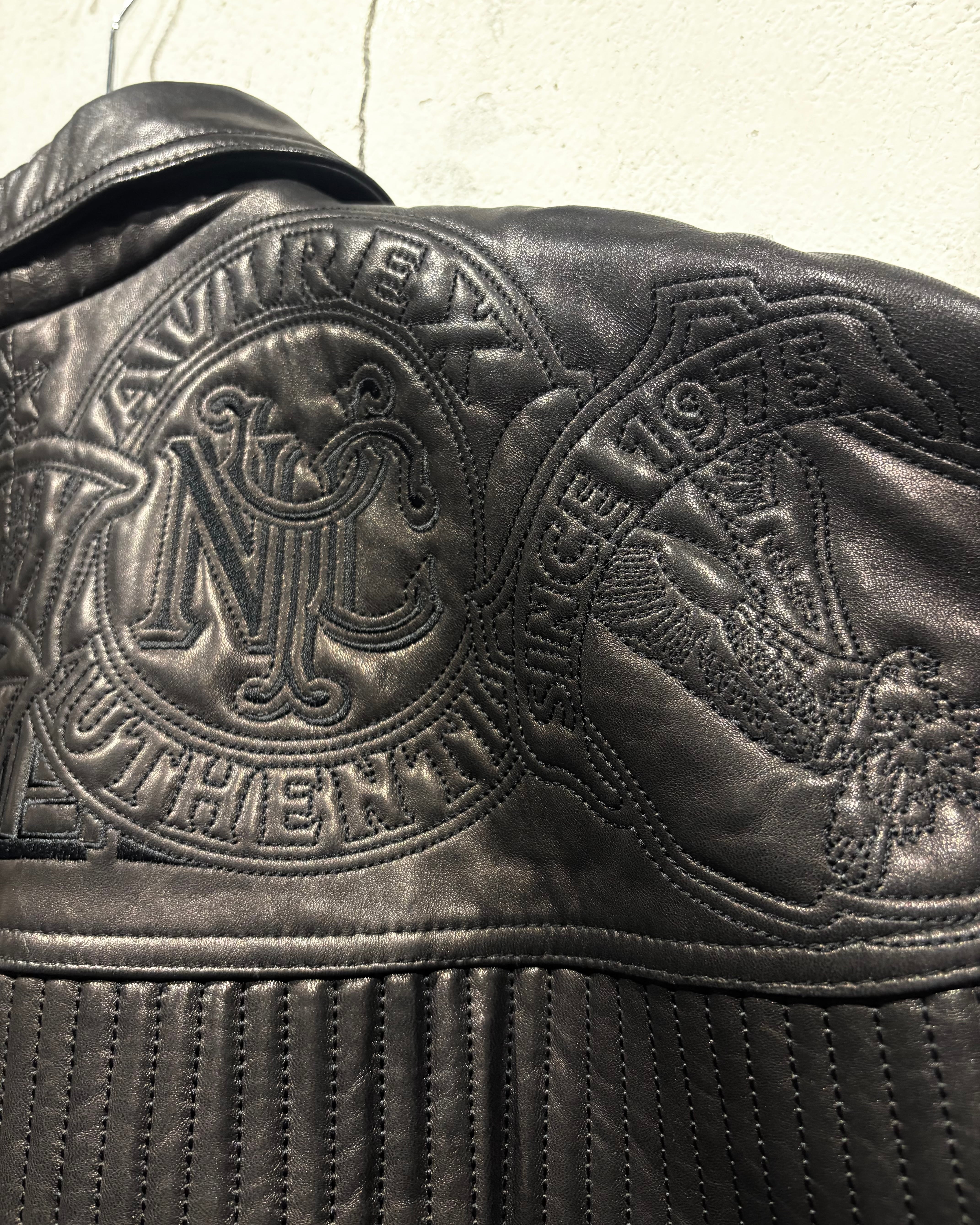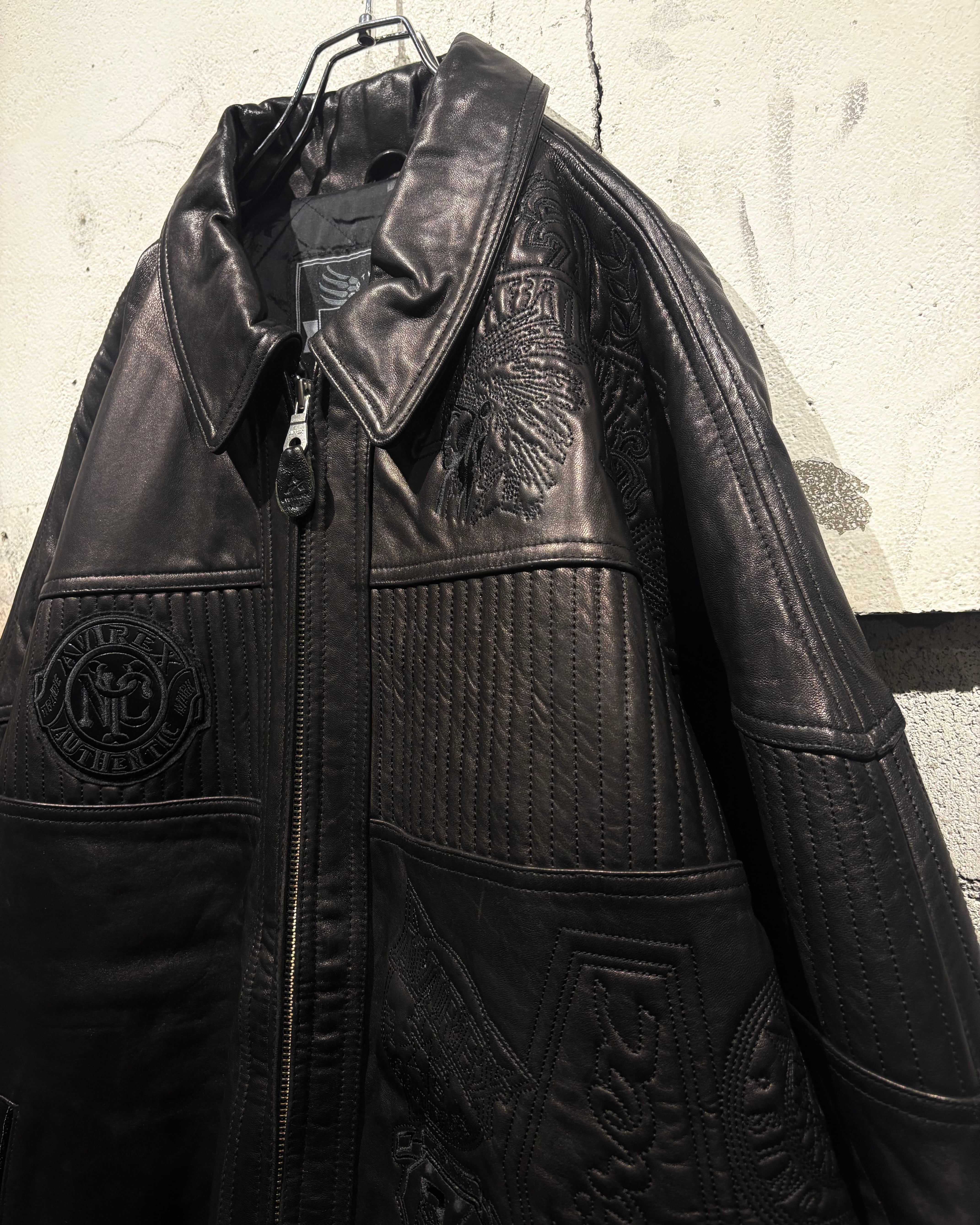 重厚でコシのあるブラックレザーをベースに、ボディ全体へと大胆に落とし込まれた刺繍のグラフィックが印象的な1着。去年の初売り以来の奇跡の2着目で、コンディションもほぼ未使用、次ははさすがに見つからないと思います、、
