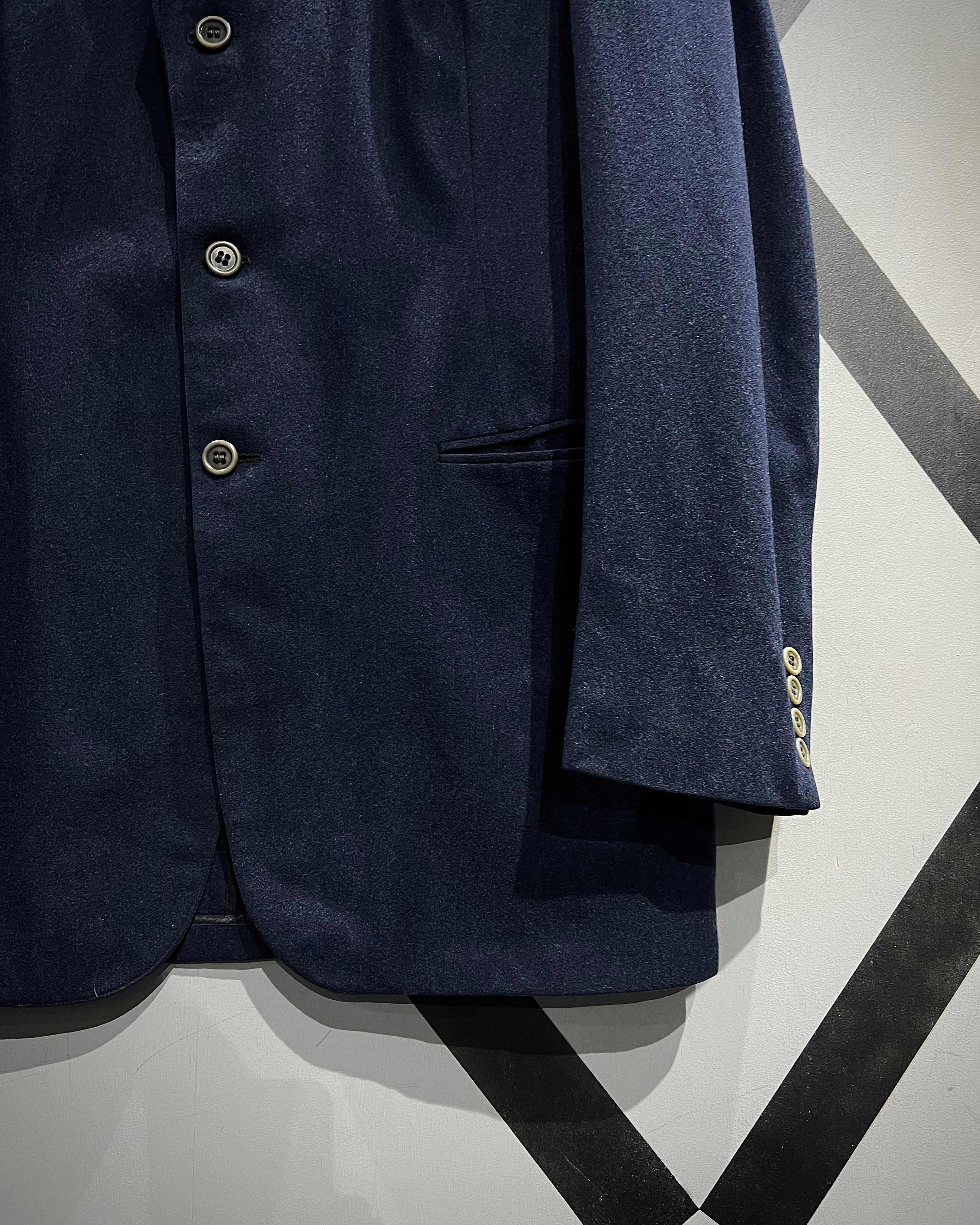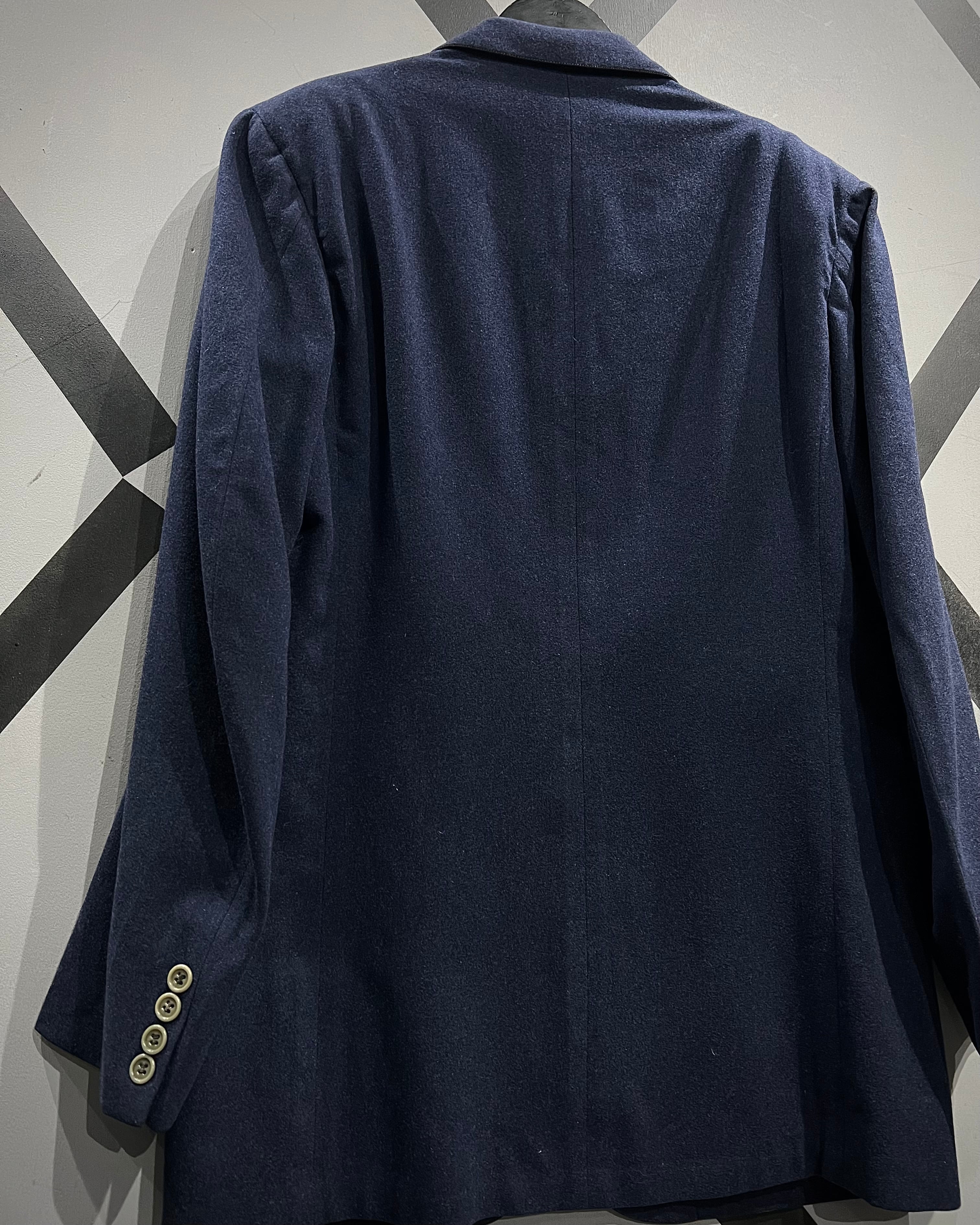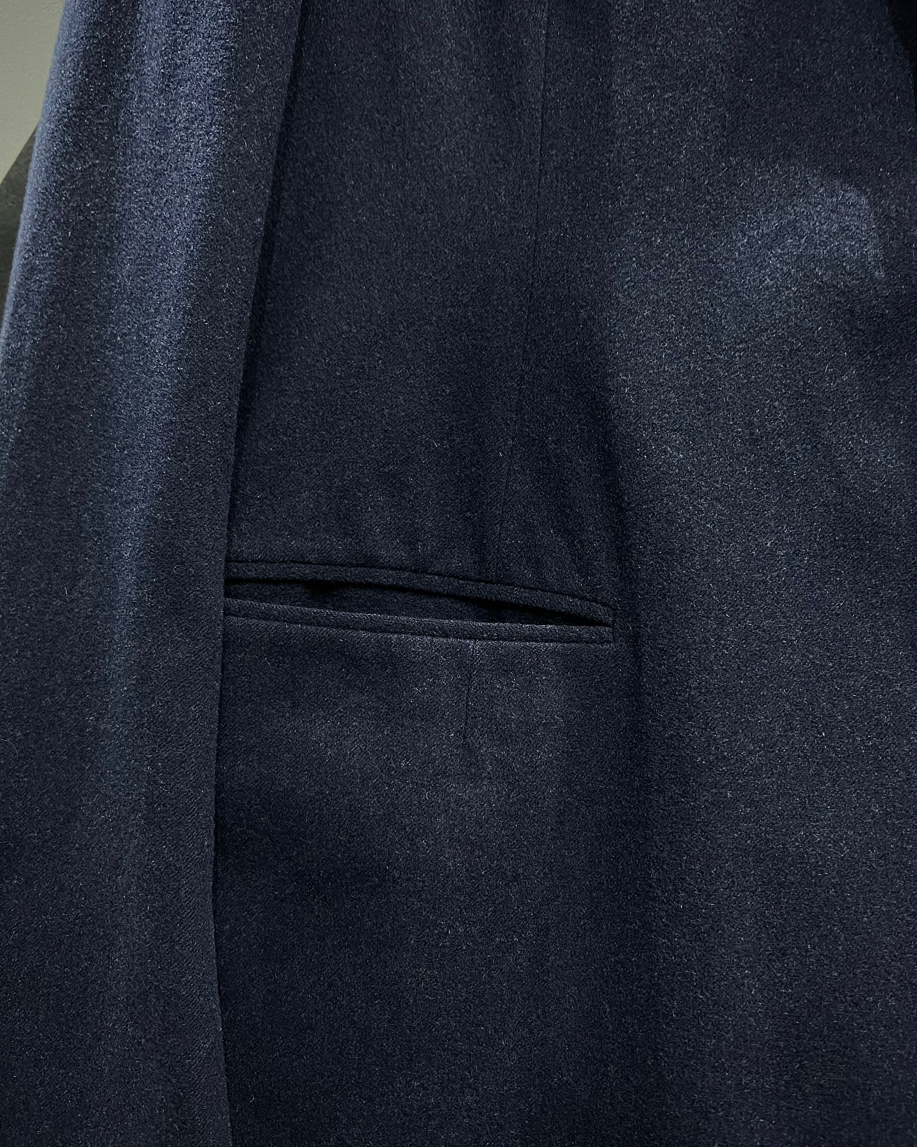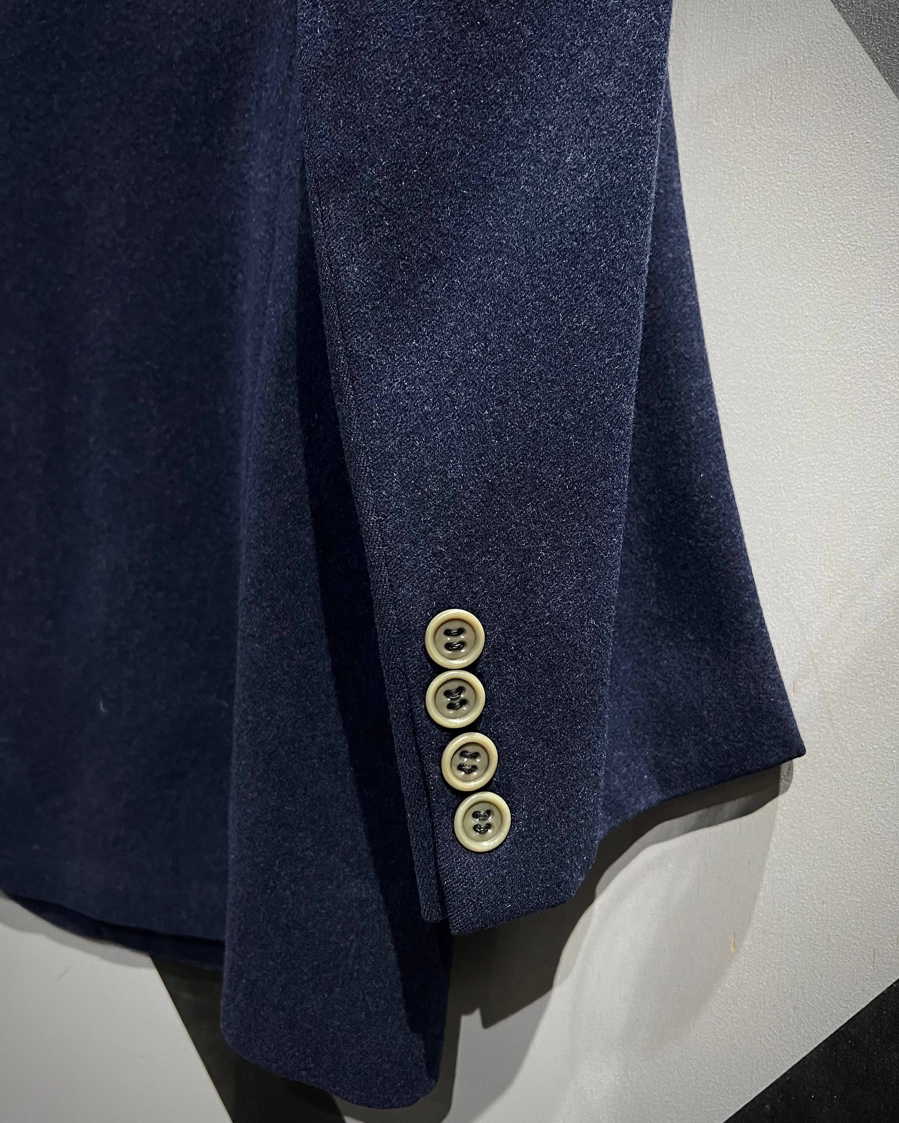 フロントはシンプルな3ボタン仕様、ポケットなど、装飾を抑えたミニマルなディテール。だからこそシルエットと生地の良さが際立ち、時代を超えて通用する完成度の高さを感じさせますね。