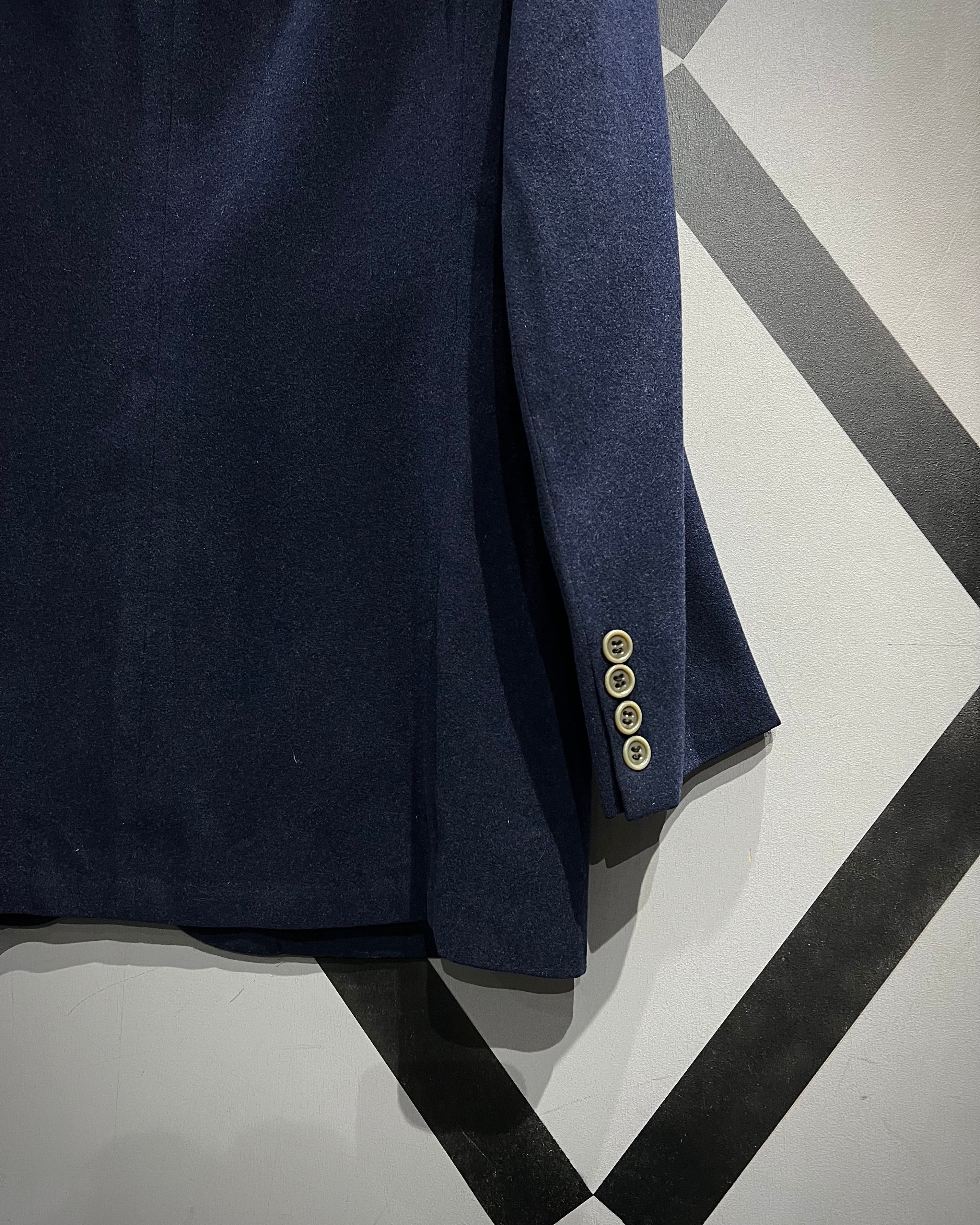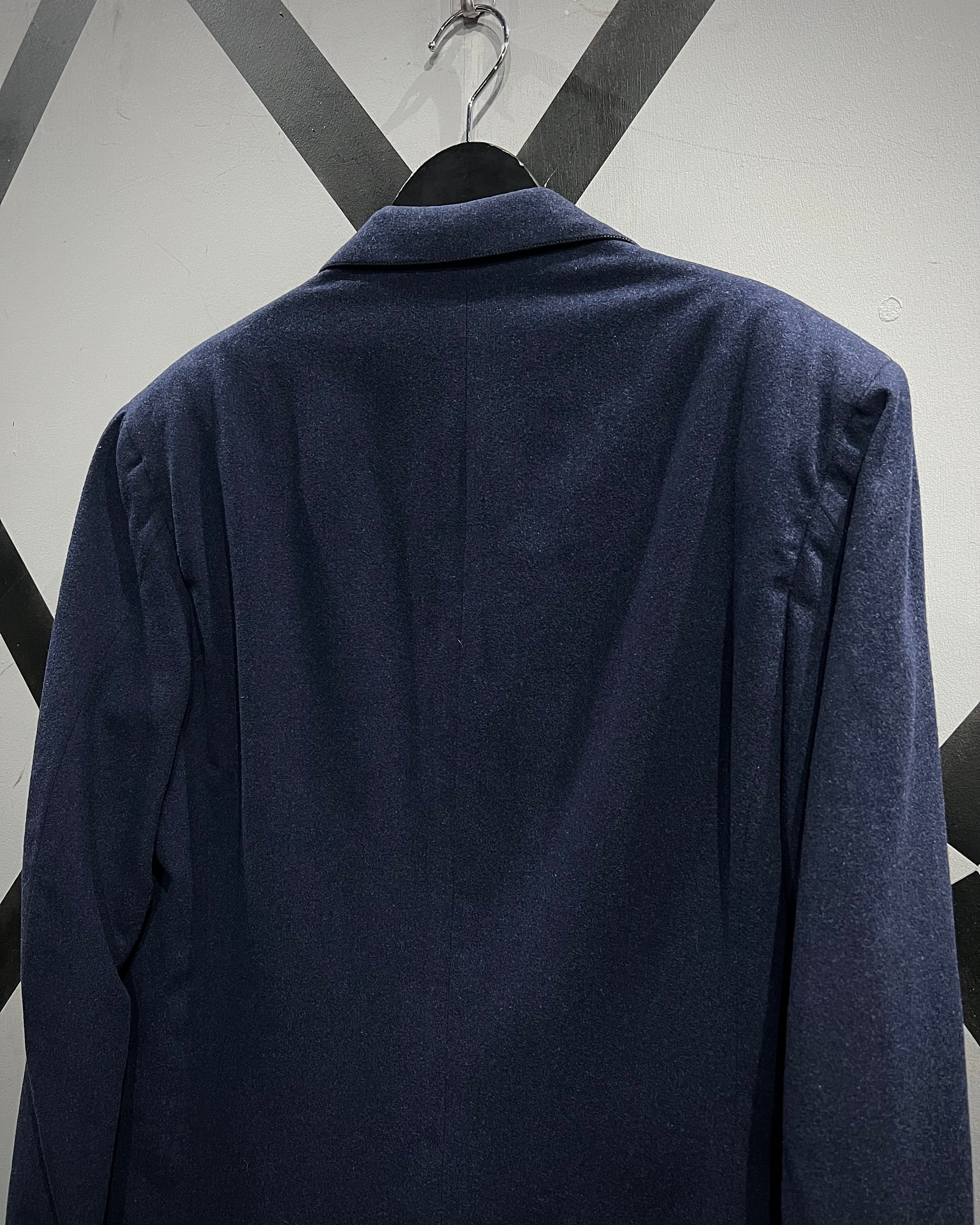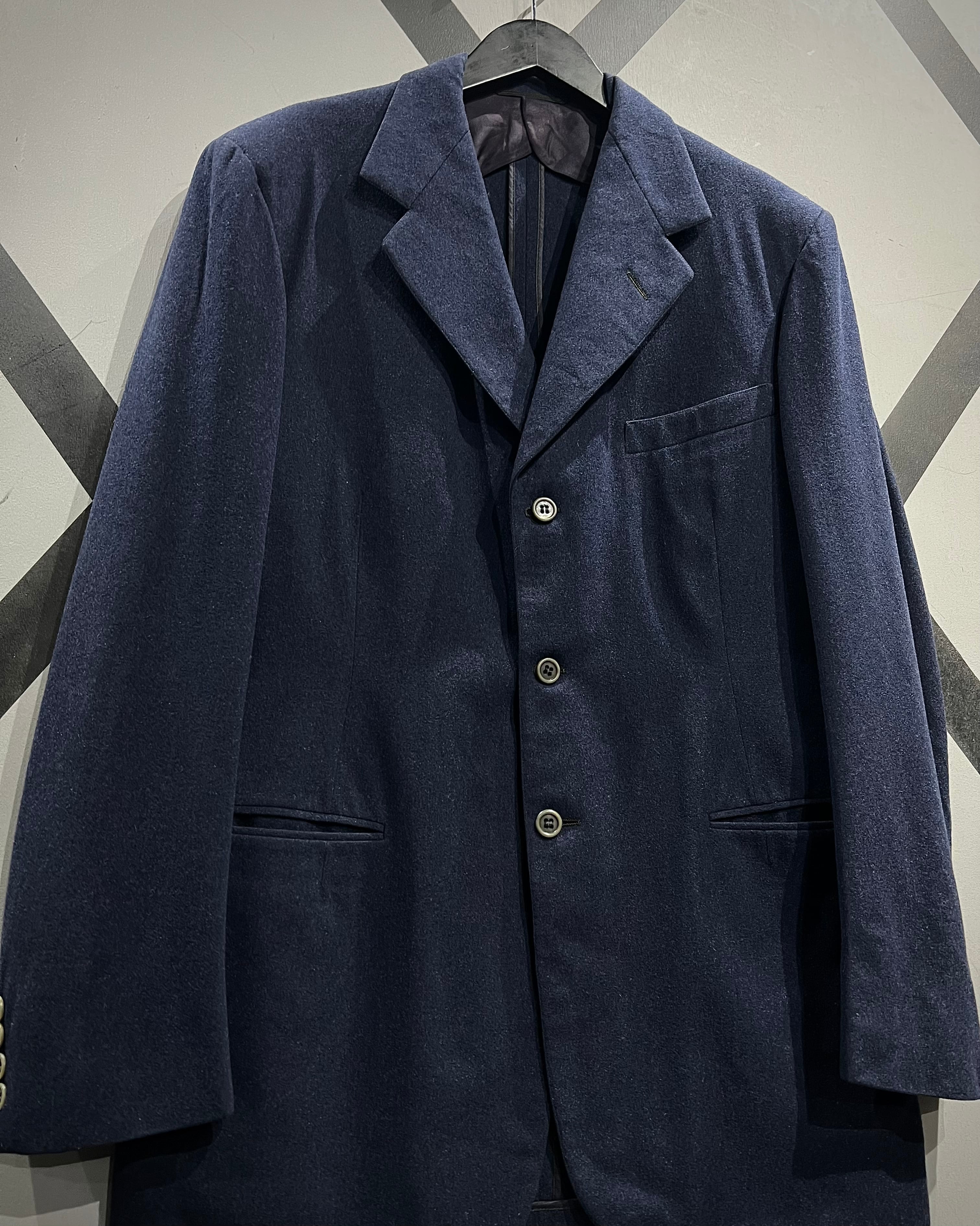 フロントはシンプルな3ボタン仕様、ポケットなど、装飾を抑えたミニマルなディテール。だからこそシルエットと生地の良さが際立ち、時代を超えて通用する完成度の高さを感じさせますね。