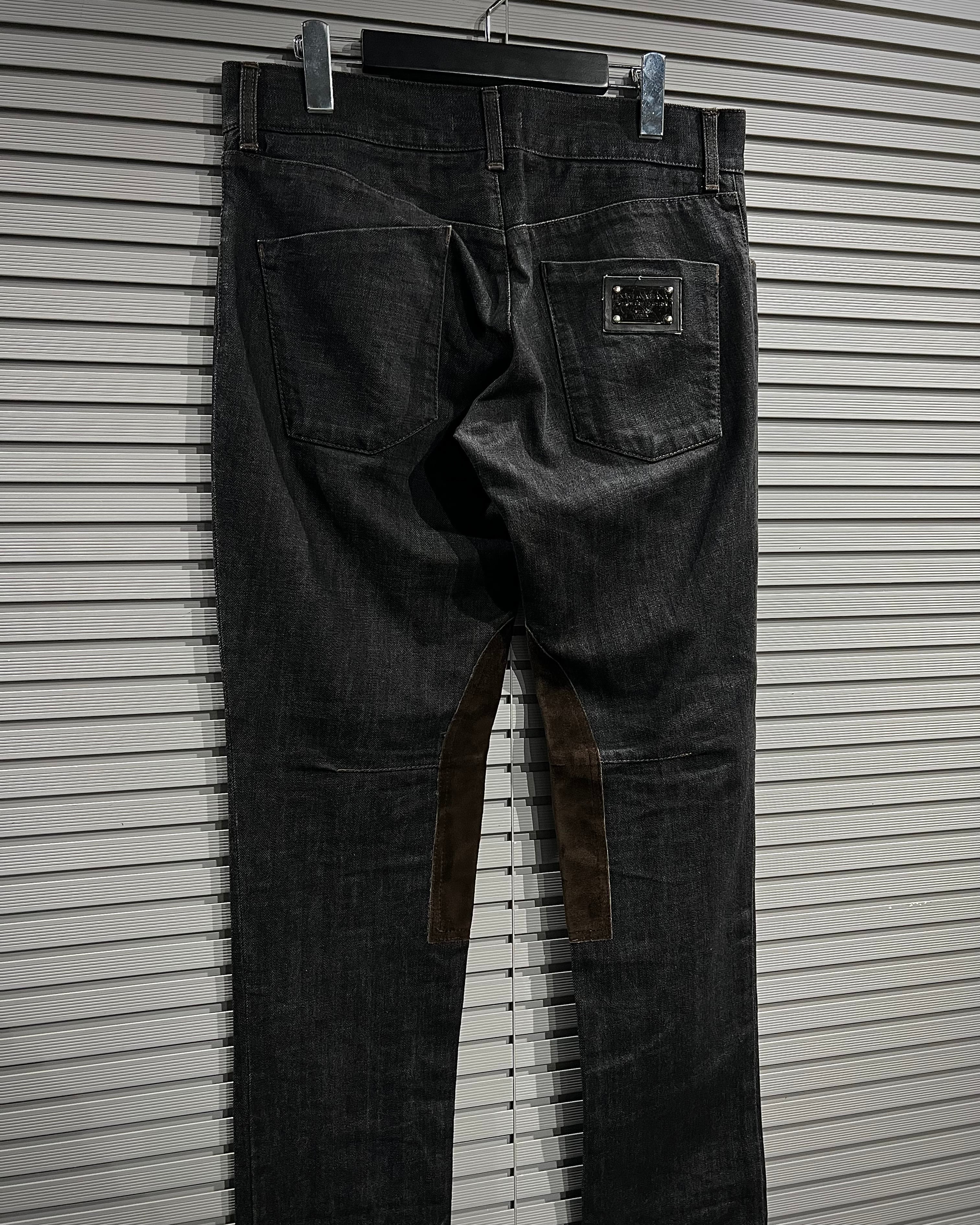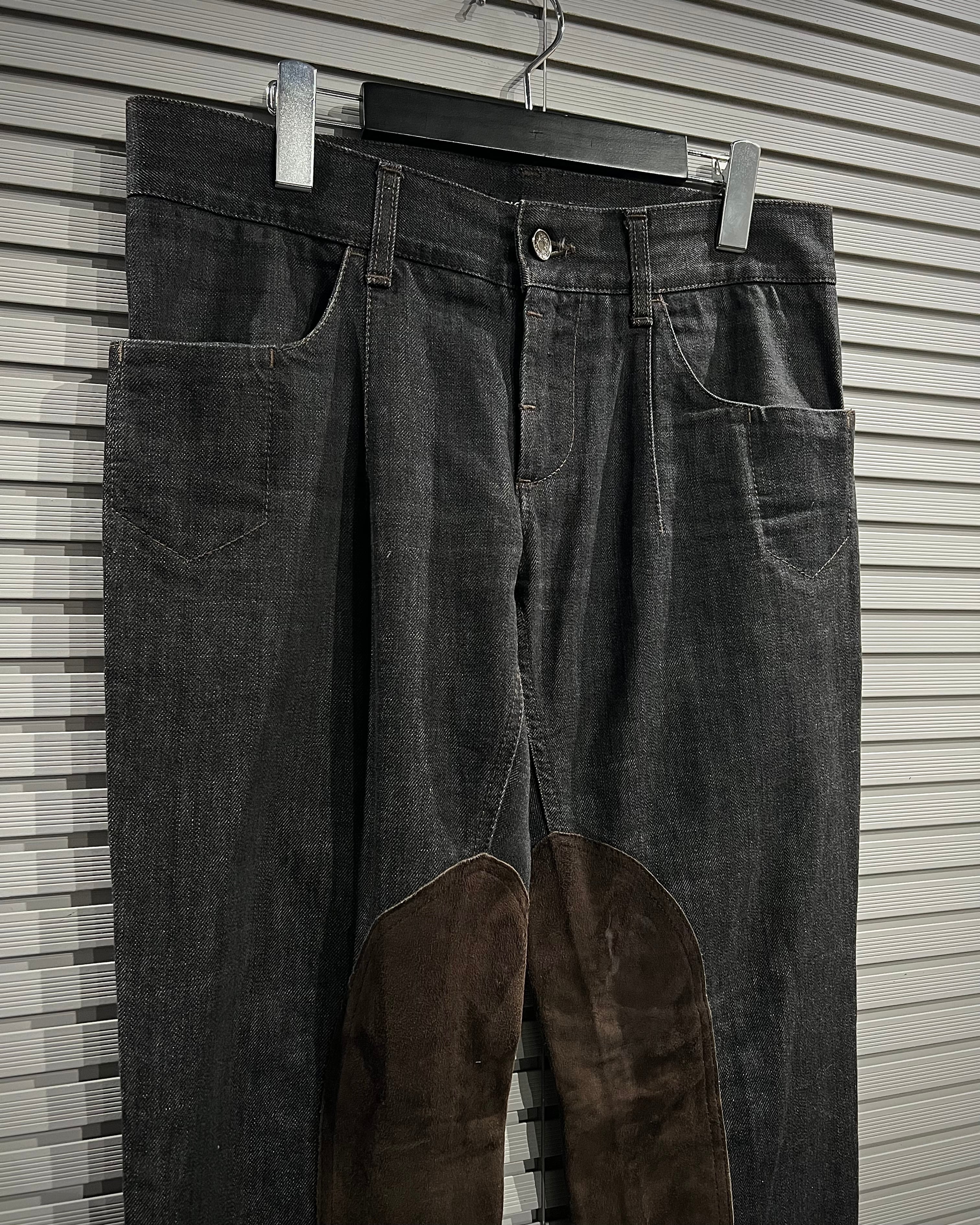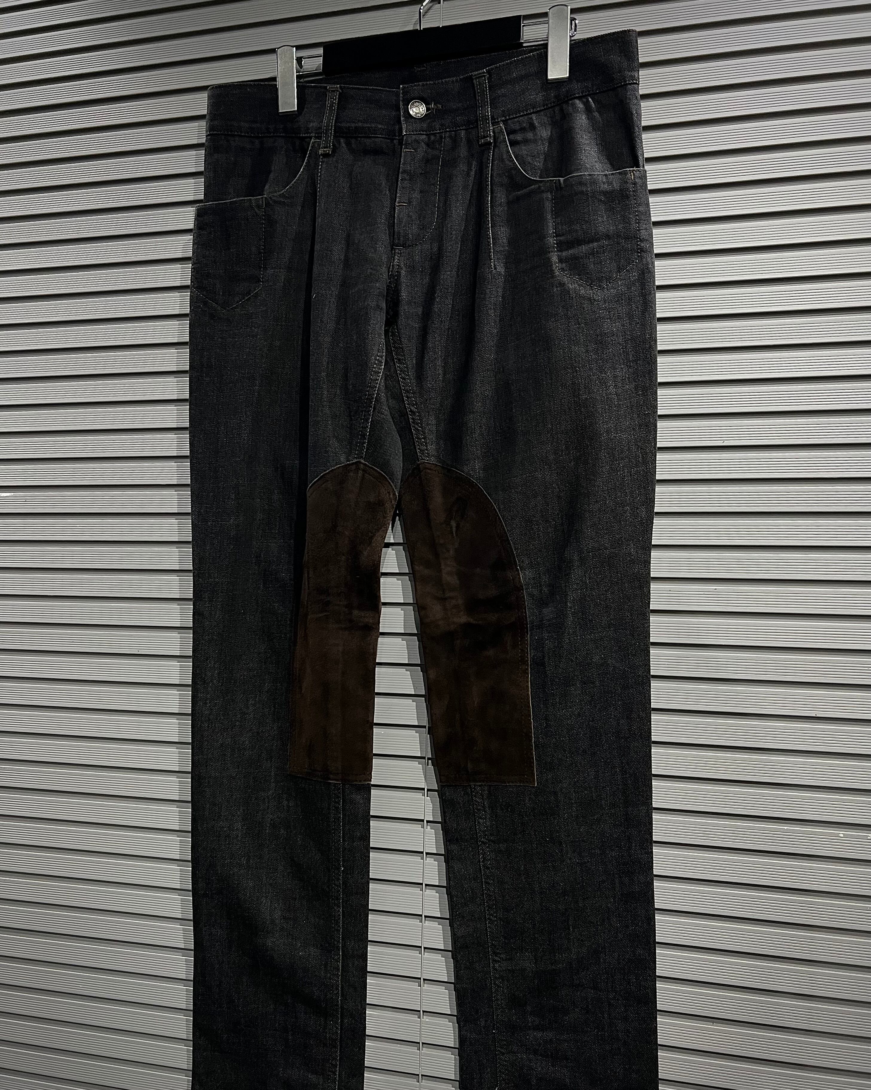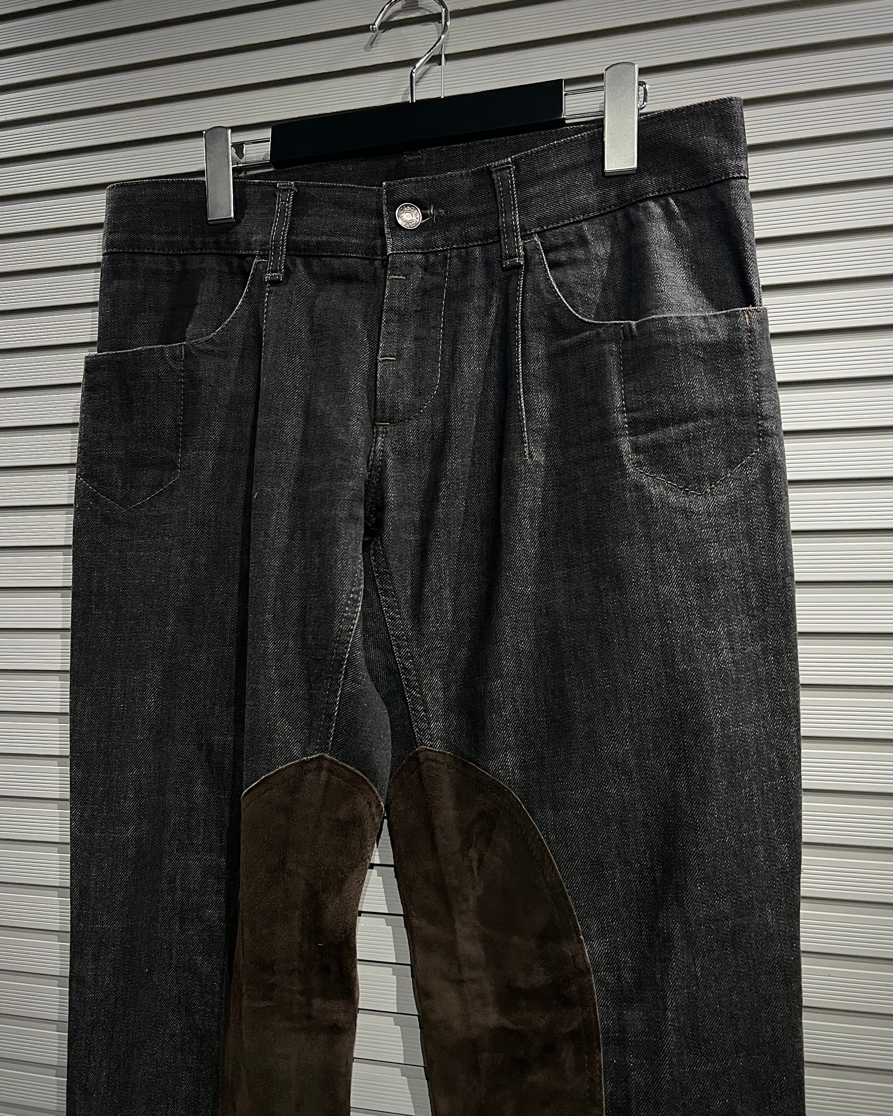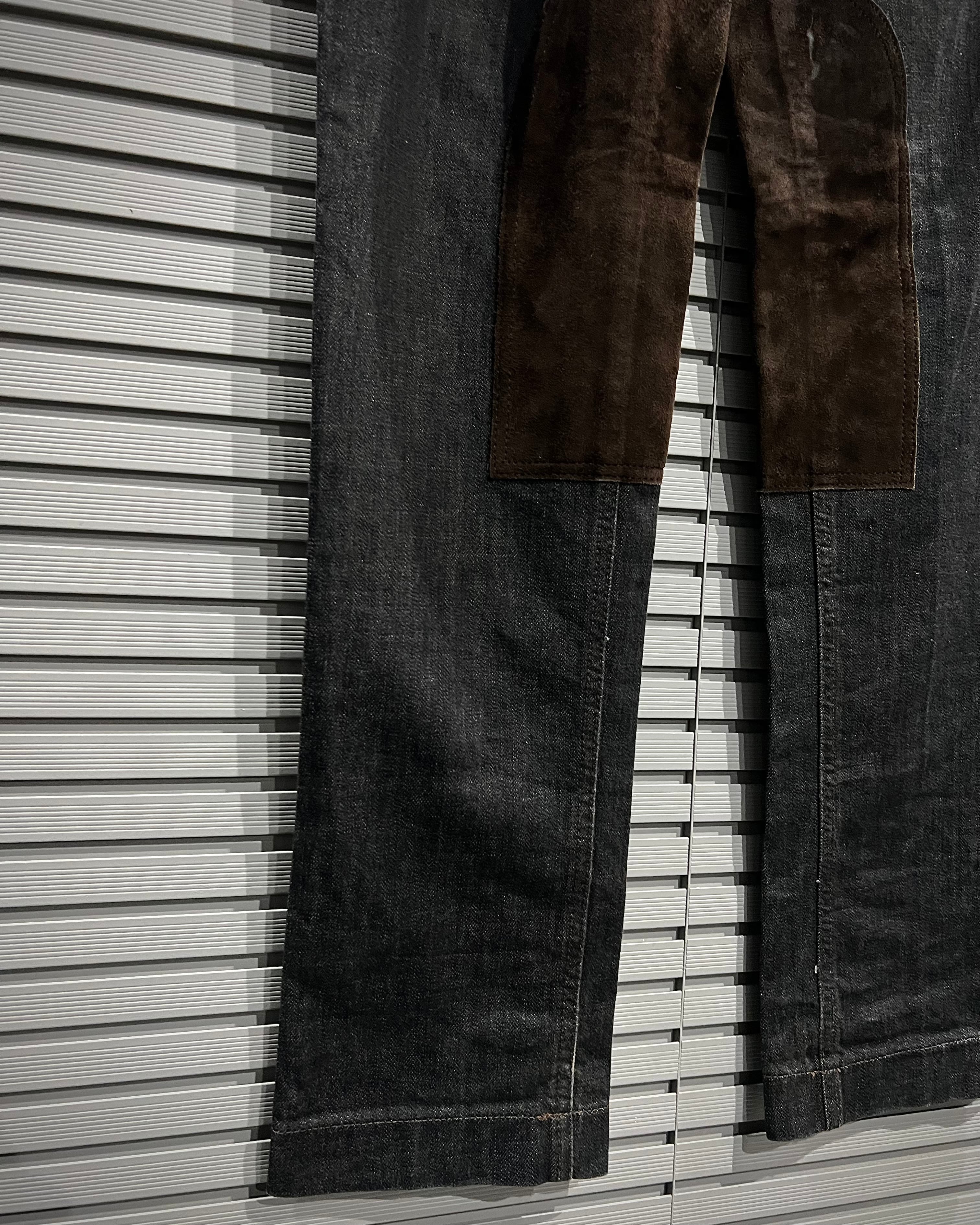 膝部分の内側にブラウンスエードを切り替えた1着。デニム×スエードという異素材のコントラストが非常に映え、シンプルながらも一目で分かるデザイン性を生み出しています。