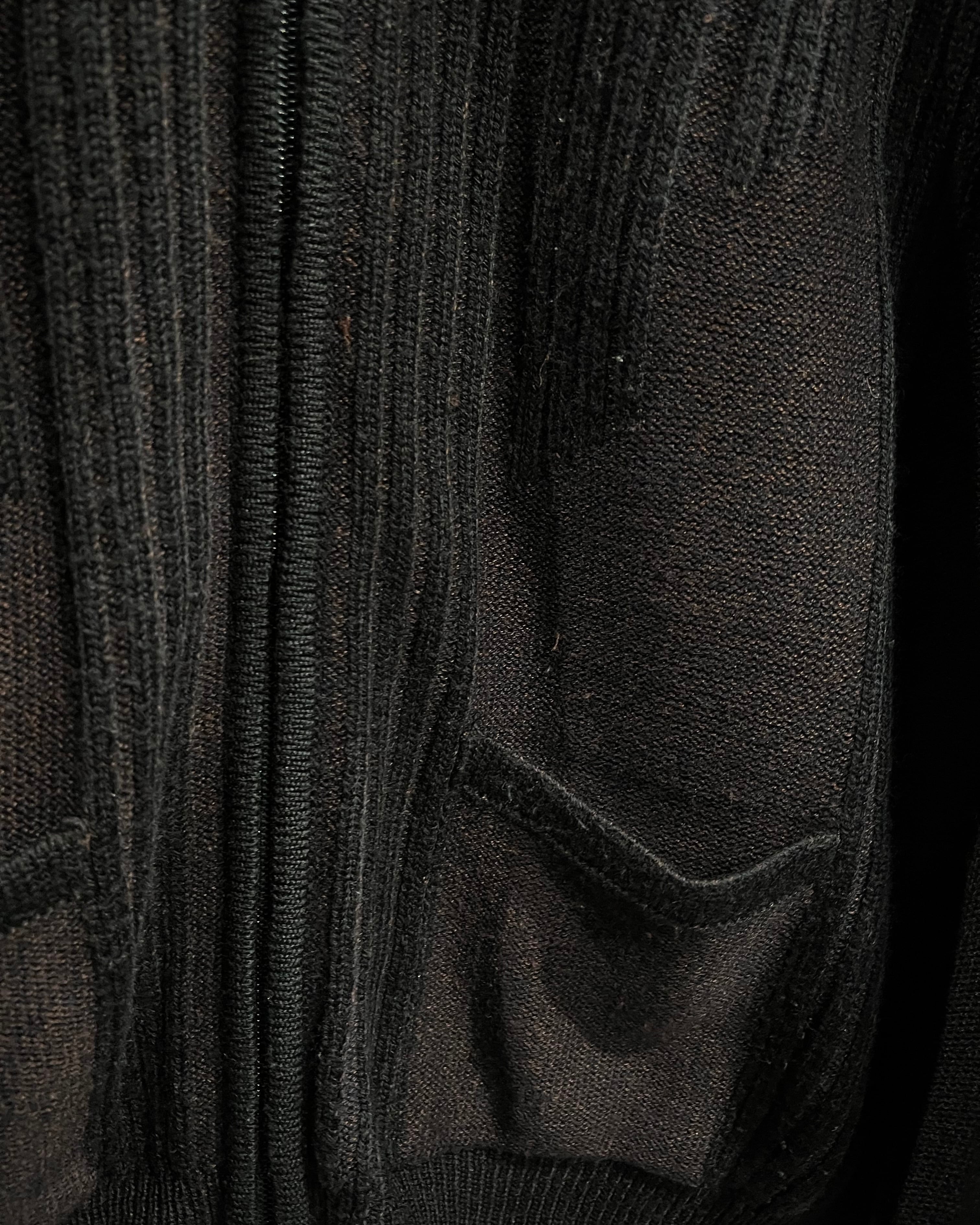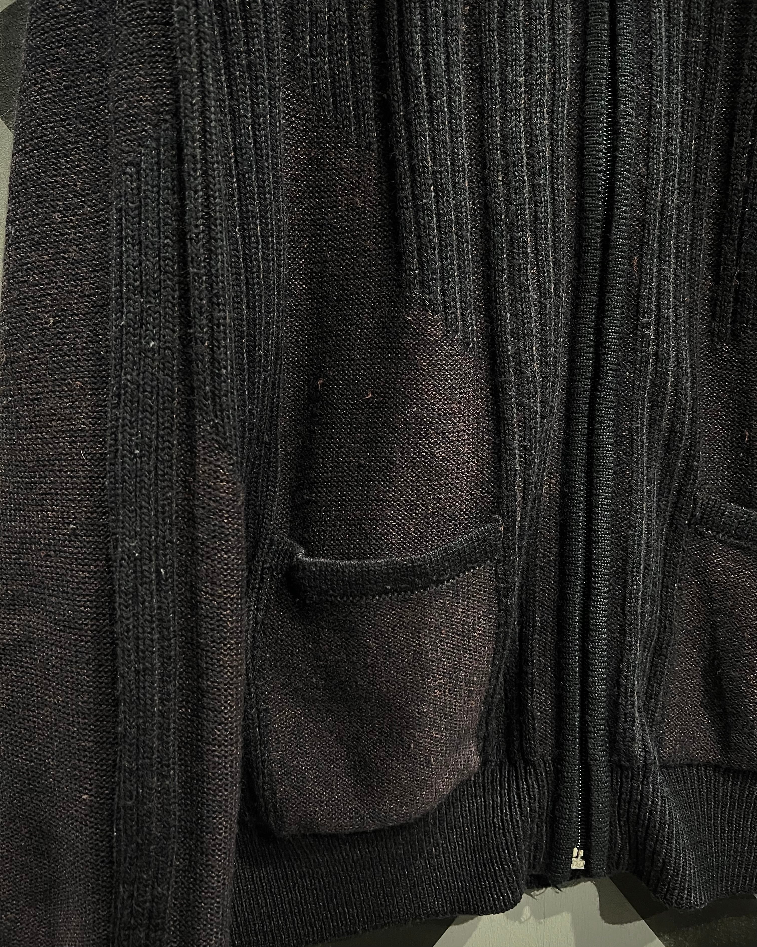フロントはフルジップ仕様。リブ編みを効かせたネックから縦に走る編地の切り替えが立体的で、編みのコントラストで奥行きが生まれている点が秀逸です。