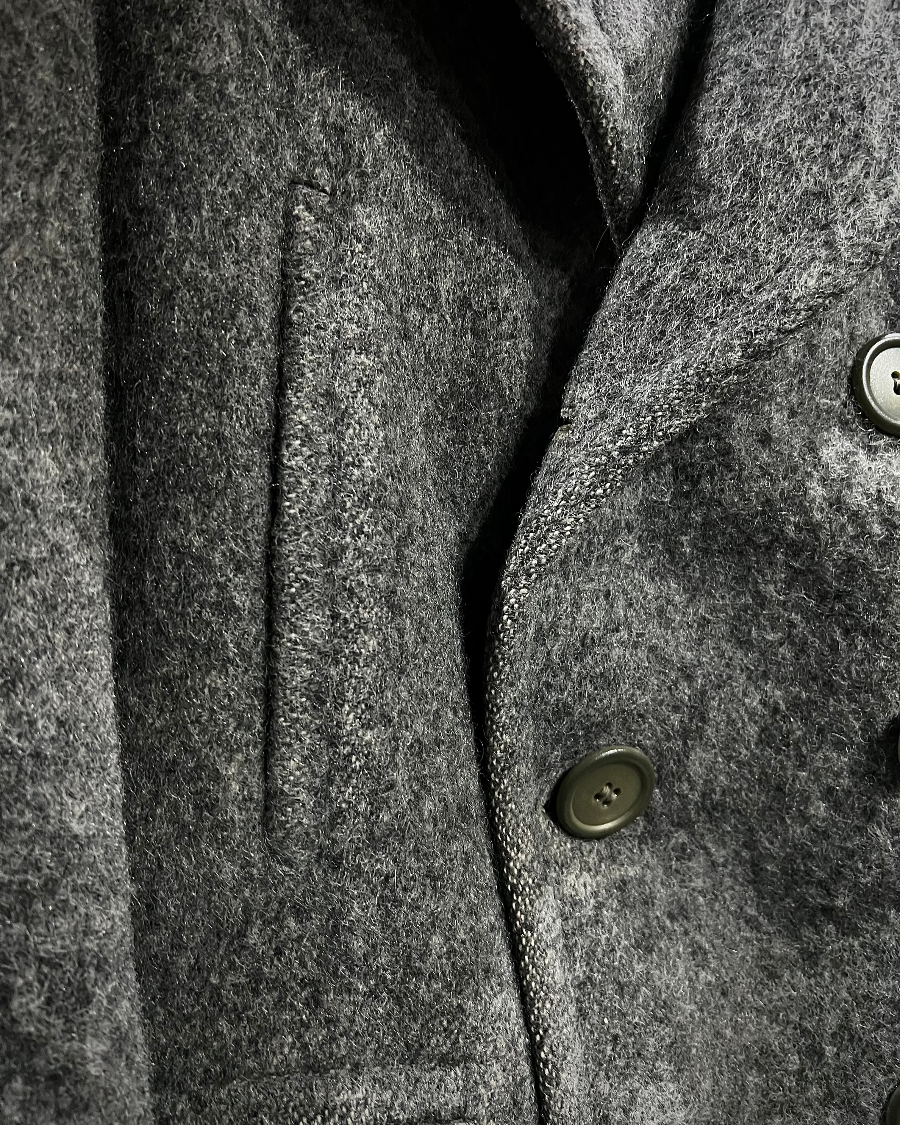 しっかりと縮絨されたウール素材は無骨さと温もりを併せ持つ質感。毛羽立ちのあるファブリックが奥行きのある表情を生み、ヴィンテージならではの存在感を放ちます。