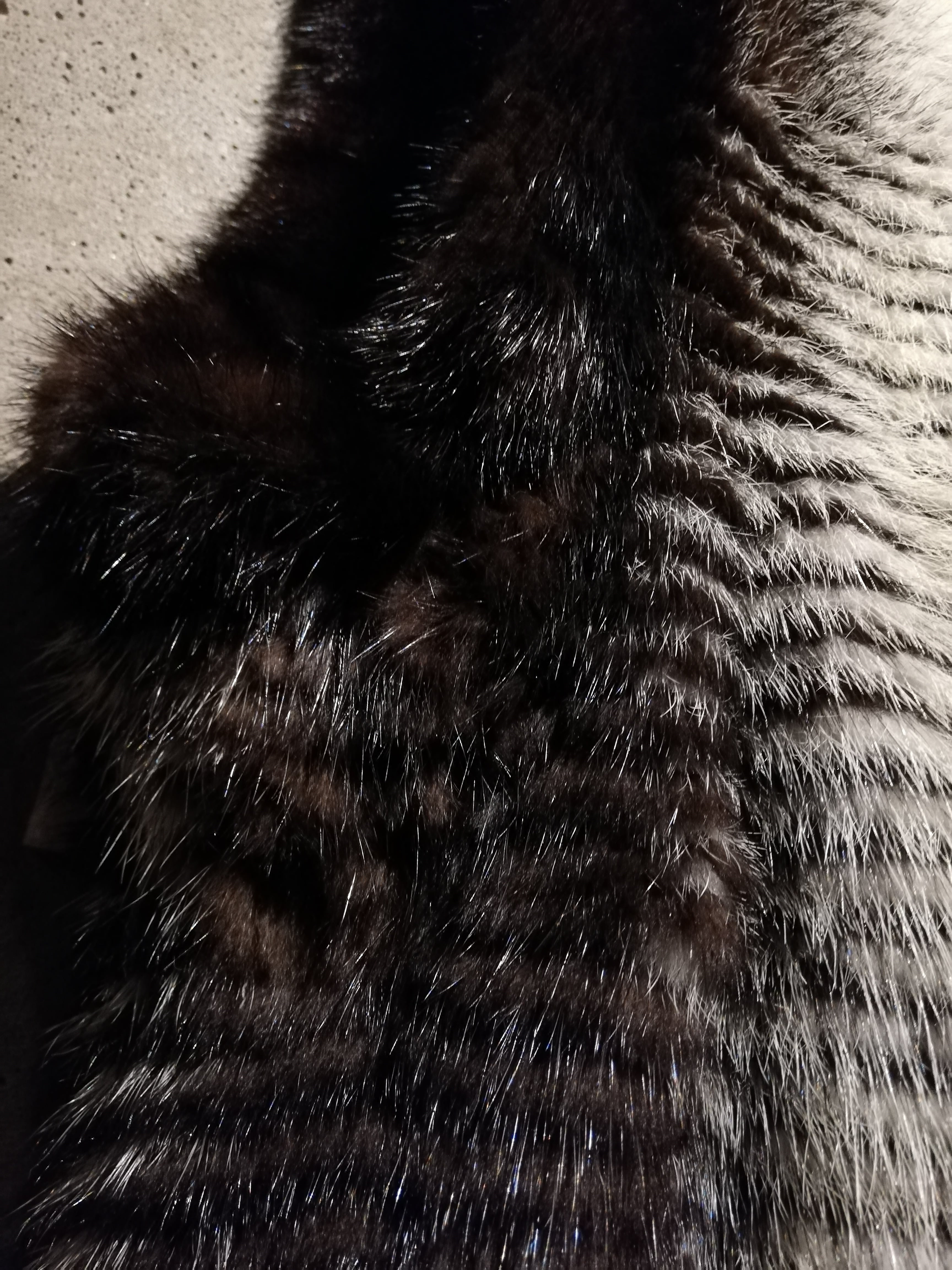 ダークブラウンからアイボリーへと美しく移ろうグラデーションが印象的なボディは、リアルファーならではの奥行きと立体感を演出。一本一本異なる毛流れが生み出す表情は非常に豊かで、艶やかさと密度を兼ね備えたファーが、ヴィンテージならではの存在感を放ちます。