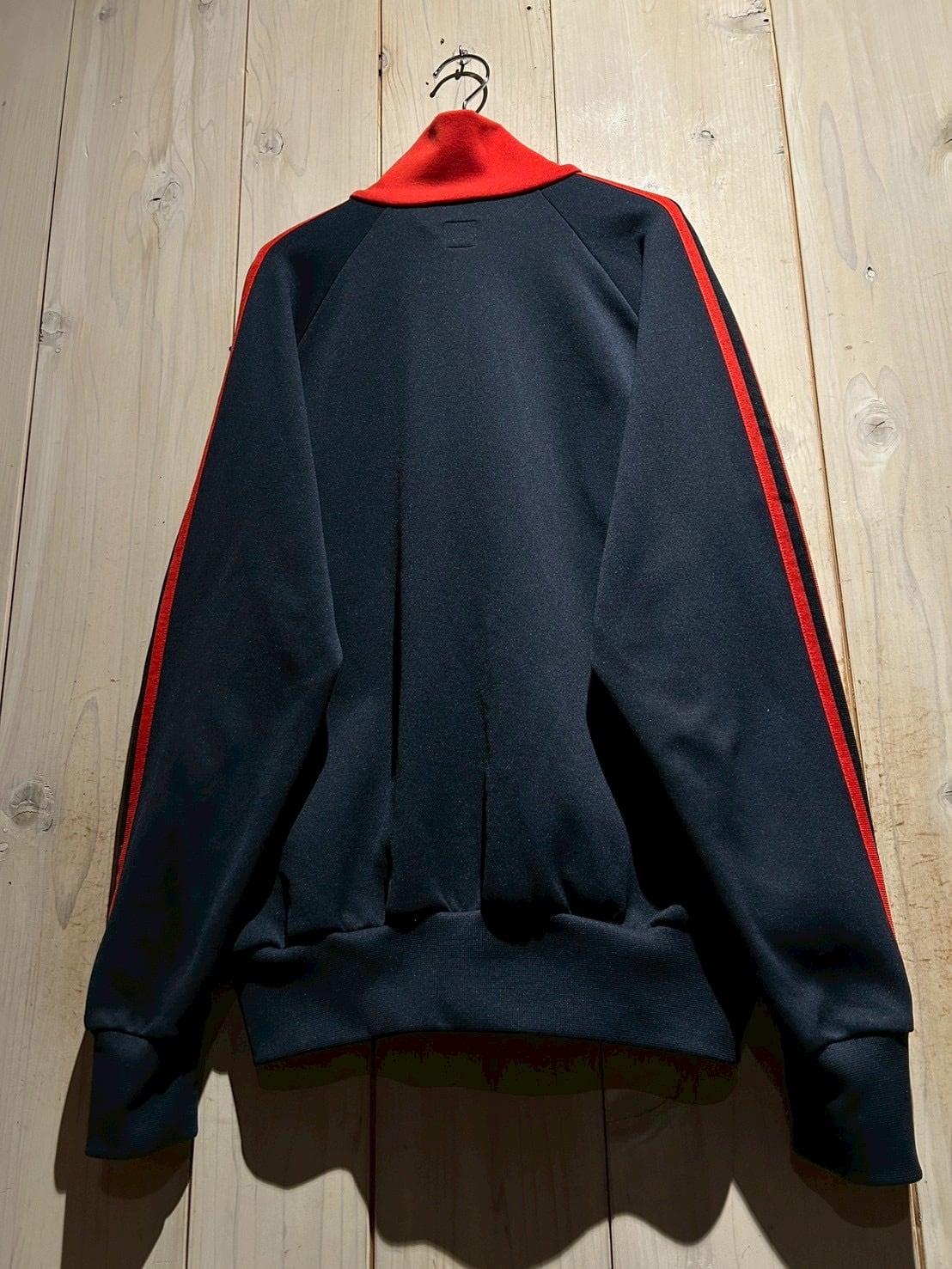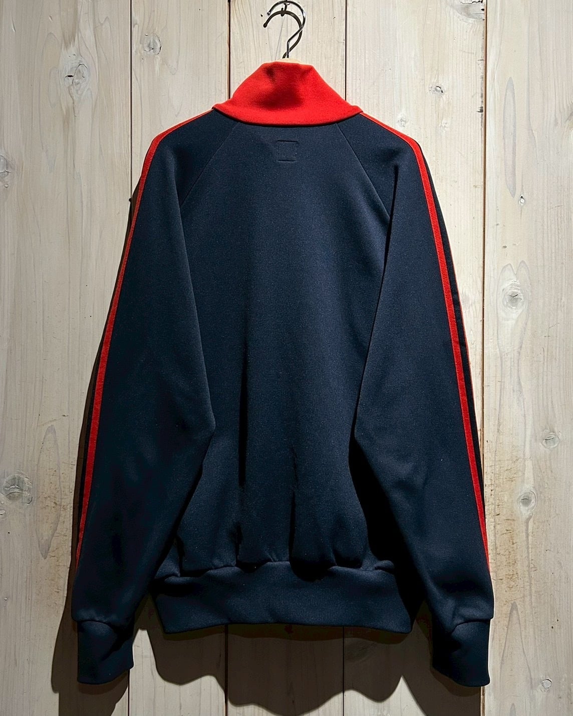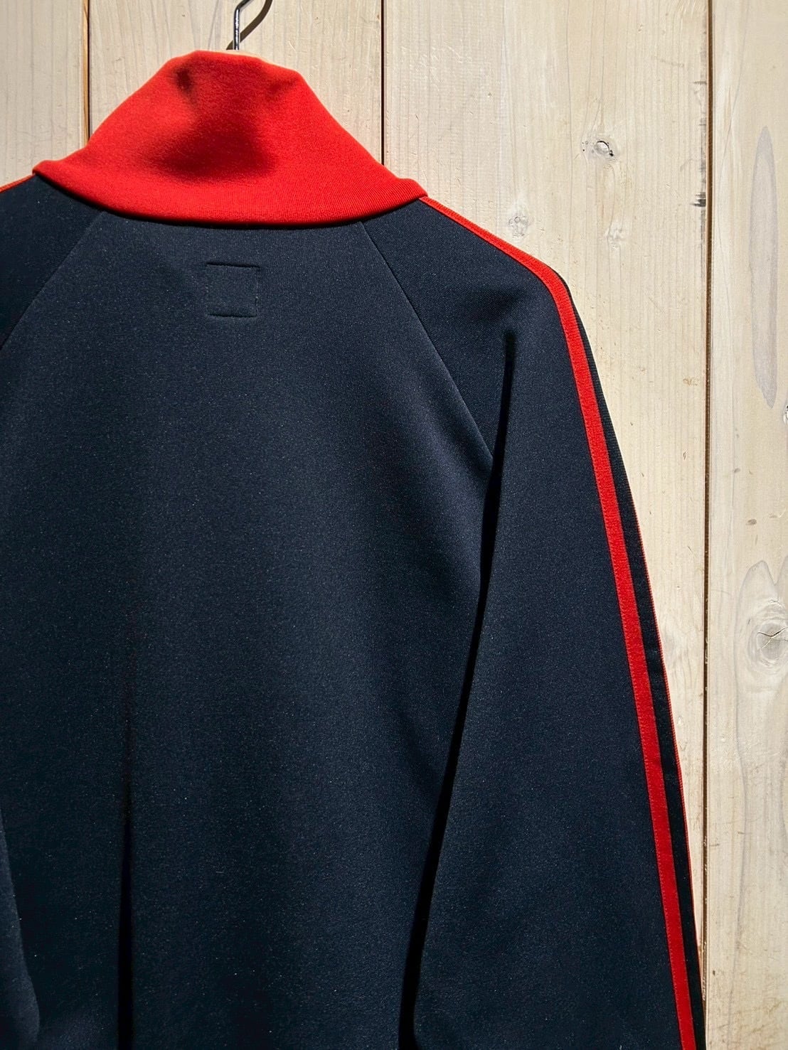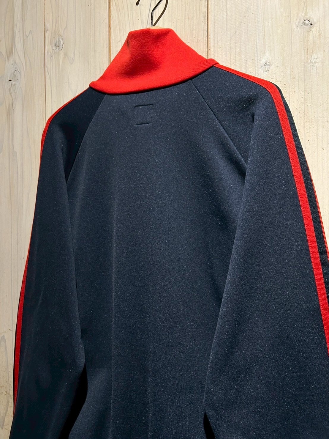 ネイビーボディをベースに、ネック、3ストライプス、ロゴに効かせた赤が映える、コントラストの効いた配色が洒落た1着。