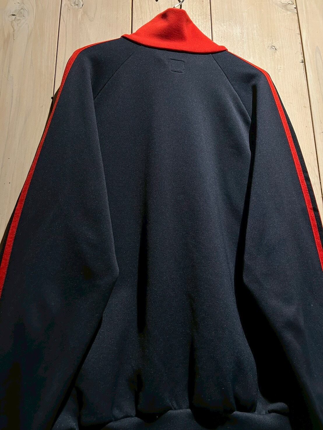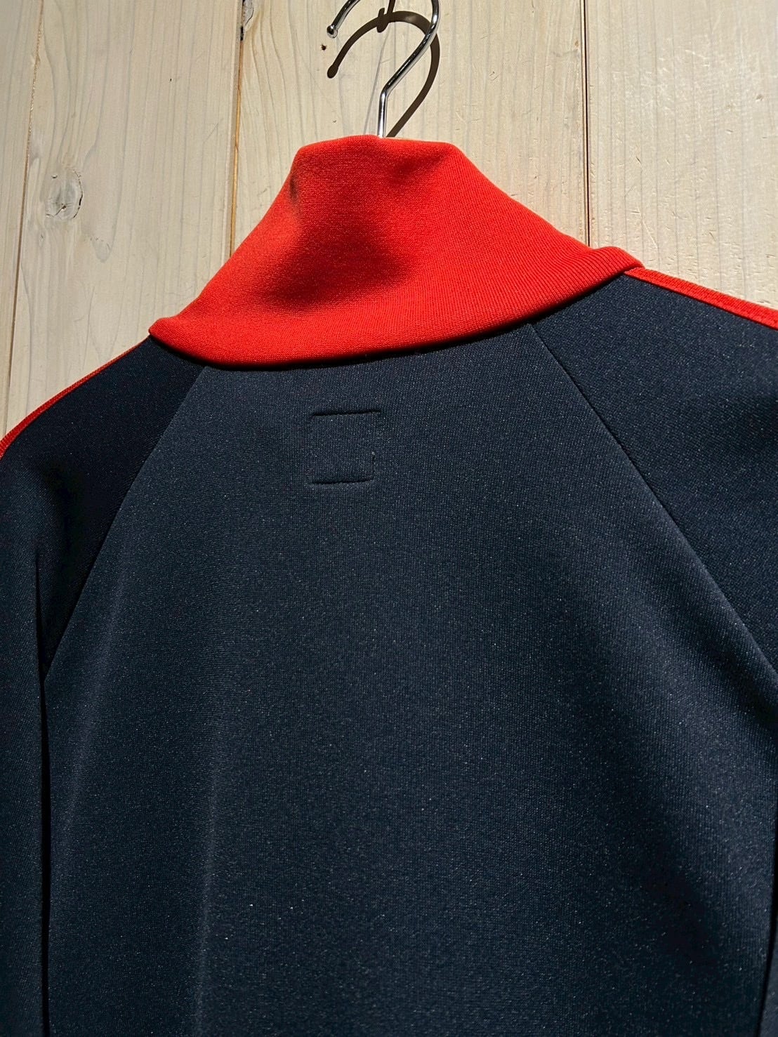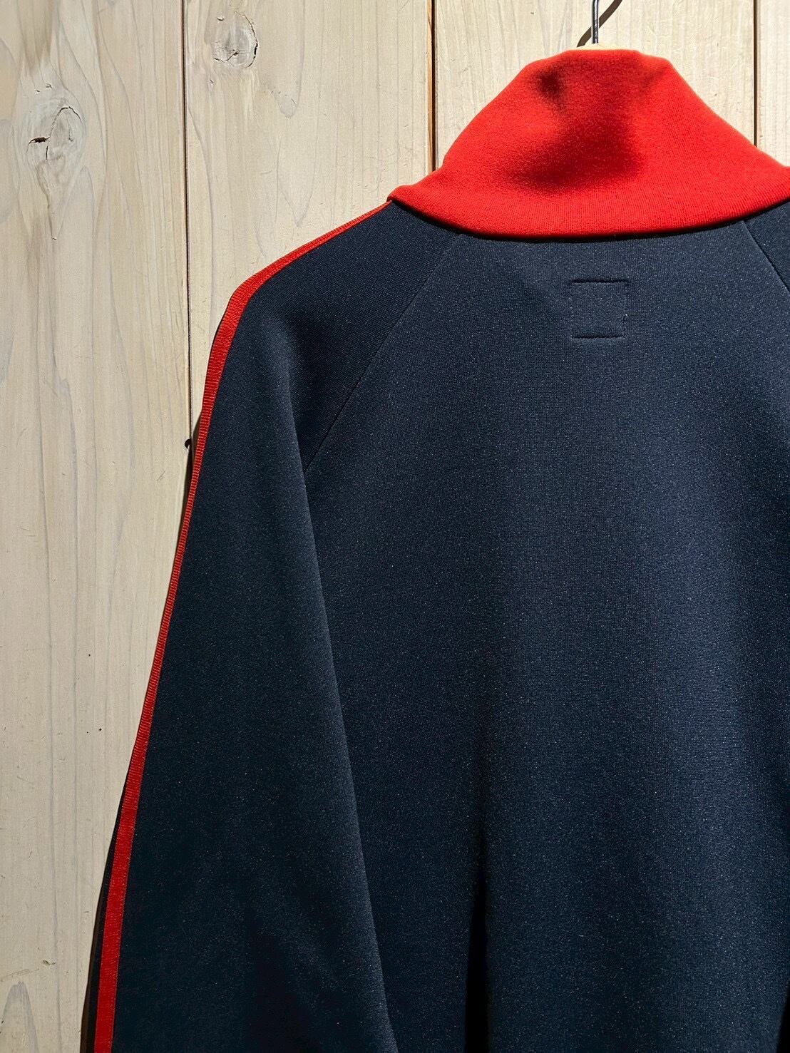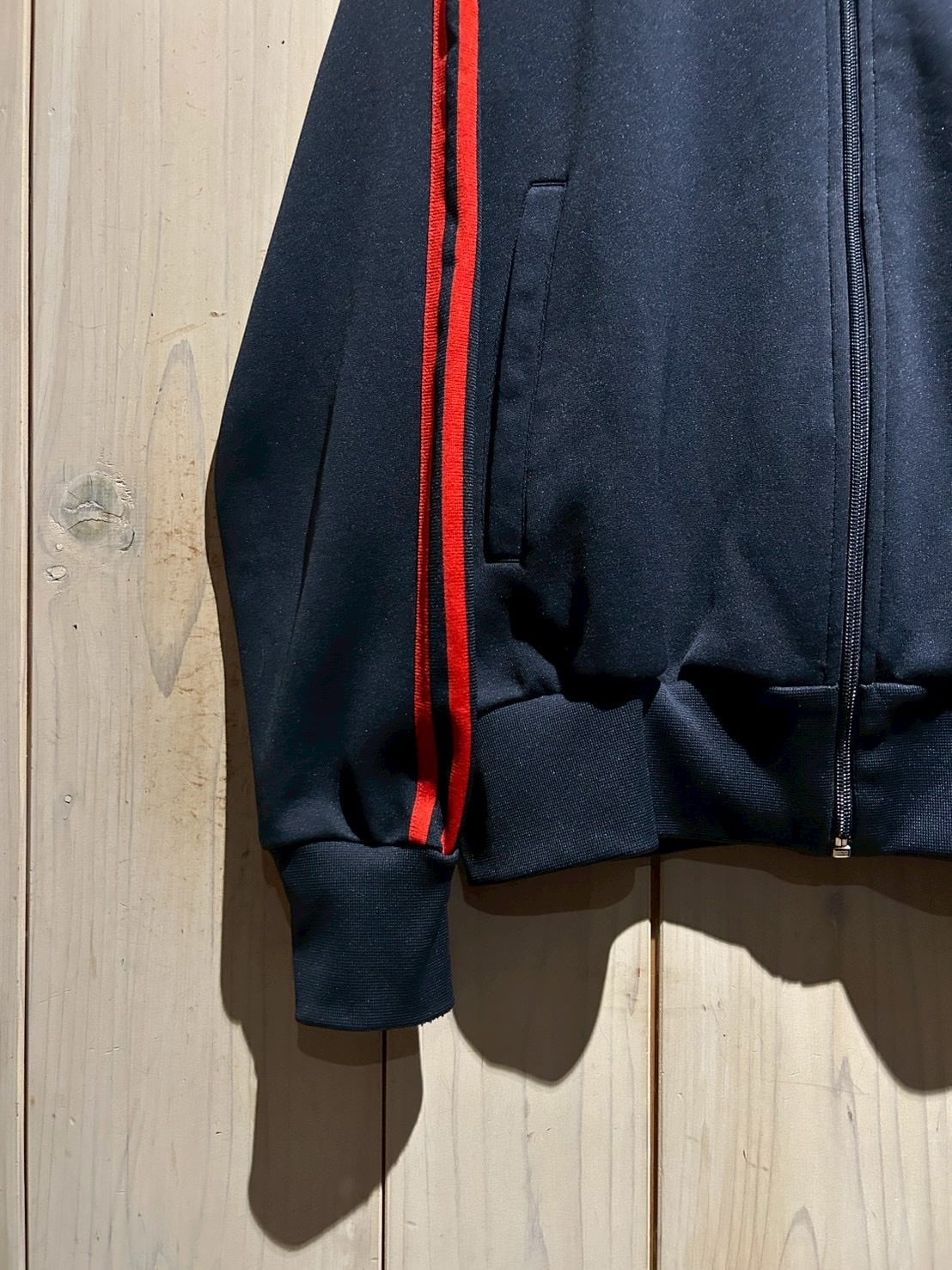 ネイビーボディをベースに、ネック、3ストライプス、ロゴに効かせた赤が映える、コントラストの効いた配色が洒落た1着。