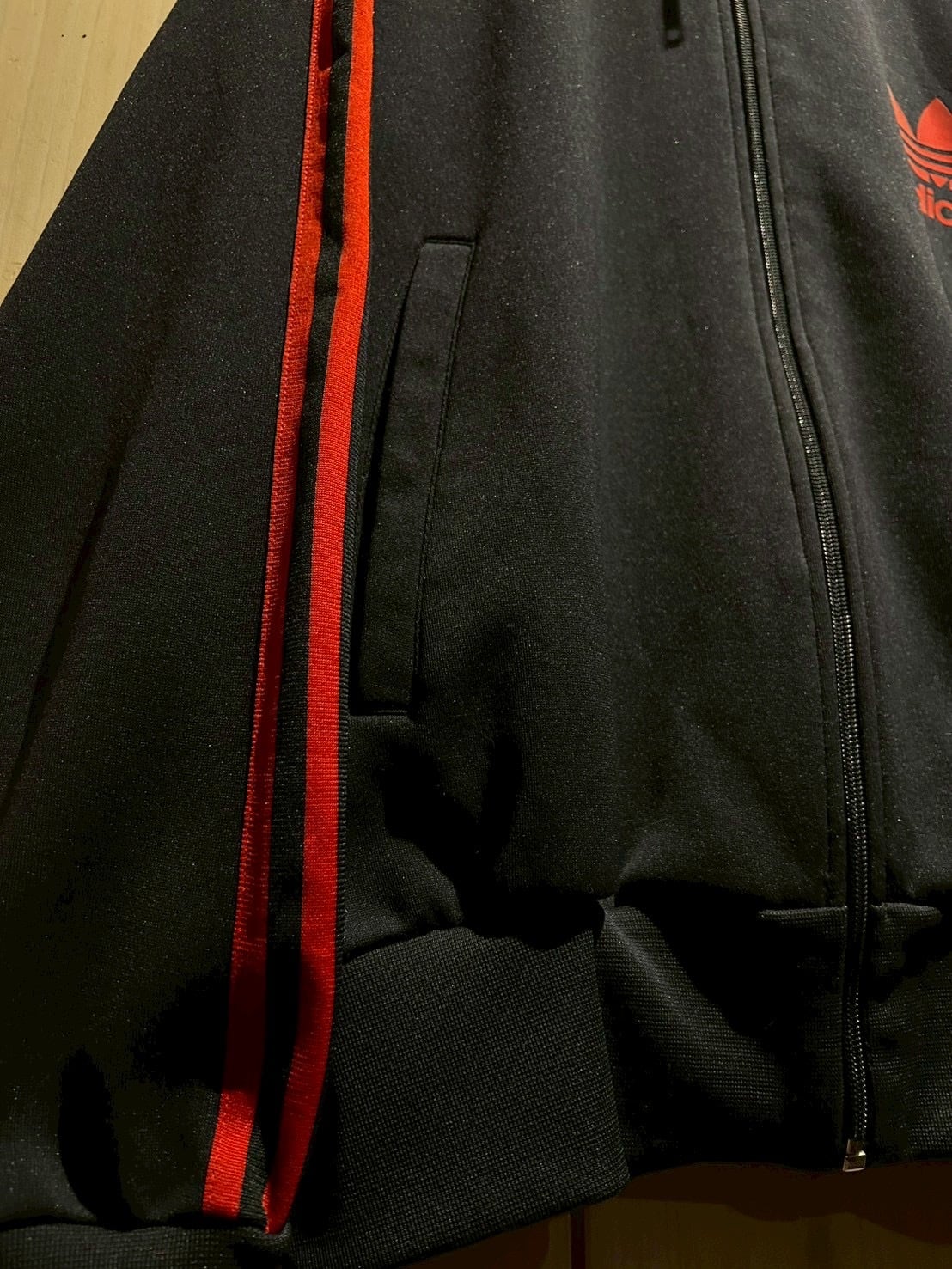 胸元にはアイコニックなトレフォイルロゴを配置。アームにはadidasを象徴するスリーストライプスが走り、ジップアップ仕様やポケット配置など、シンプルながらも完成されたディテールが光ります。