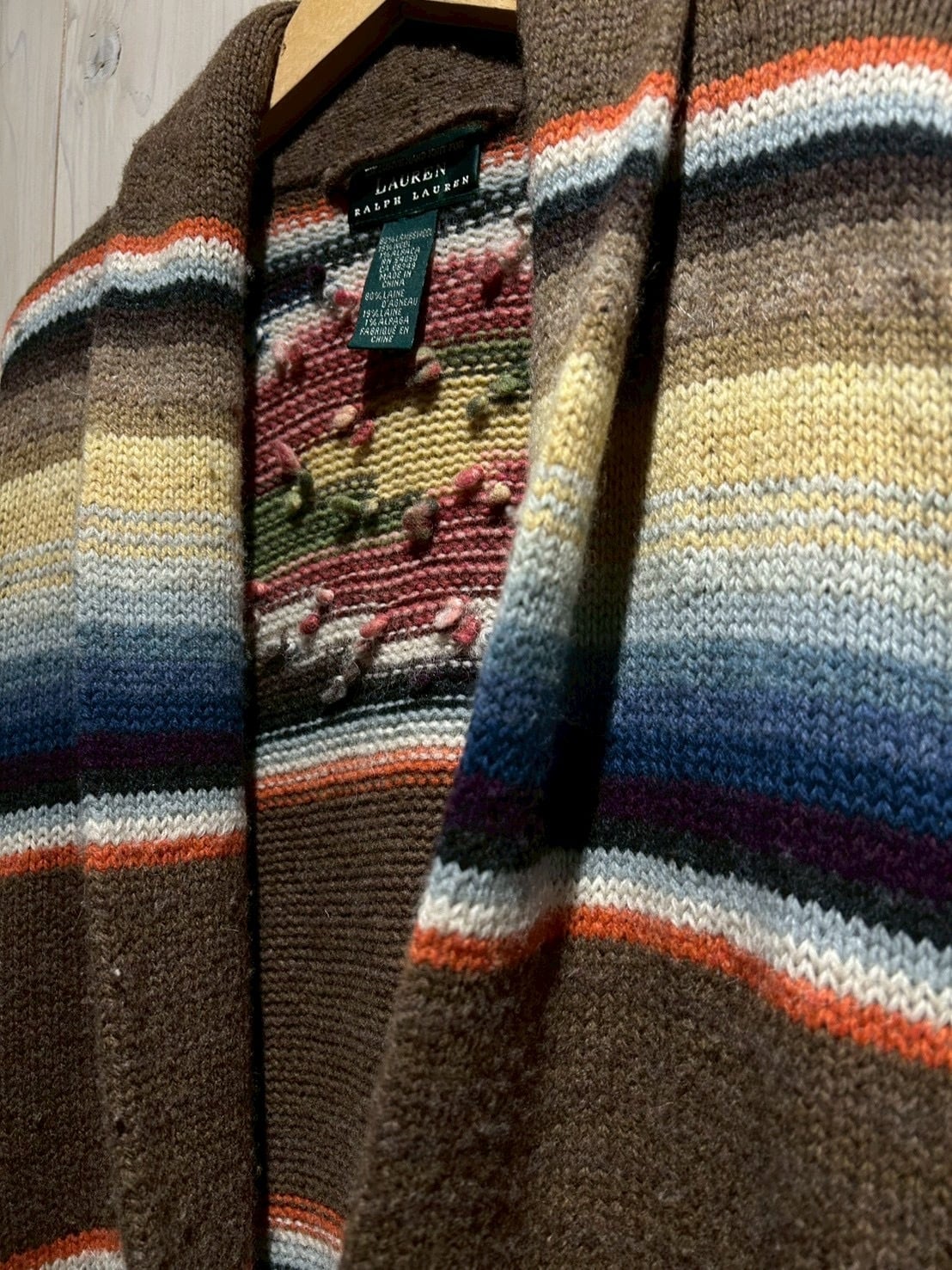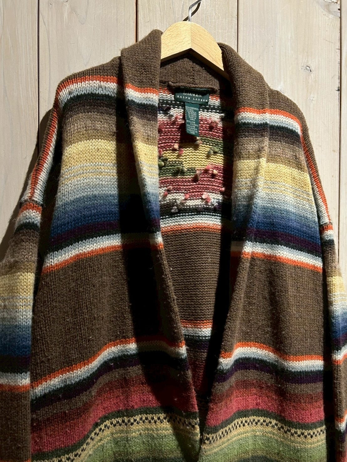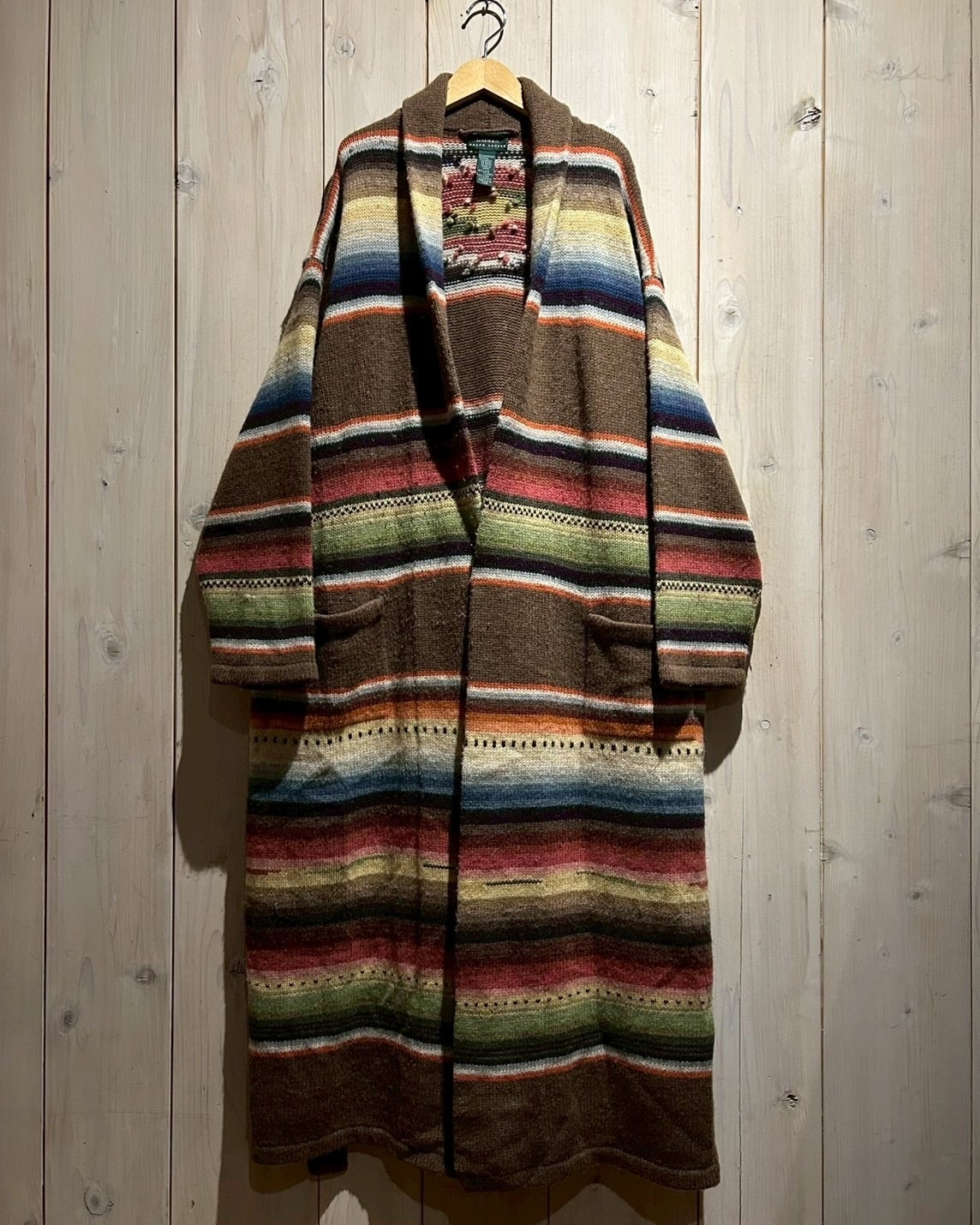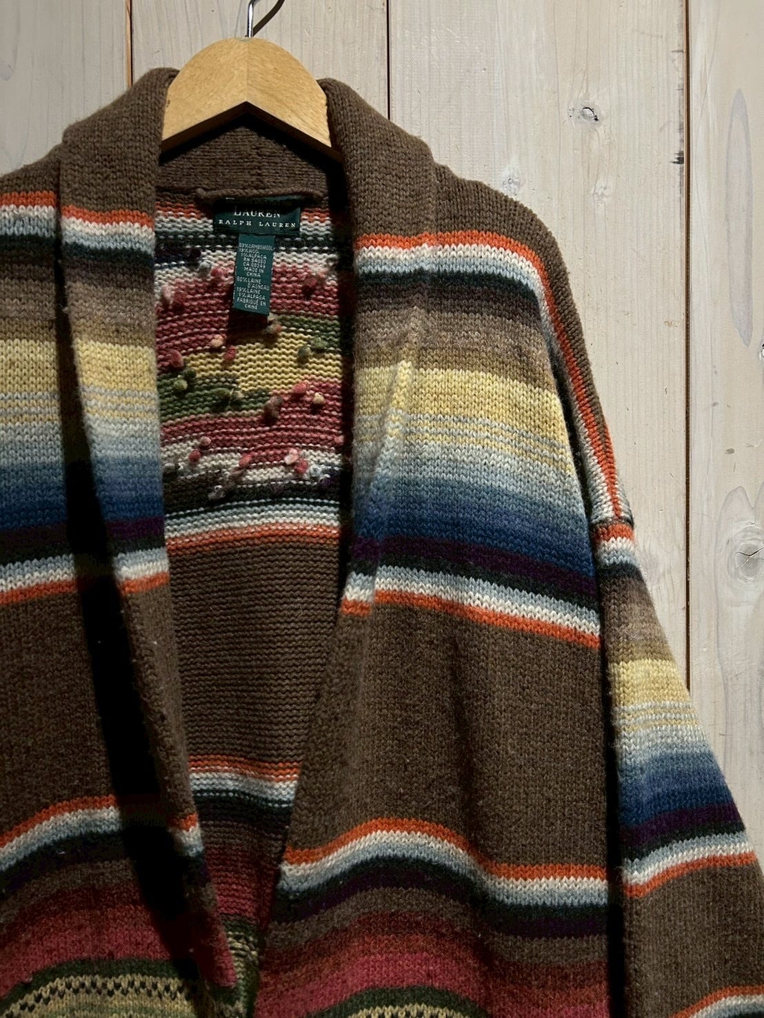 ローゲージで編み上げられた肉厚なハンドニットボディは、ブラウンを基調にレッド、グリーン、ブルー、イエローといった多色使いのボーダーが走り、ネイティブ調のムードとLAURENらしい品の良さが合わさった仕上がり。ハンドニット特有の温かみが、奥行きのある表情を生み出しています。