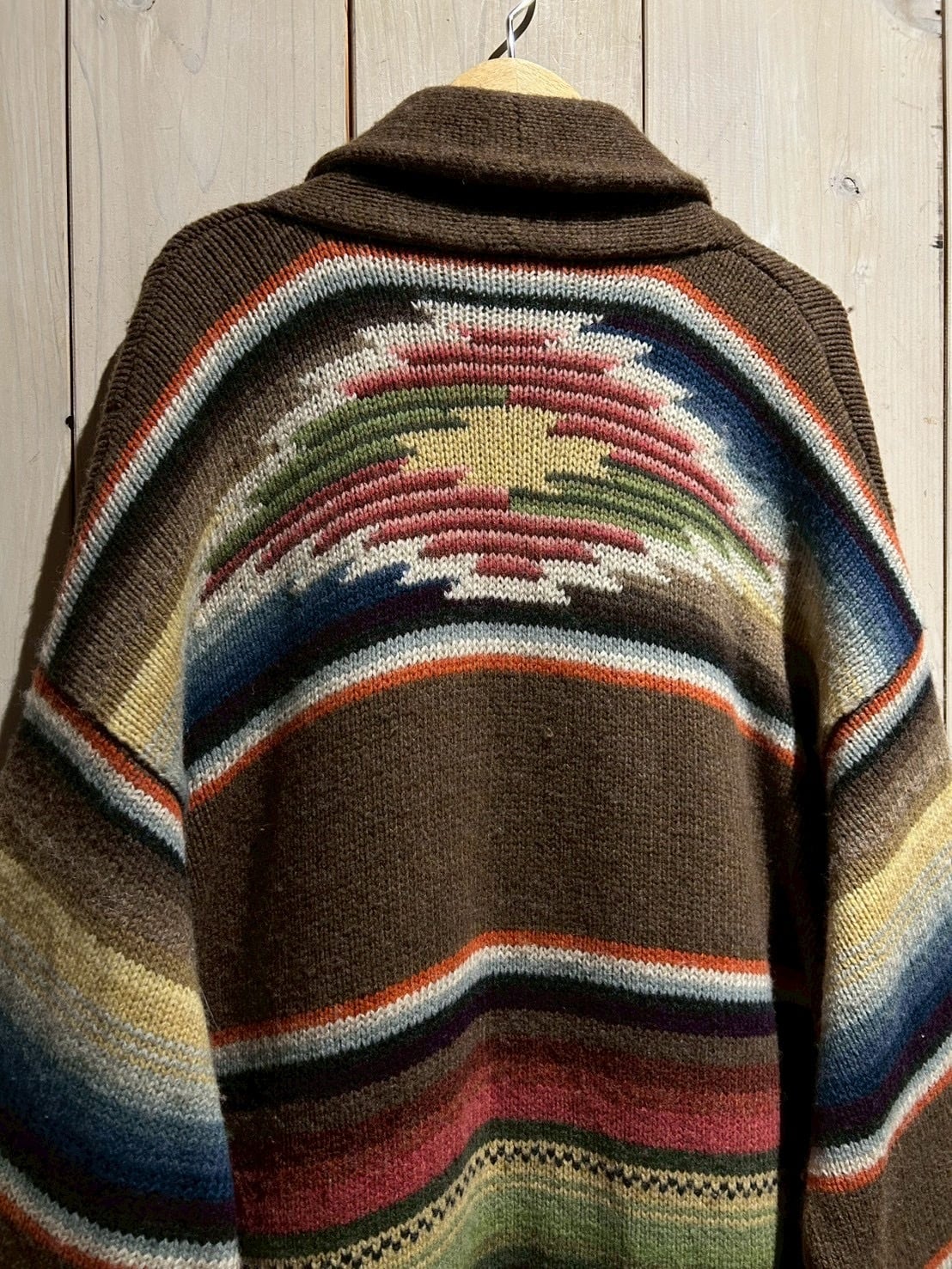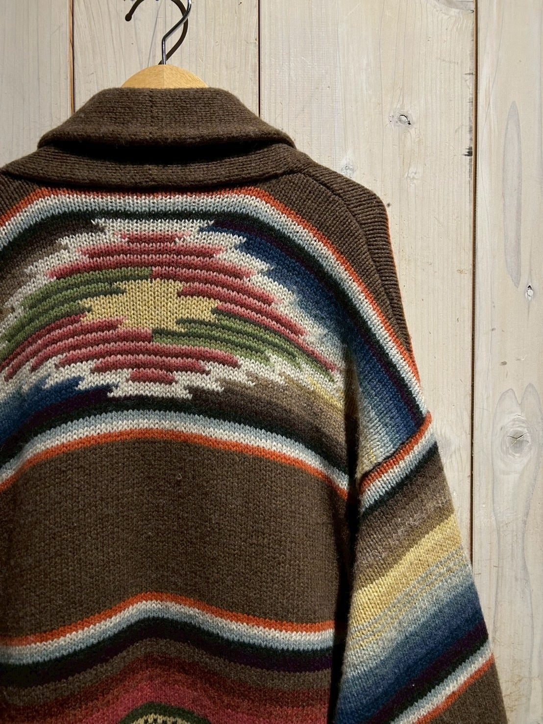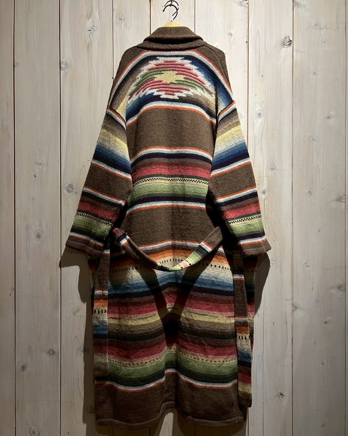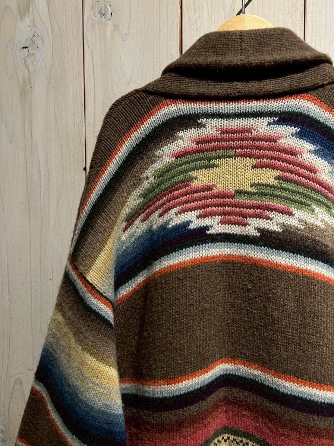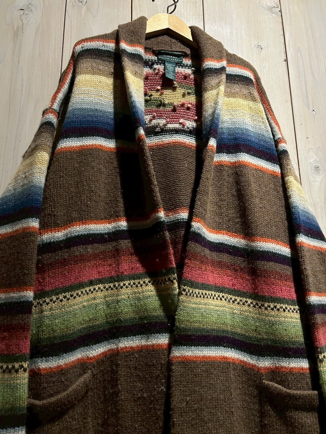 ローゲージで編み上げられた肉厚なハンドニットボディは、ブラウンを基調にレッド、グリーン、ブルー、イエローといった多色使いのボーダーが走り、ネイティブ調のムードとLAURENらしい品の良さが合わさった仕上がり。ハンドニット特有の温かみが、奥行きのある表情を生み出しています。