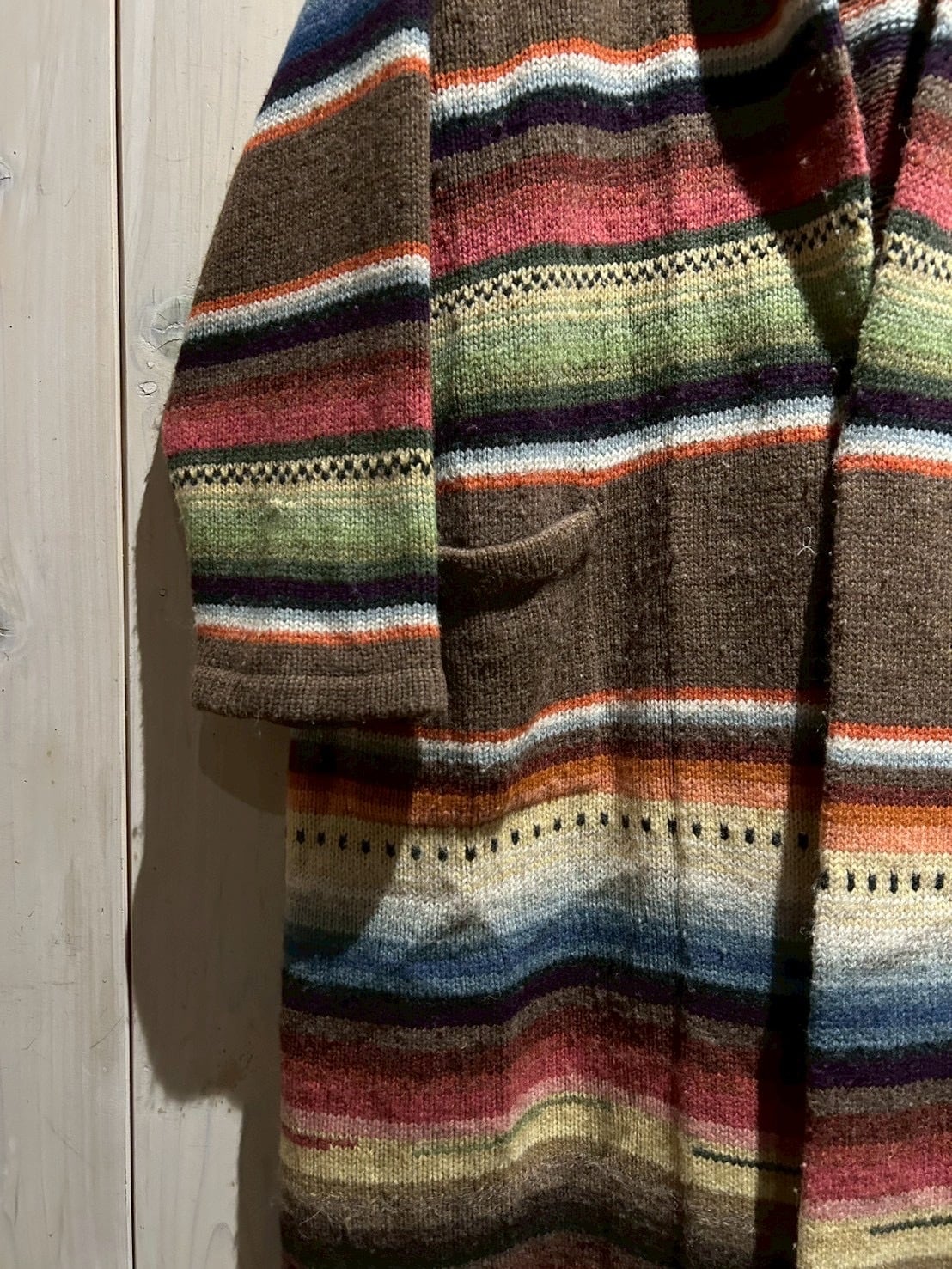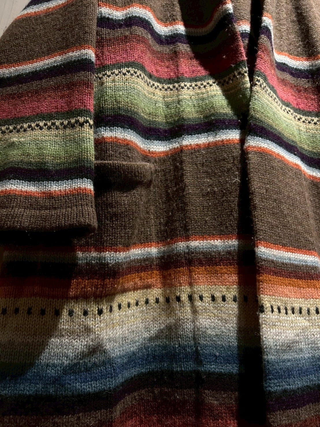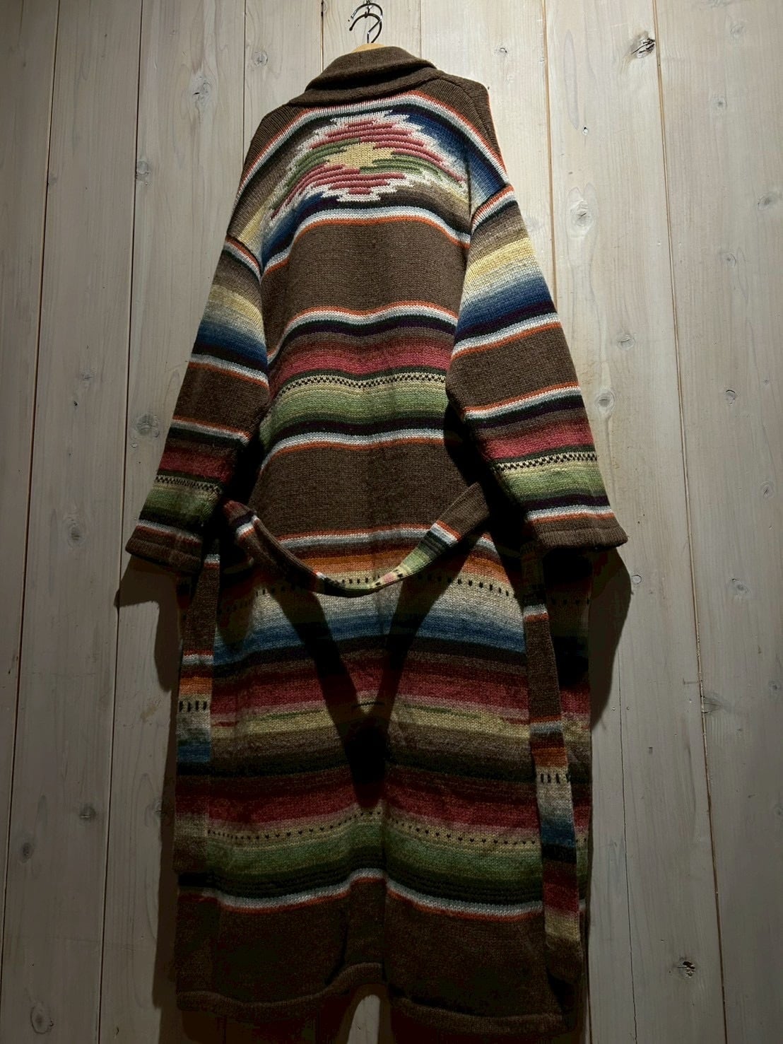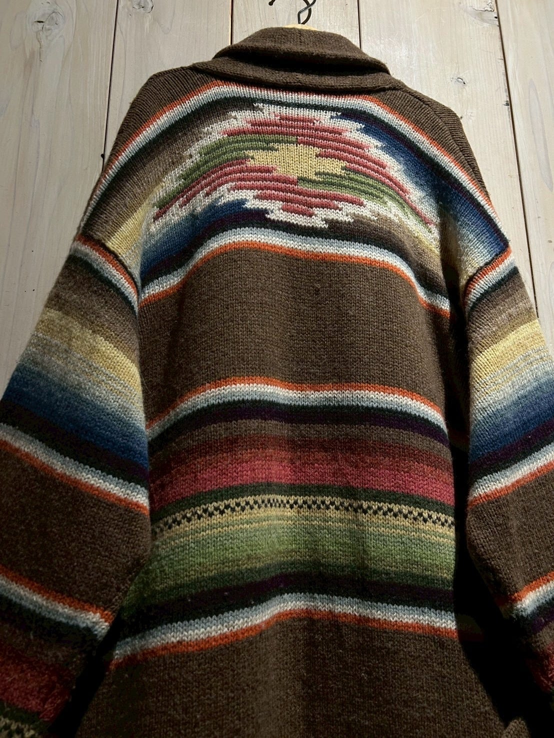 ローゲージで編み上げられた肉厚なハンドニットボディは、ブラウンを基調にレッド、グリーン、ブルー、イエローといった多色使いのボーダーが走り、ネイティブ調のムードとLAURENらしい品の良さが合わさった仕上がり。ハンドニット特有の温かみが、奥行きのある表情を生み出しています。