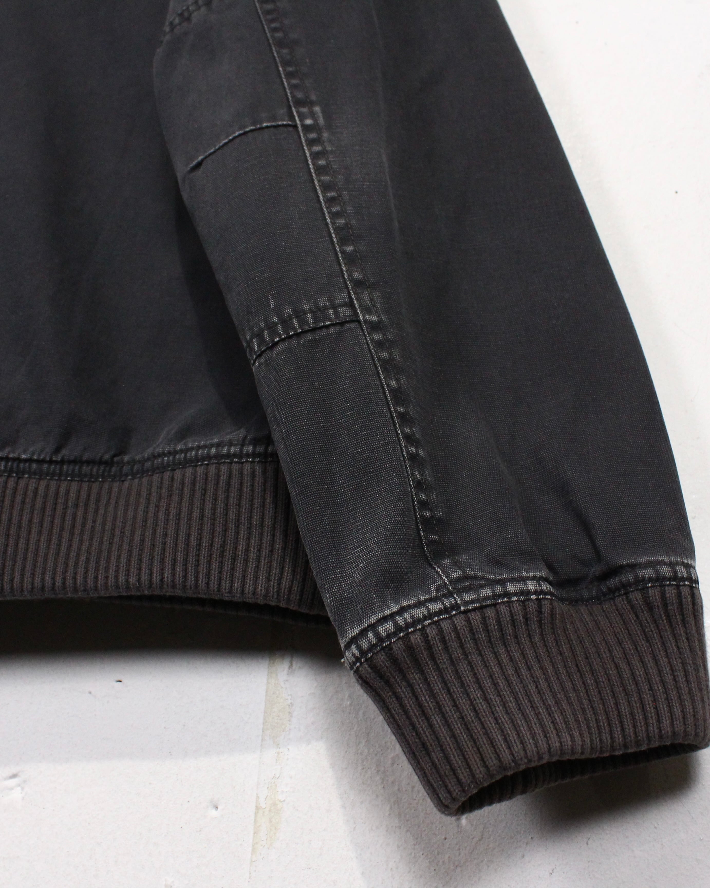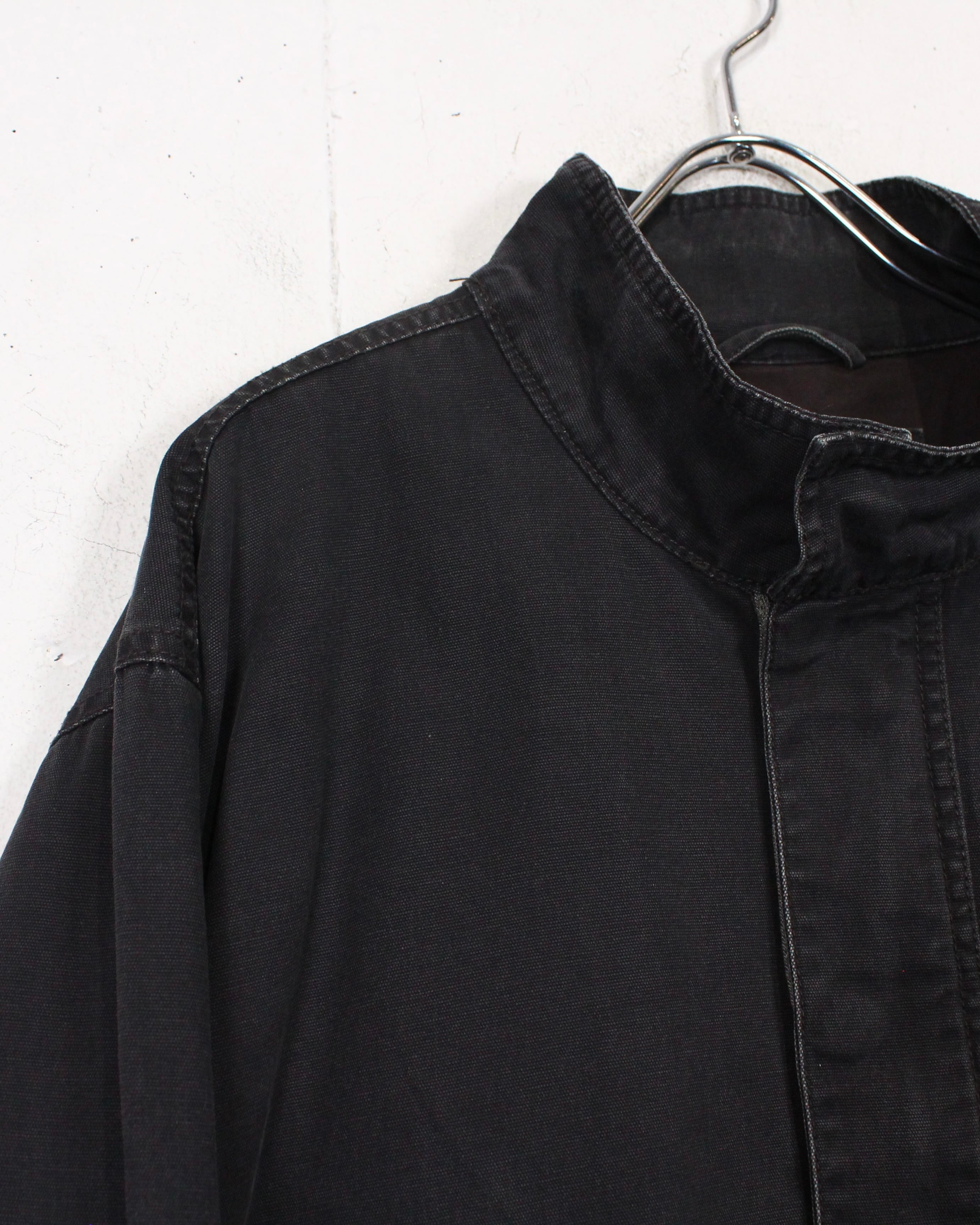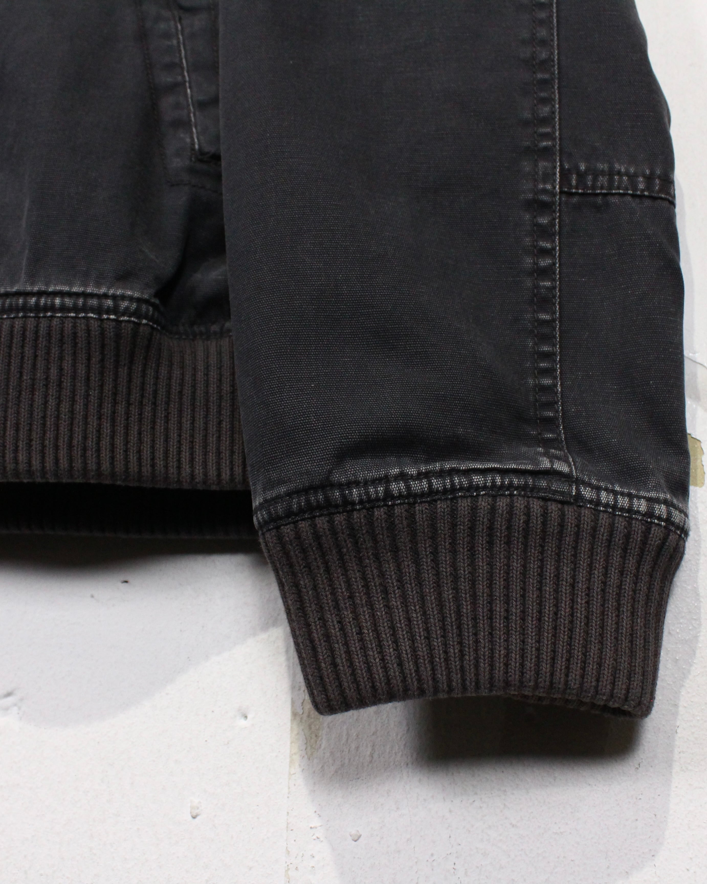 ボディにはハリのあるコットンファブリックを採用。着用と洗いを重ねることで生まれたブラックのフェード感が、均一ではない濃淡となって表情に奥行きを与えています。
