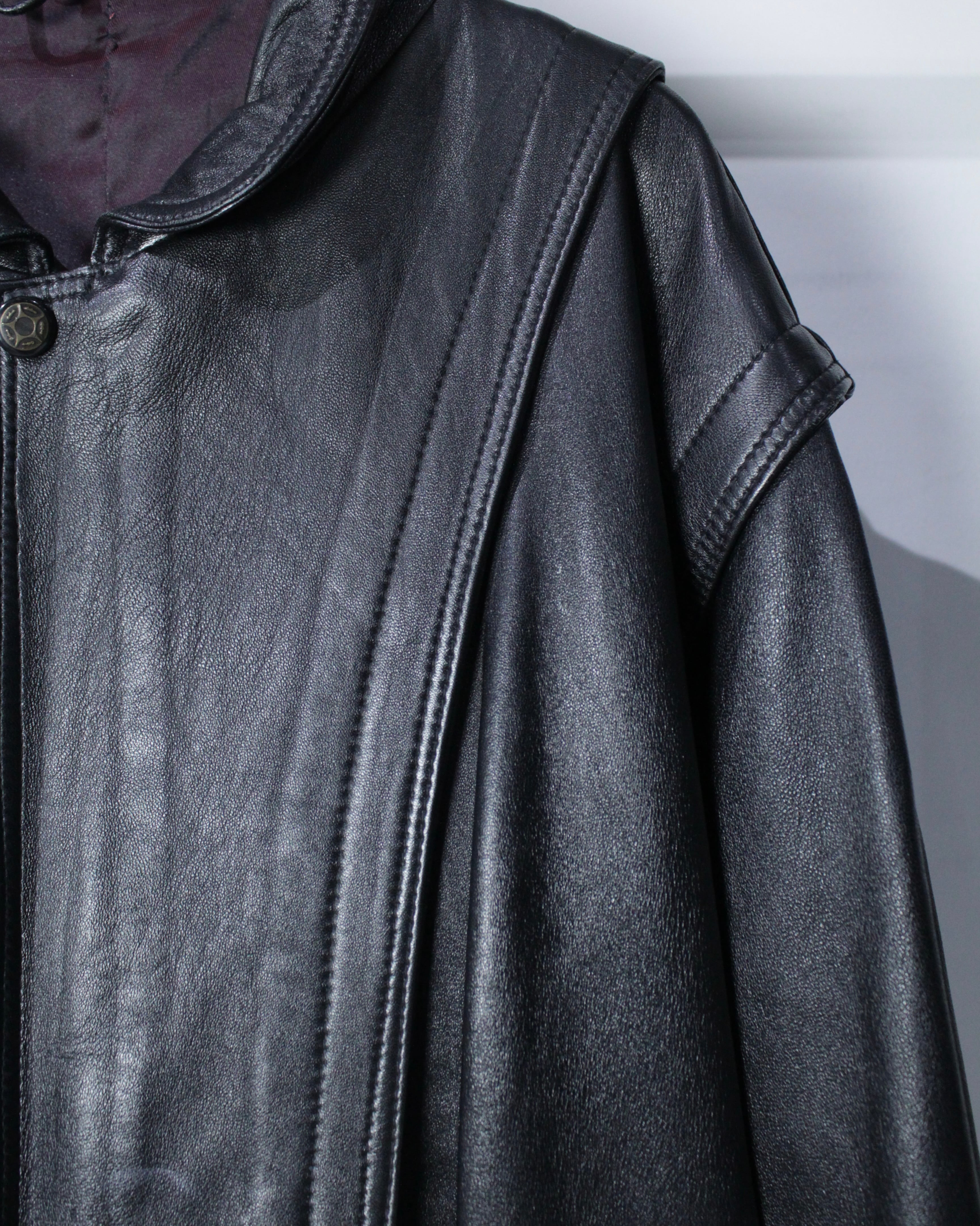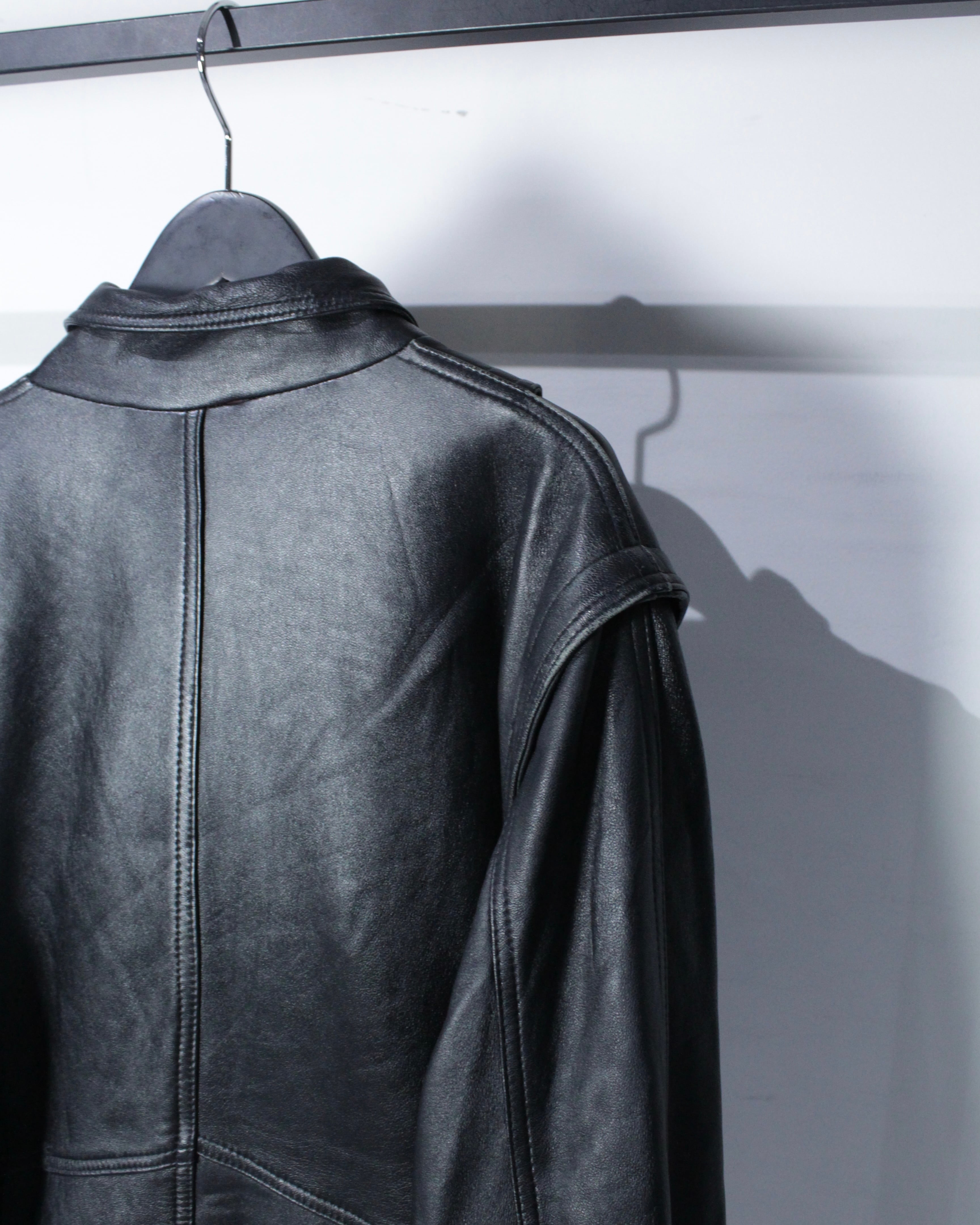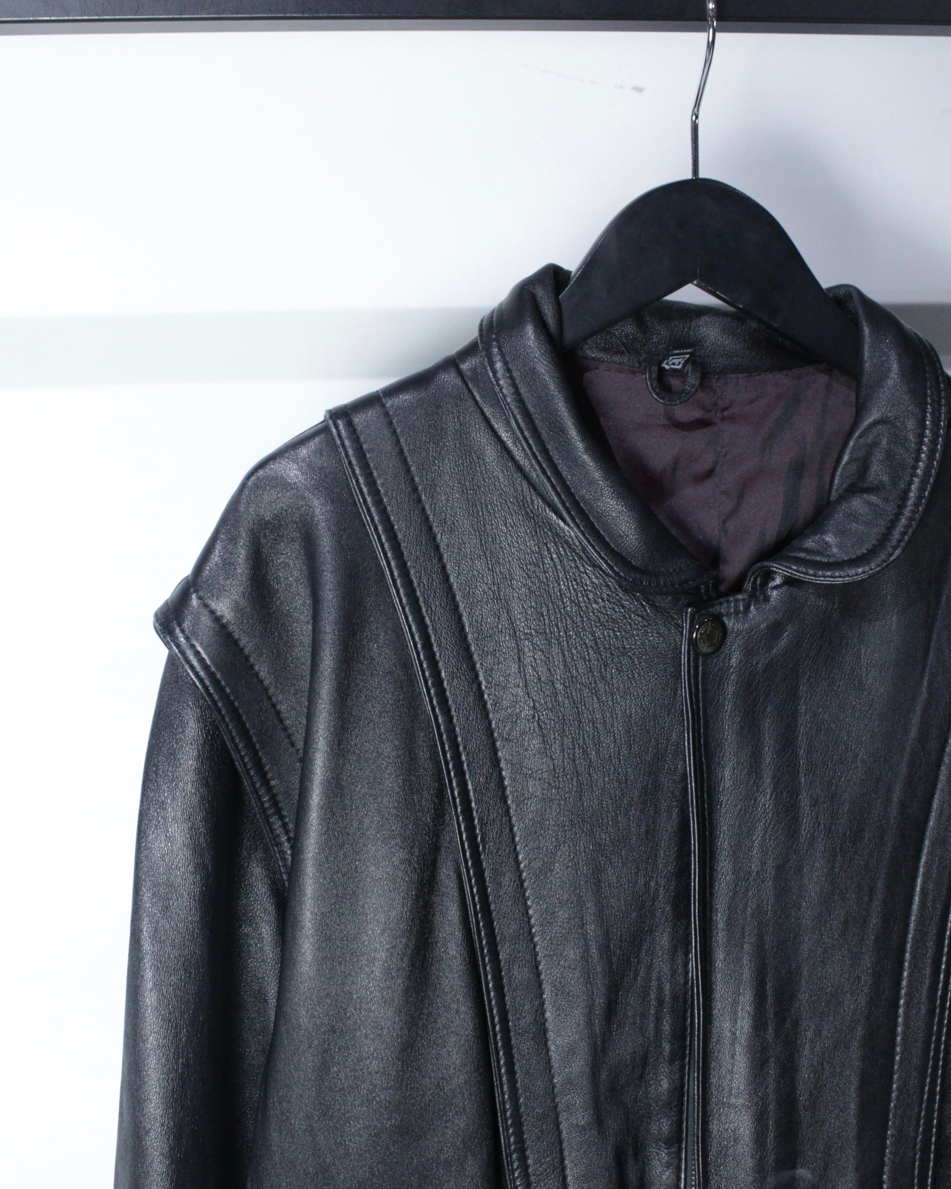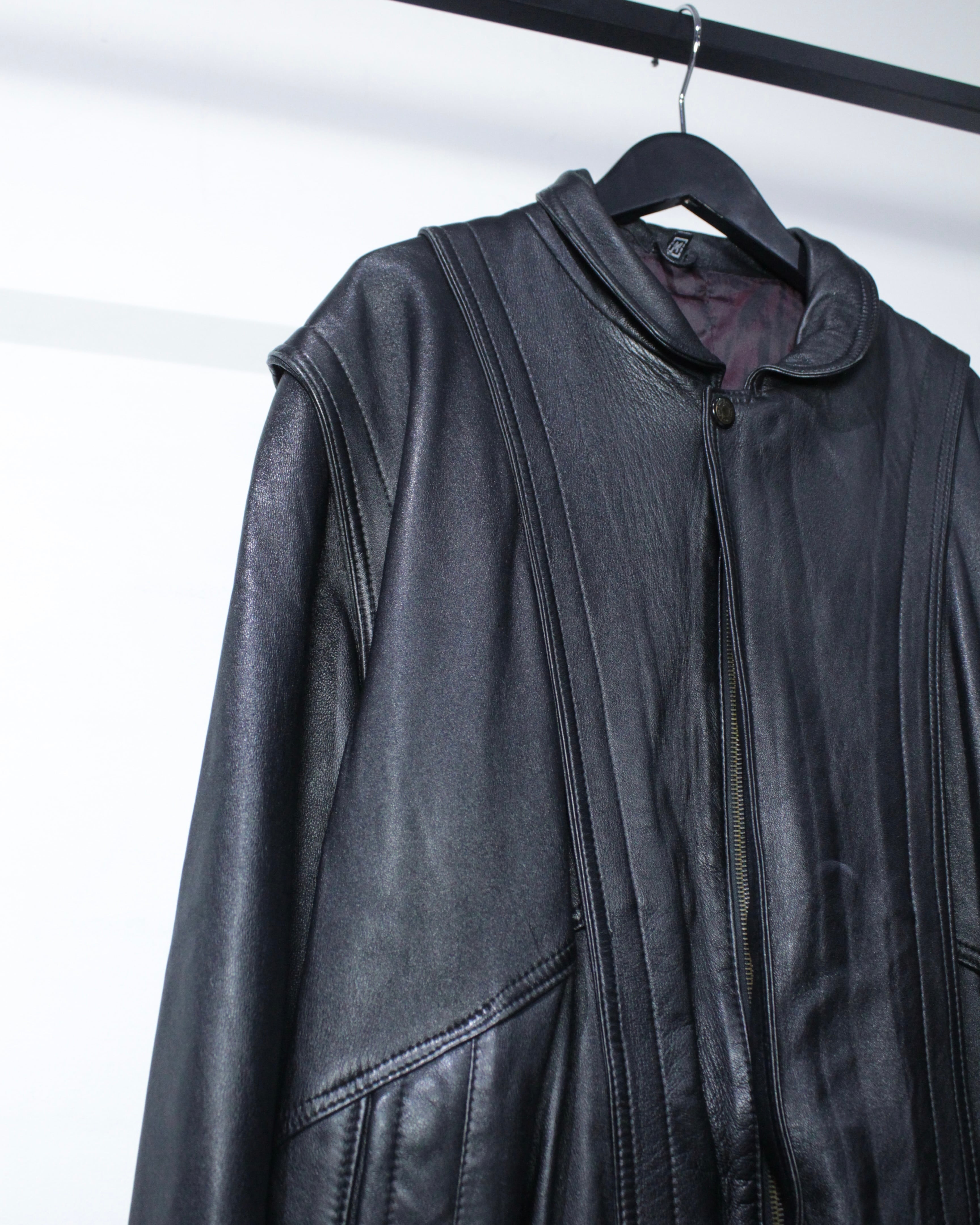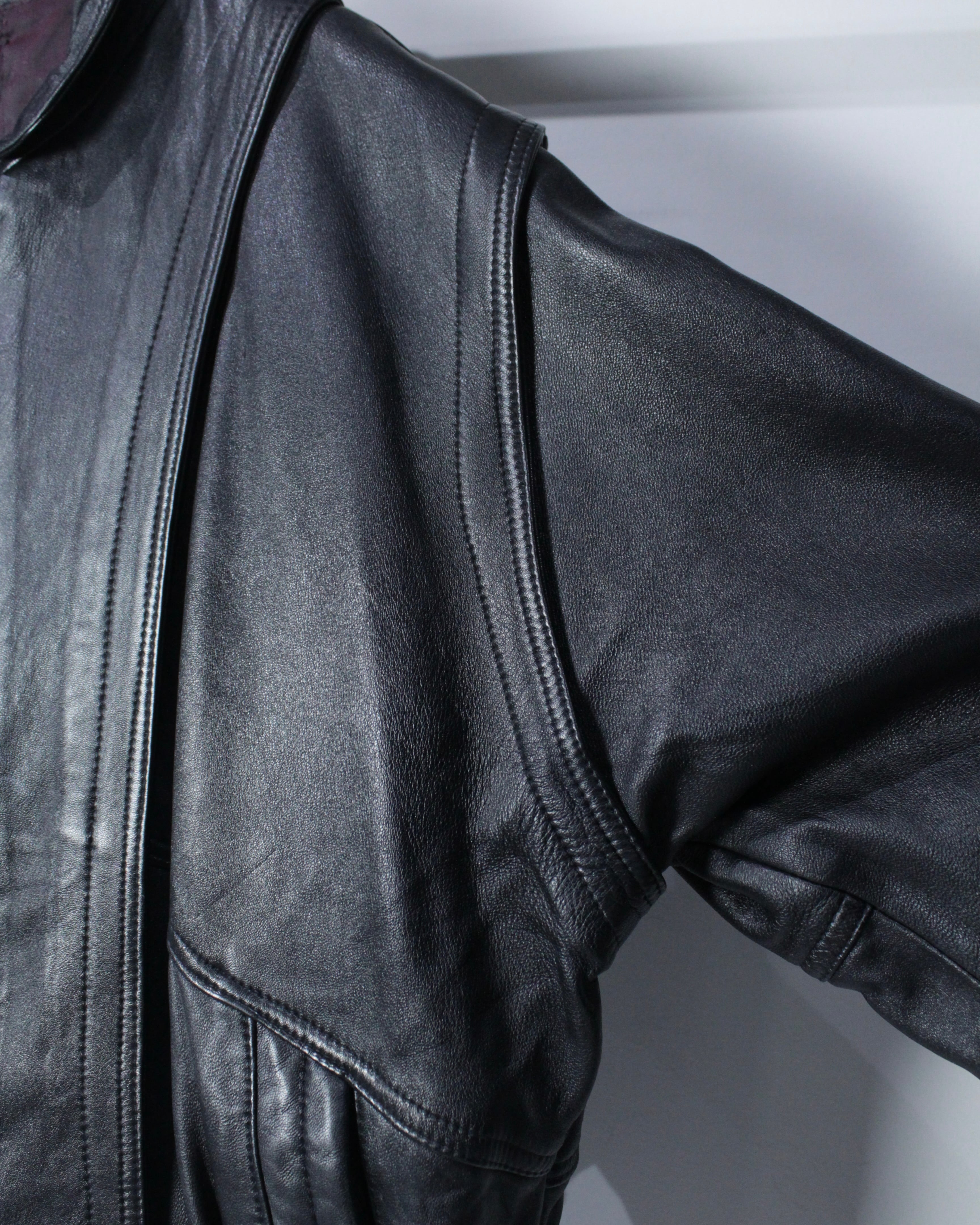 フロントから肩、身頃にかけては、立体的な切り替えラインとステッチワークを効かせたデザイン。単調になりがちなブラックレザーに奥行きを与え、かつ動きやすさも考慮されたディテールが光ります。