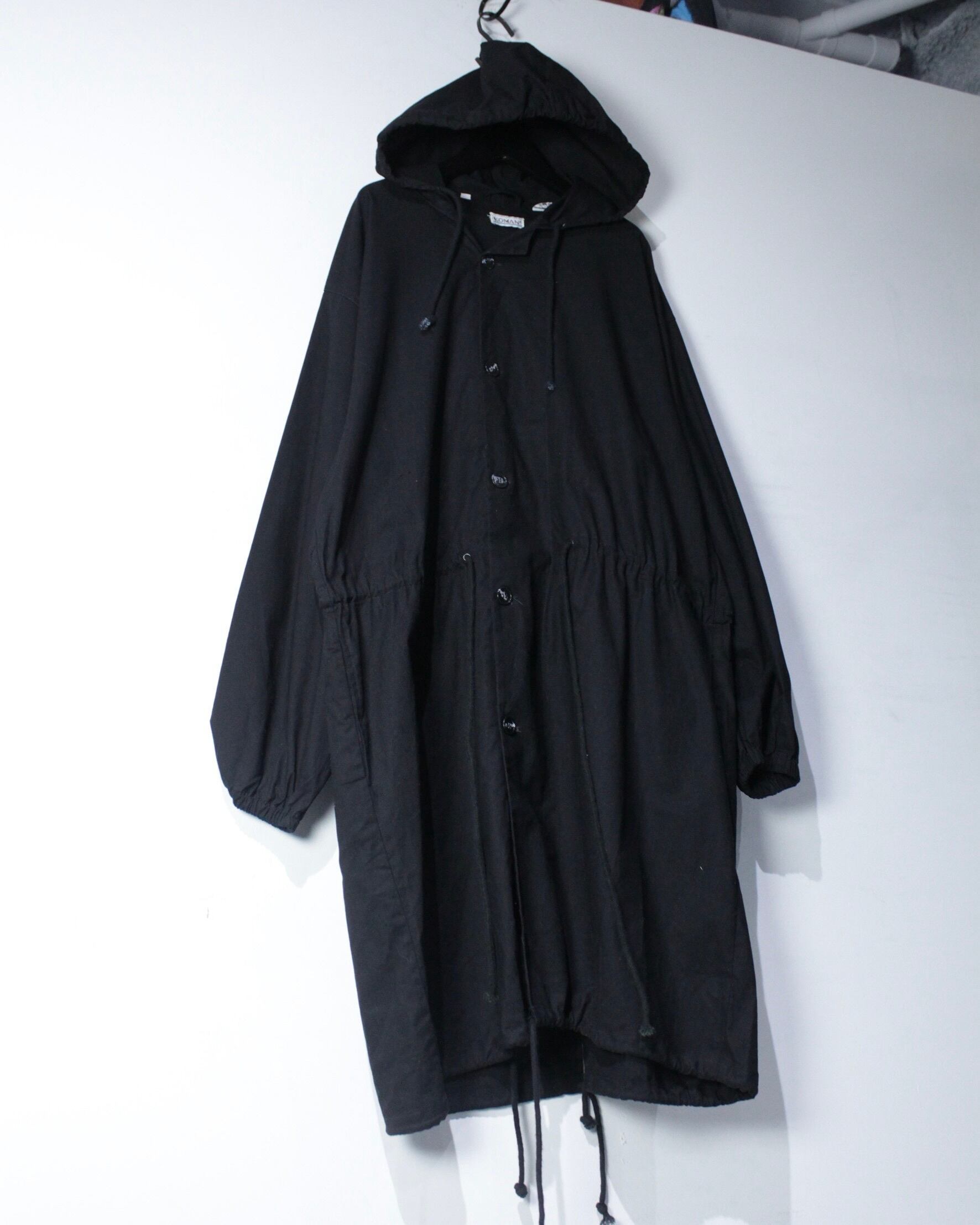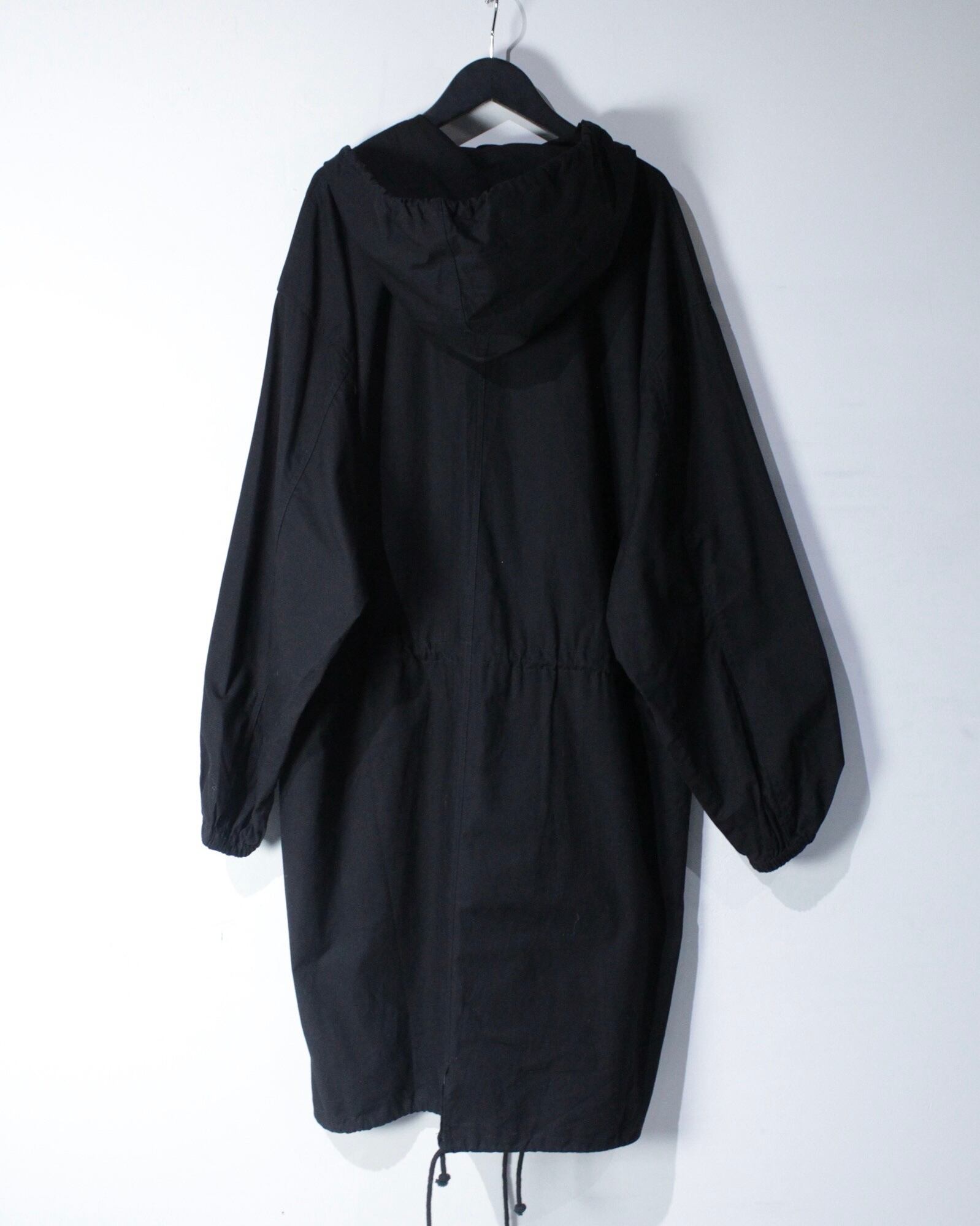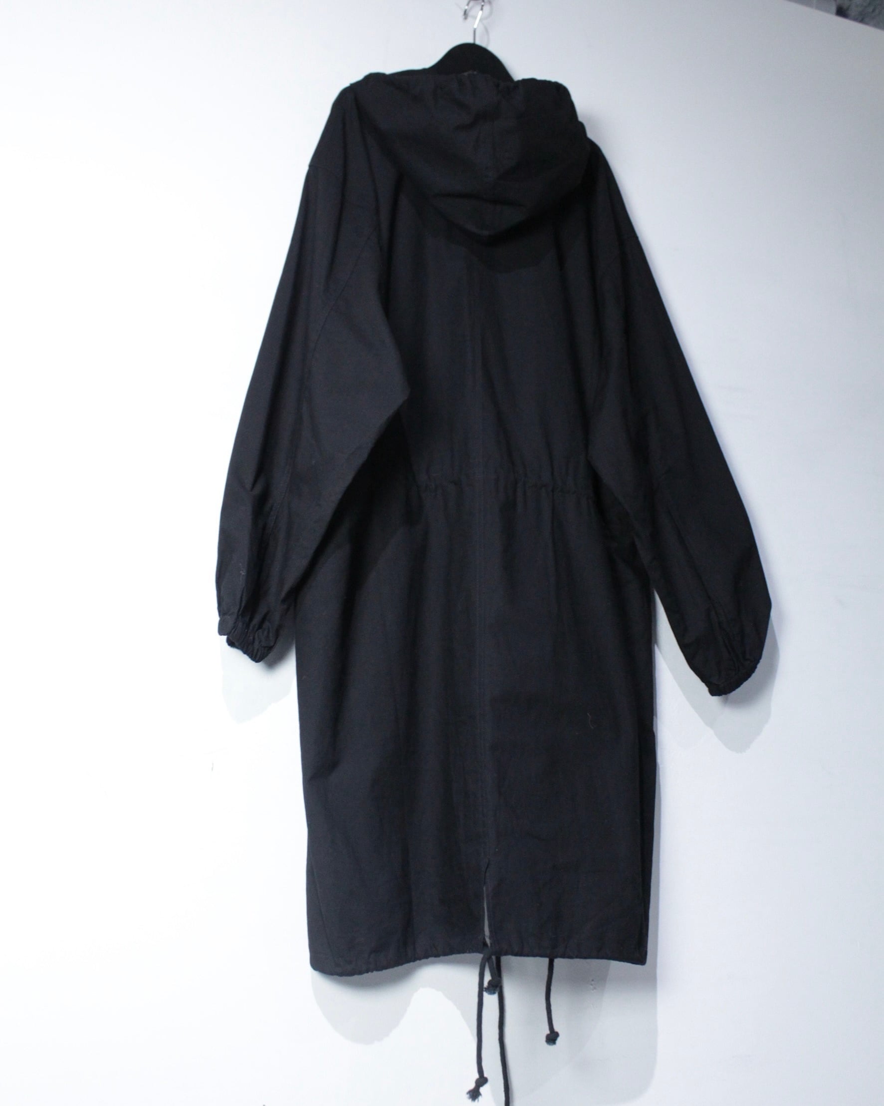 ブラック単色でデザインされたボディは、軽やかでしなやかな素材を採用。フロントはボタン仕様、フード付きで、装飾を削ぎ落としたクリーンでモードな佇まいが印象的です。