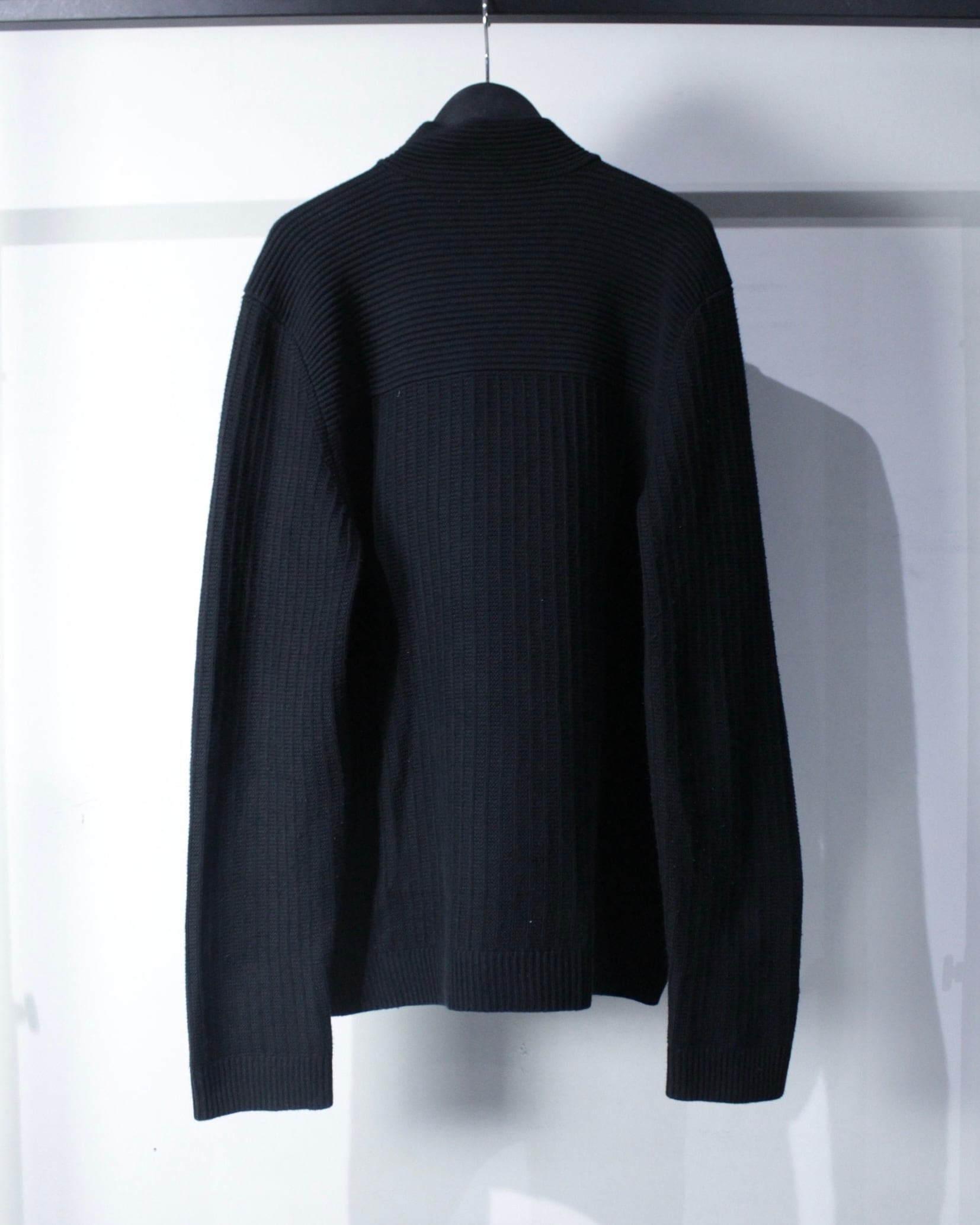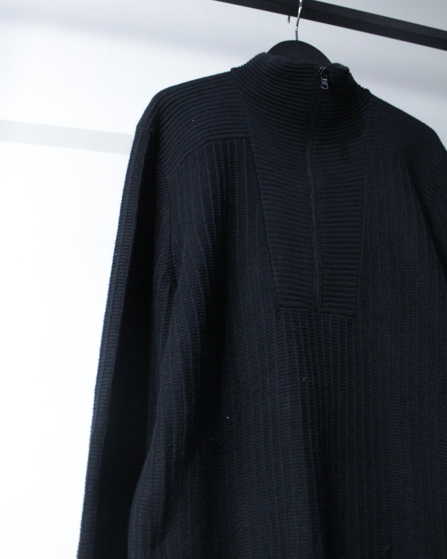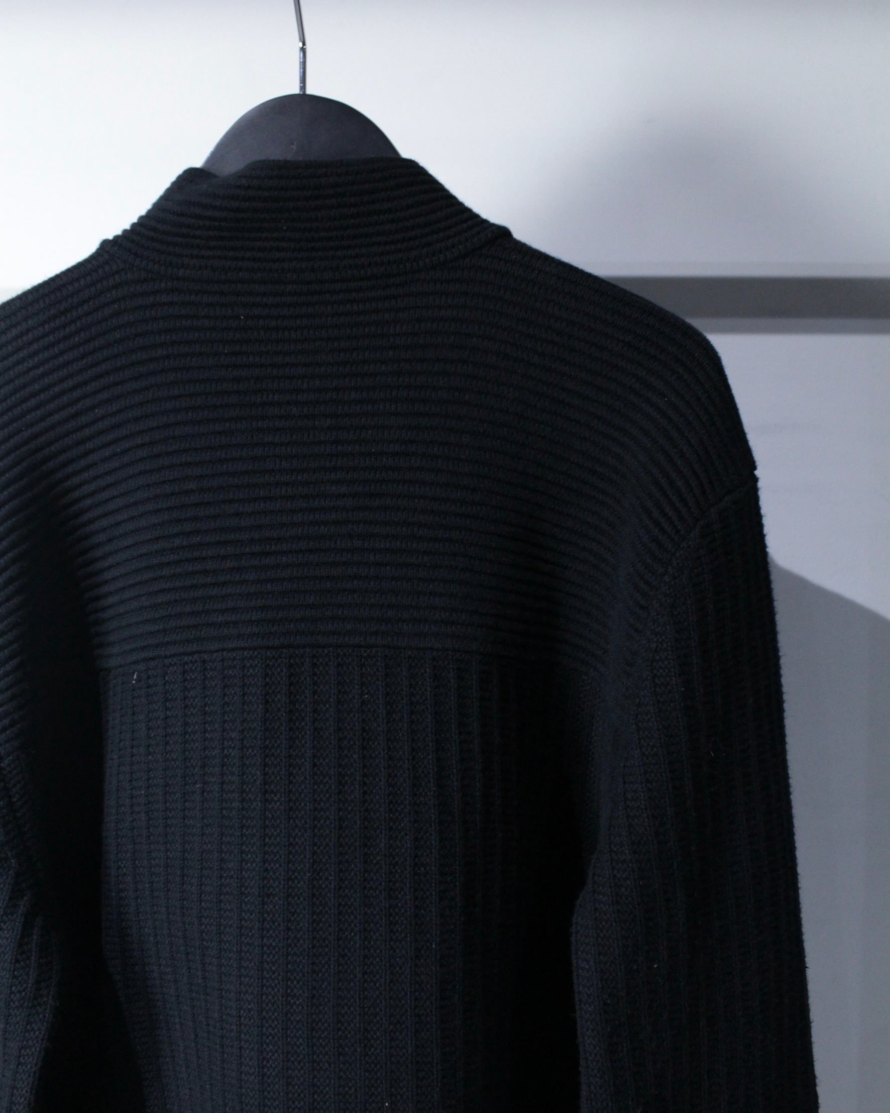 ボディはブラックを基調に、リブ編みを巧みに切り替えた立体感のあるデザイン。フロントのハーフジップ仕様が程よいアクセントとなり、ミニマルながらも表情のある仕上がりです。